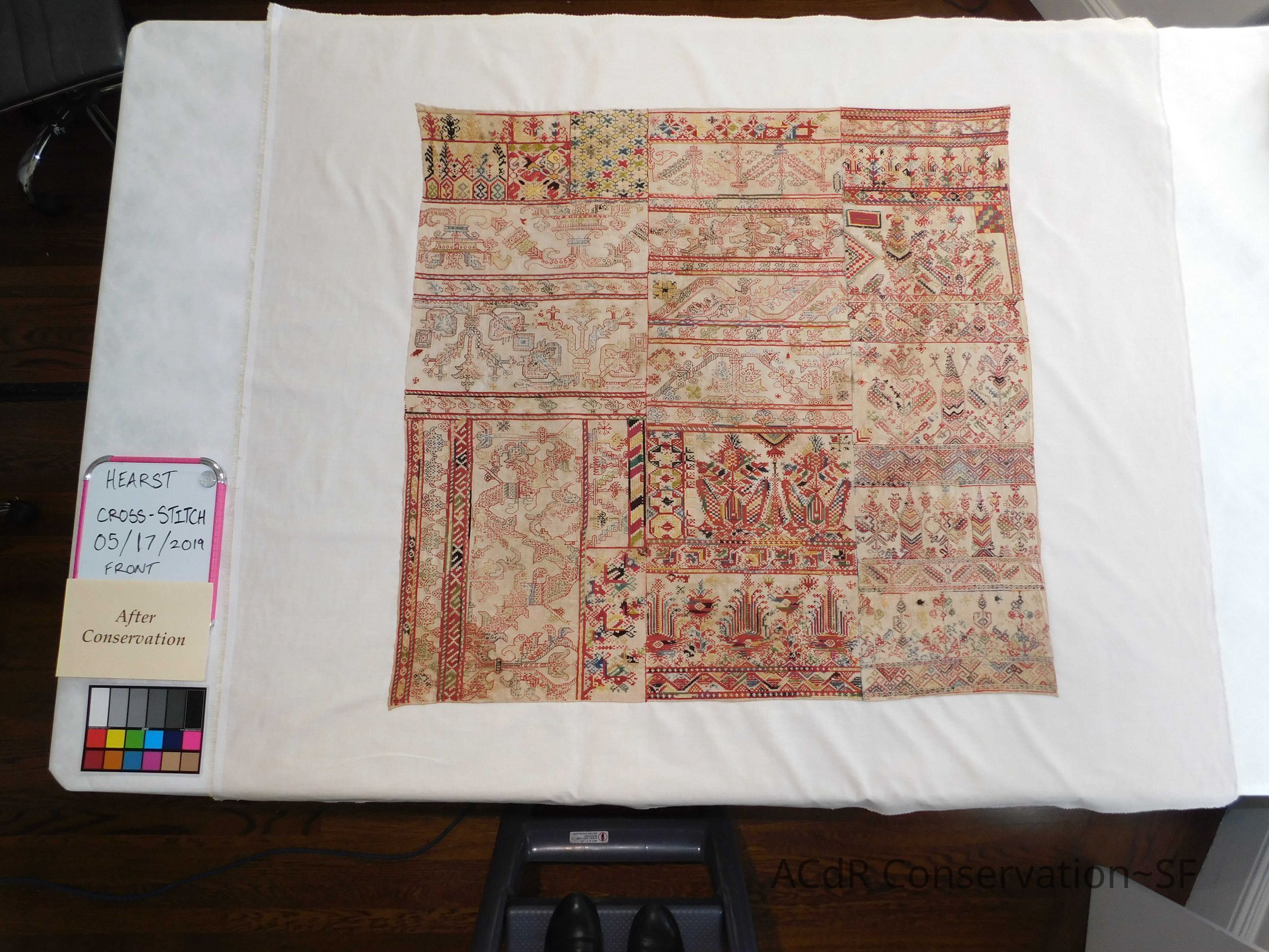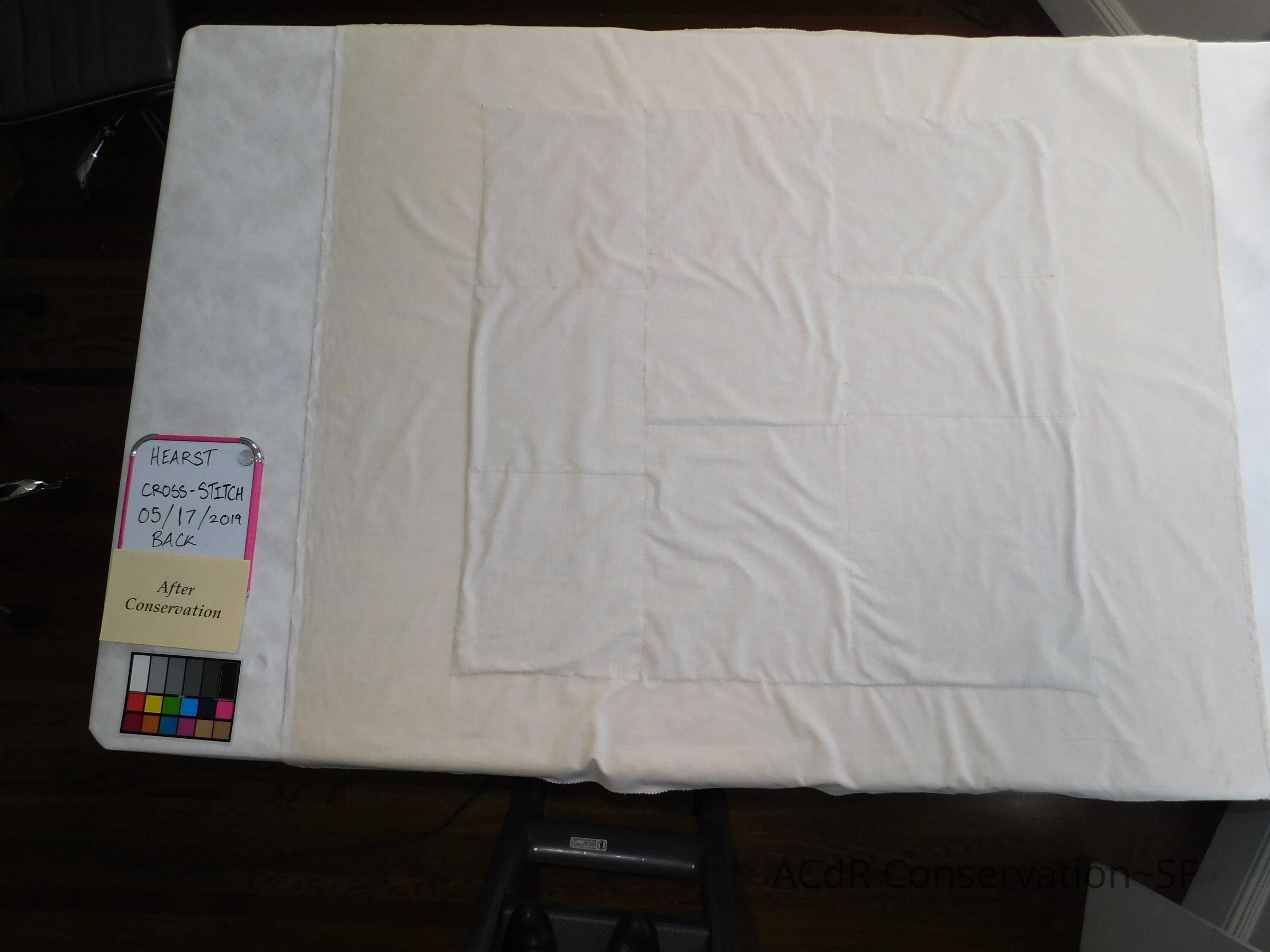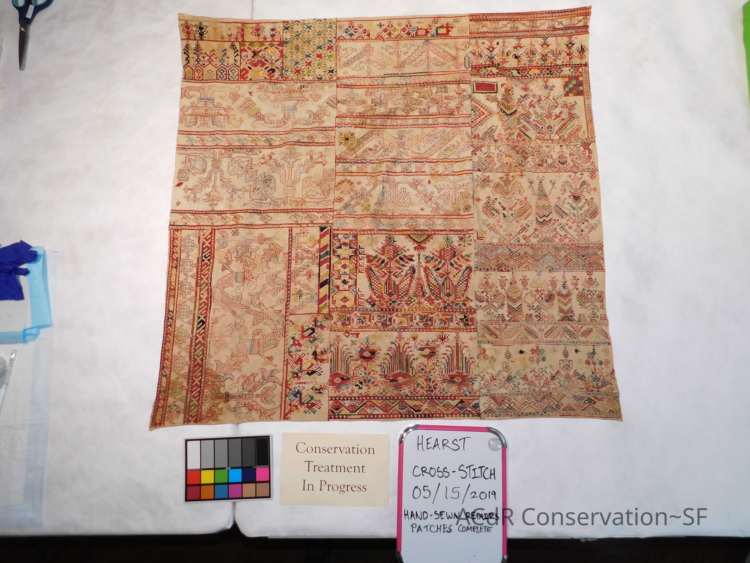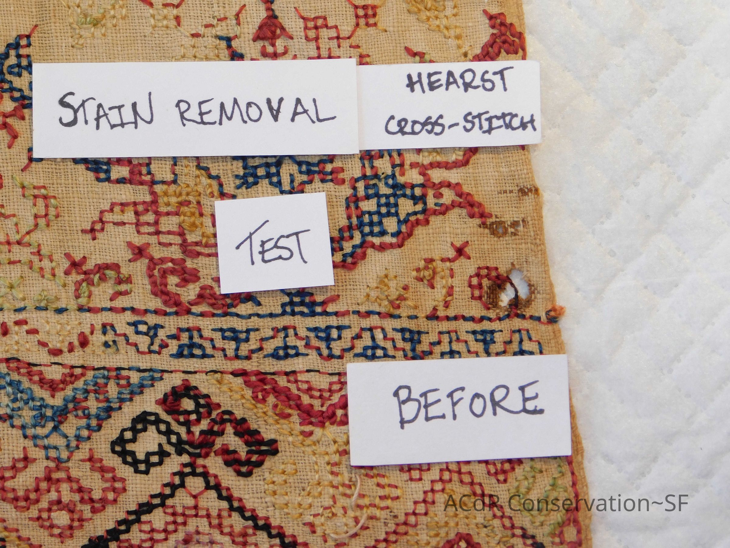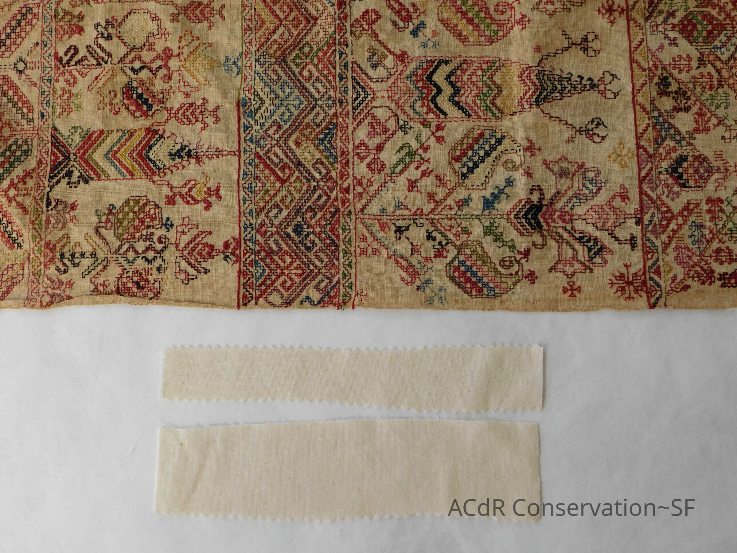 Staining throughout, some darker like splatters that have formed holes. Some stitching has broken and disintegrated due to either sun damage or abrasion. Colors faded. Wax and other encrustations attached to threads.