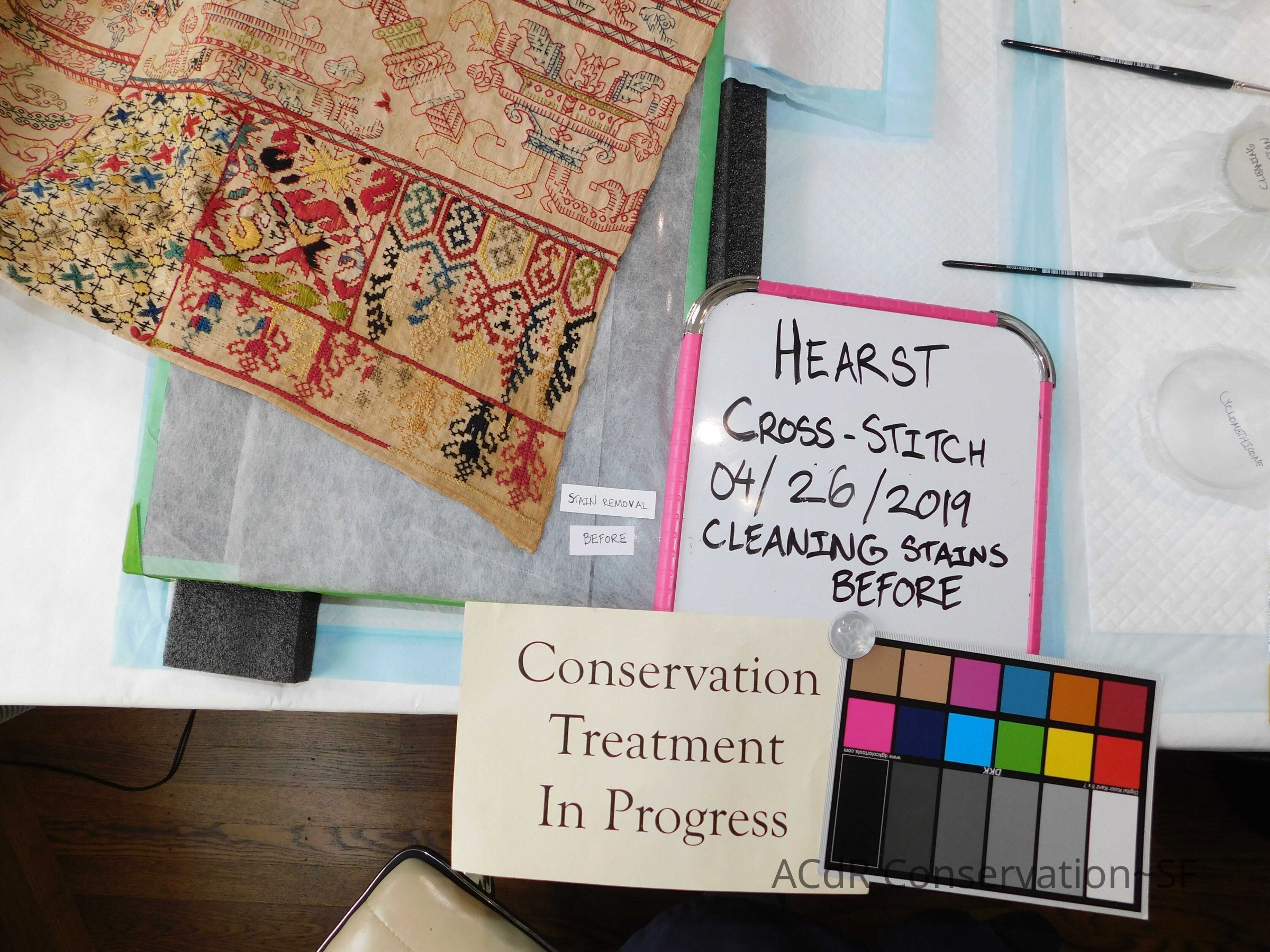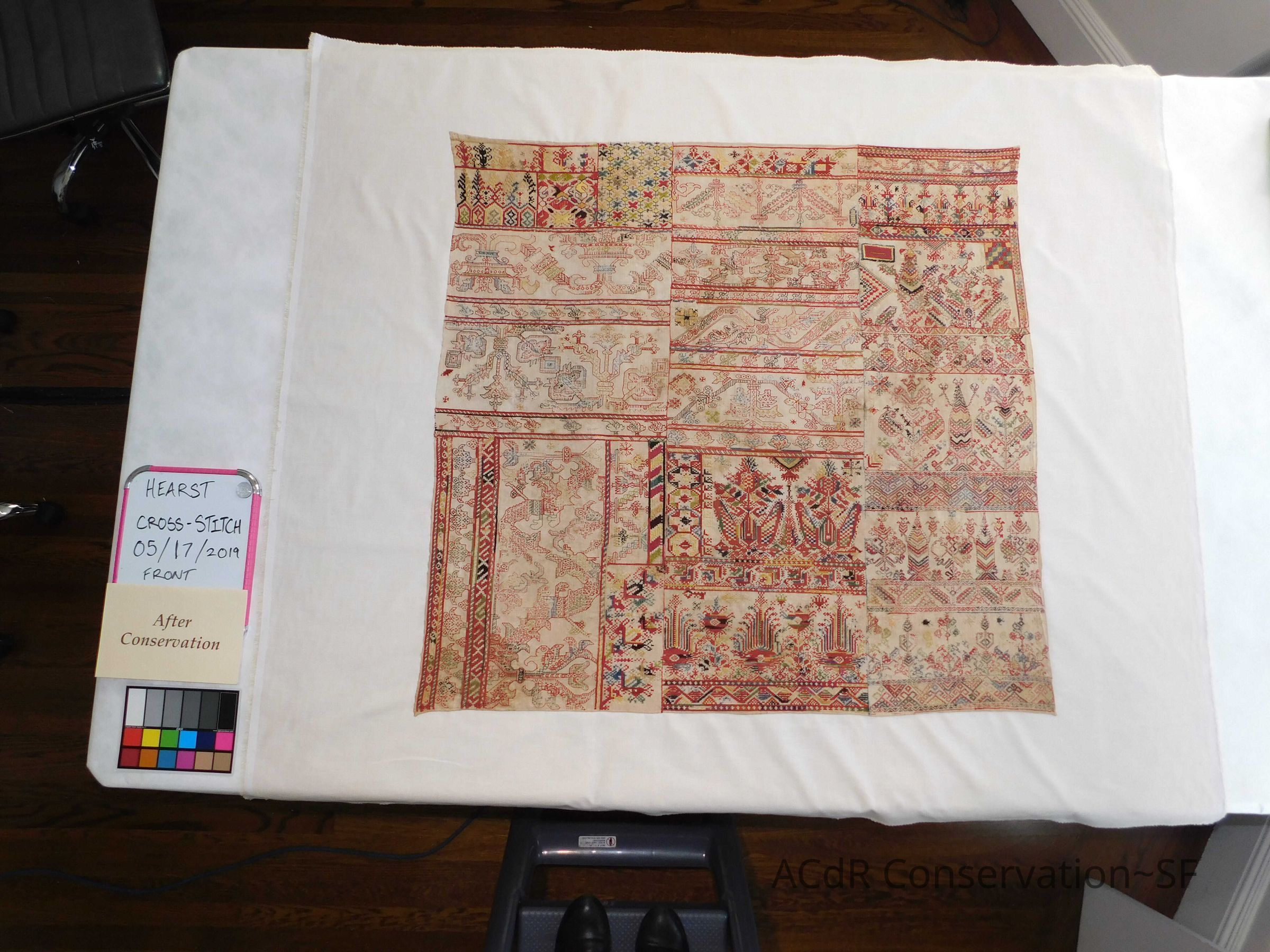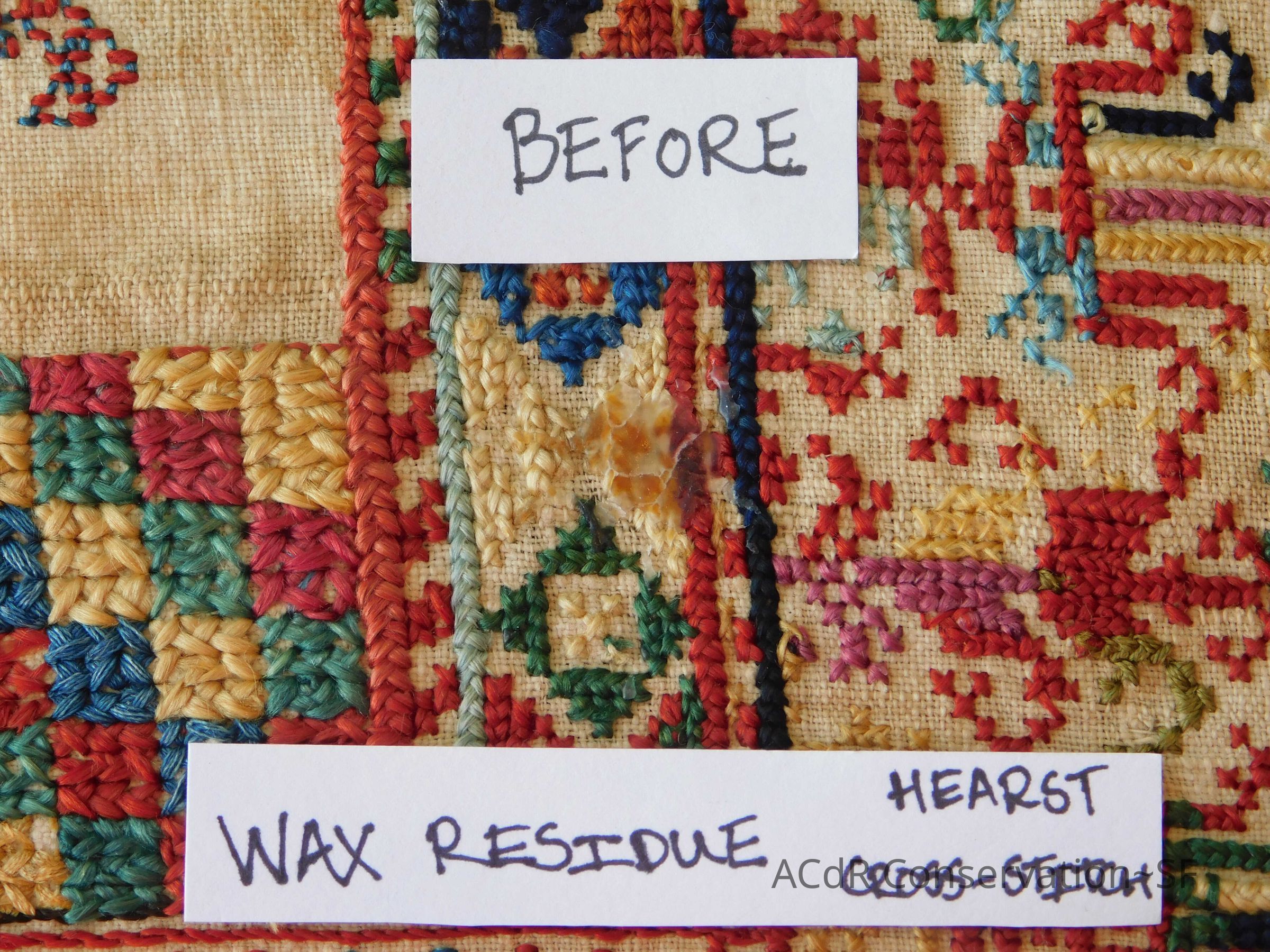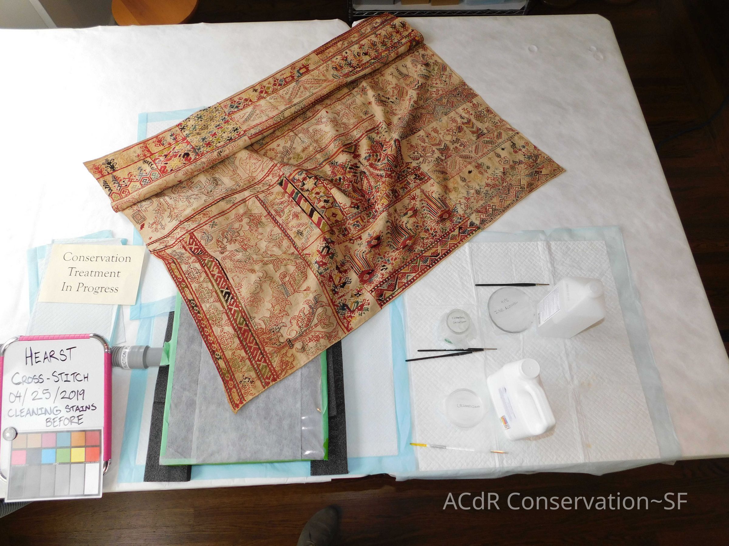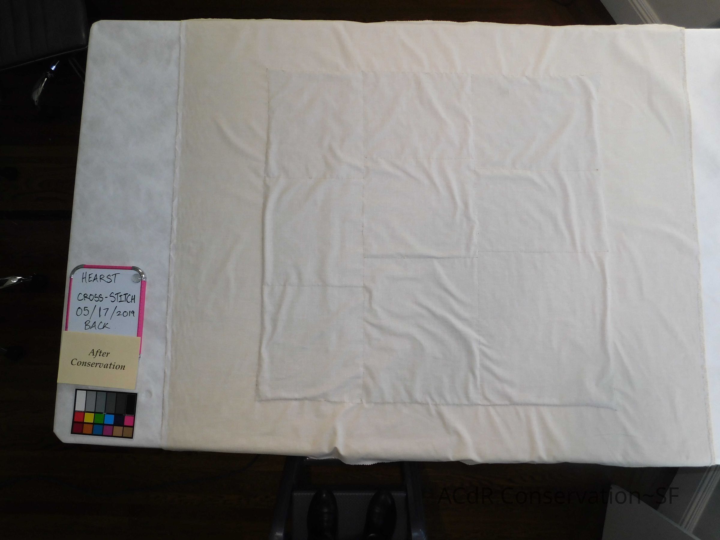 Staining throughout, some darker like splatters that have formed holes. Some stitching has broken and disintegrated due to either sun damage or abrasion. Colors faded. Wax and other encrustations attached to threads.