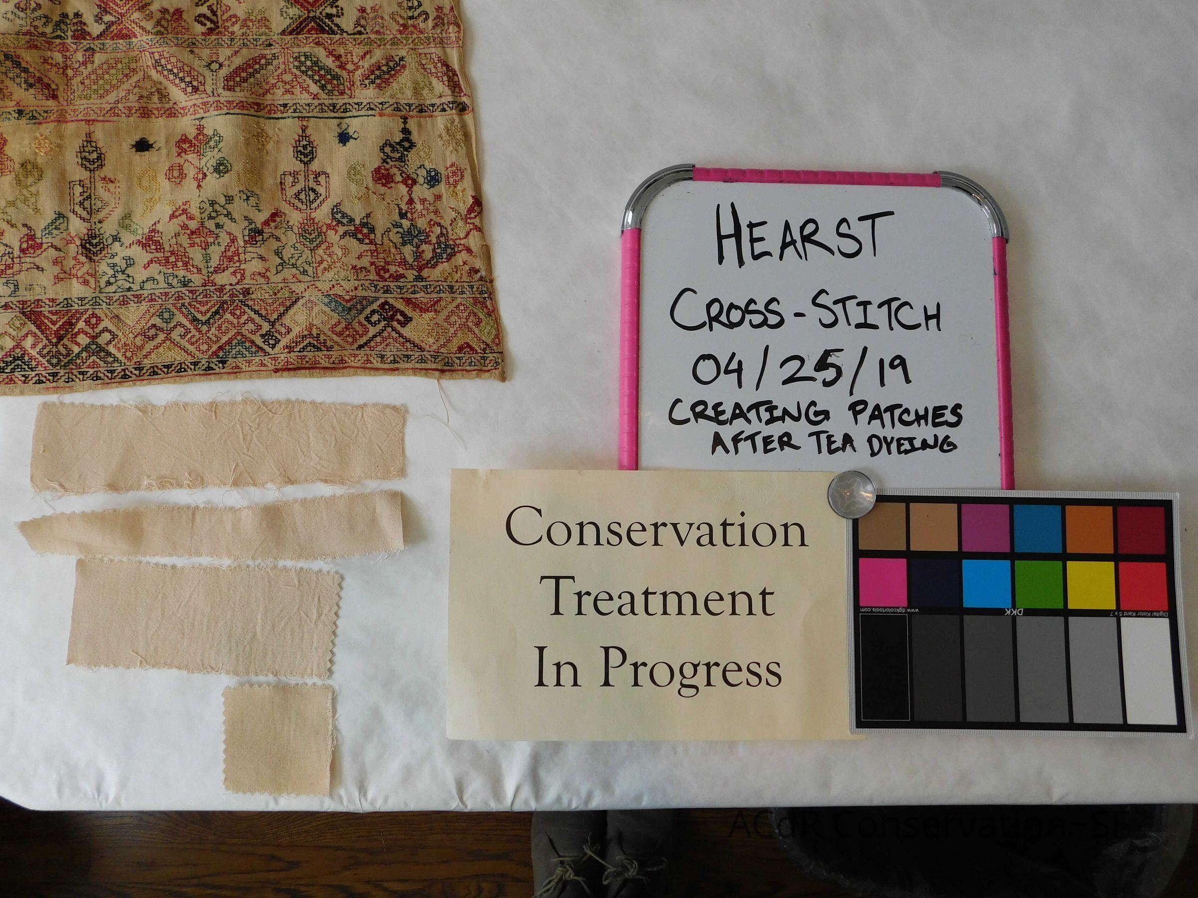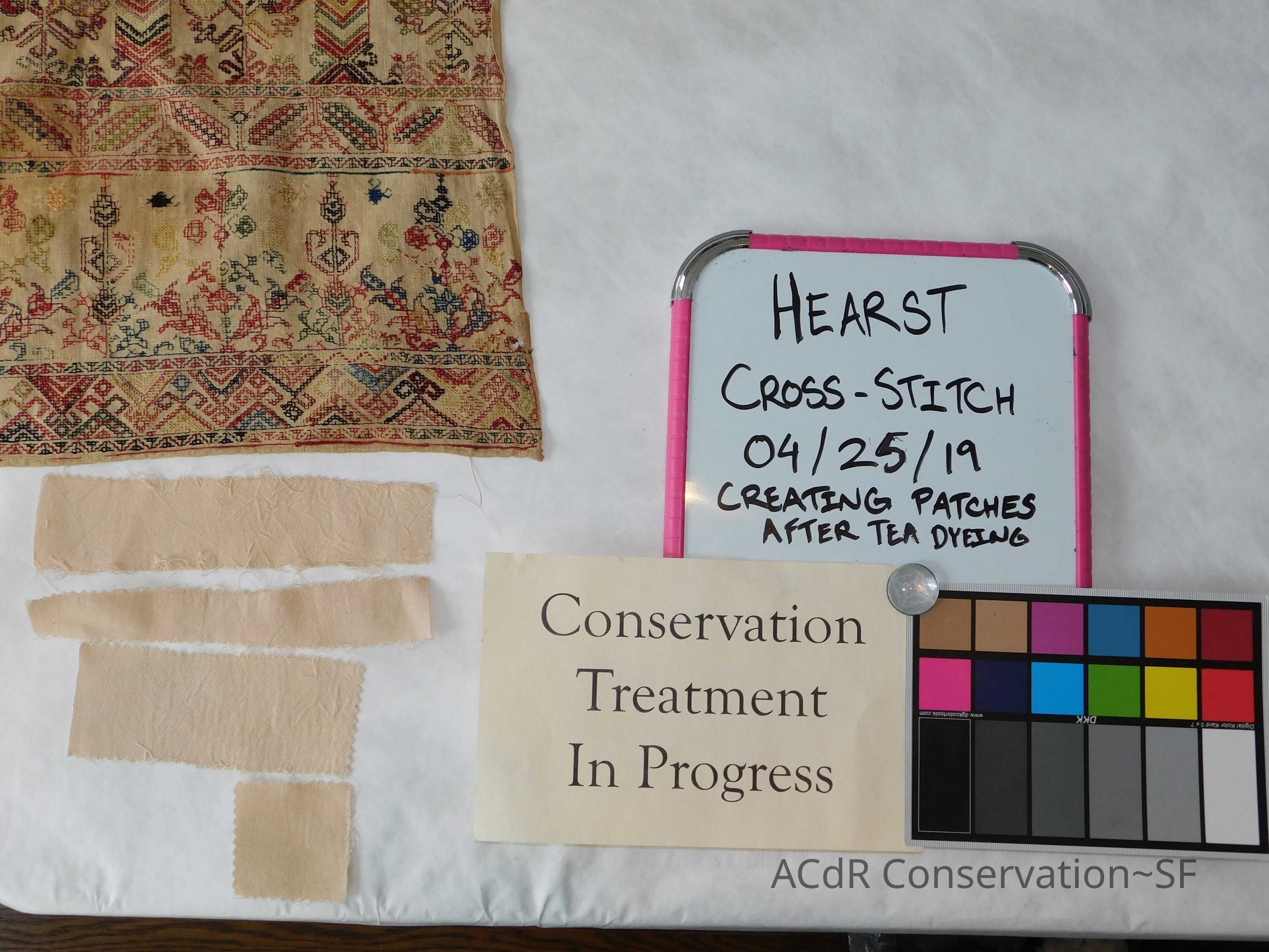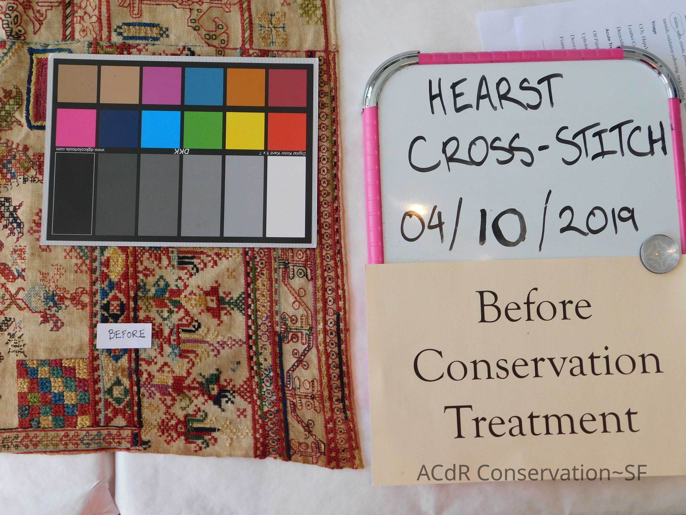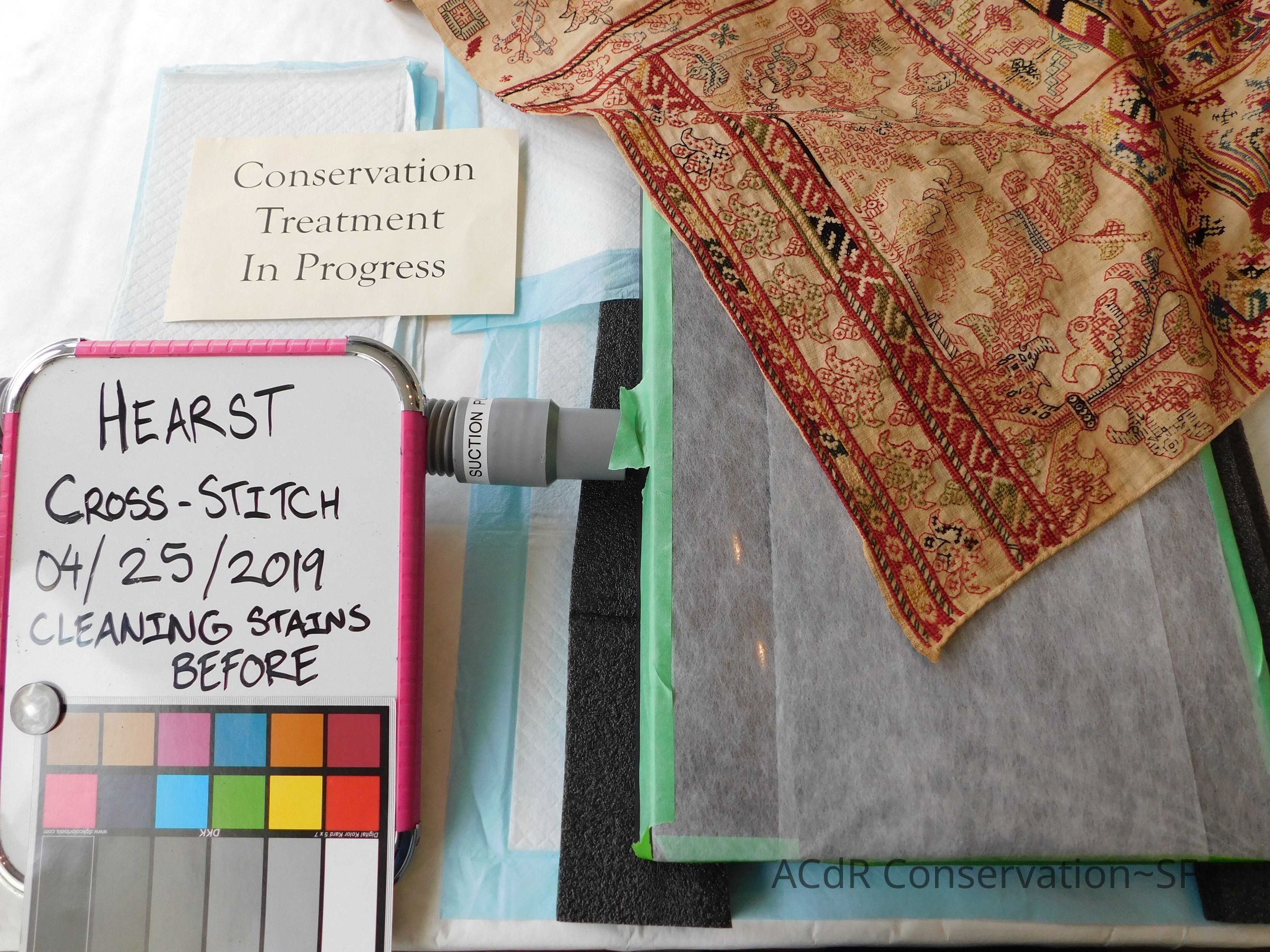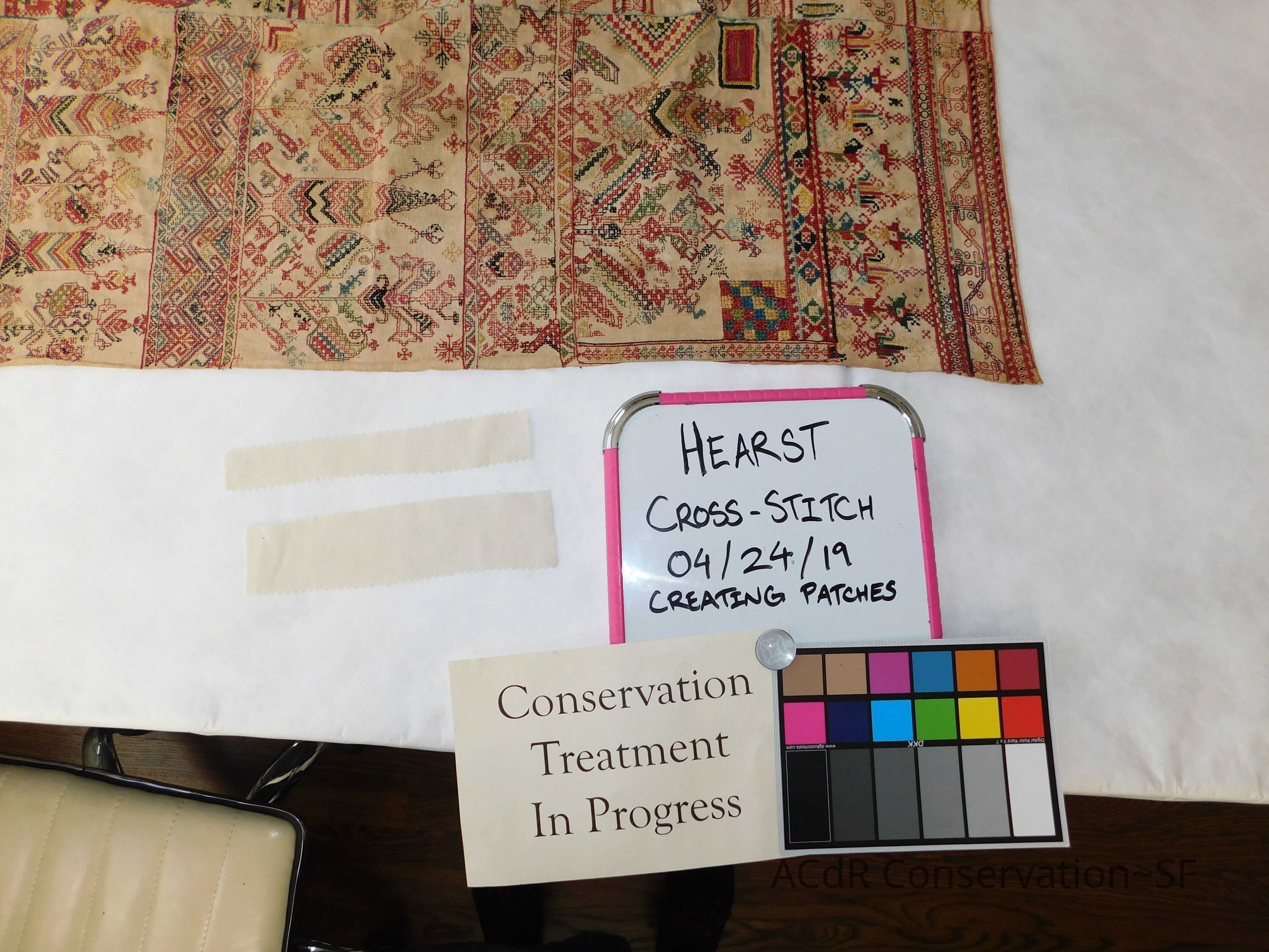 Staining throughout, some darker like splatters that have formed holes. Some stitching has broken and disintegrated due to either sun damage or abrasion. Colors faded. Wax and other encrustations attached to threads.