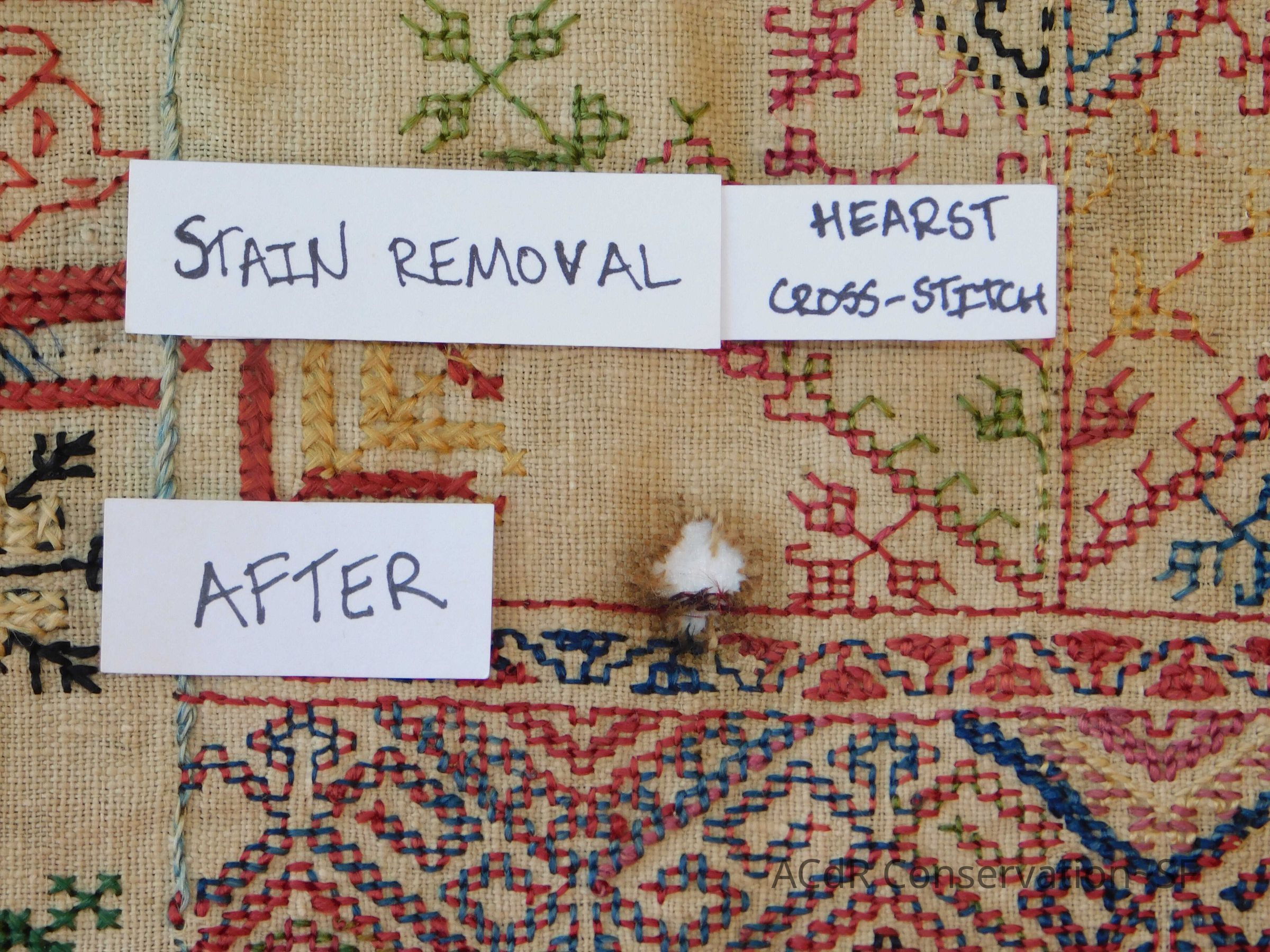 Spot cleaned with test solution. Swabs removed degraded threads while cleaning. No change to oily spots. Continued spot cleaning.