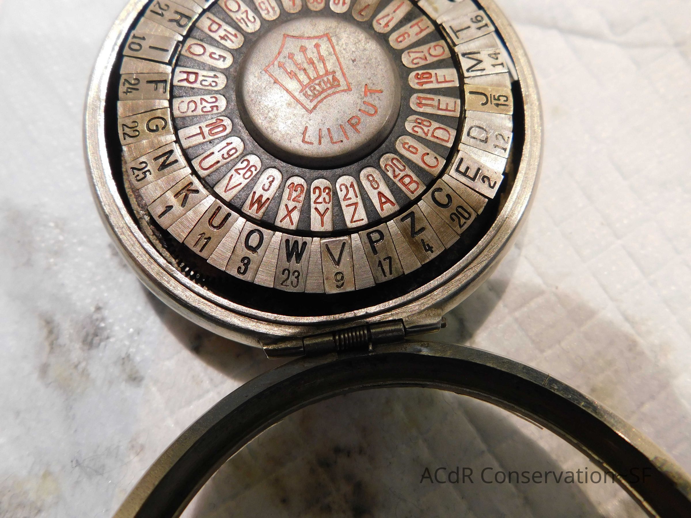 Removal of corrosion using Kotton Cleanser and steel wool. Done on the teeth. Removal of corrosion from gears and mechanism from the front and back of object. Combination Kotton Klenser and Biox applied.