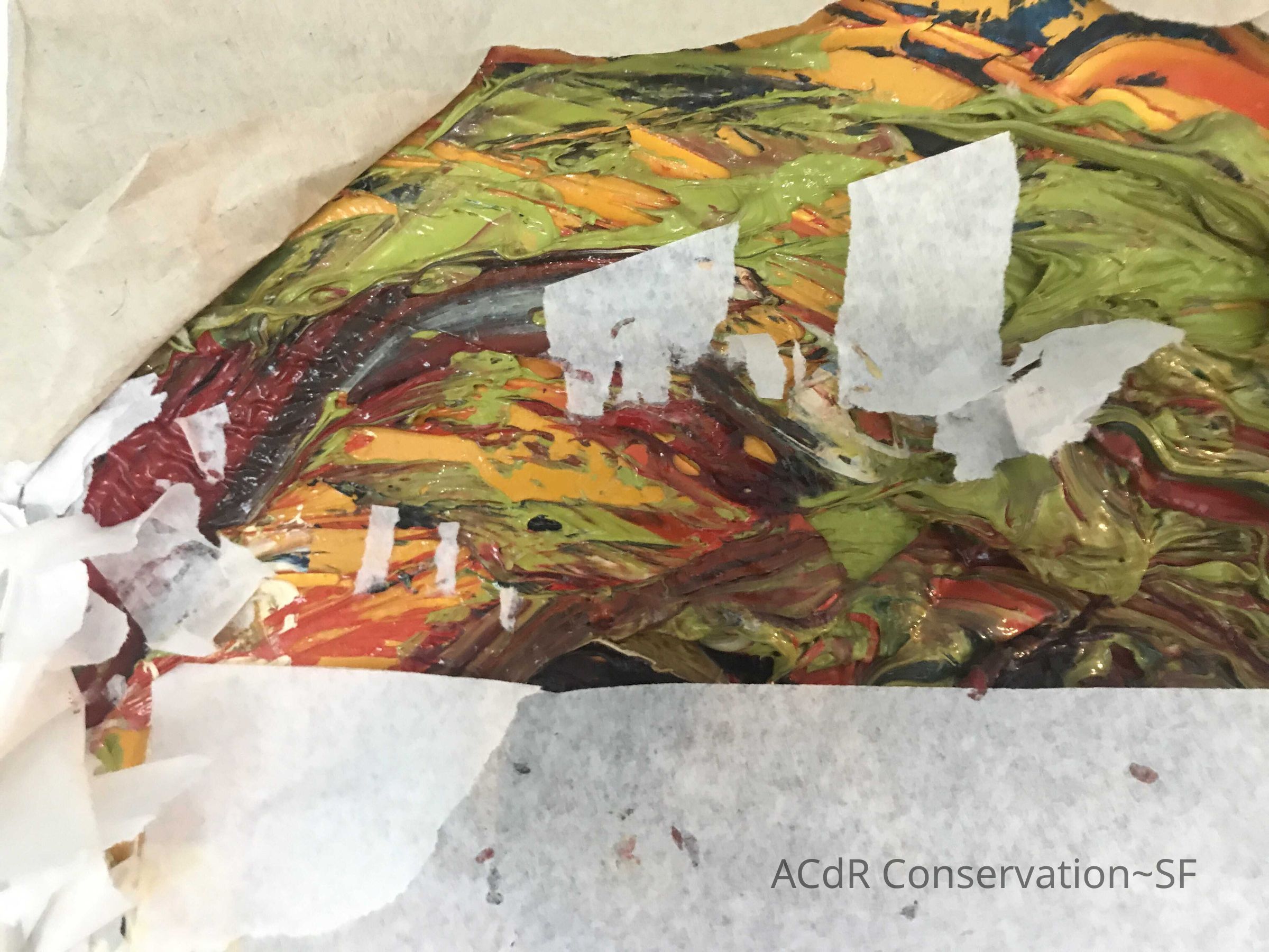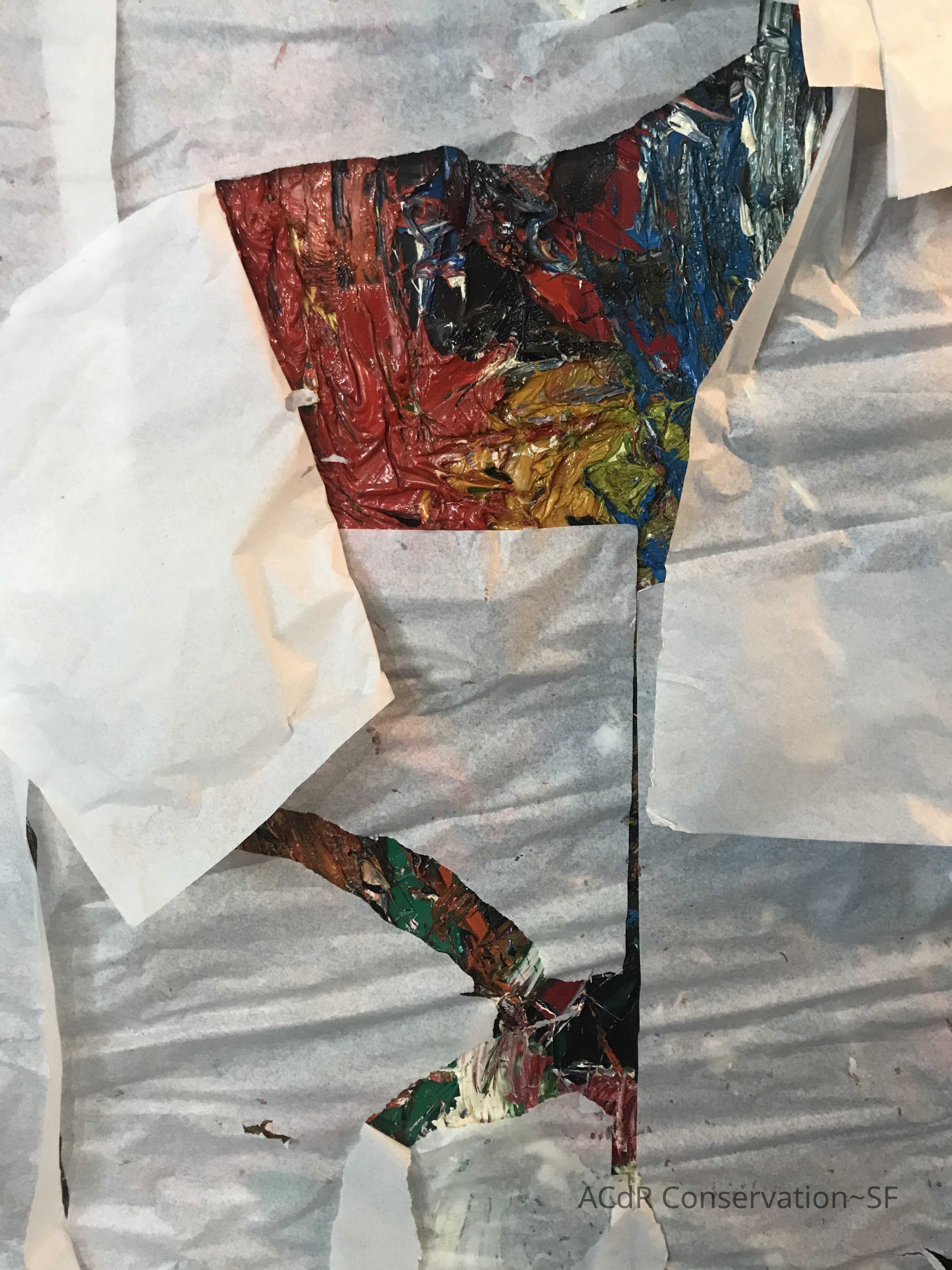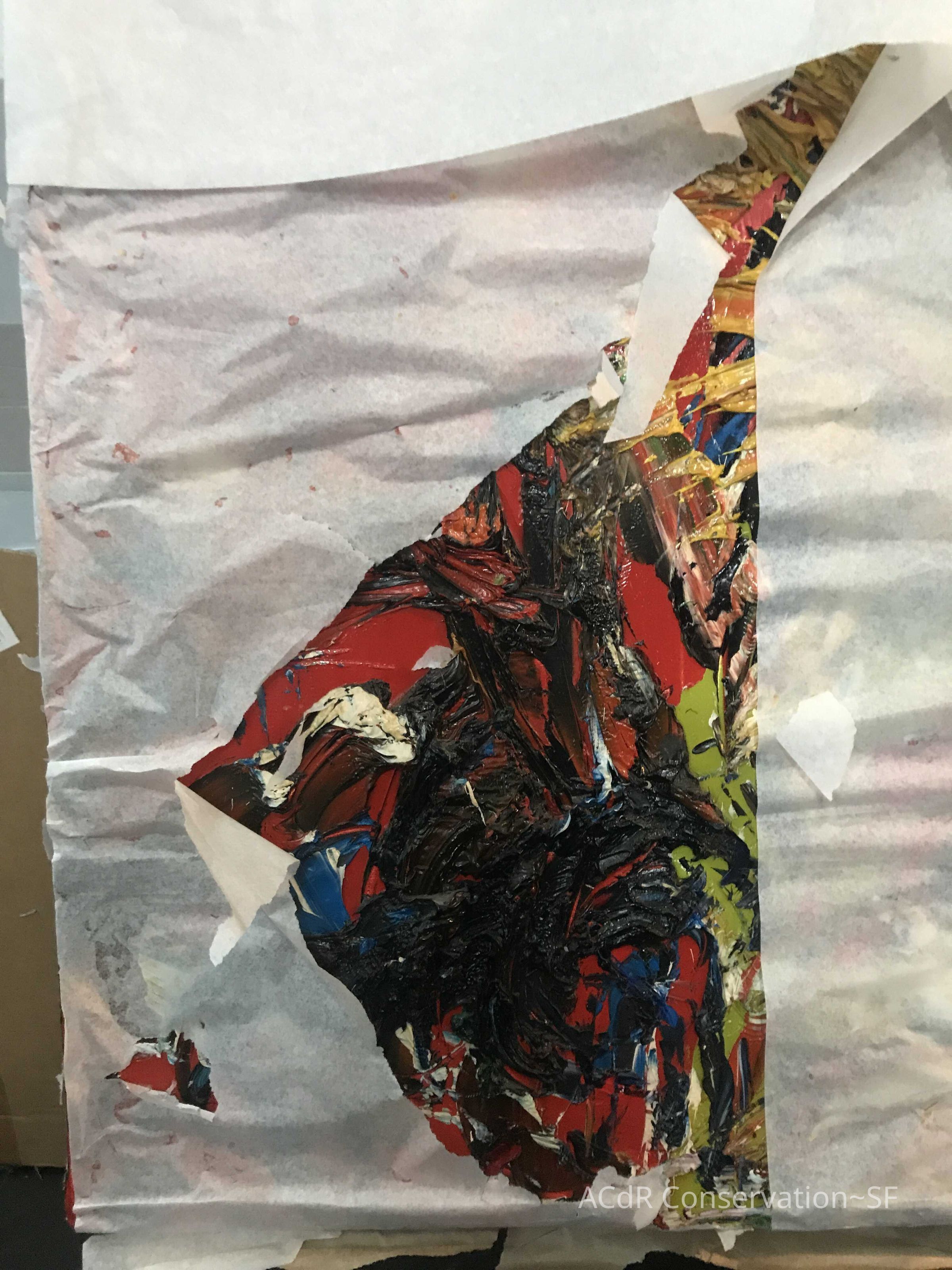12 sheets of tissue paper adhered to the paintings face; tissue fibres are stuck to edges of painting and turnover egdes. Paper has been ripped off partially in 5 sheets, leaving tissue fibres stuck to exposed paint. There are numerous sheets of tissue in the top right corner.