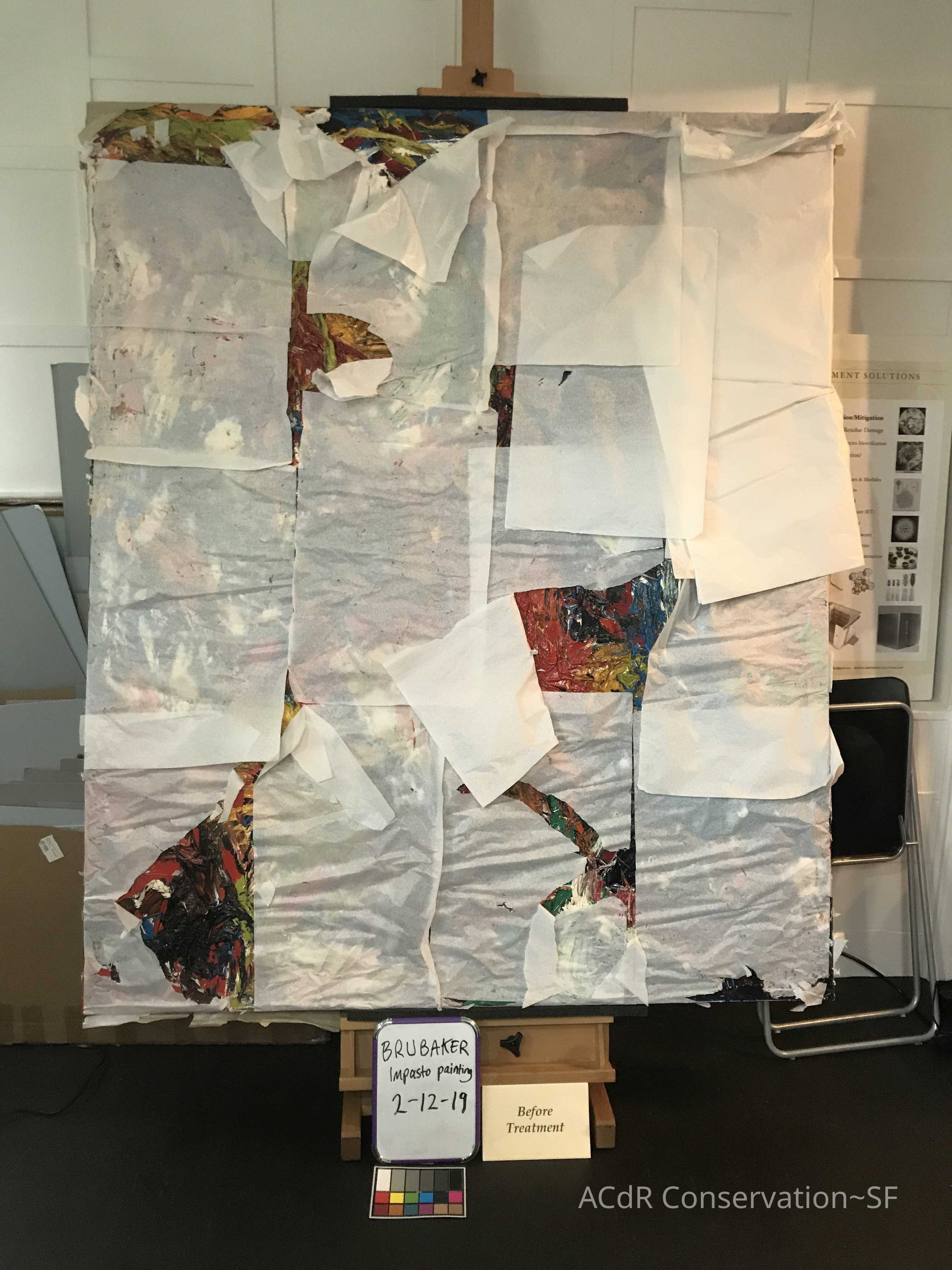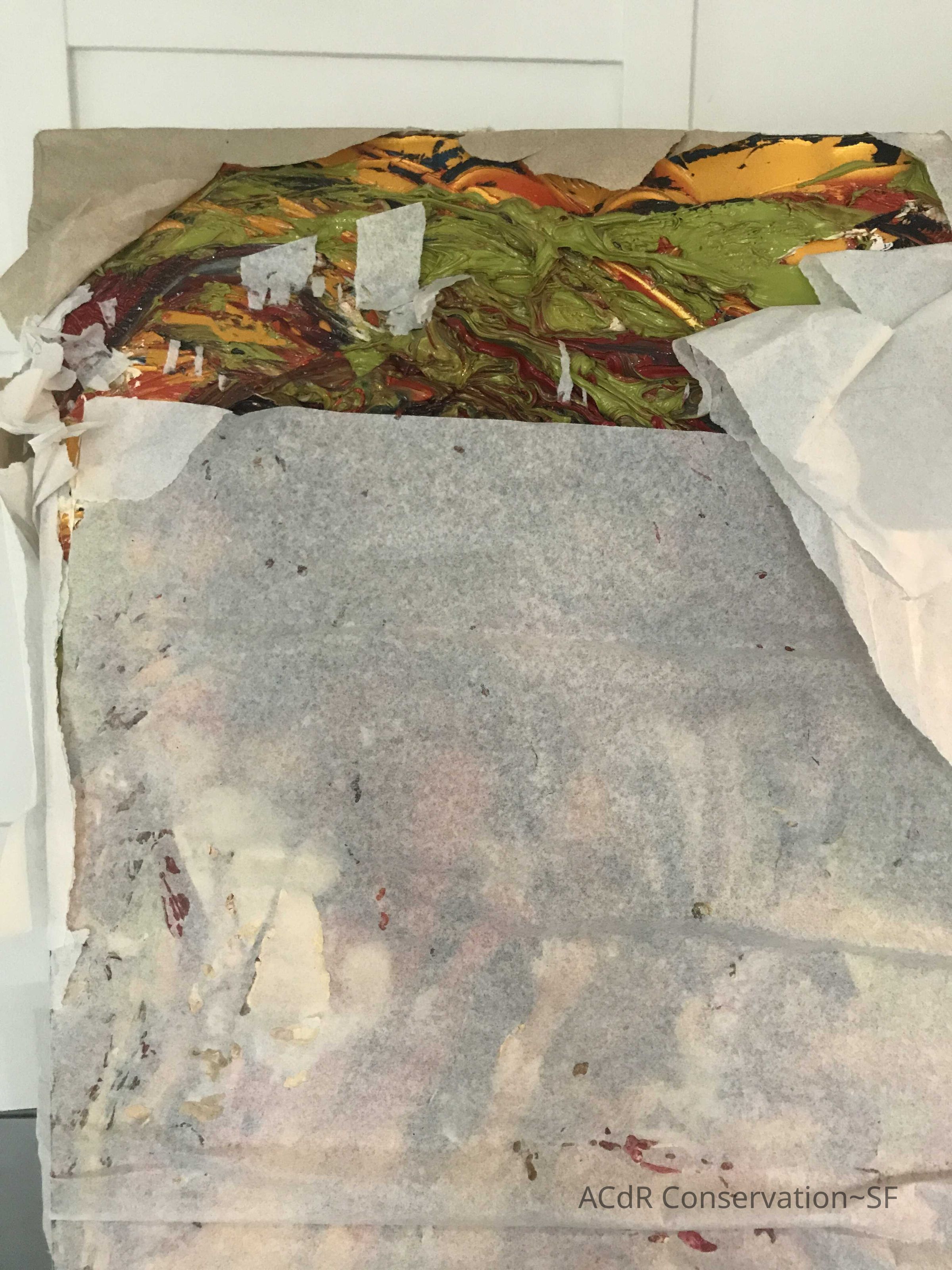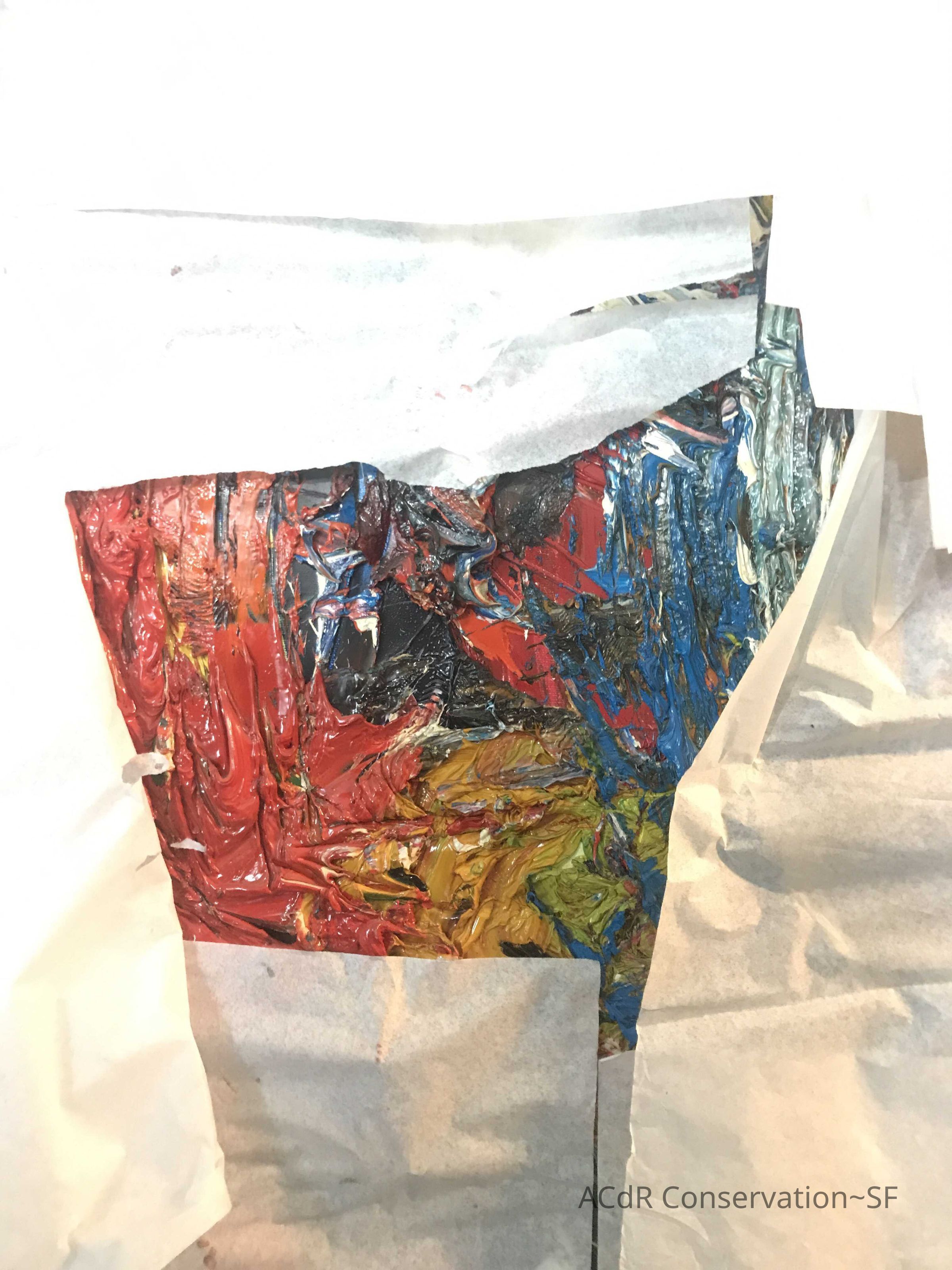 12 sheets of tissue paper adhered to the paintings face; tissue fibres are stuck to edges of painting and turnover egdes. Paper has been ripped off partially in 5 sheets, leaving tissue fibres stuck to exposed paint. There are numerous sheets of tissue in the top right corner.