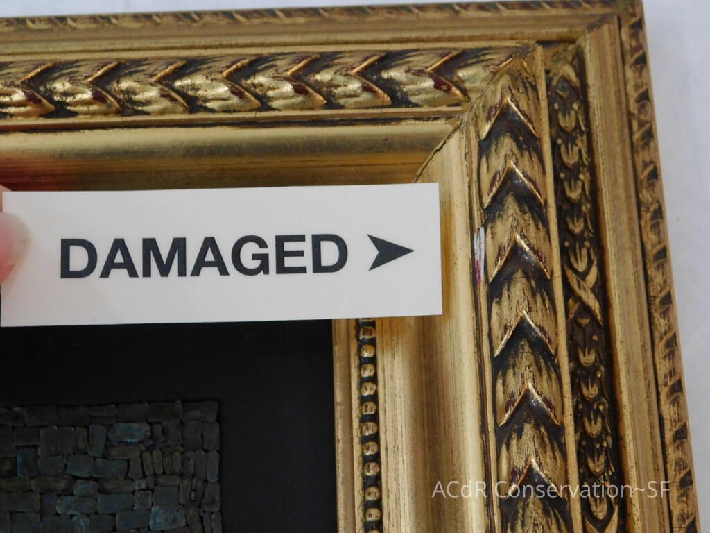 Mosaic in excellent condition with very few small areas of loss - unnoticeable unless in close proximity. Gilded frame has several areas of loss, cracks and two holes.