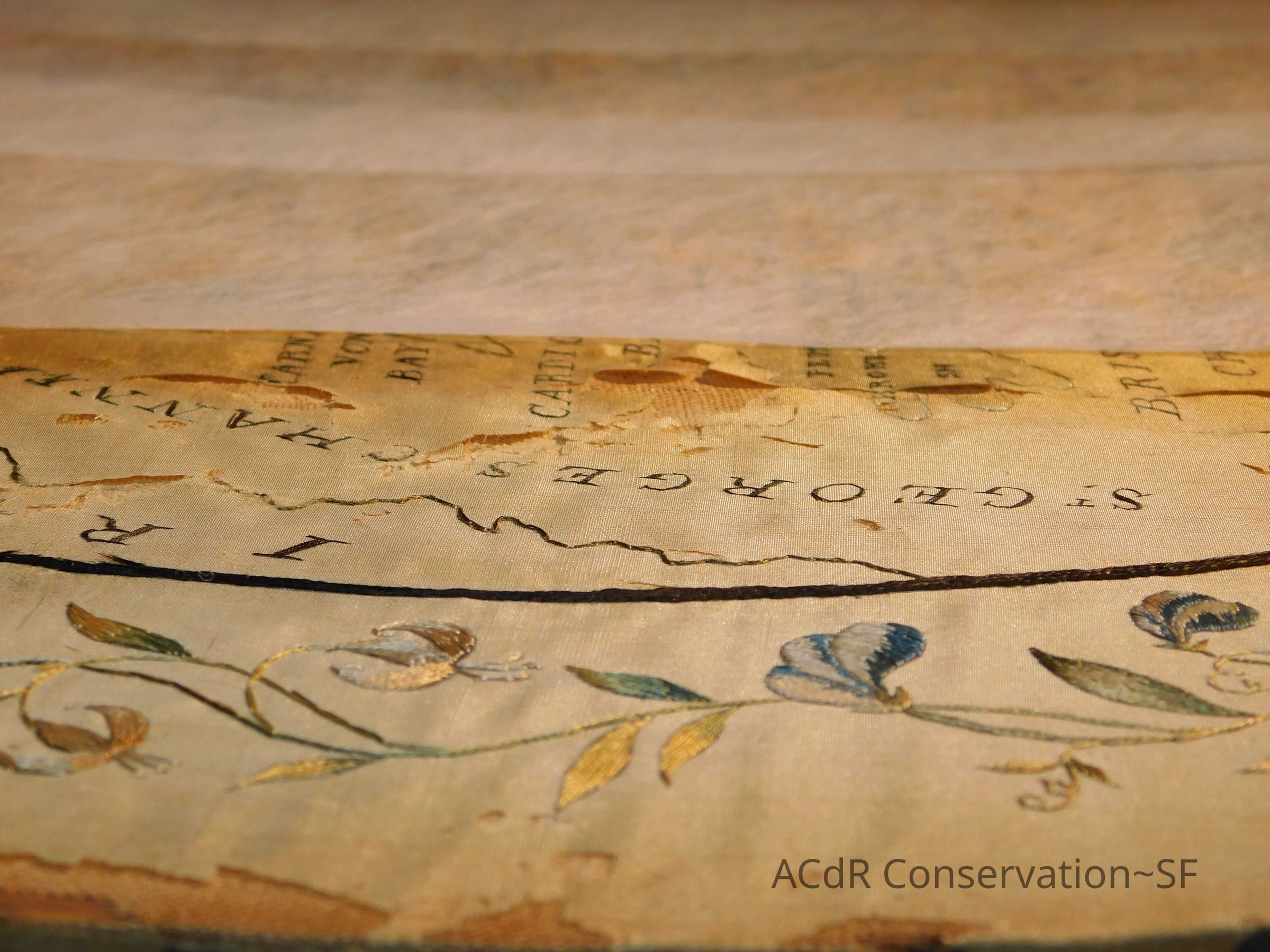 Consolidation of silk using 4:1 methyl cellulose in water. Consolidated edges of silk to linen lining.