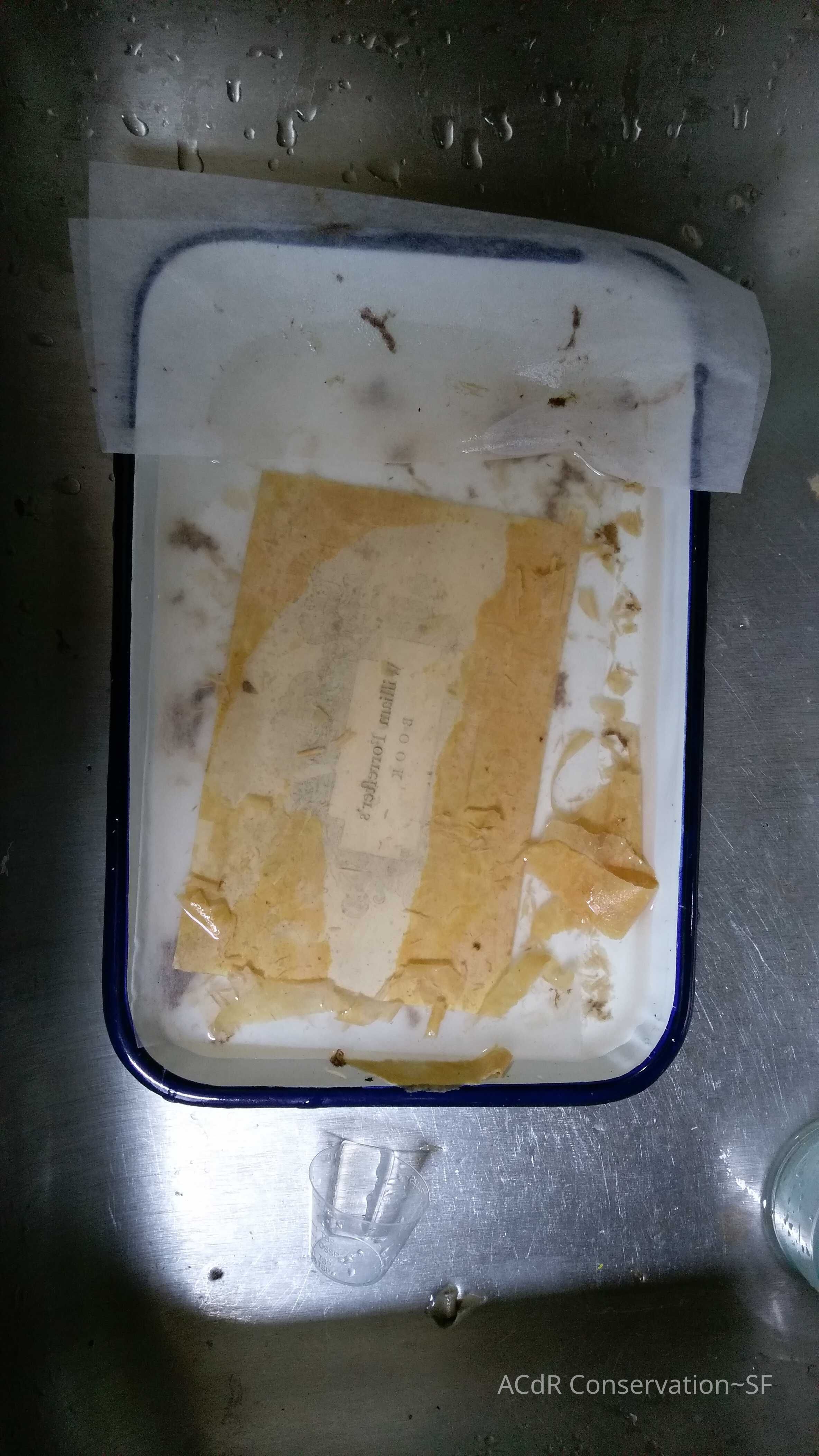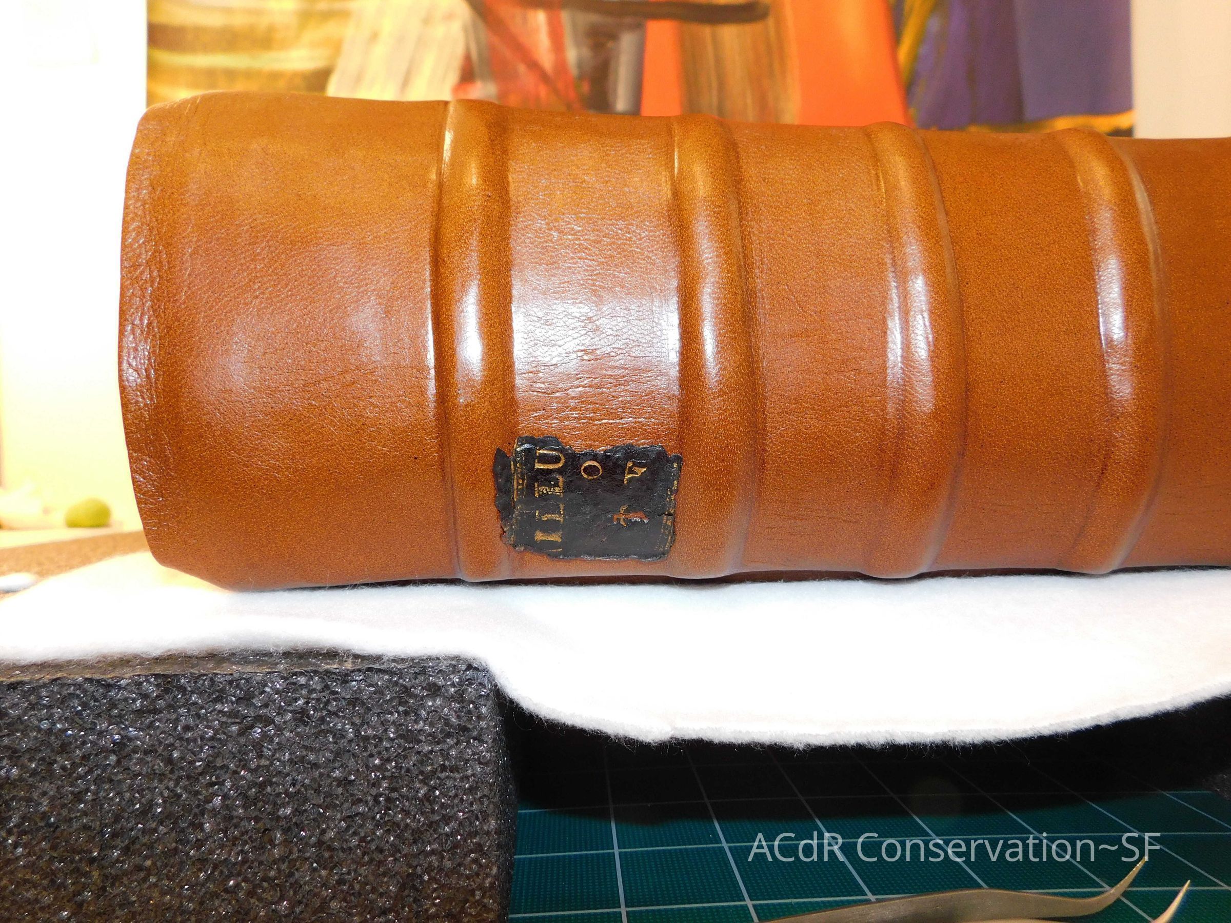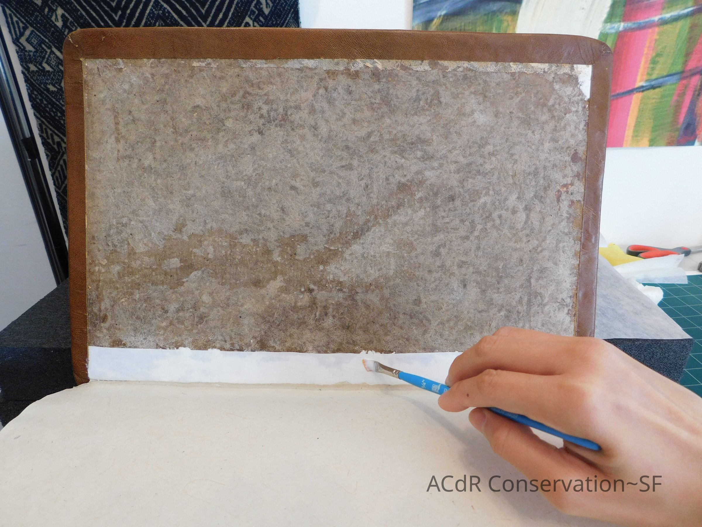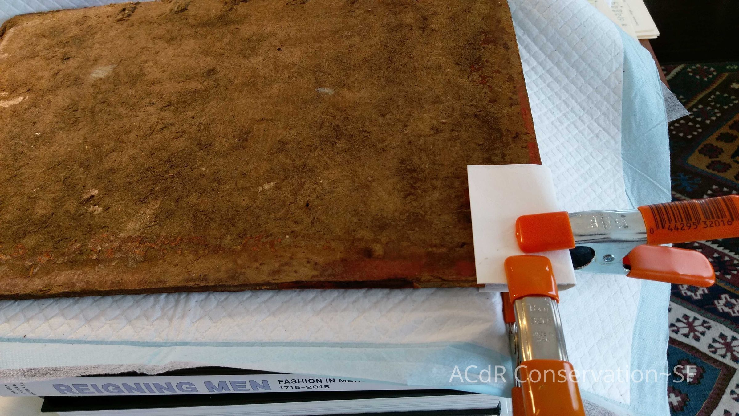 Took old leather off spine using dental tool. Lifted all residue from spine with dental tool and methyl cellulose (10%). Lifted original leather and press with spatula. Removed seals from covers, and removed paste-downs.