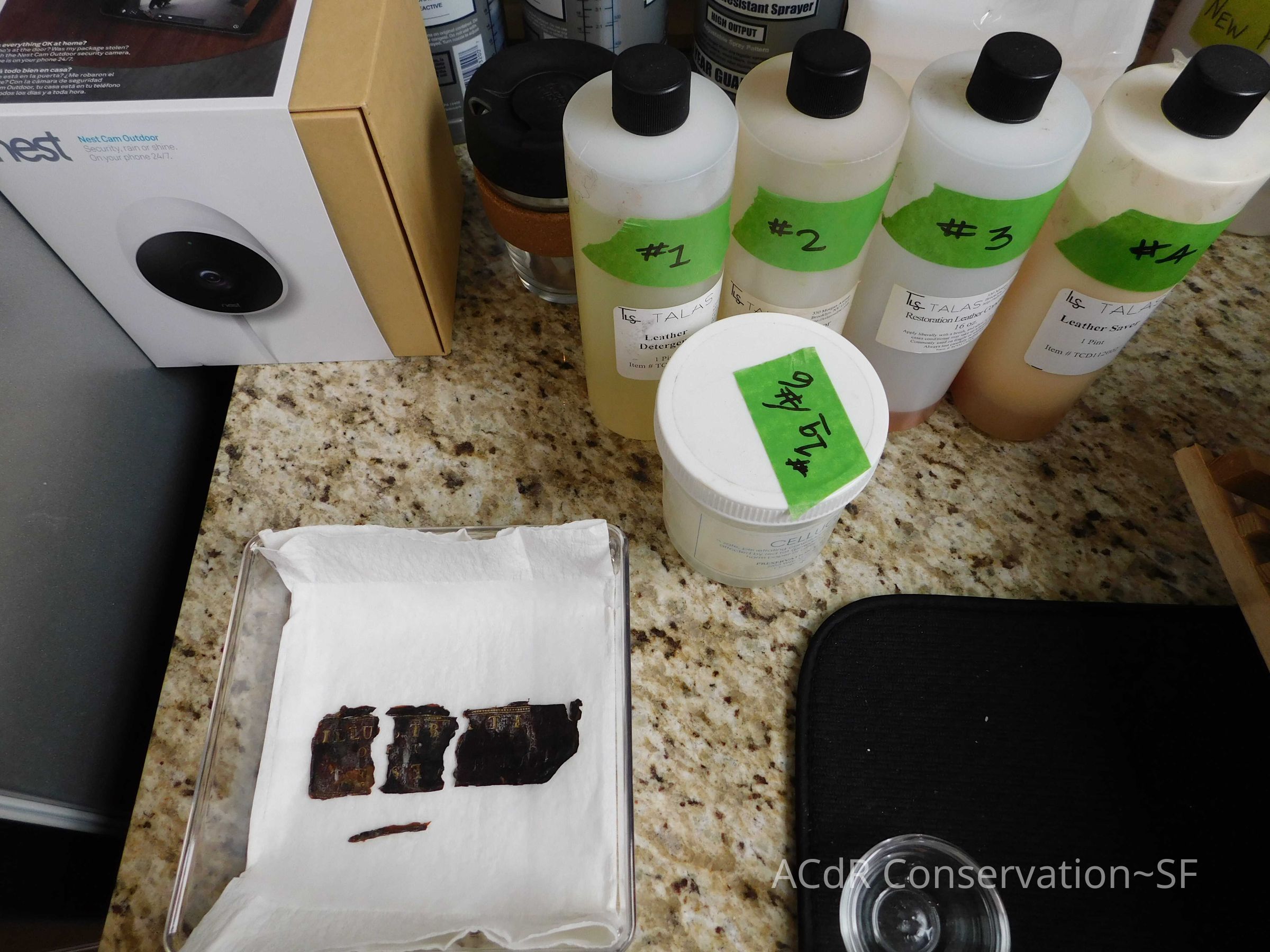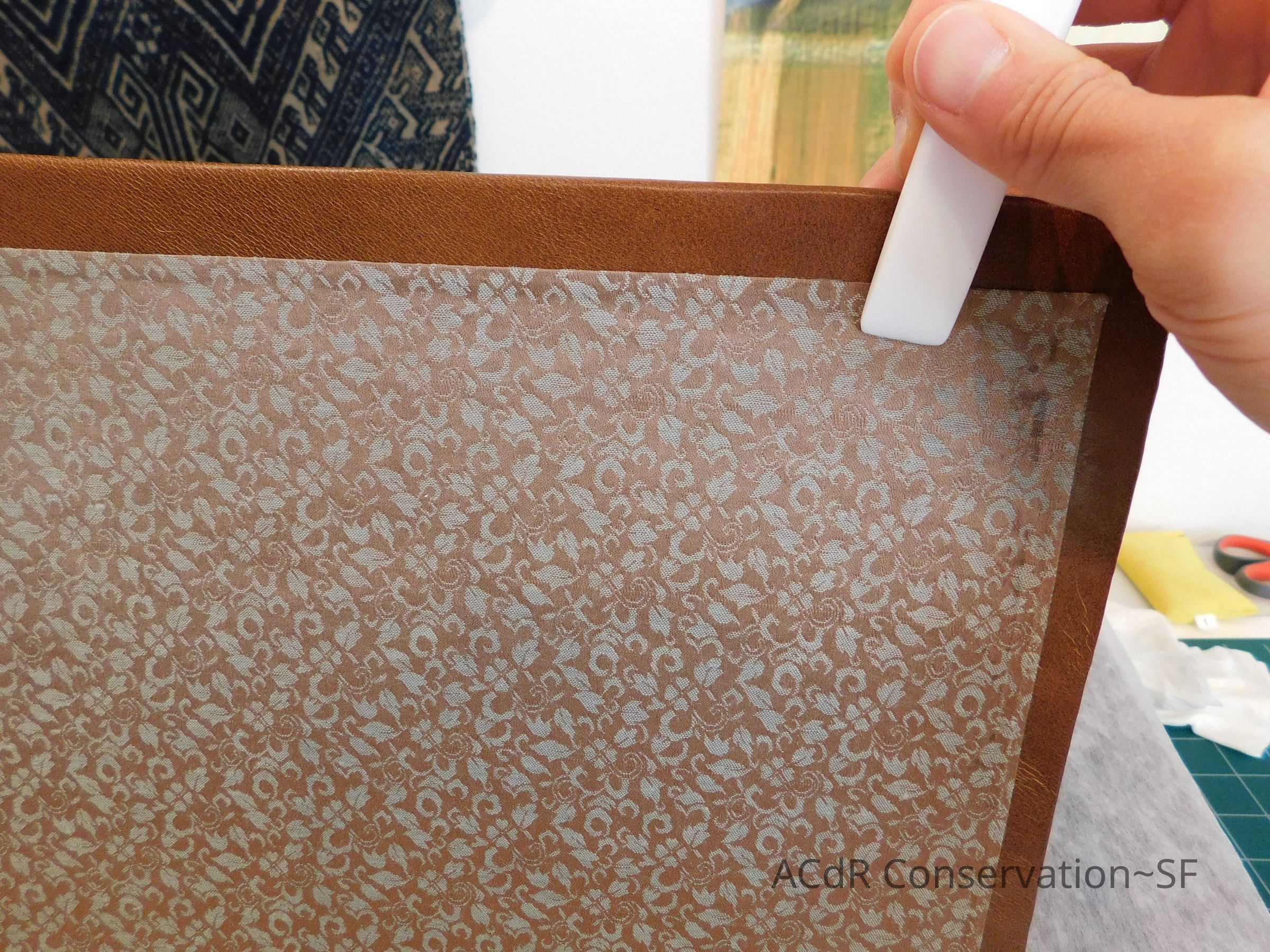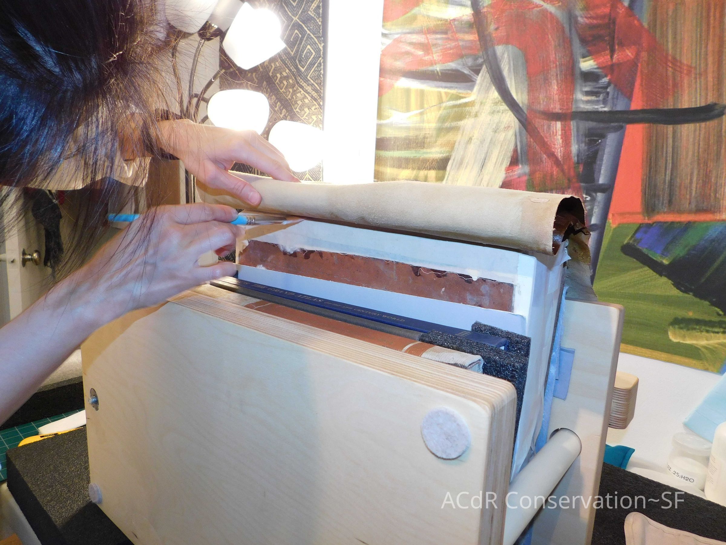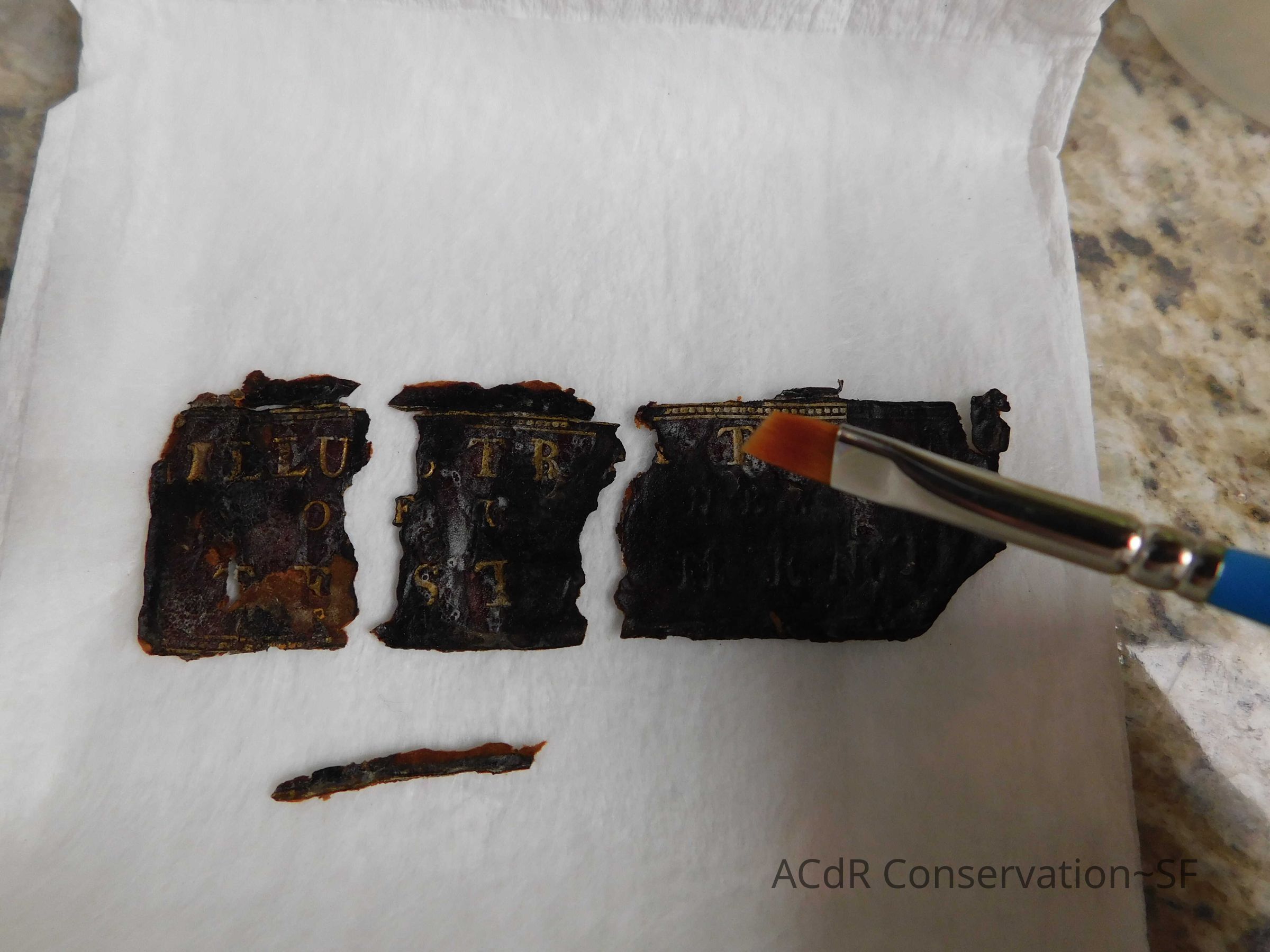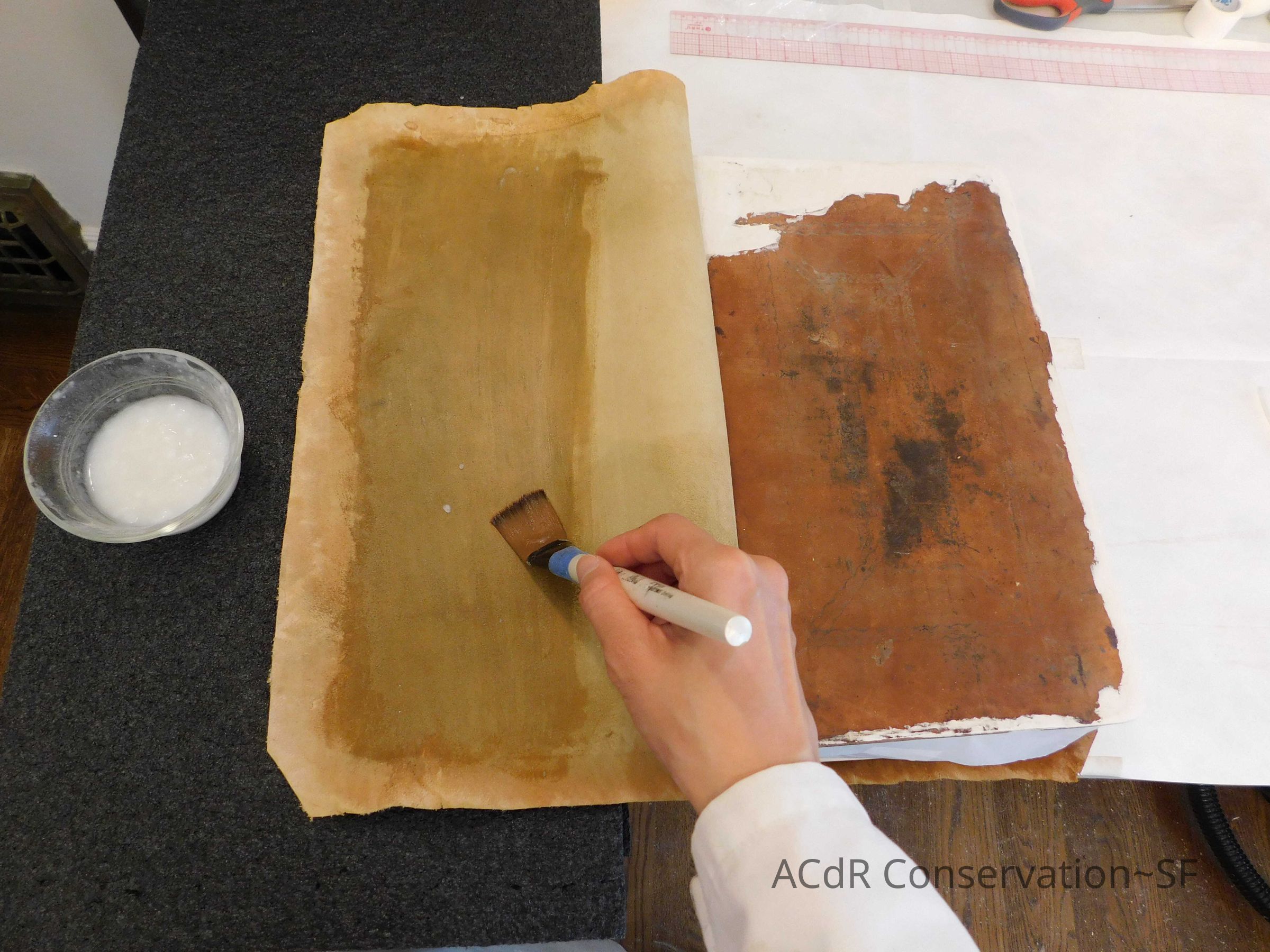 Took old leather off spine using dental tool. Lifted all residue from spine with dental tool and methyl cellulose (10%). Lifted original leather and press with spatula. Removed seals from covers, and removed paste-downs.