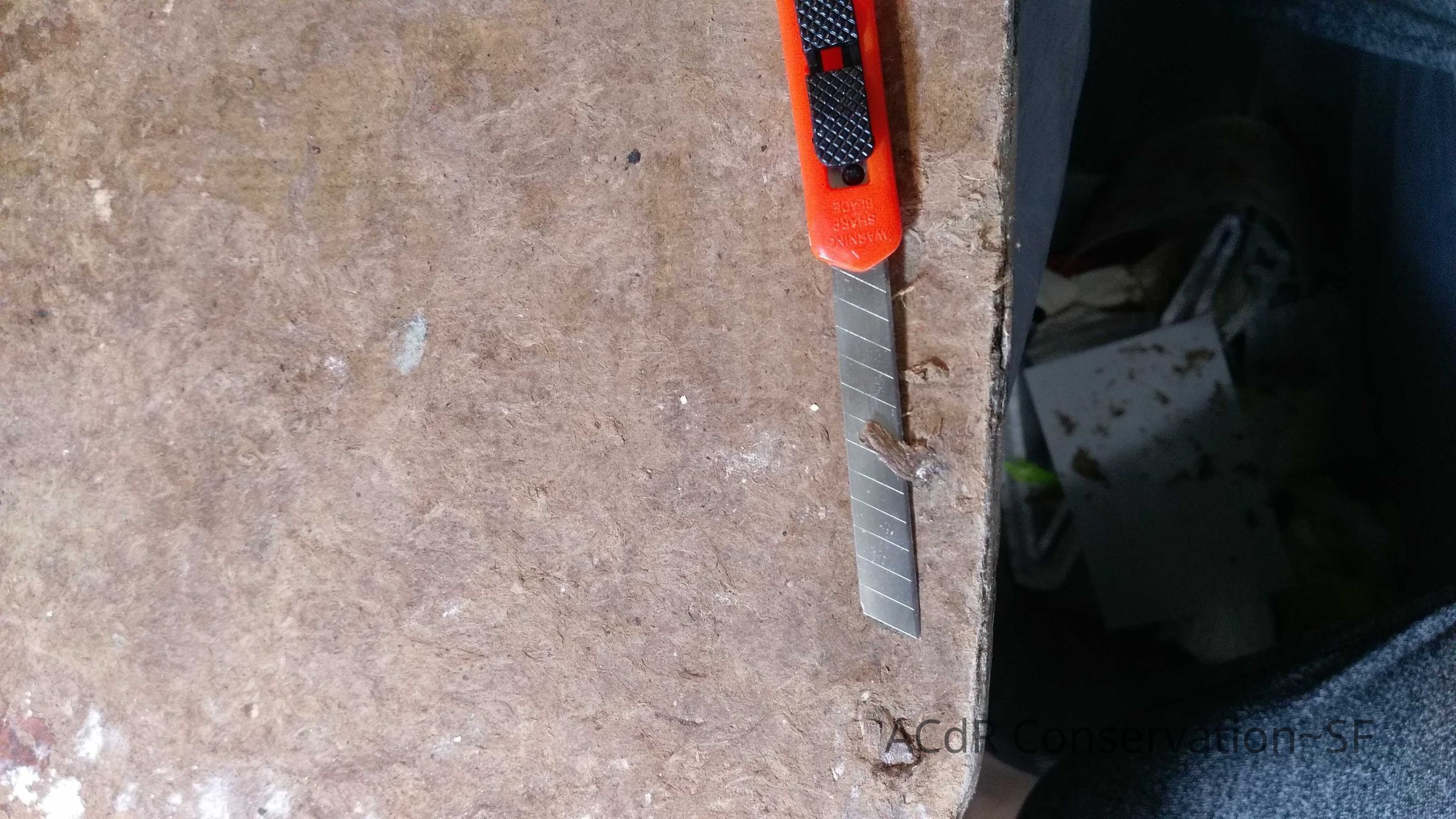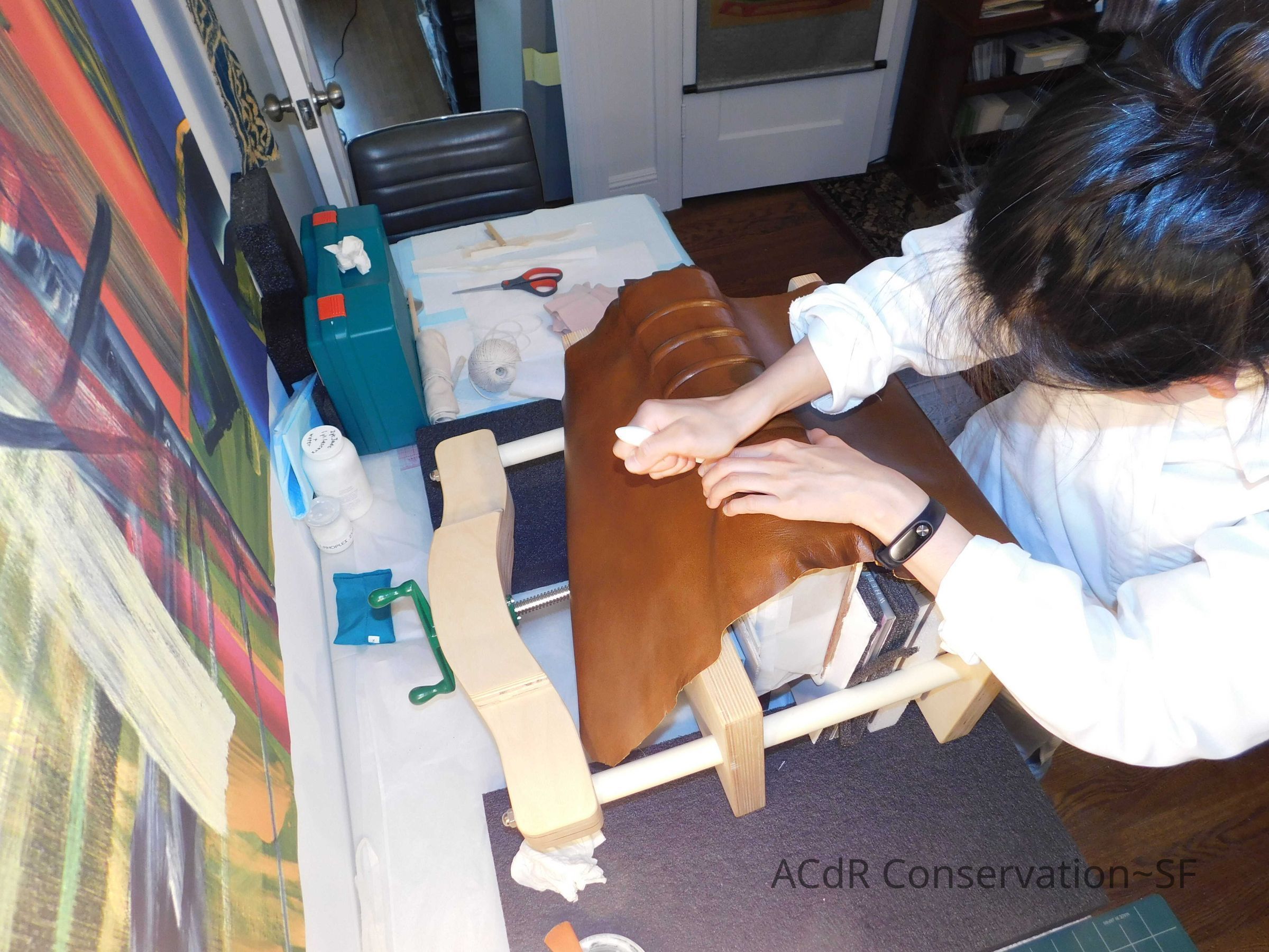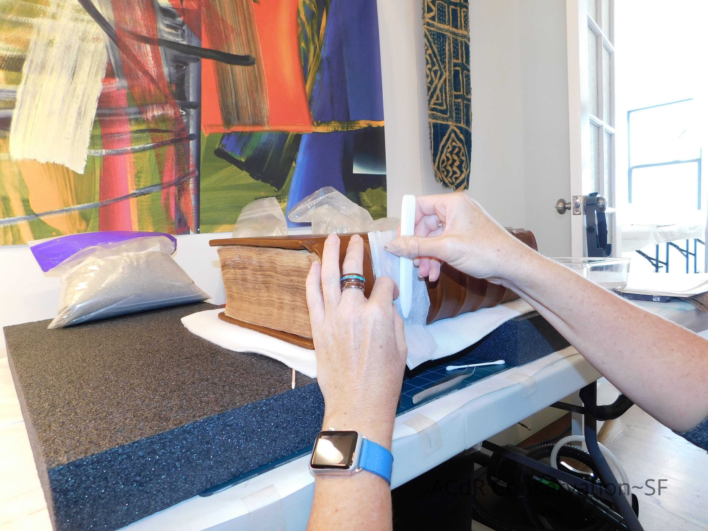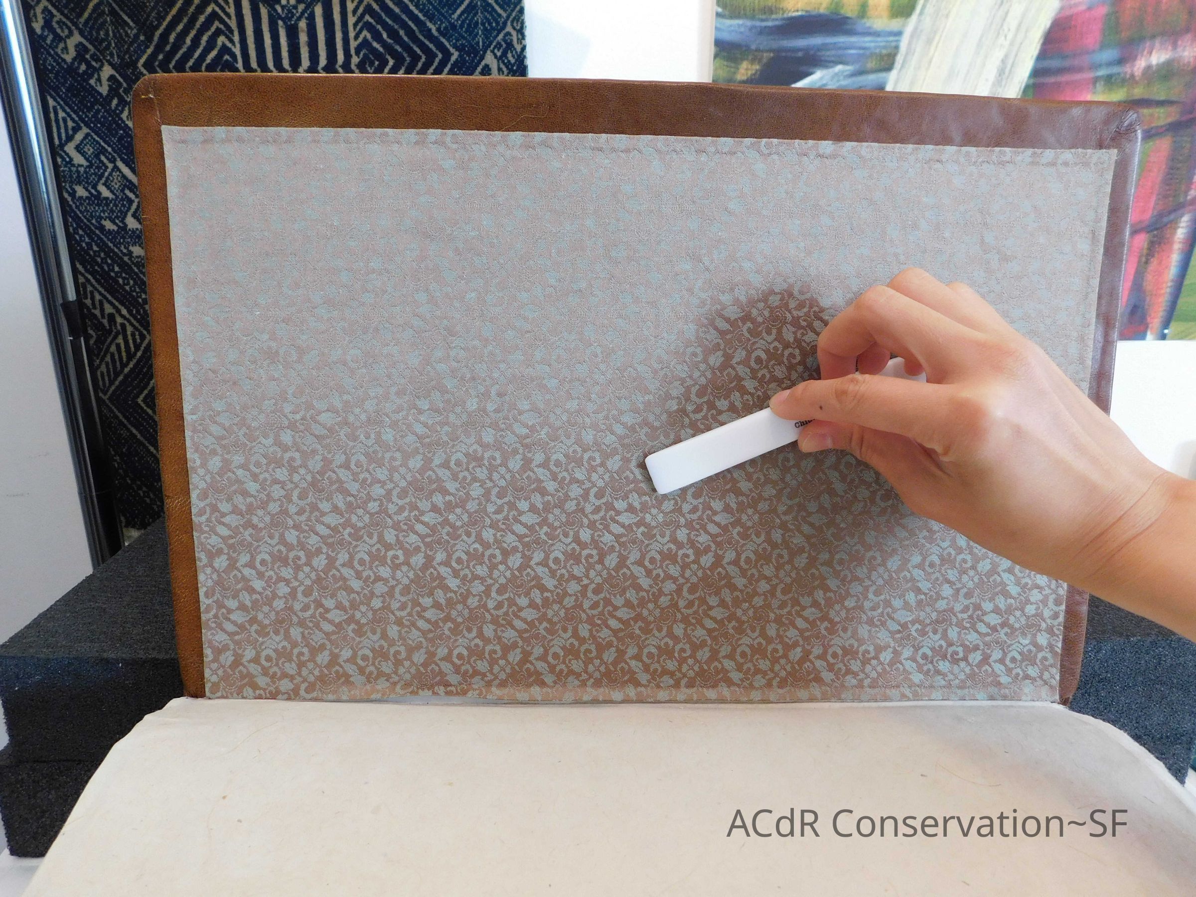 Took old leather off spine using dental tool. Lifted all residue from spine with dental tool and methyl cellulose (10%). Lifted original leather and press with spatula. Removed seals from covers, and removed paste-downs.
