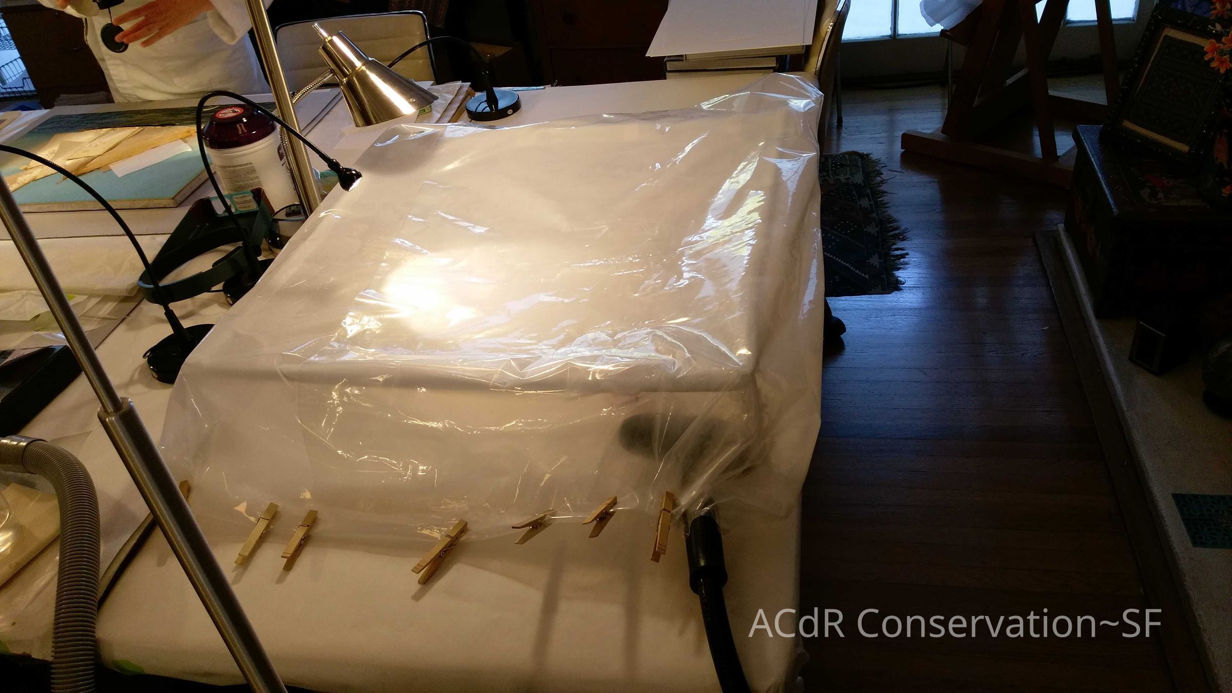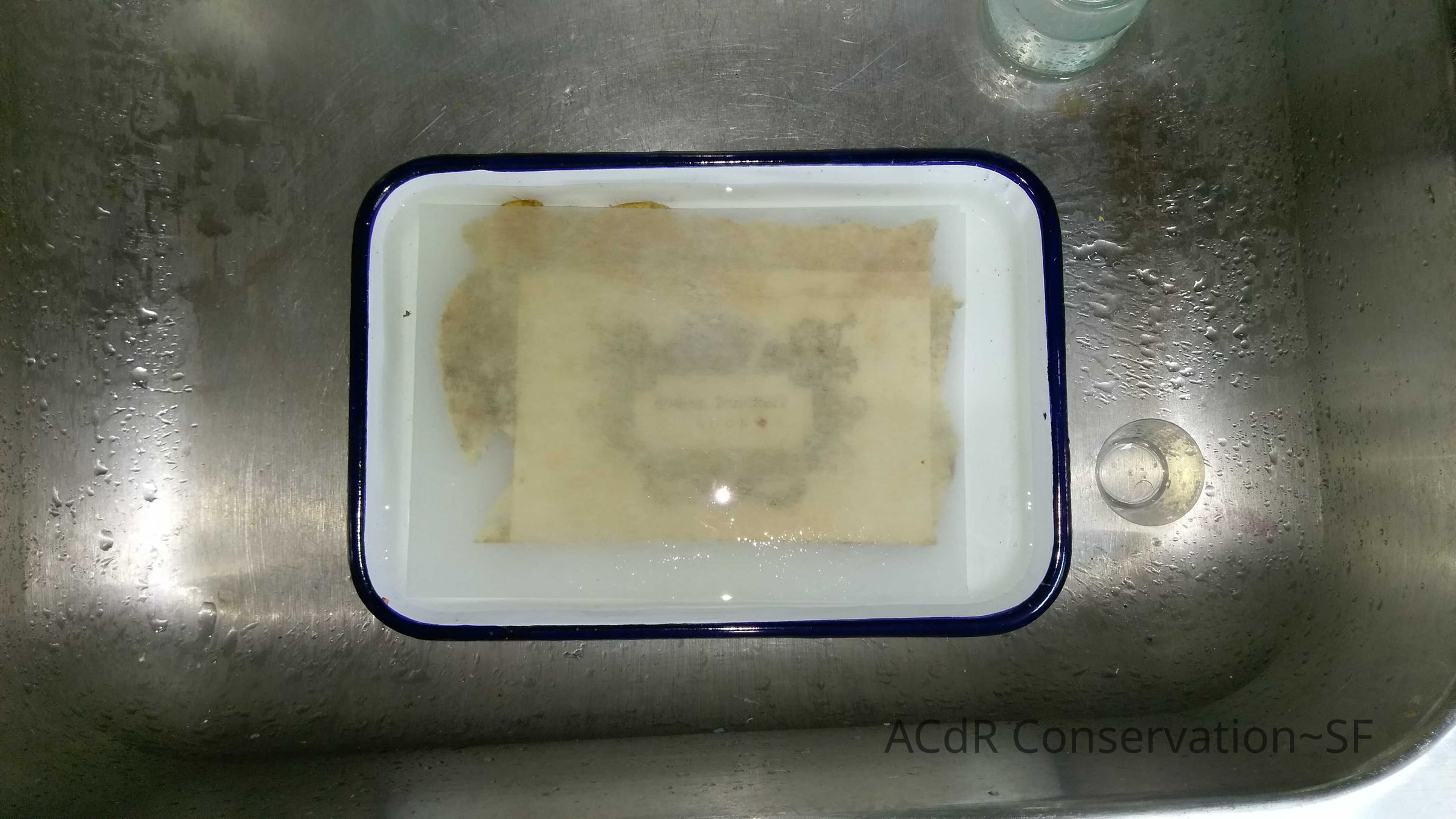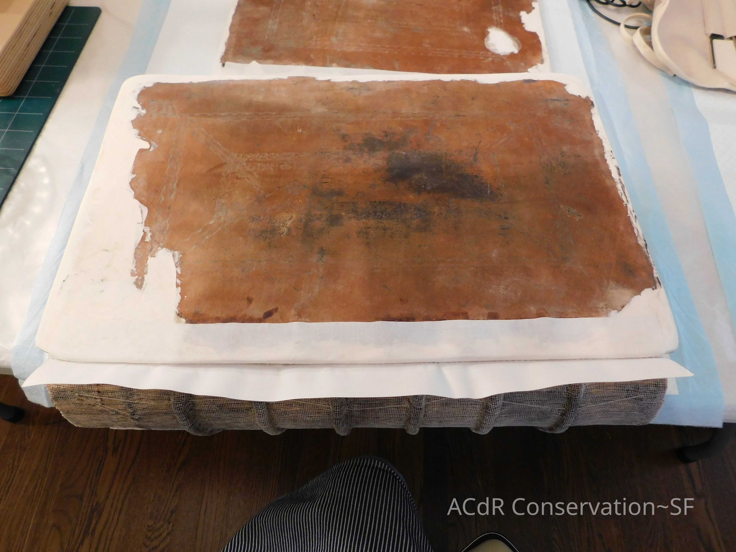 Vacuumed three single sheets, humidified with water and alcohol (by chamber with steam). Flattened three single sheets. Humidified again and pressed sheets to remove part of backing, pressed all sheets. Removed residue of backing by localized humidification. Used Gore-Tex to humidify sheet again. Cleaned tears and pressed again. Trimmed off mending strips. Humidified covers. Mended tears of sheets.