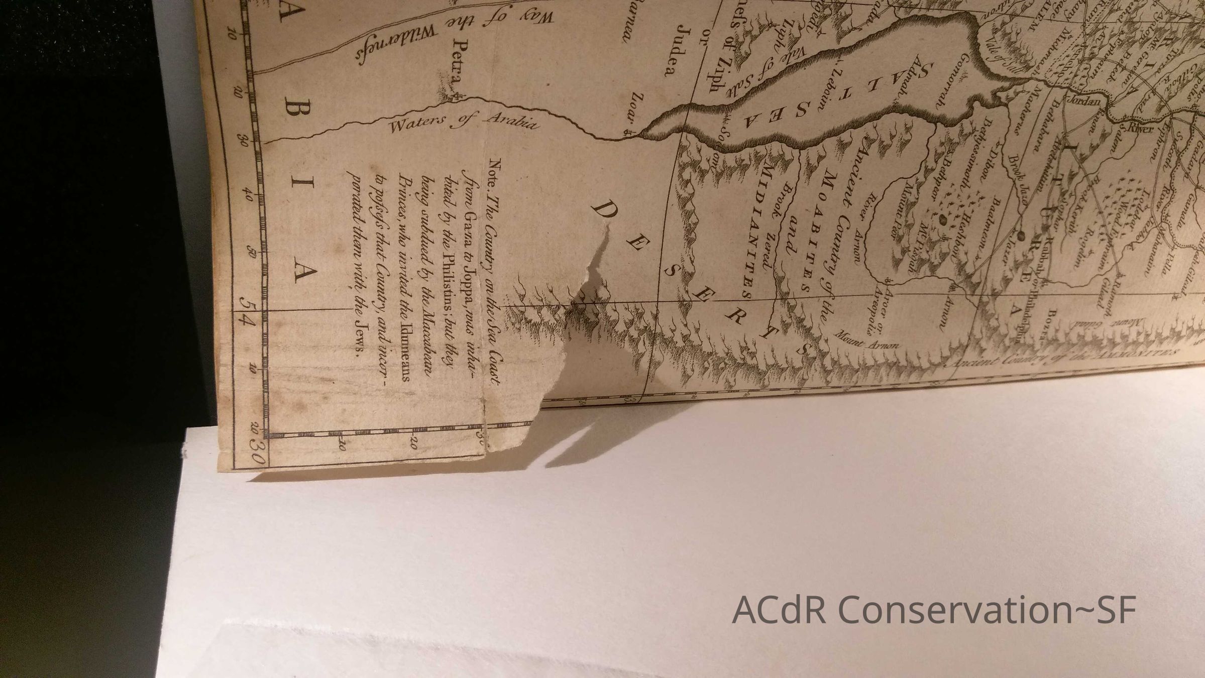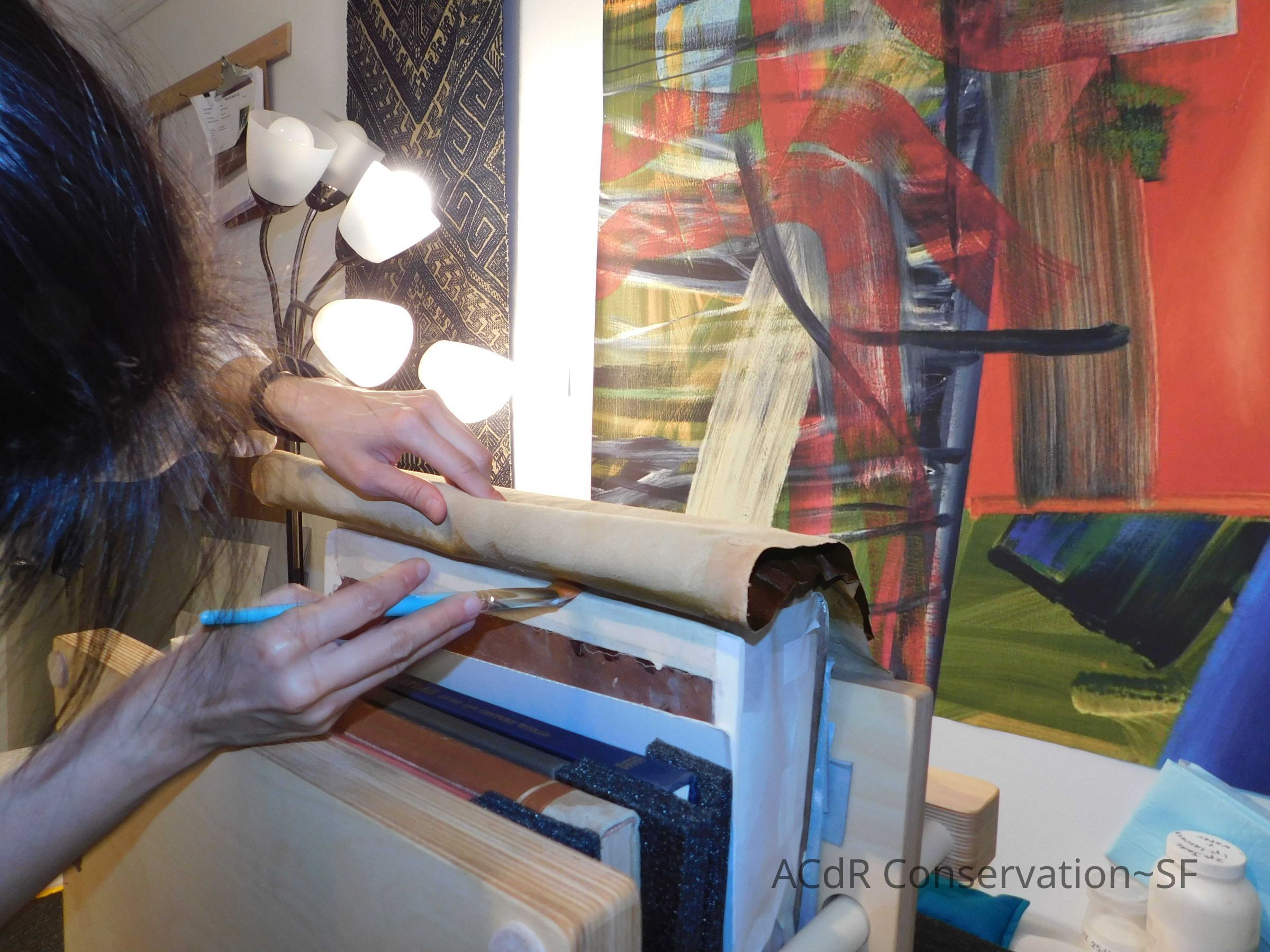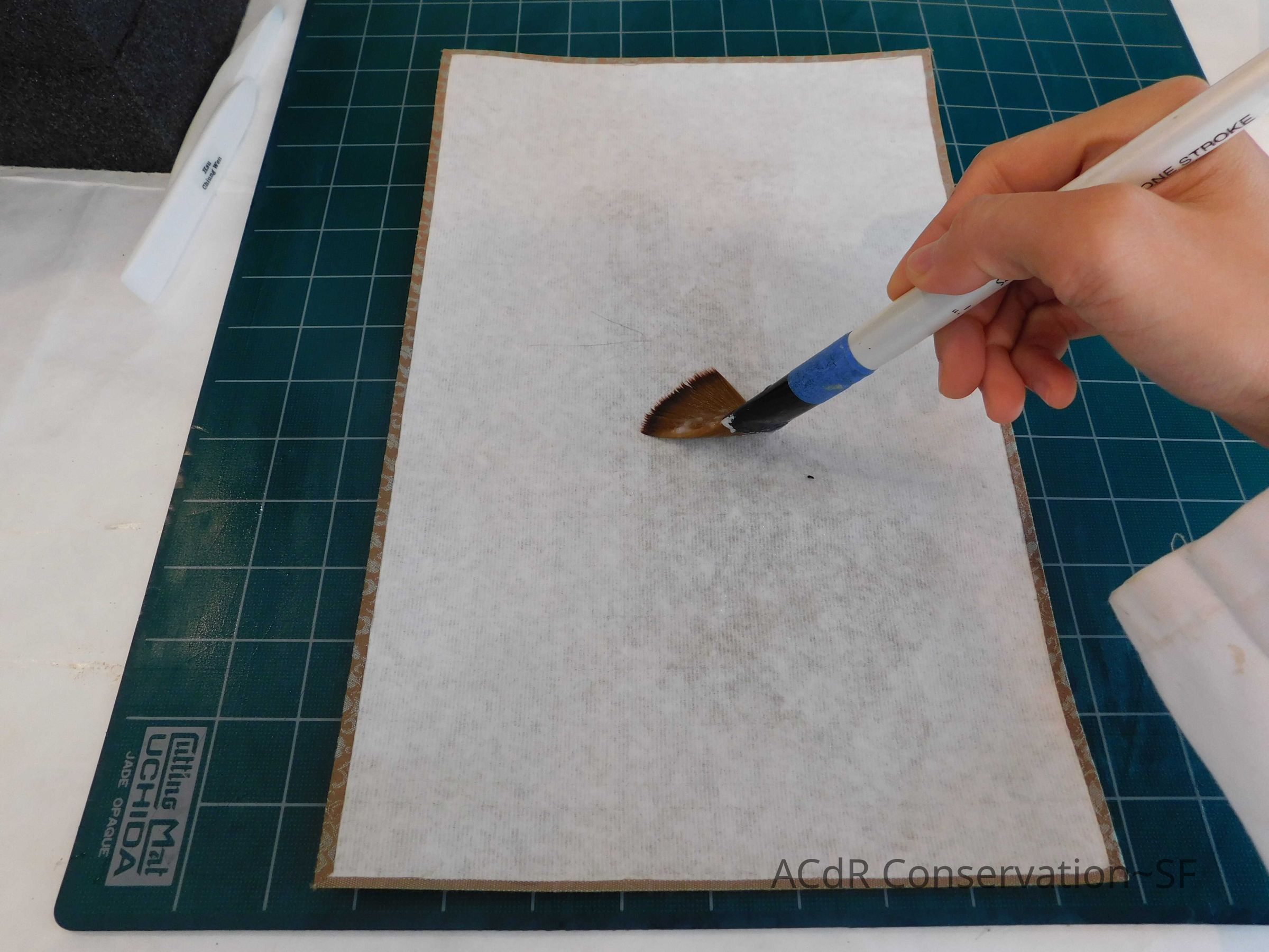Vacuumed three single sheets, humidified with water and alcohol (by chamber with steam). Flattened three single sheets. Humidified again and pressed sheets to remove part of backing, pressed all sheets. Removed residue of backing by localized humidification. Used Gore-Tex to humidify sheet again. Cleaned tears and pressed again. Trimmed off mending strips. Humidified covers. Mended tears of sheets.