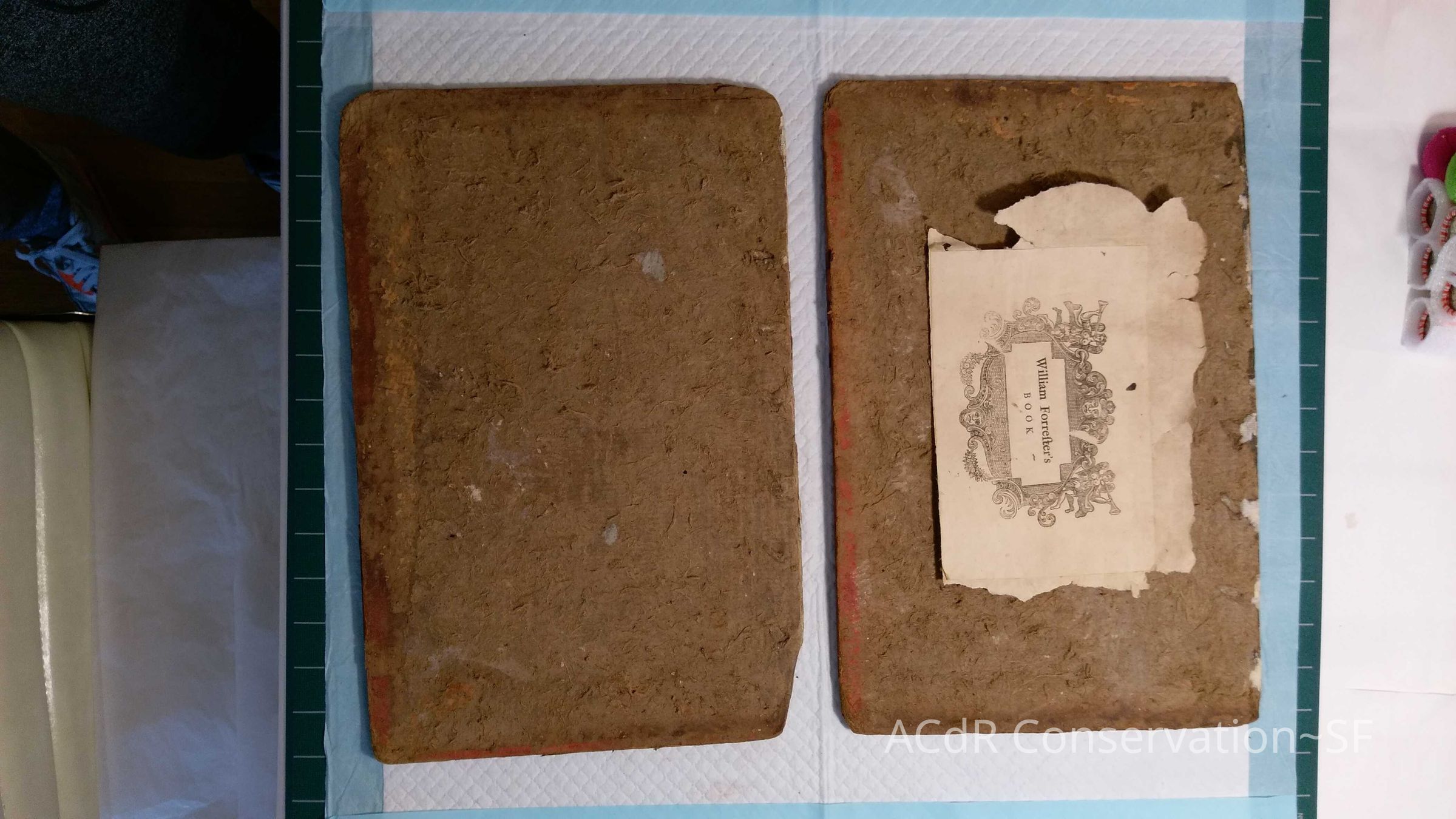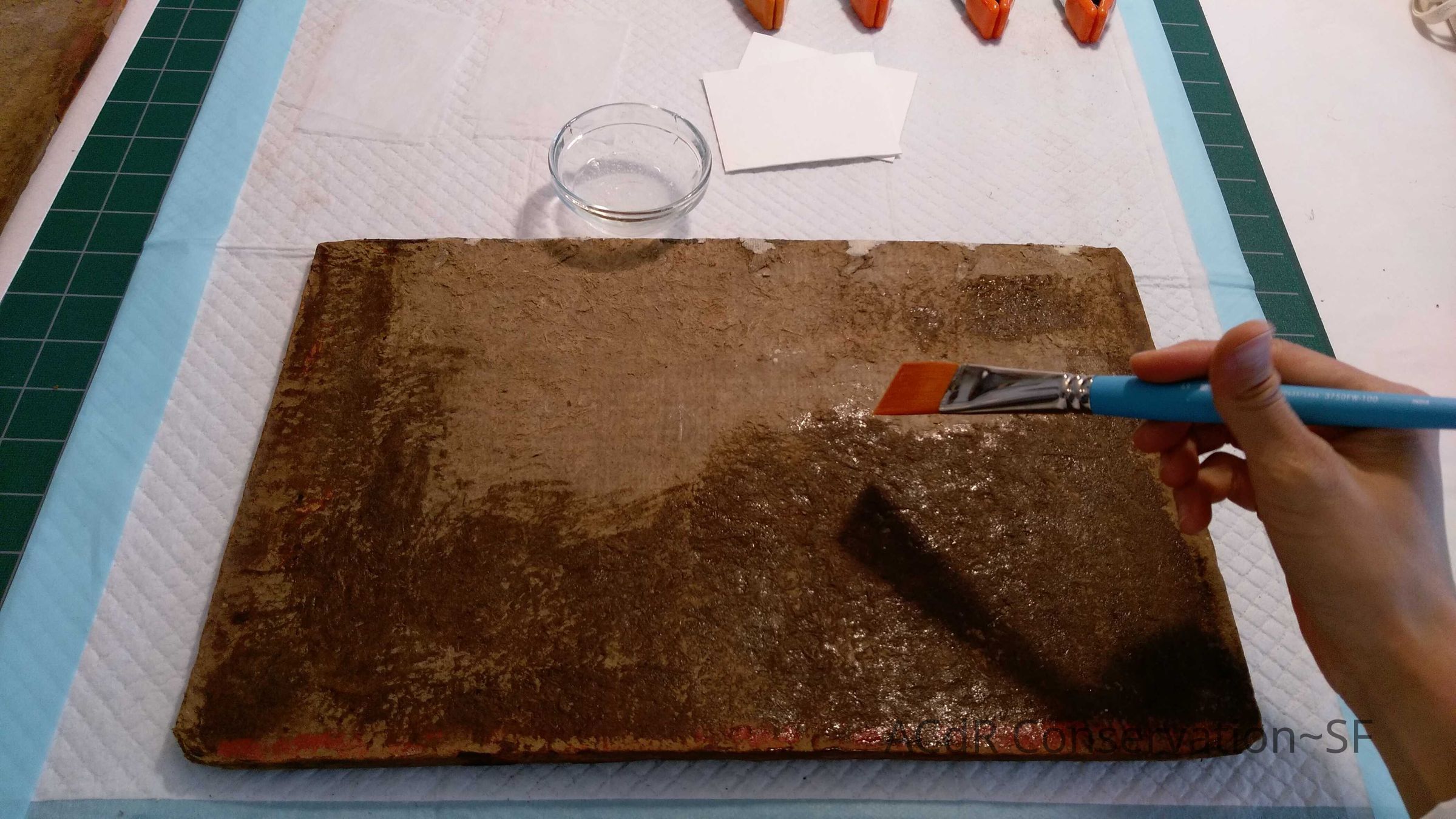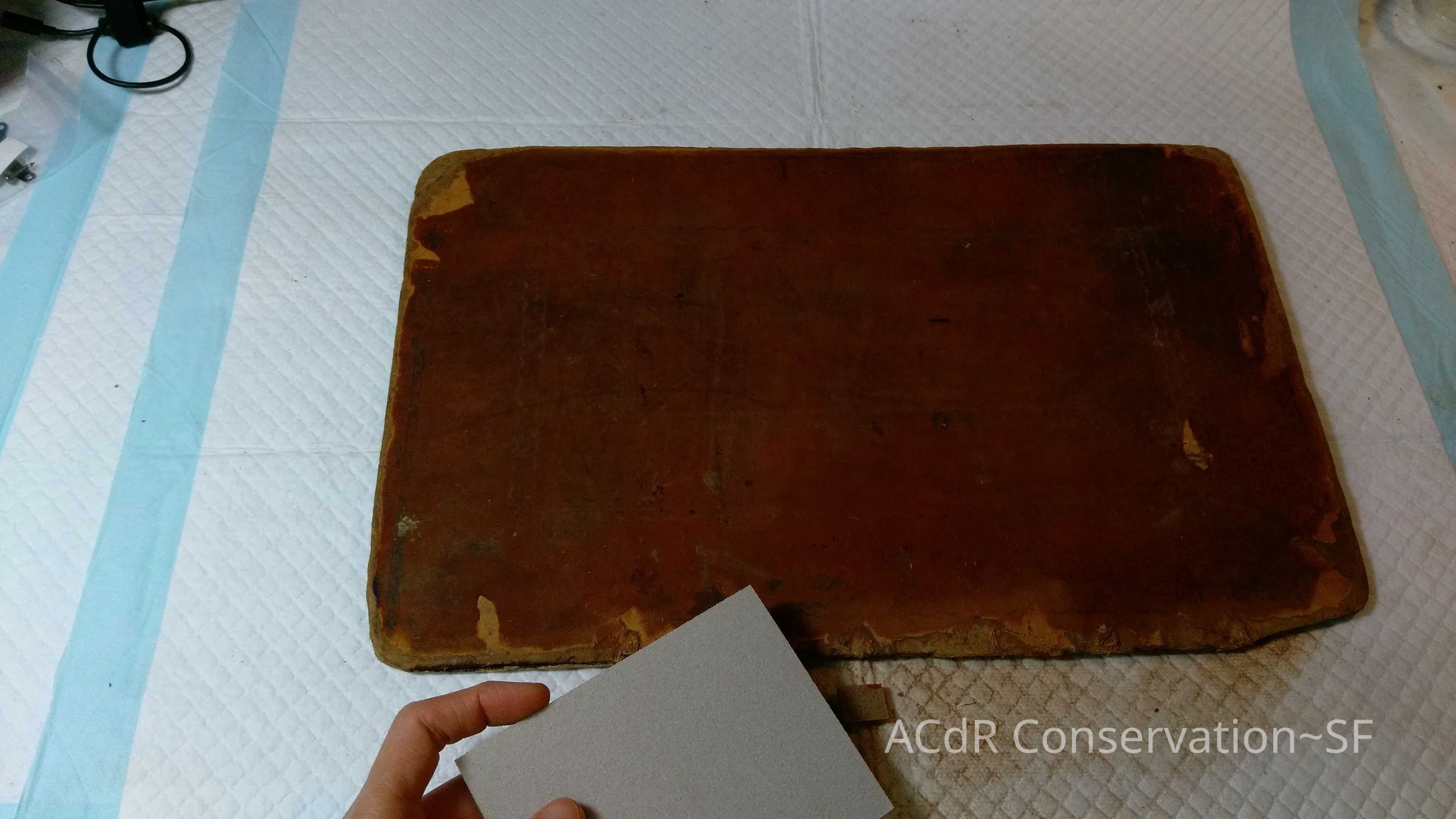 Polished the cover boards with teflon bone folder. Sized boards with methyl cellulose. Fixed the corners with wheat paste and clips. Removed backing of label. Put label in tray with Pellon layer. Used fingers to rub and peel off the backing. Fixed corners with wheat paste again. Mended tears again. Reattached leaves to book block. Sanded boards and filled holes and losses with Modostuc. Peeled the cords and uneven surface of the boards. Sanded until smooth.