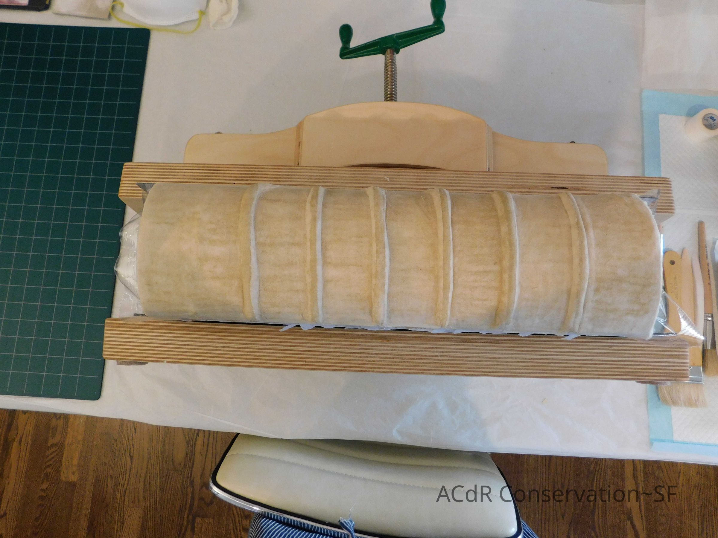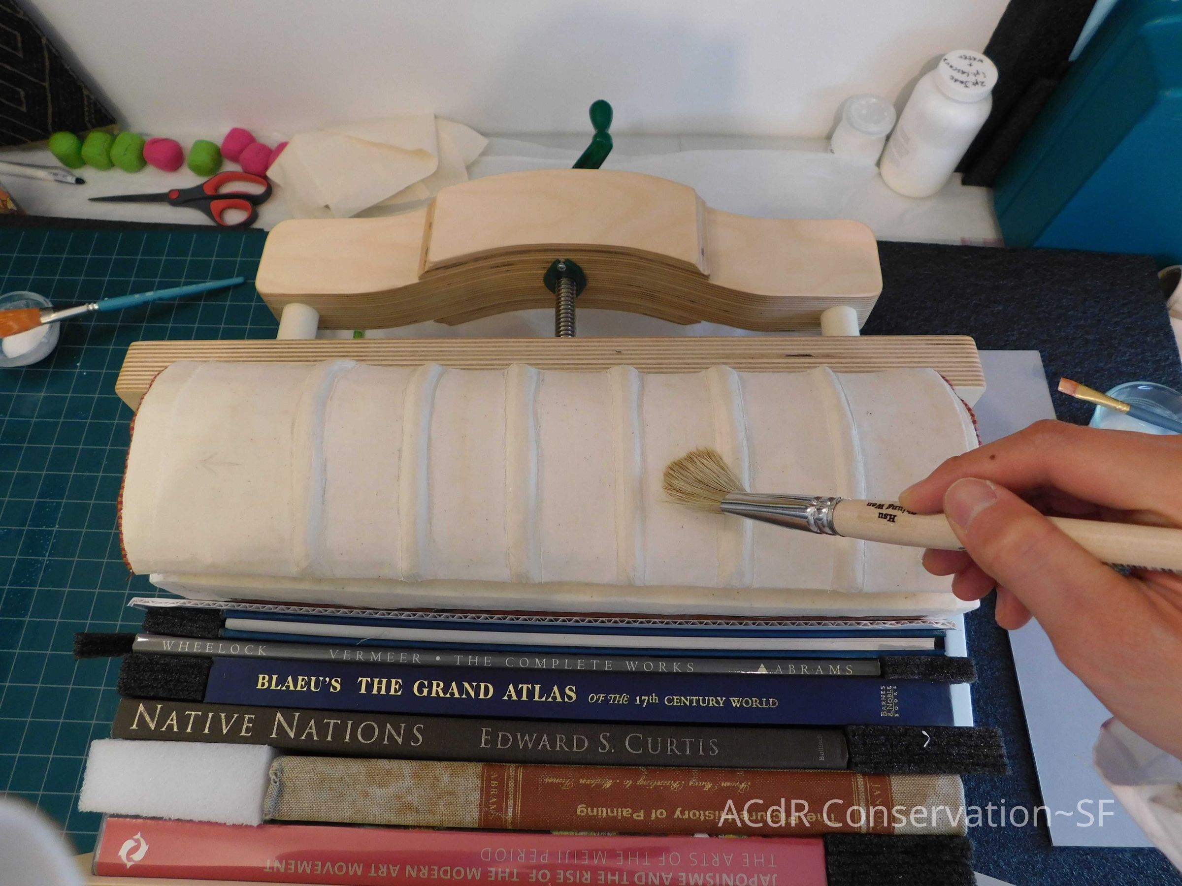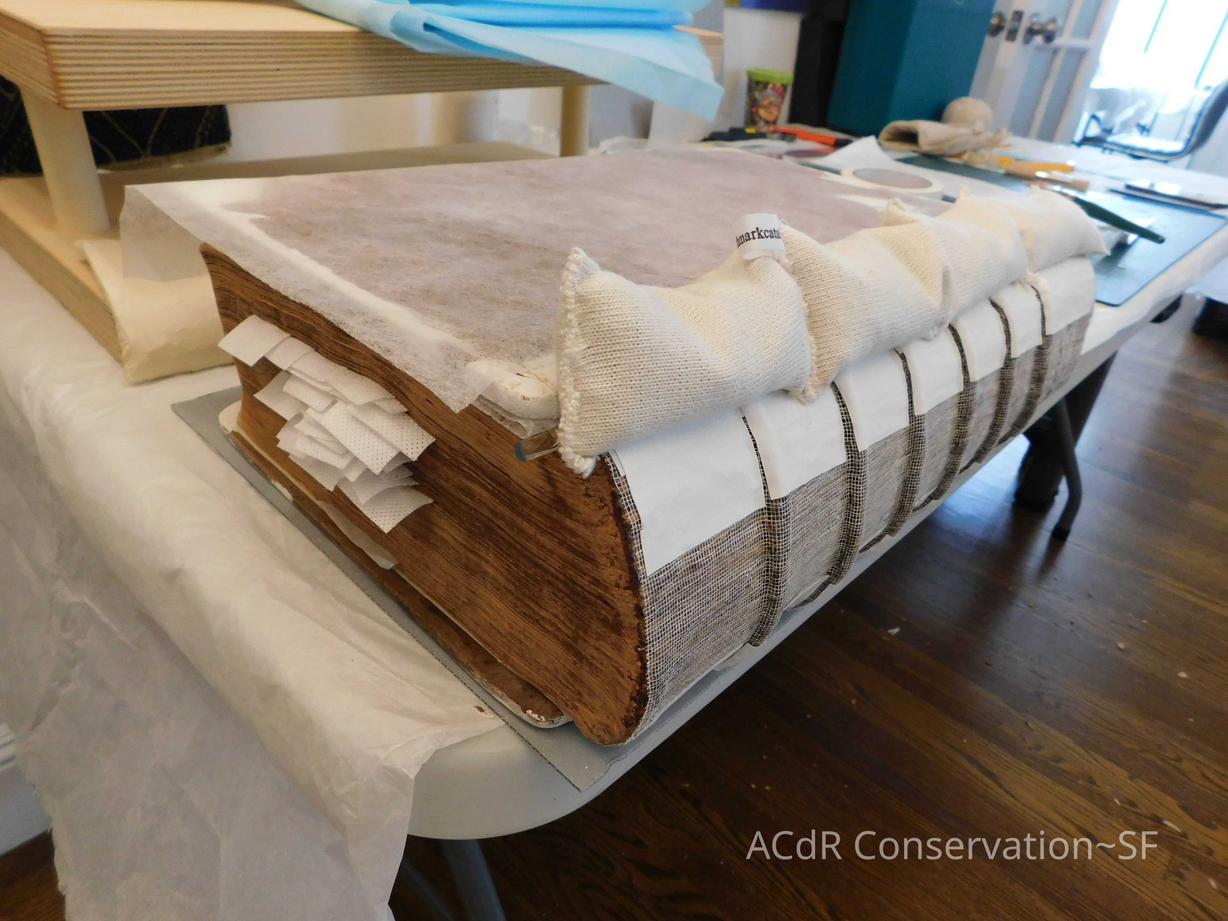 Polished the cover boards with teflon bone folder. Sized boards with methyl cellulose. Fixed the corners with wheat paste and clips. Removed backing of label. Put label in tray with Pellon layer. Used fingers to rub and peel off the backing. Fixed corners with wheat paste again. Mended tears again. Reattached leaves to book block. Sanded boards and filled holes and losses with Modostuc. Peeled the cords and uneven surface of the boards. Sanded until smooth.