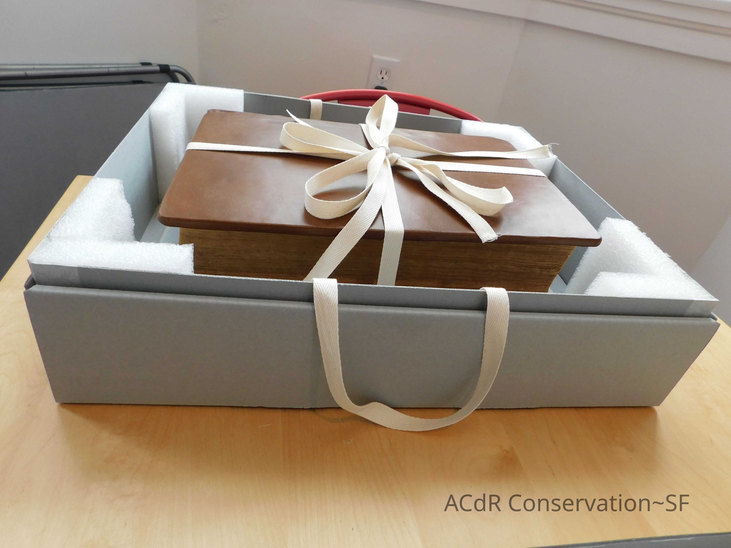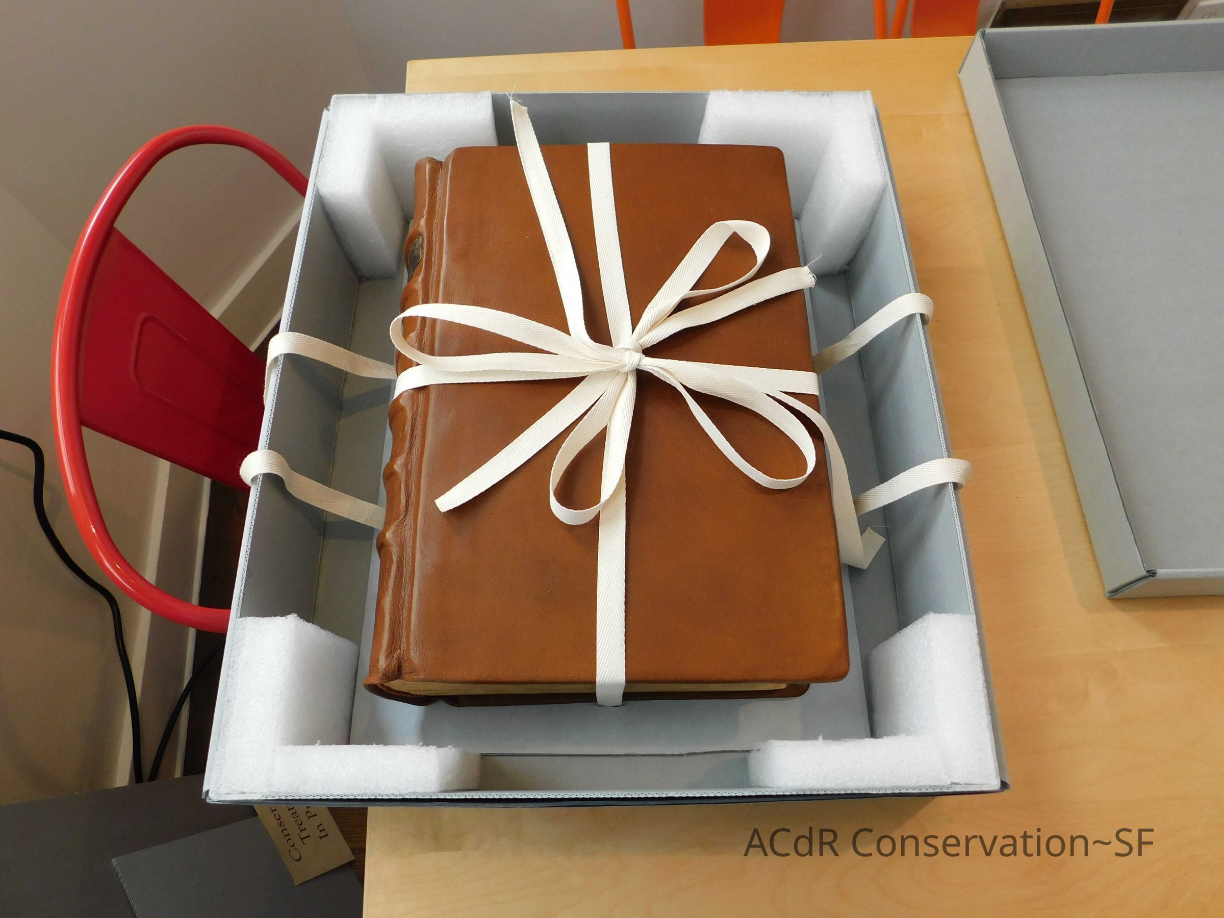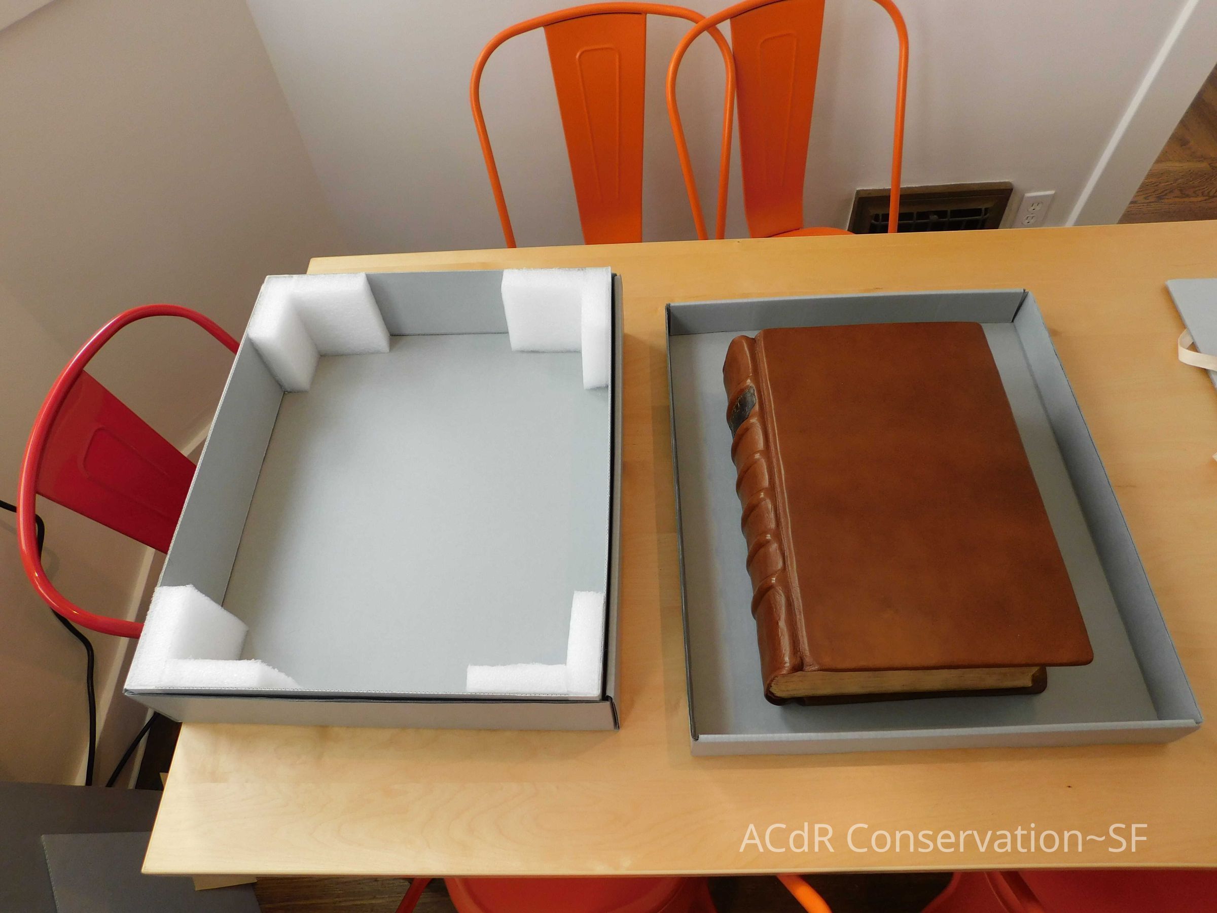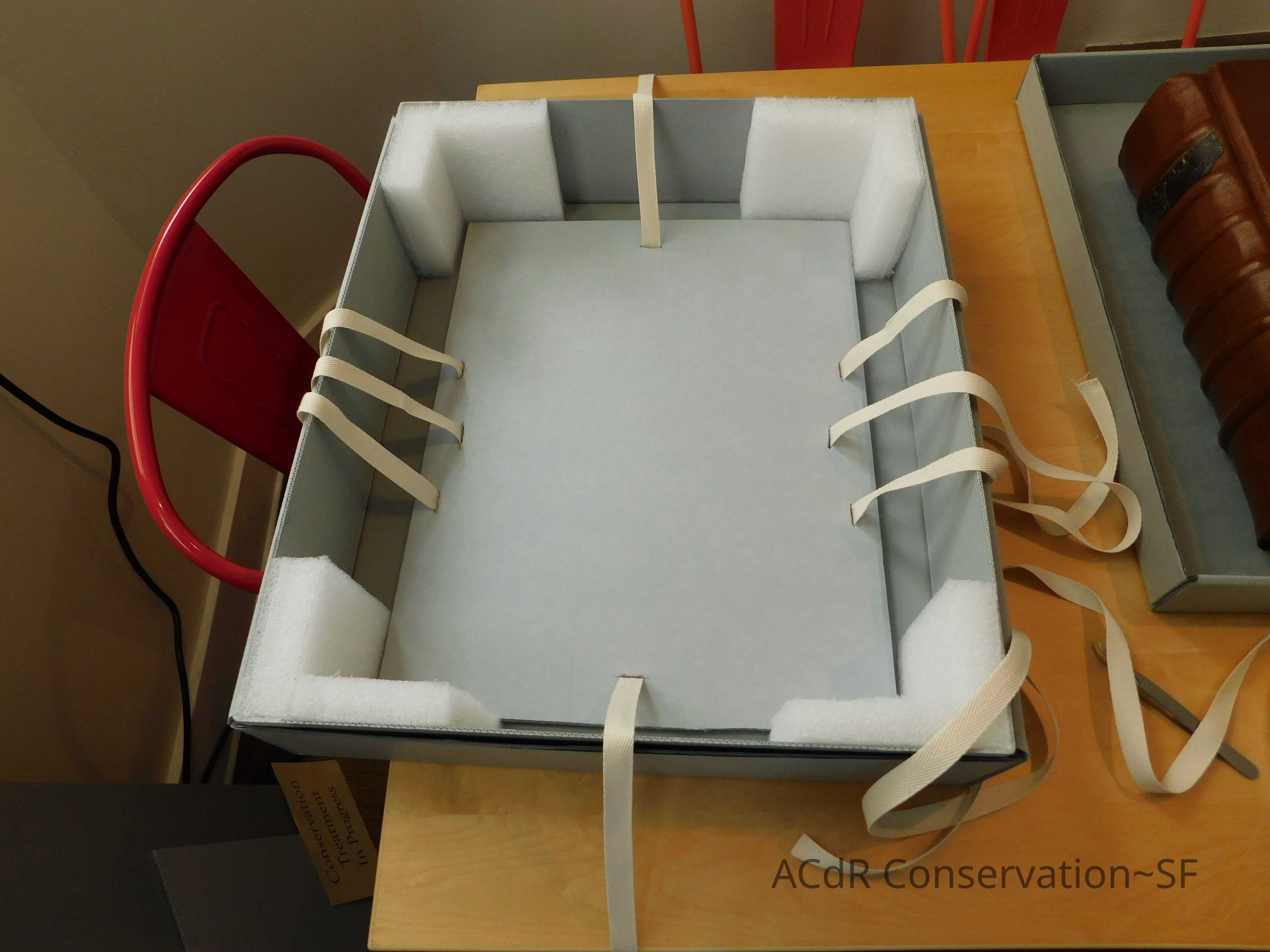 Used pre-made blueboard box and extended height using strips of blueboard and remay tape. Glued ethafoam blocks to create bumper corners for tray. Laminated two sheets of blueboard with 1" margin of book. Cut out slots from tray for single length of twill tape to run through and create handles to lift book on tray. Secured handles with sewn on velcro strips. Cut out slots from tray for twill tape ribbons to hold book in place on top and bottom. Adhered volara to lid of box to protect book cover. Created belt of twill tape to secure lid to bottom of box.