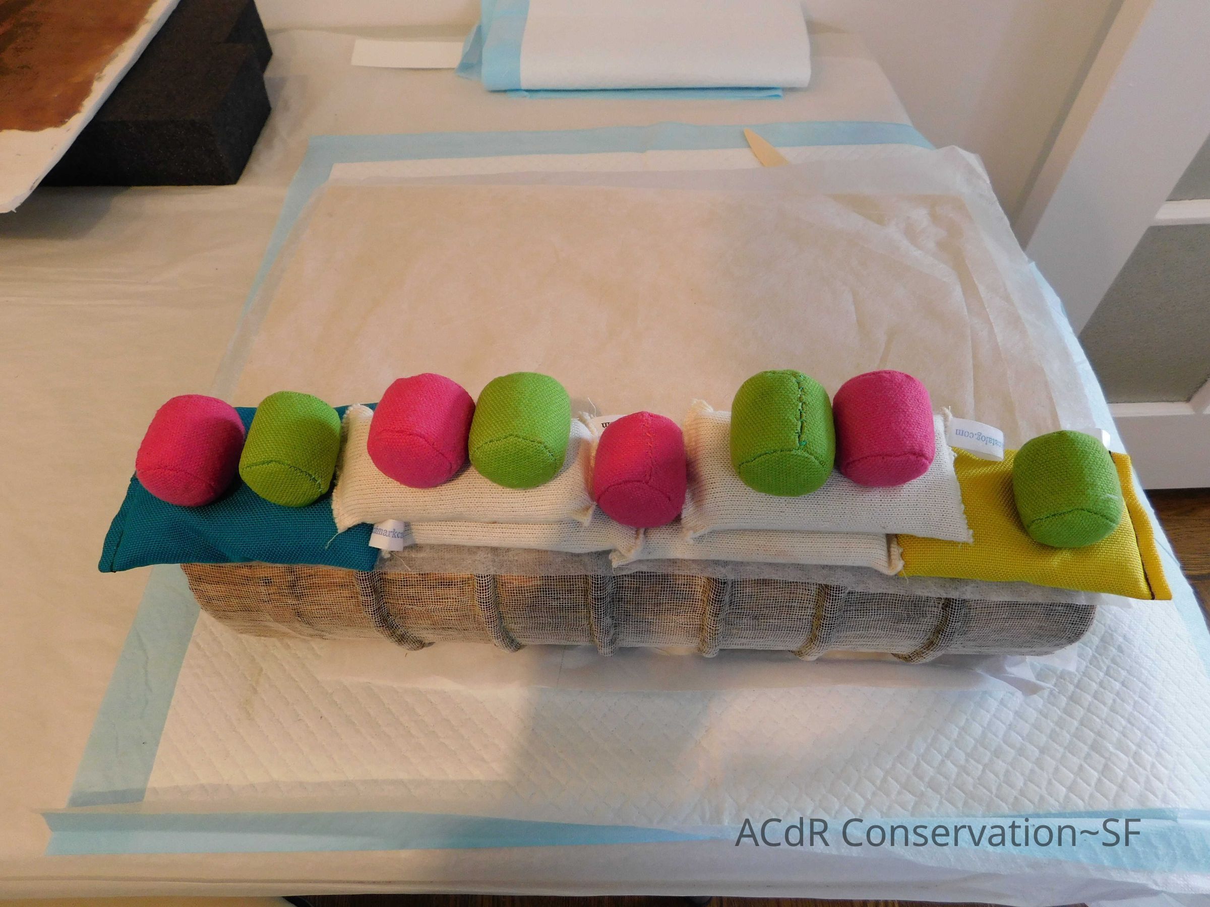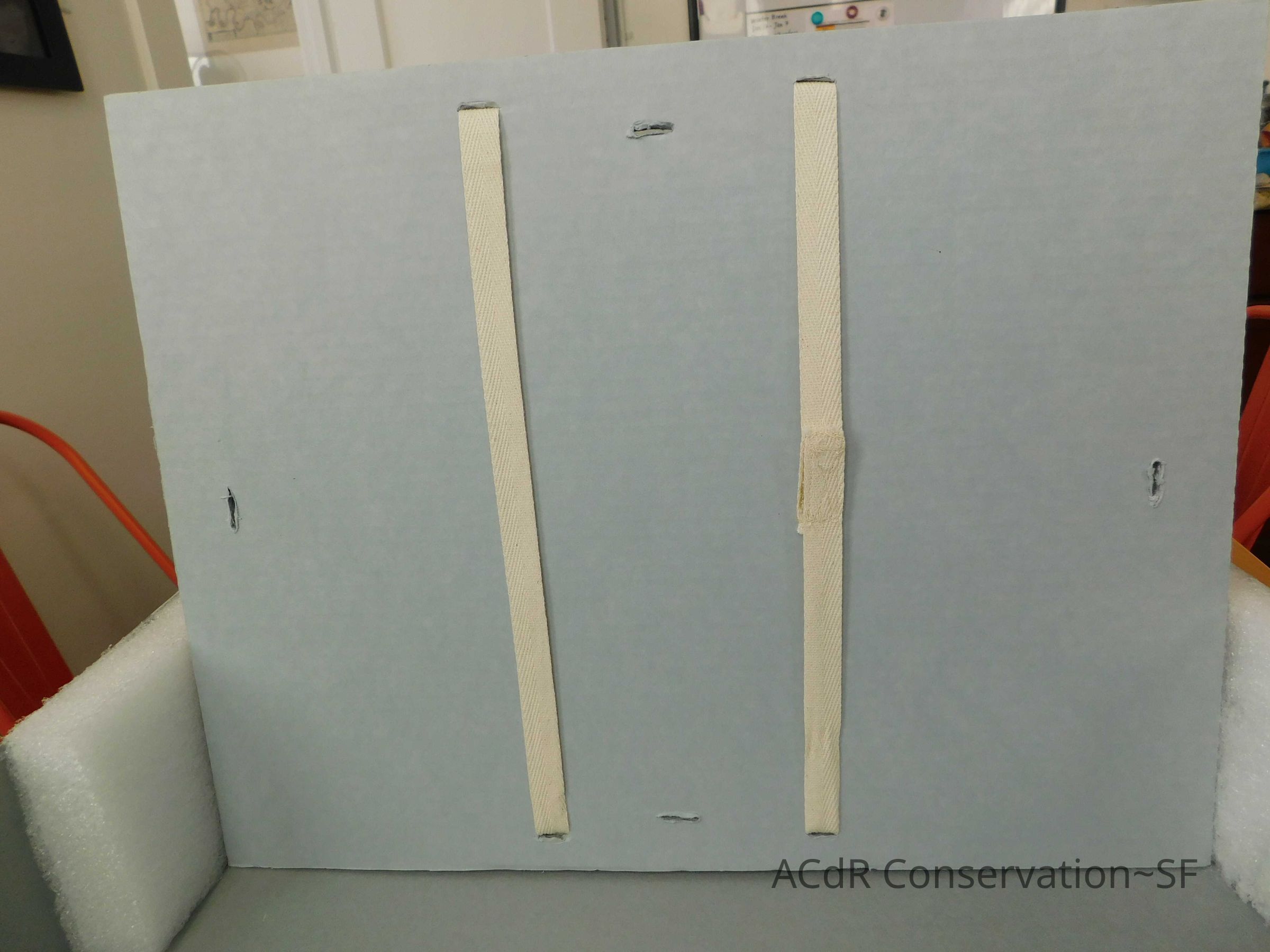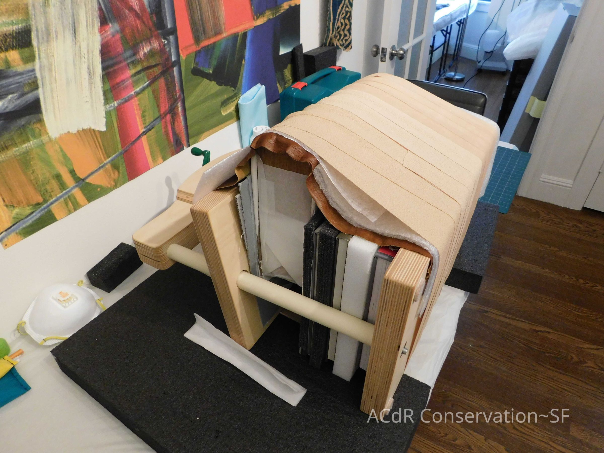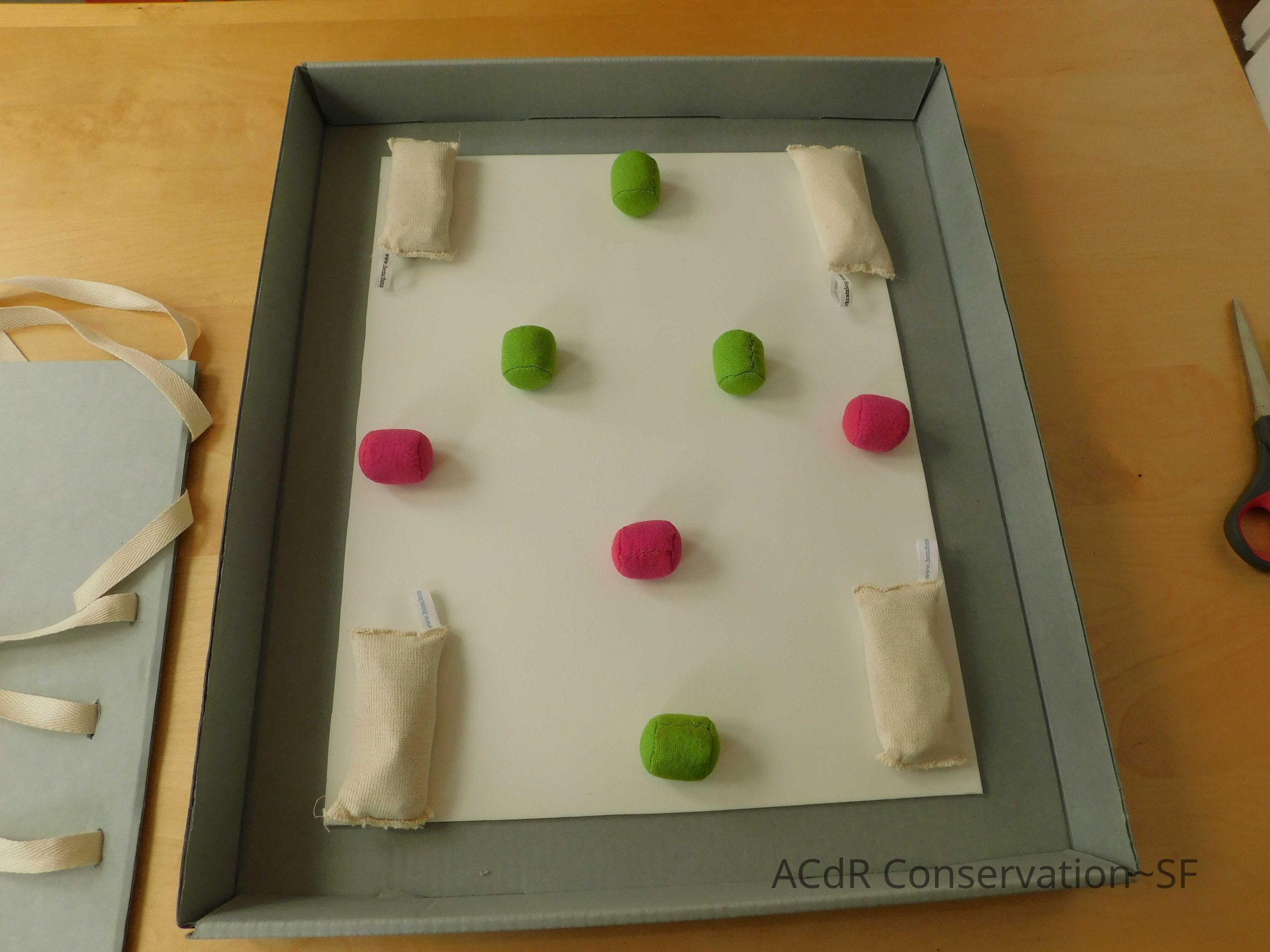 Used pre-made blueboard box and extended height using strips of blueboard and remay tape. Glued ethafoam blocks to create bumper corners for tray. Laminated two sheets of blueboard with 1" margin of book. Cut out slots from tray for single length of twill tape to run through and create handles to lift book on tray. Secured handles with sewn on velcro strips. Cut out slots from tray for twill tape ribbons to hold book in place on top and bottom. Adhered volara to lid of box to protect book cover. Created belt of twill tape to secure lid to bottom of box.