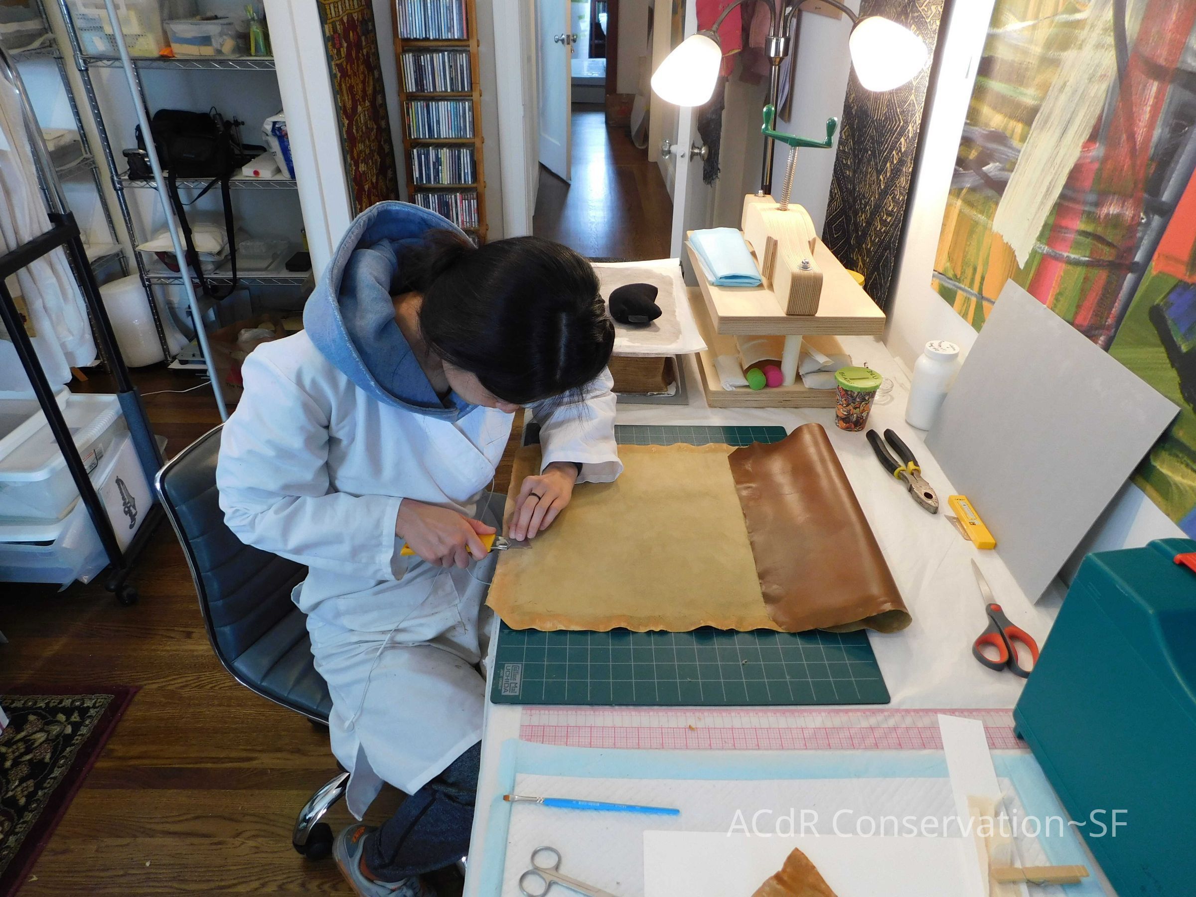 Lined flyleaf using same paper. Measure size of paste-down end paper. Pasted another pasted-down paper. Pasted the label on inner side of cover board. Pasted original remaining leather onto spine.