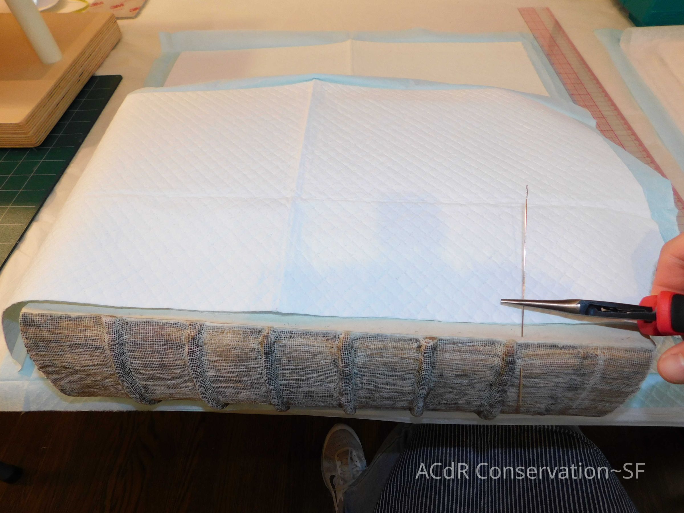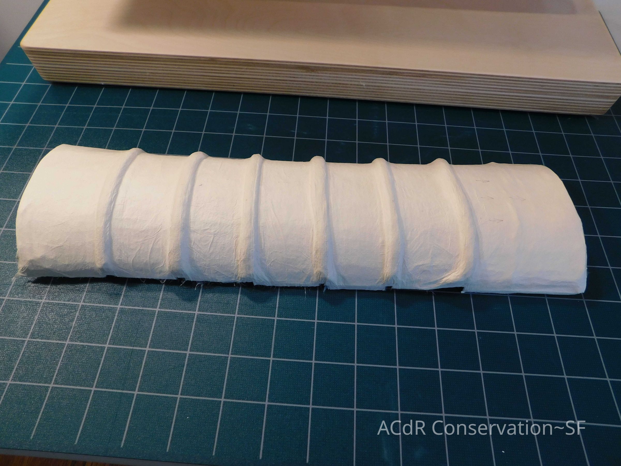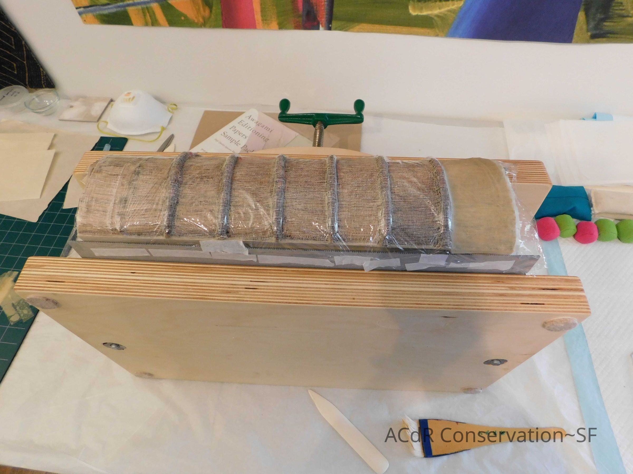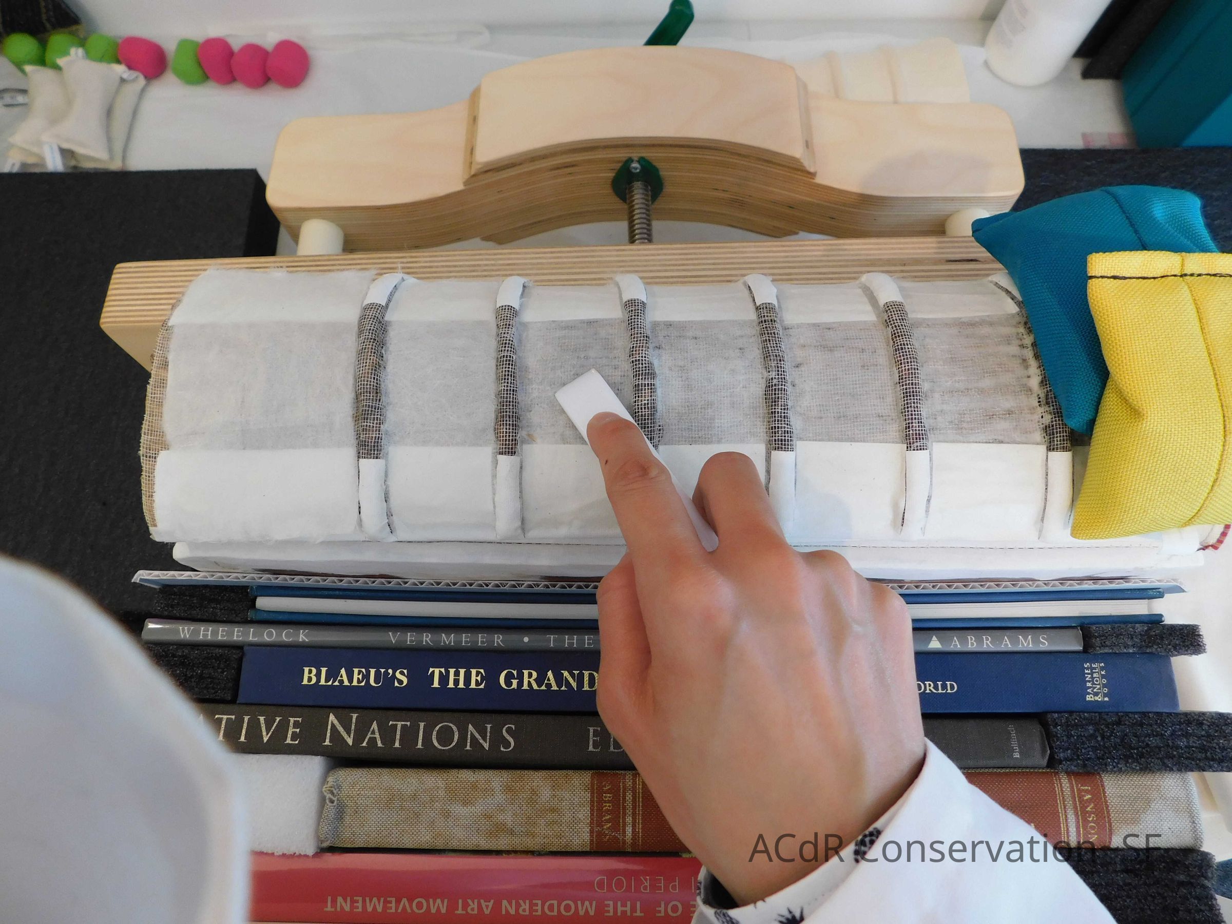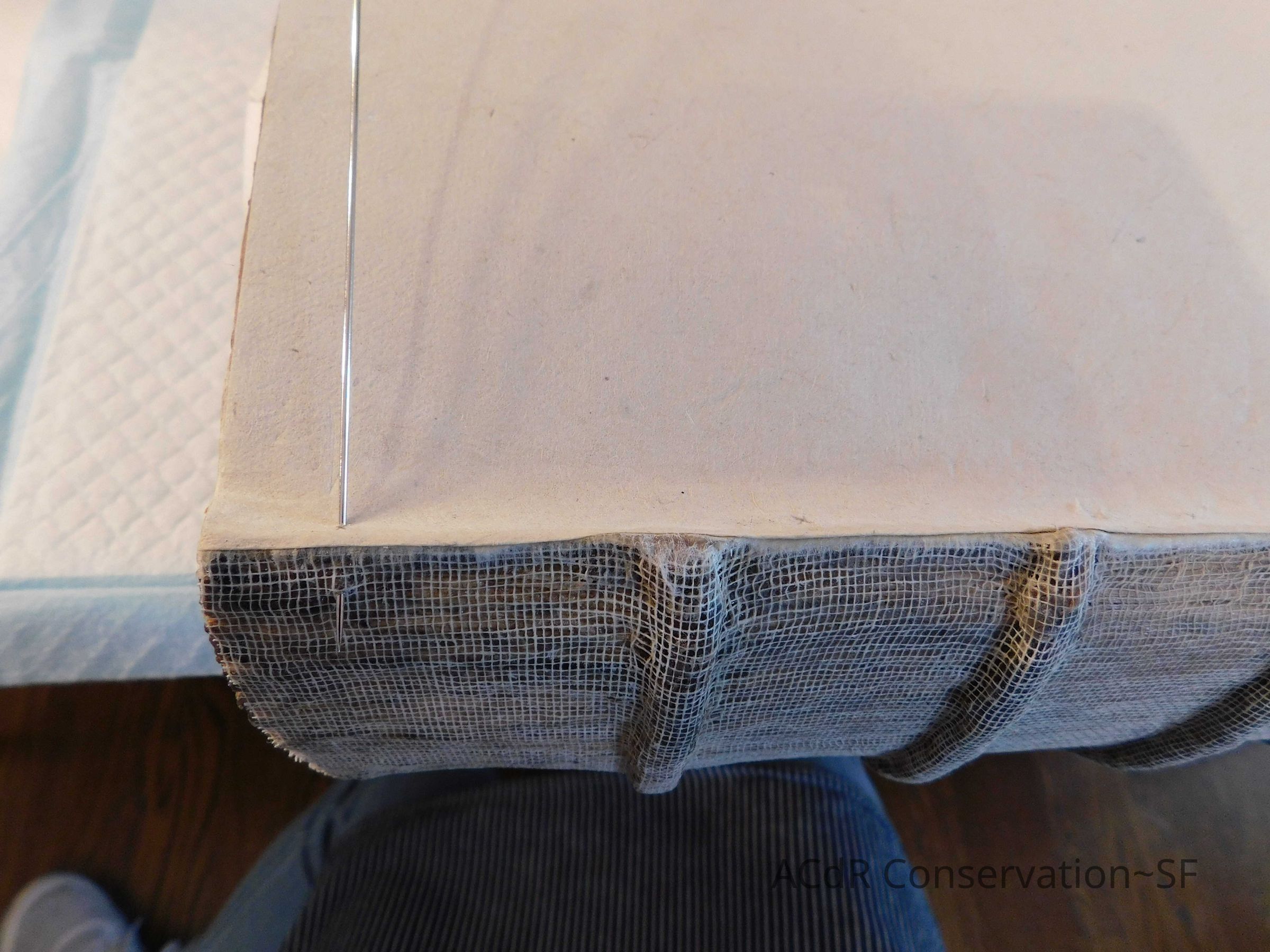 Paste endsheets on textblock and press them. Assembled book press and pressed book. Fixed plastic wrap to spine of book. Used Japanese paper to make case for the spine to have hollow back. Pasted many layers of Japanese paper on plastic wrap and rubbed with bone folder and stiff brush. Pressed case and let it dry. Removed case from spine and drew arrow in bottom part. Used modostuc to shape cover board and sanded. Strengthened end sheets by sewing them to spine. Pricked end sheet and spine with long needle. Waxed the thread and sewed the book using saddle stitch.
