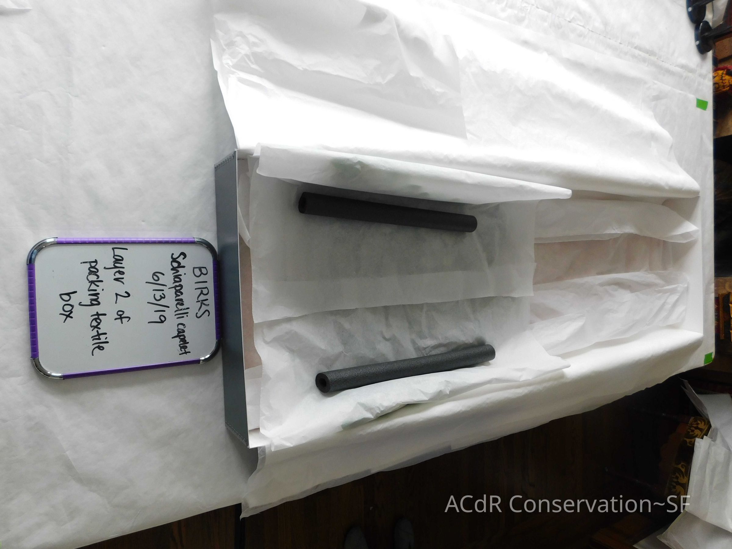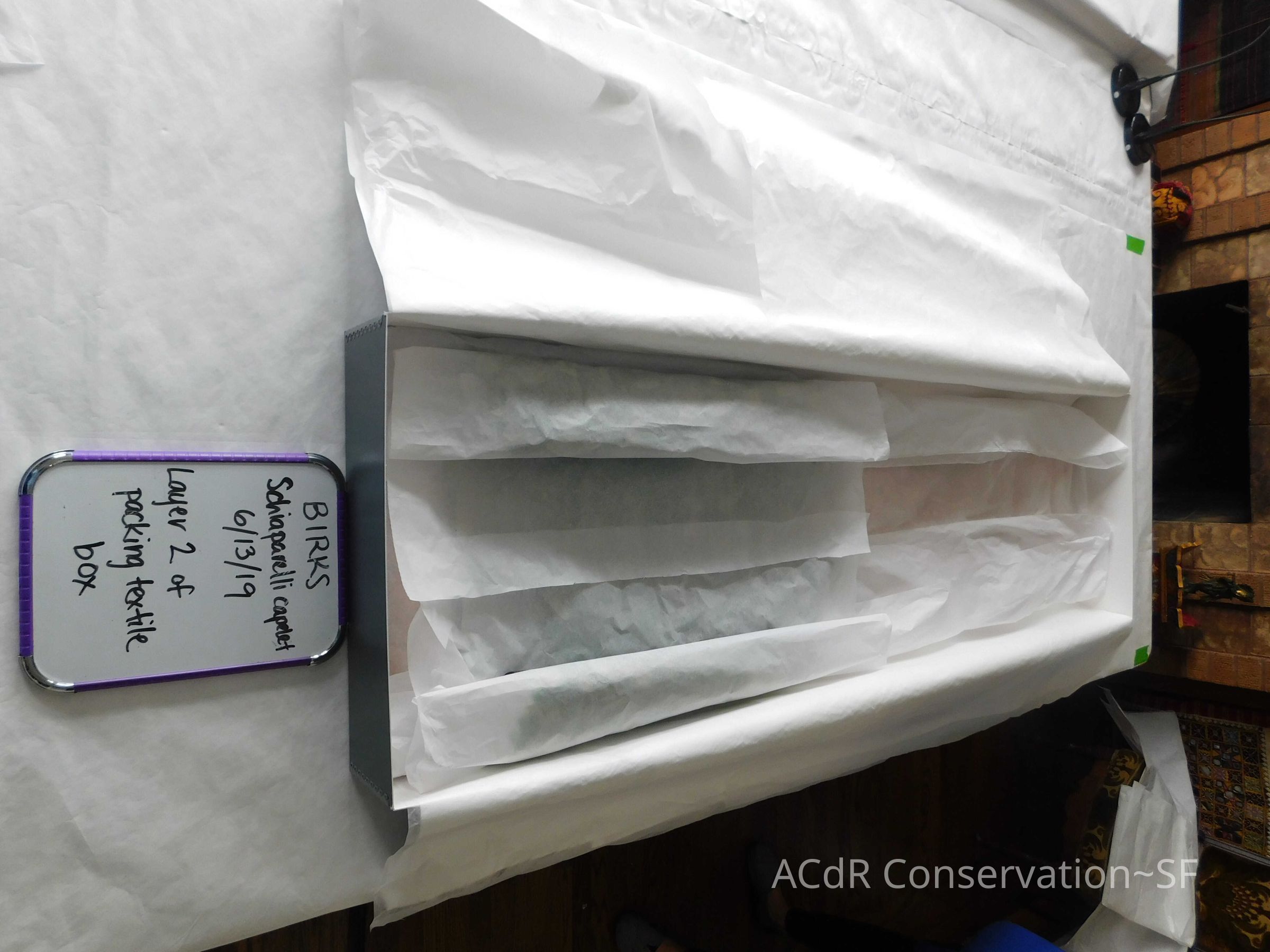 Mixture of enzyme cleaner, vulplex soap, orvus paste, isopropyl alcohol and distilled water applied with swabs to clean ground of cape. Bottom edge and 2” up on left side near fold not done. Negligible change. Some brown lifted on pads, with none after 3 passes and clearing on pads.