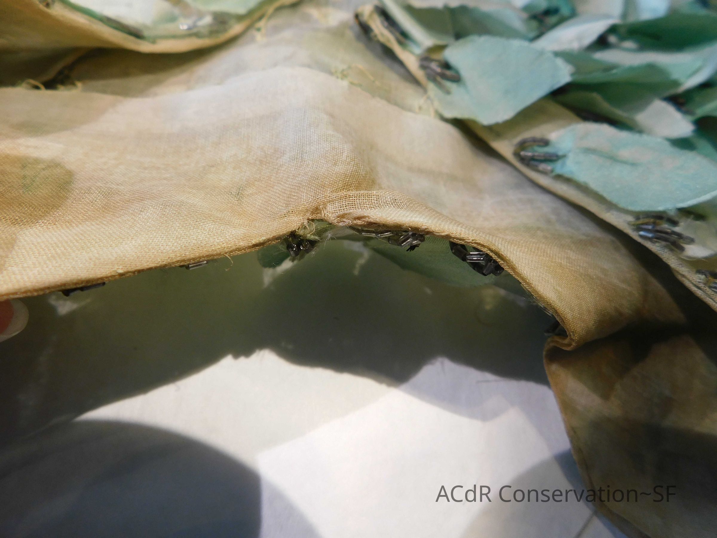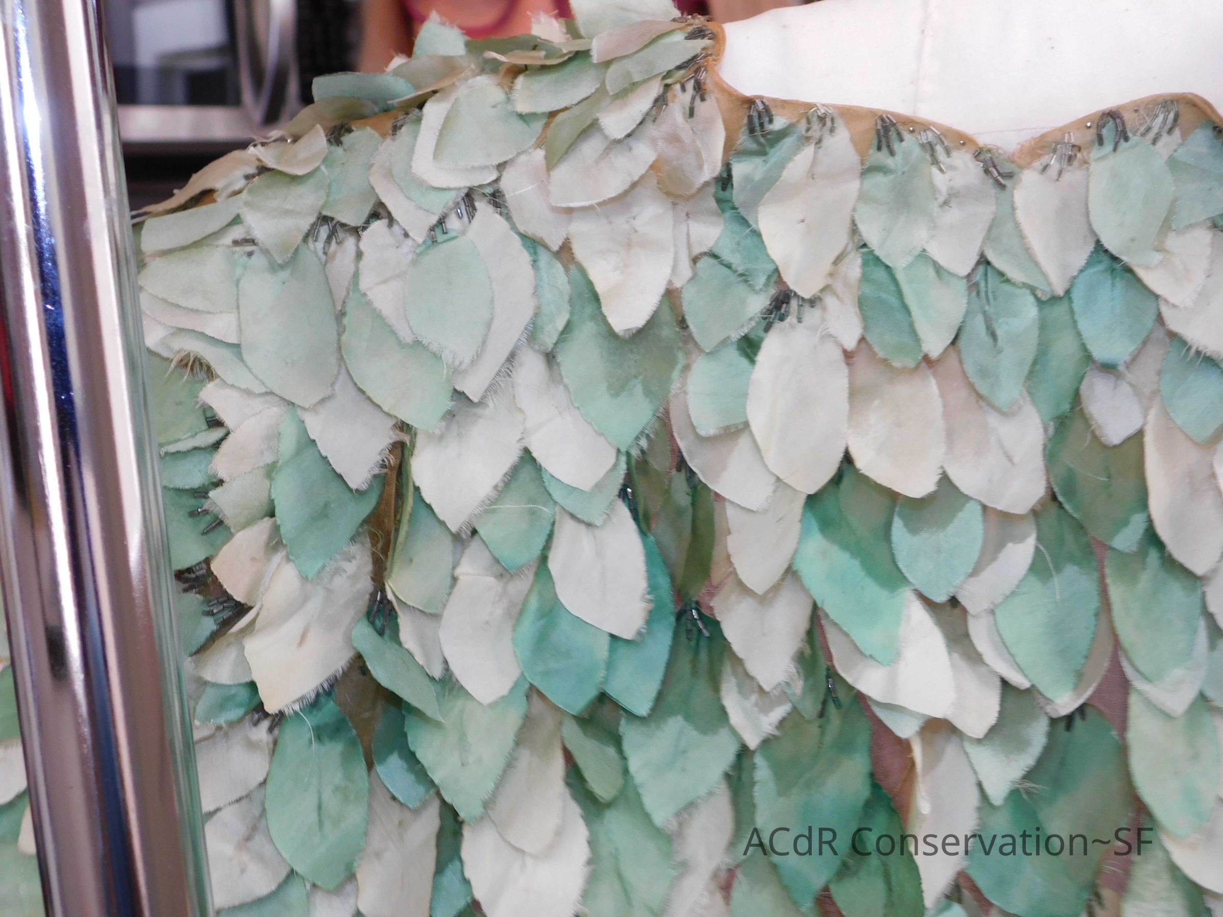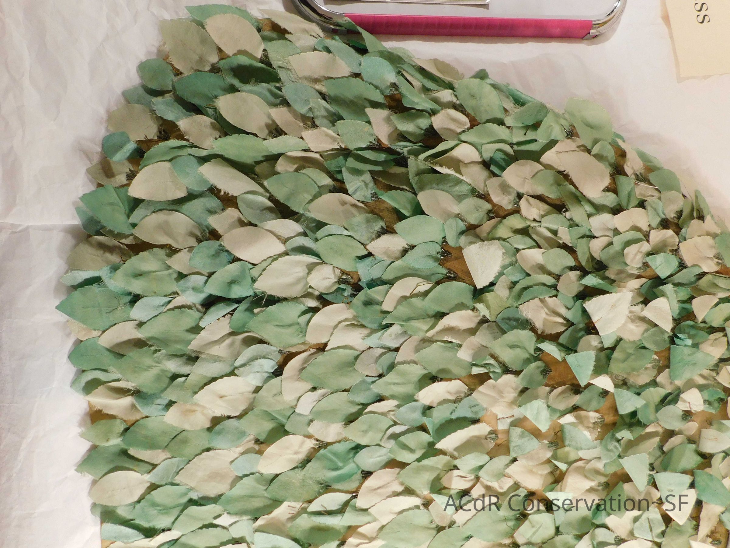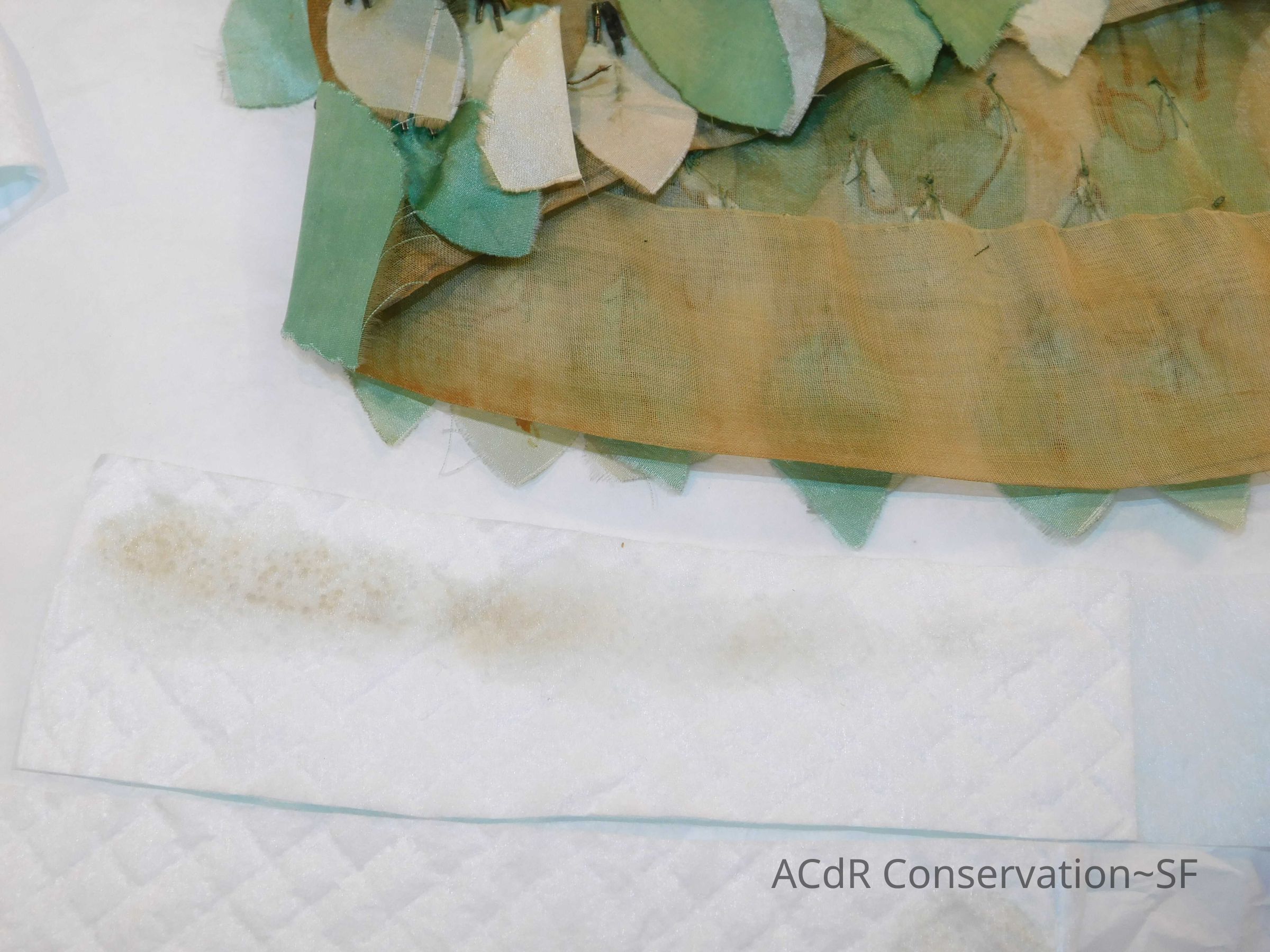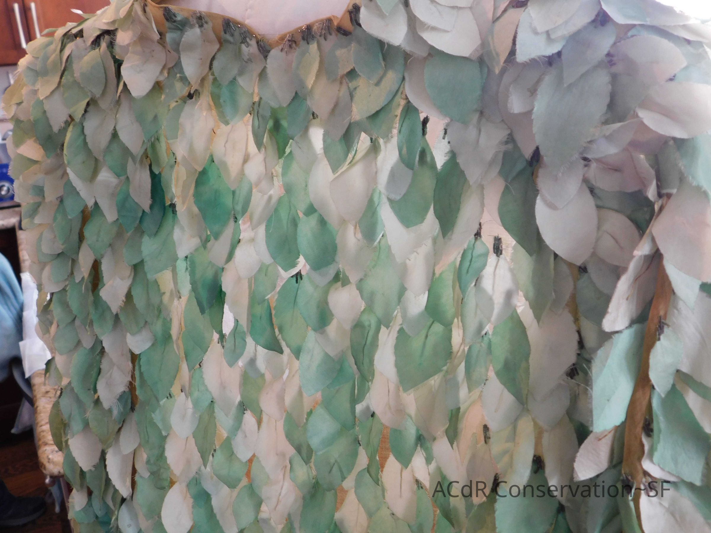 Tested bleach on organza ground. Bent down wires and removed glue where visible on leaves.