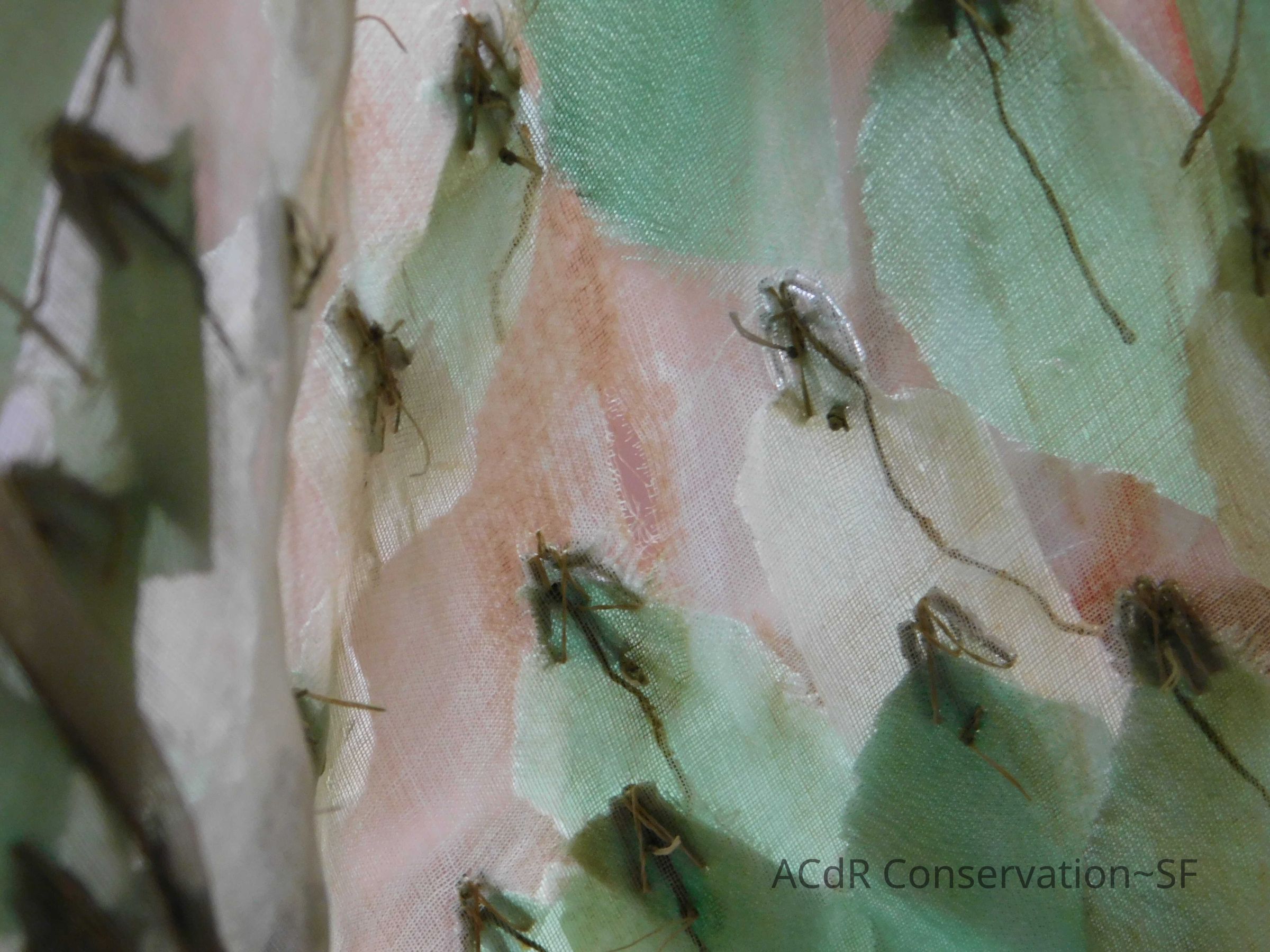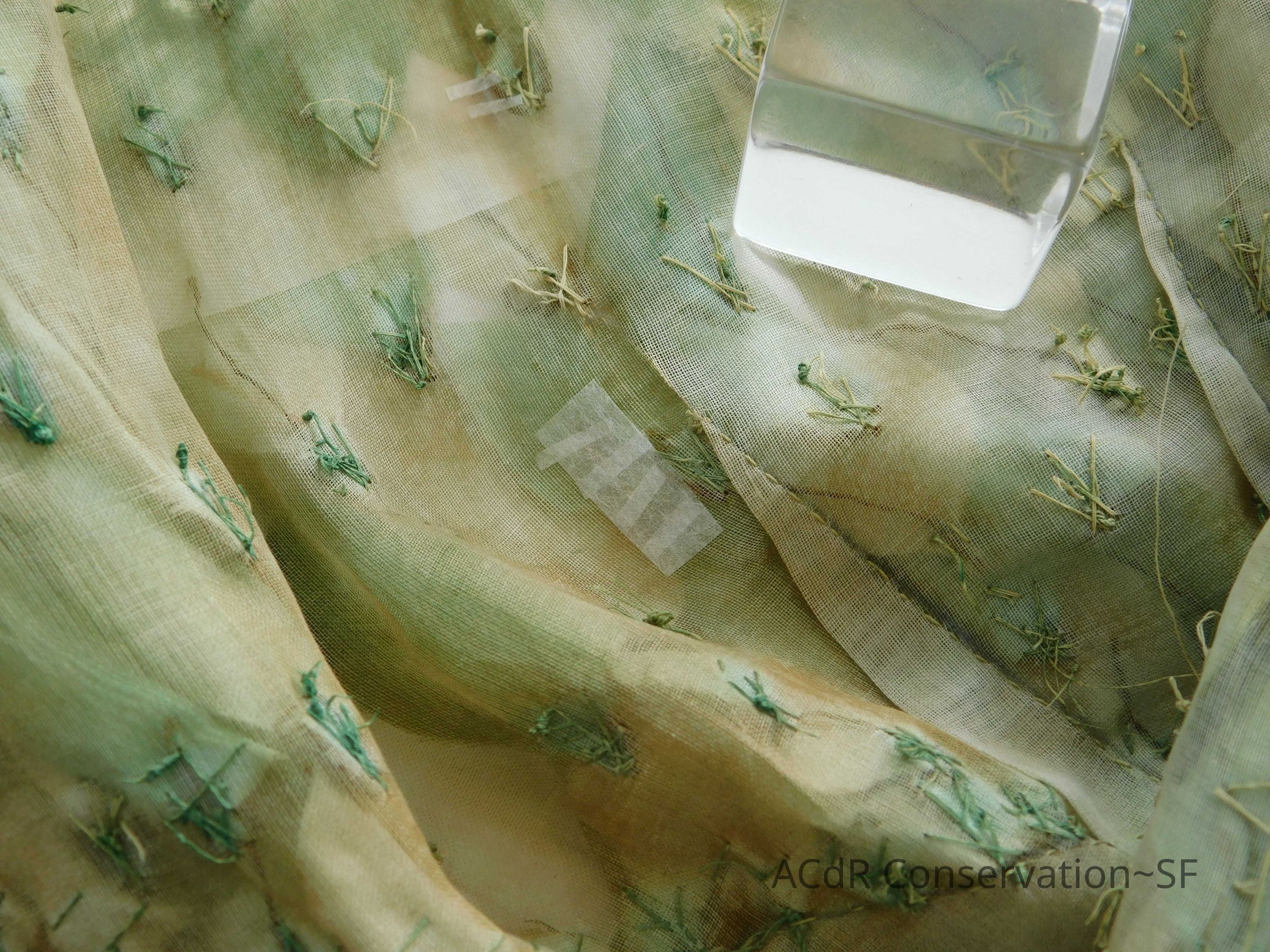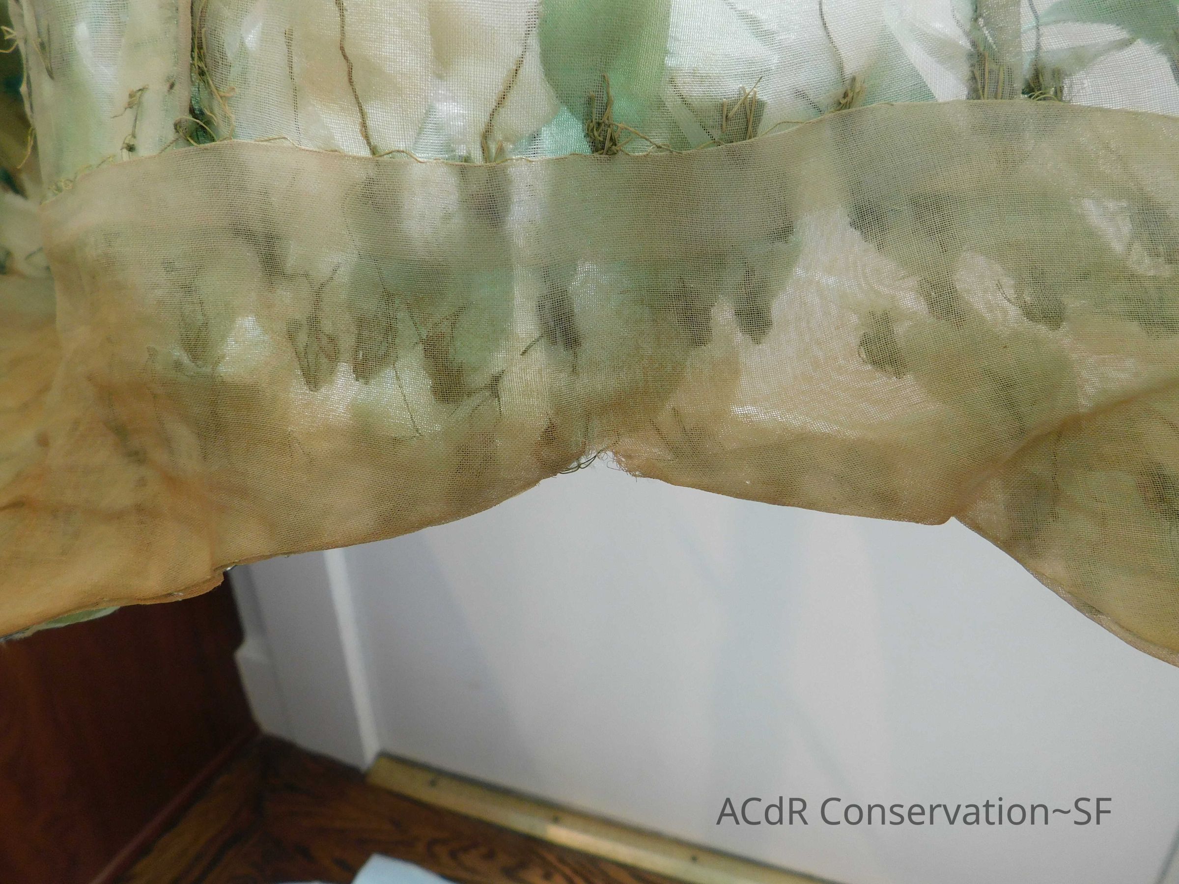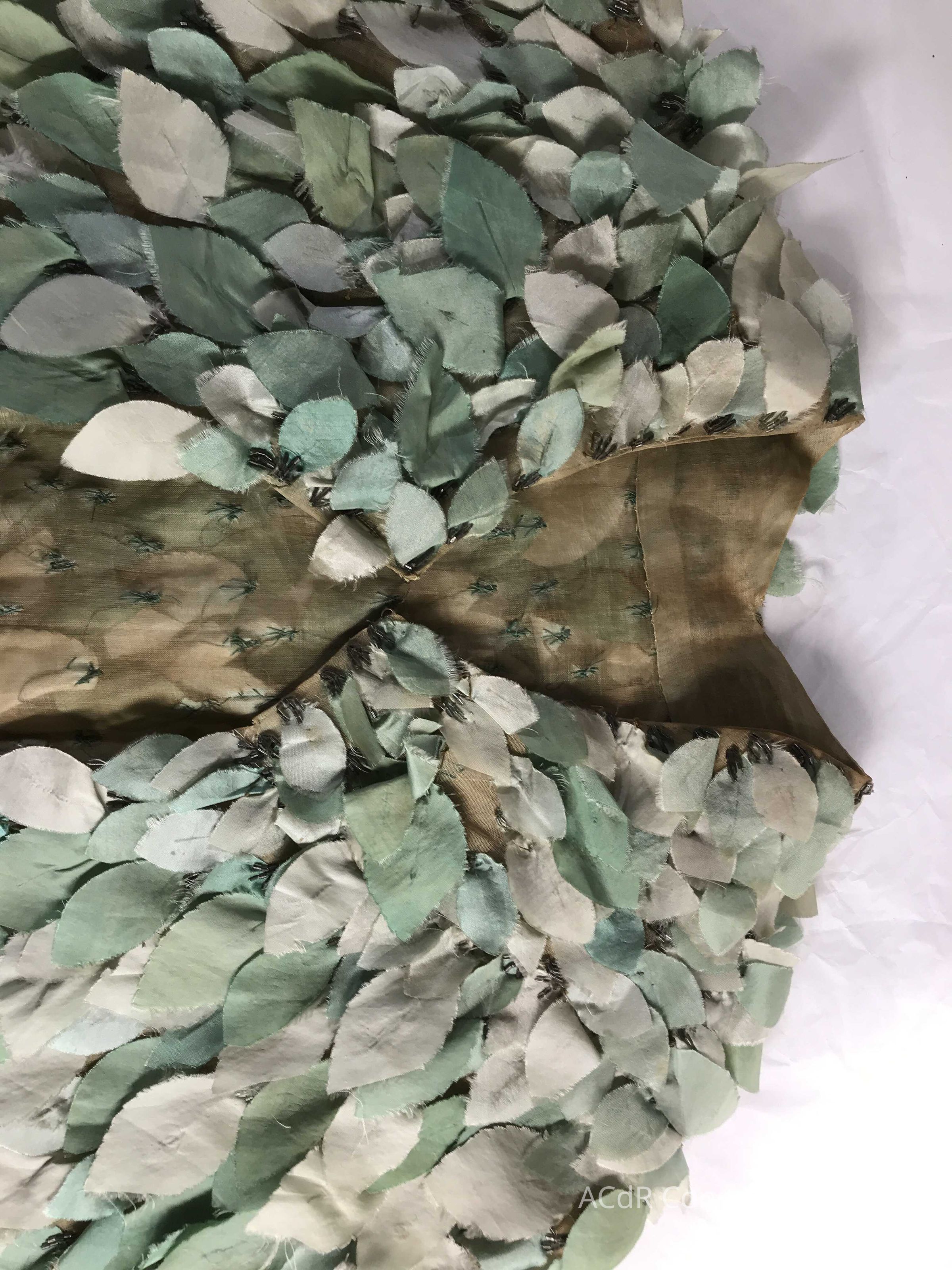 Tested bleach on organza ground. Bent down wires and removed glue where visible on leaves.