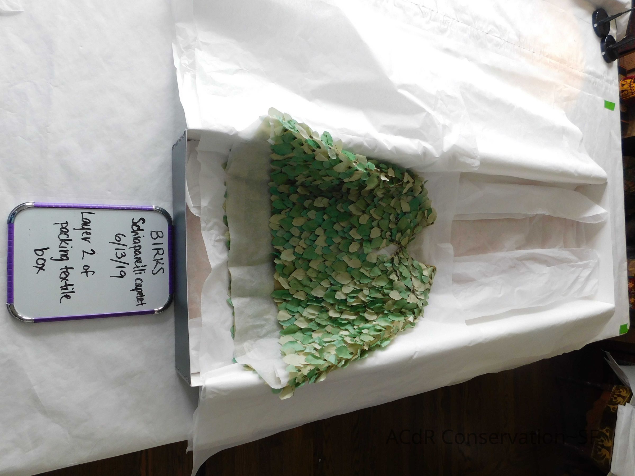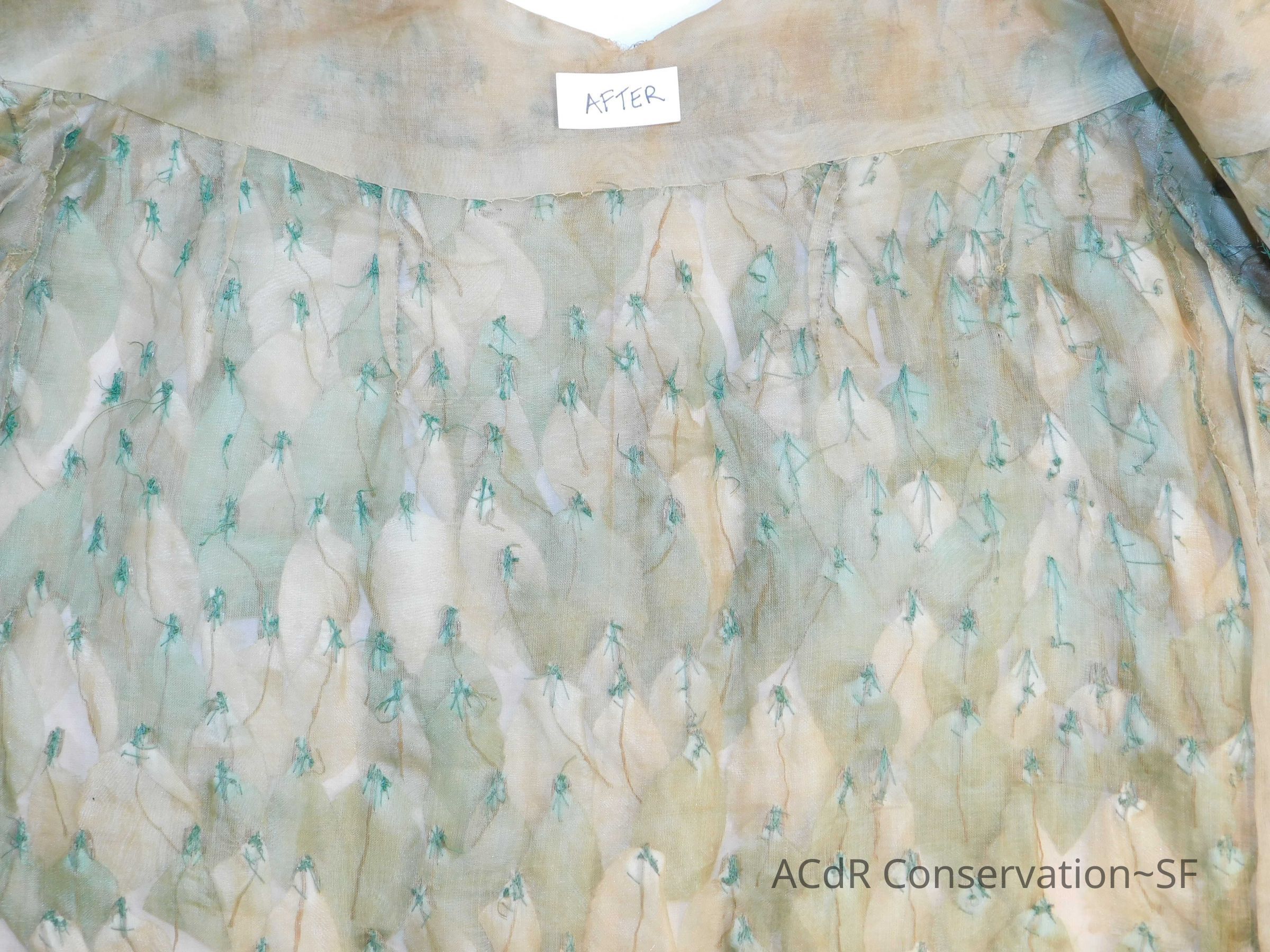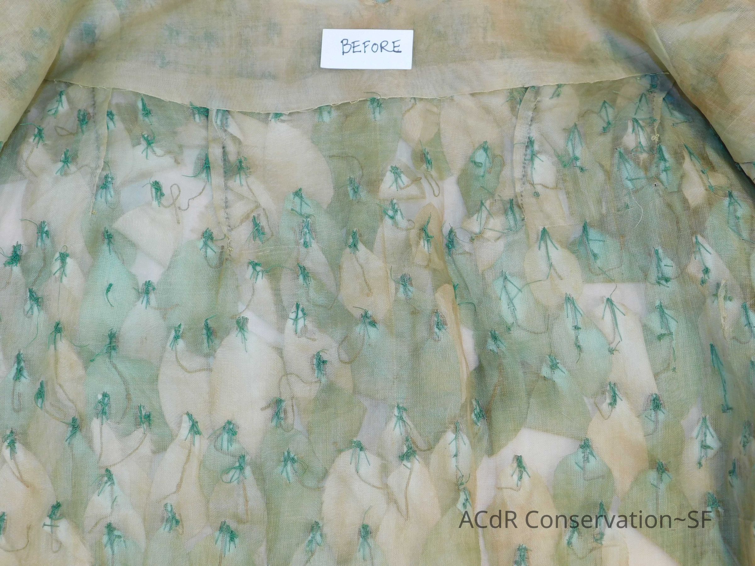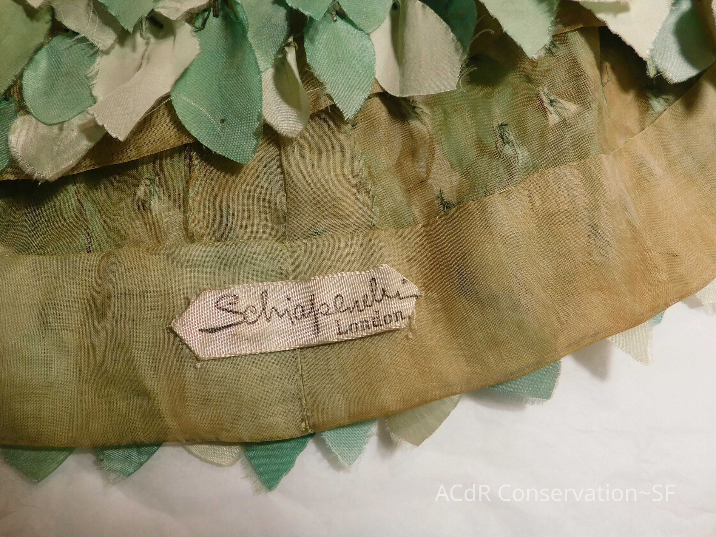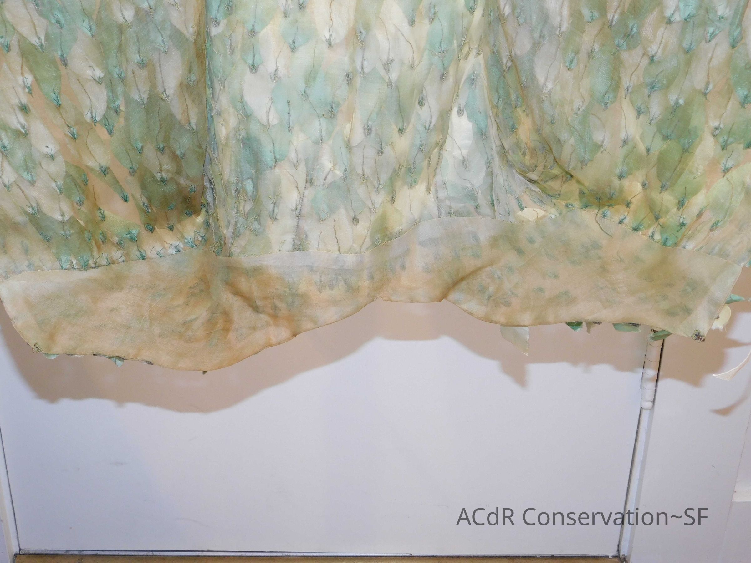 Tested bleach on organza ground. Bent down wires and removed glue where visible on leaves.