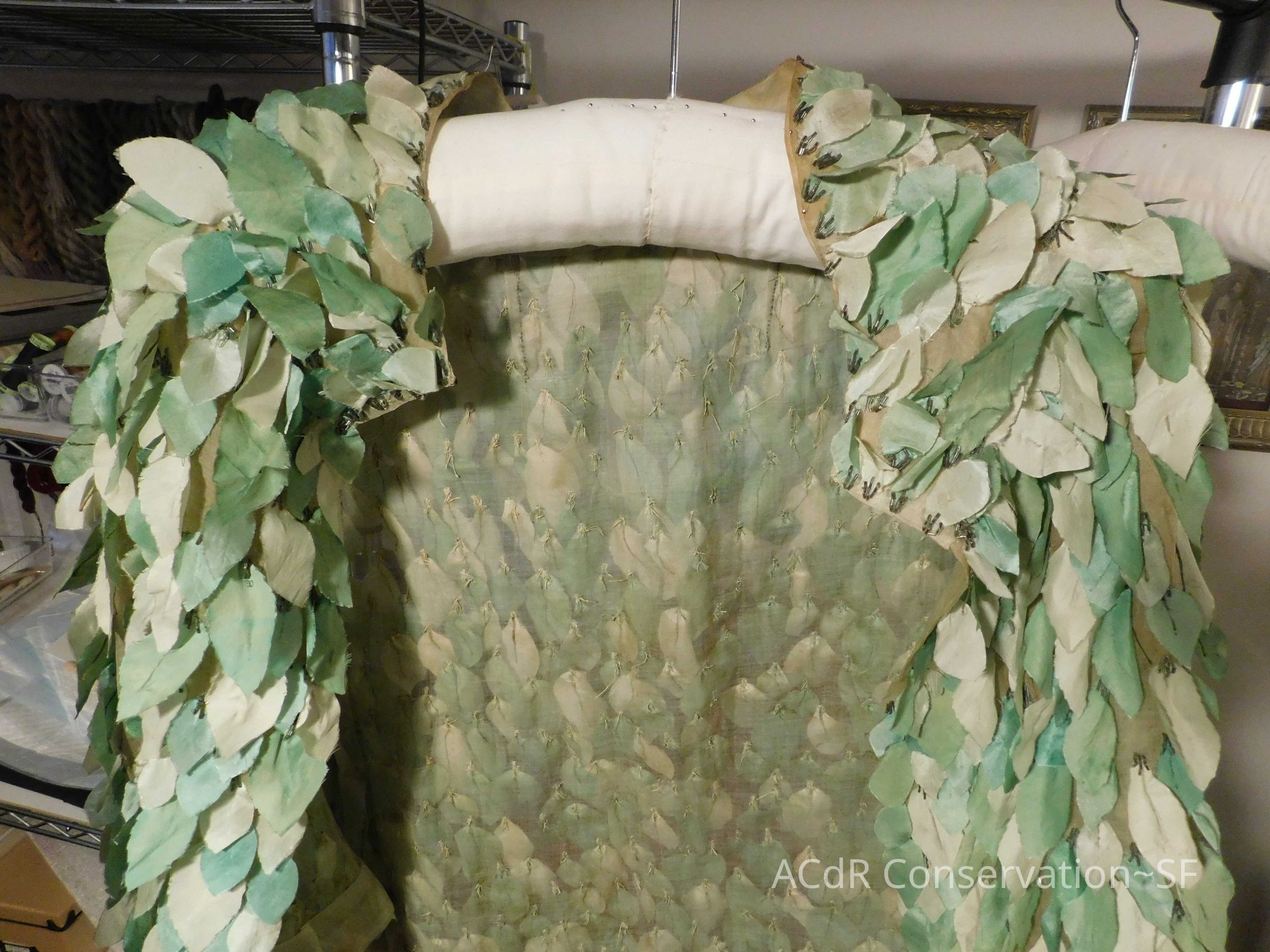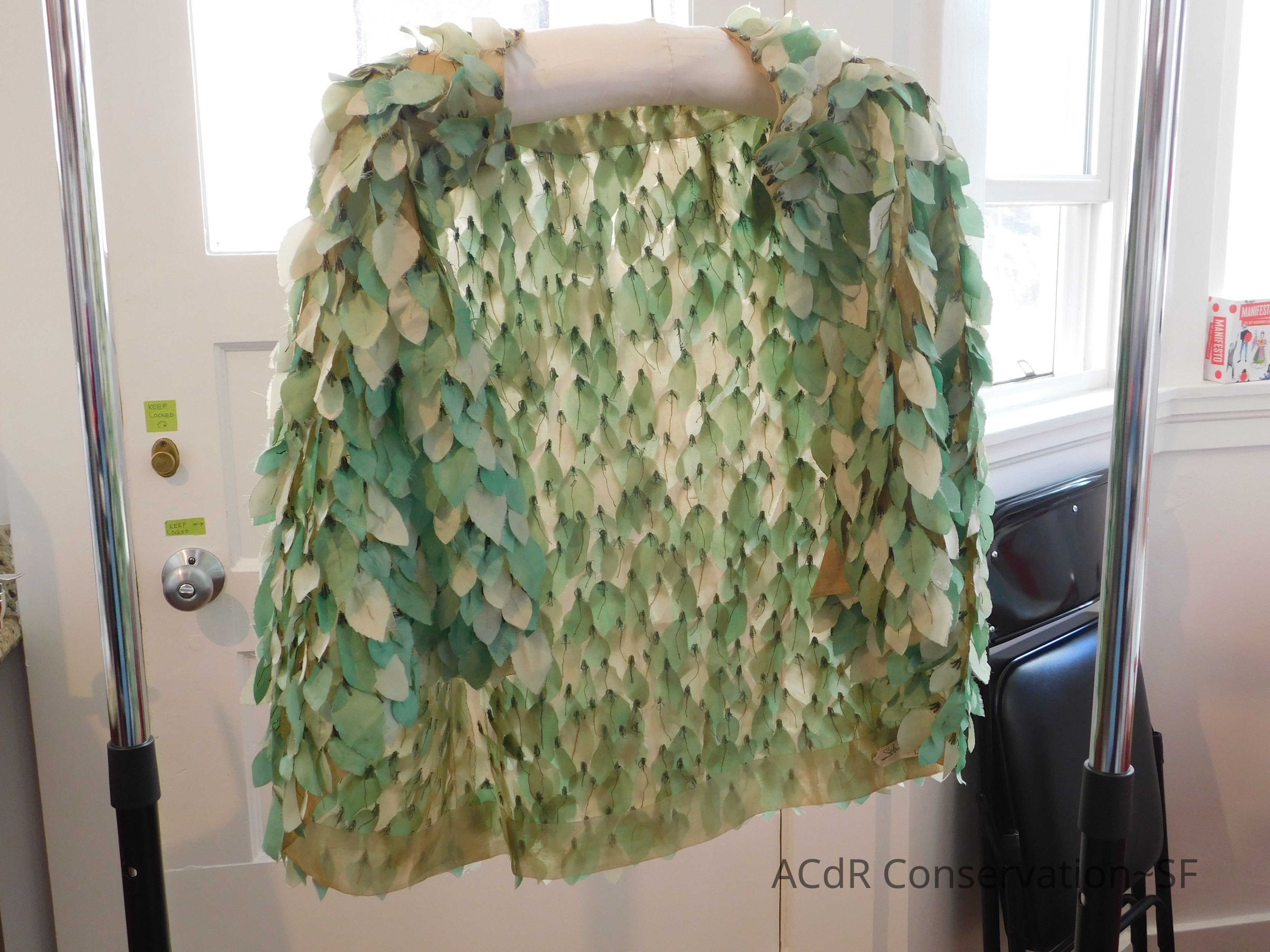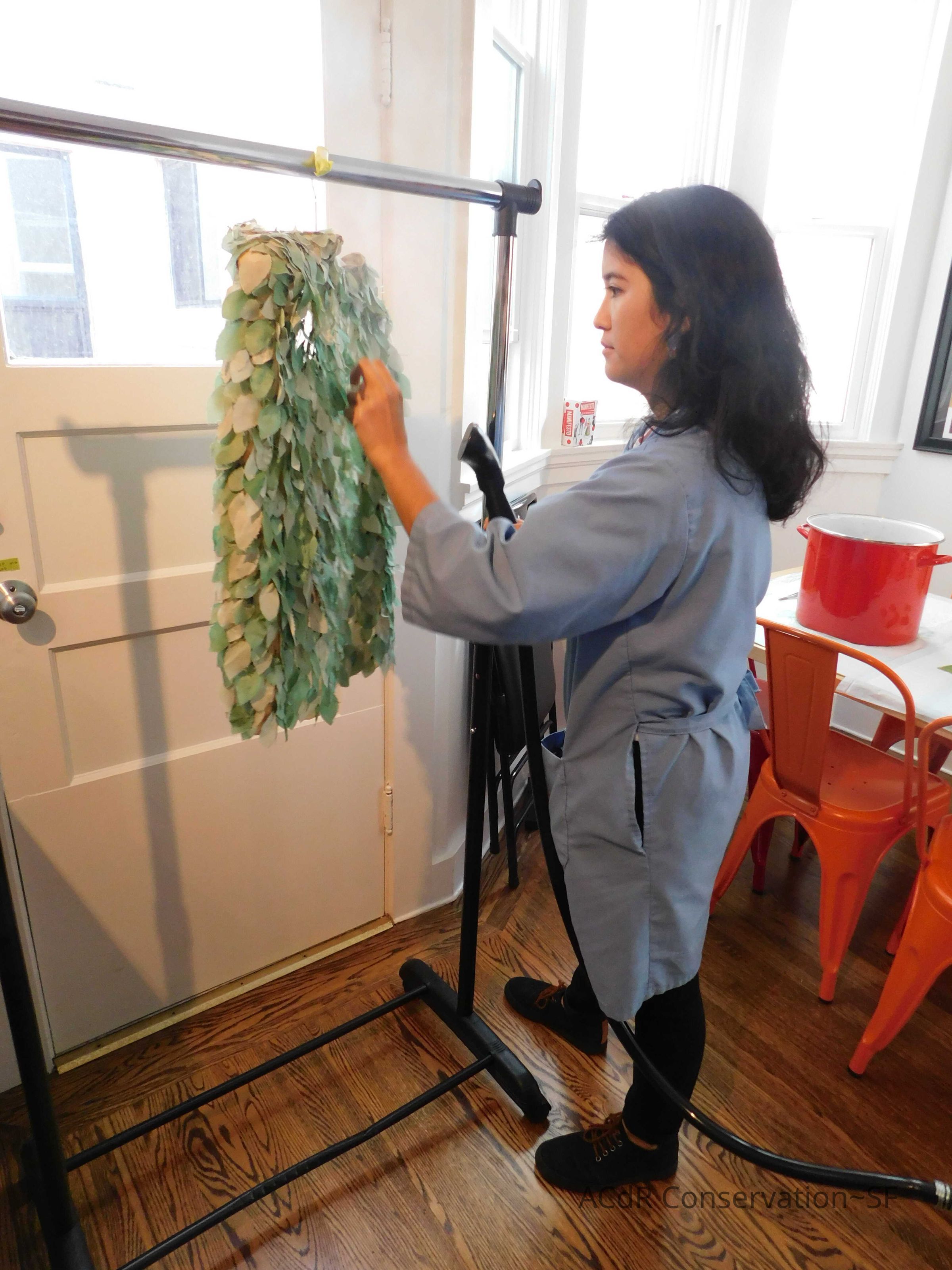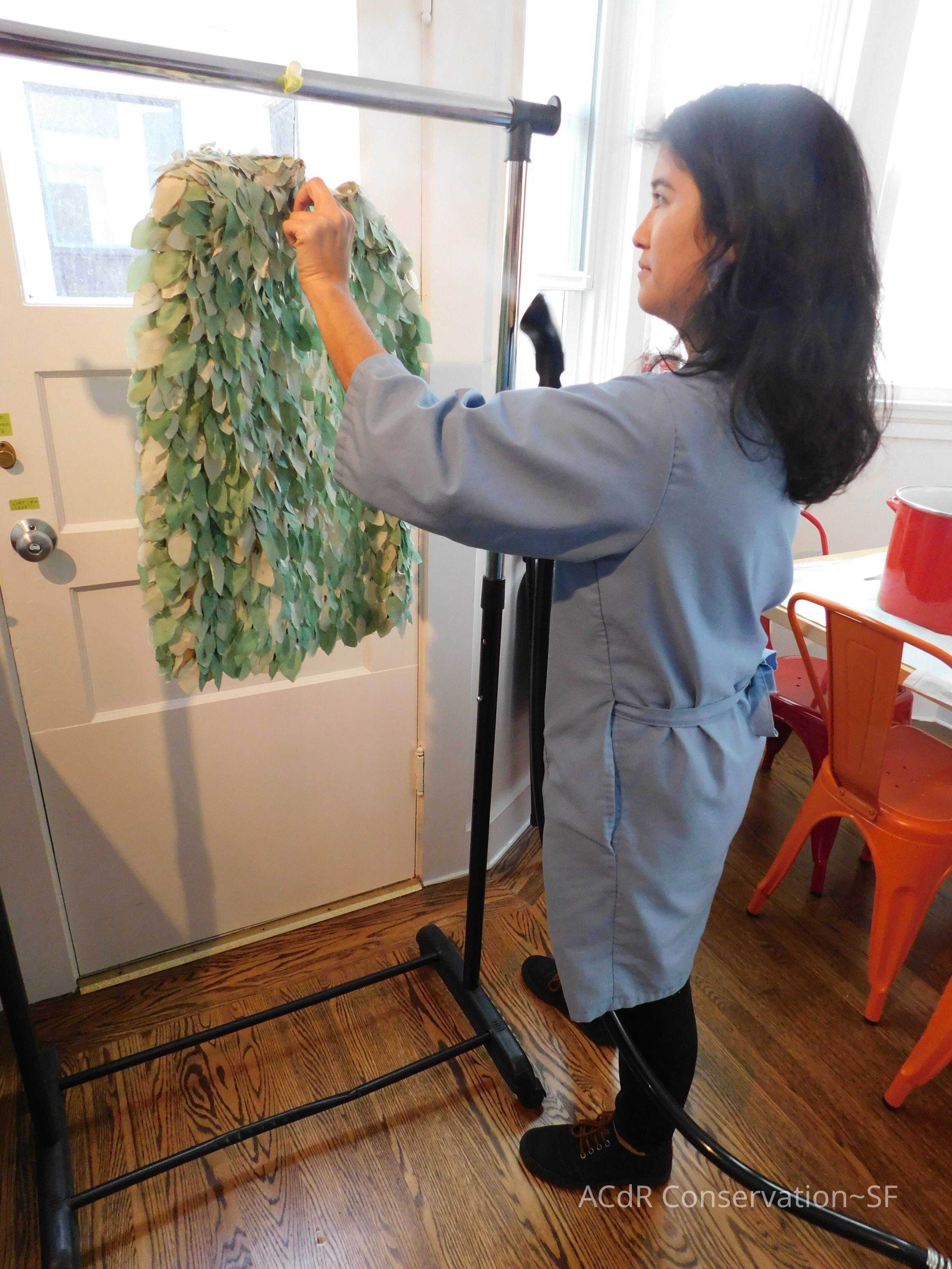Steamed leaves while on padded hanger. Misted bleach on ground (Bleach + distilled water, 3:1). Trimmed frayed edges