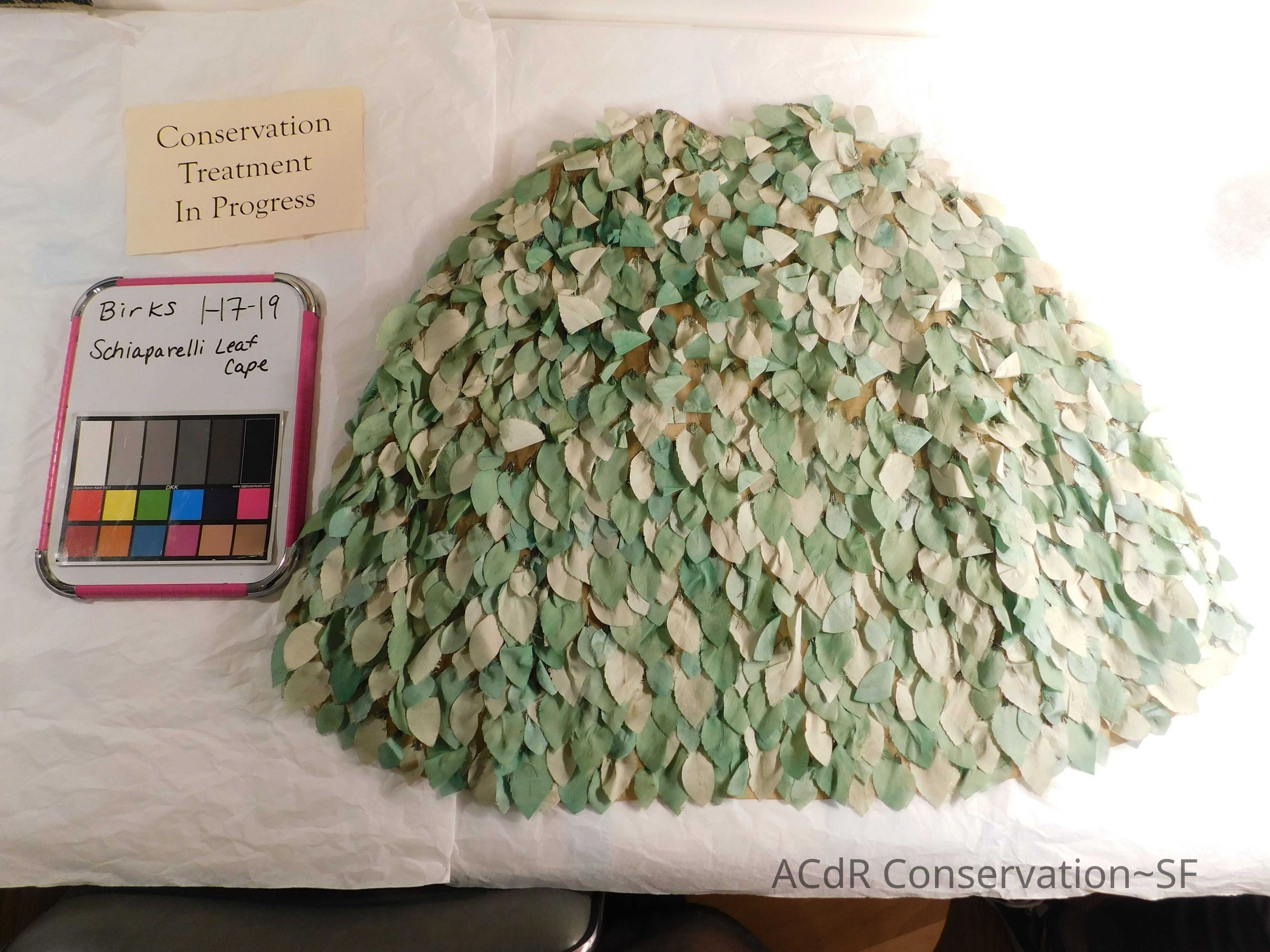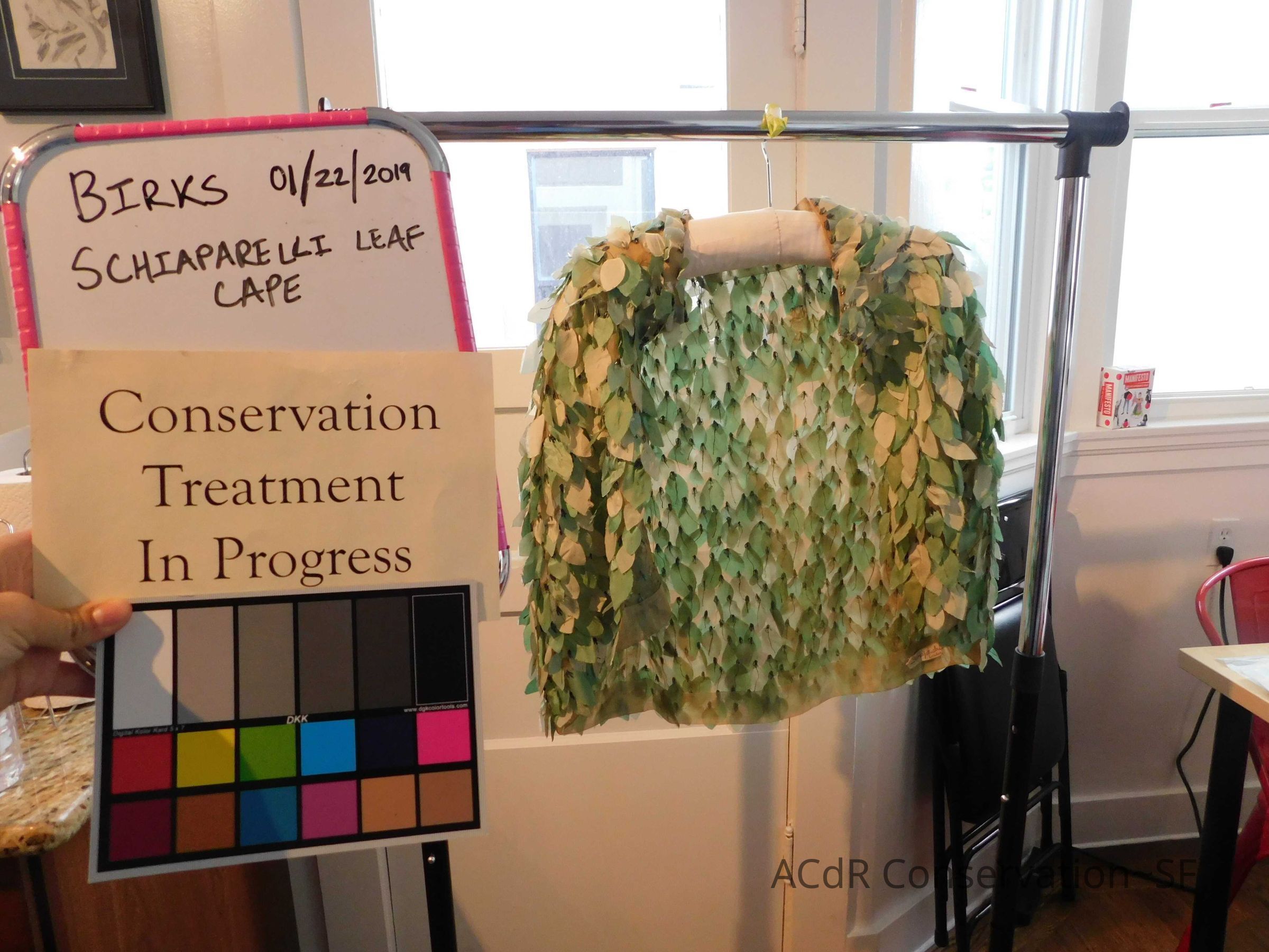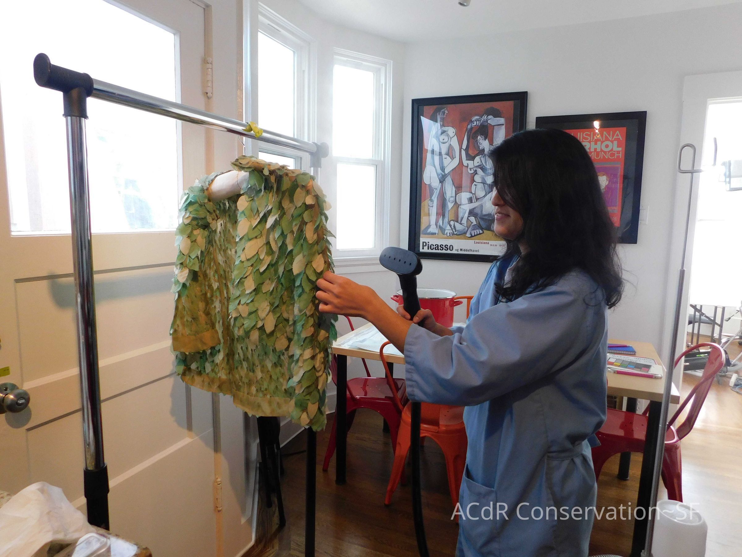 Steamed leaves while on padded hanger. Misted bleach on ground (Bleach + distilled water, 3:1). Trimmed frayed edges
