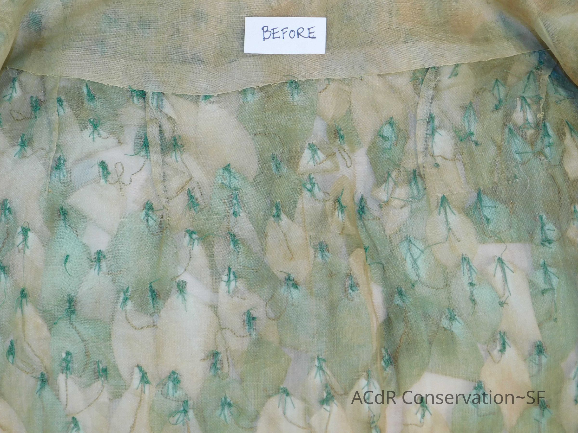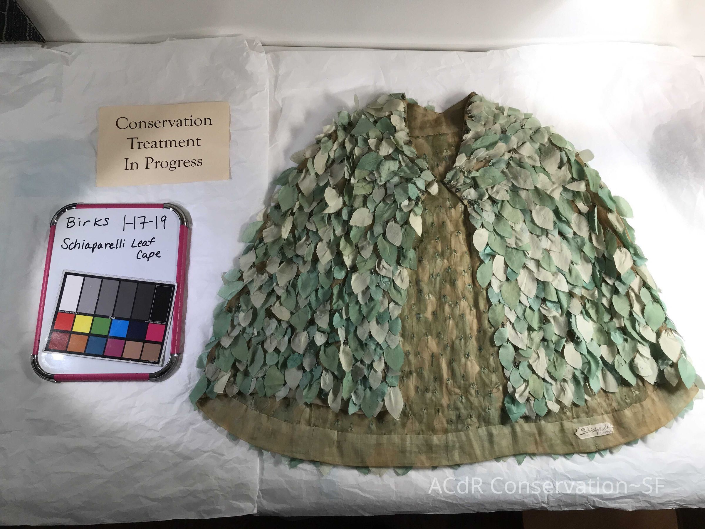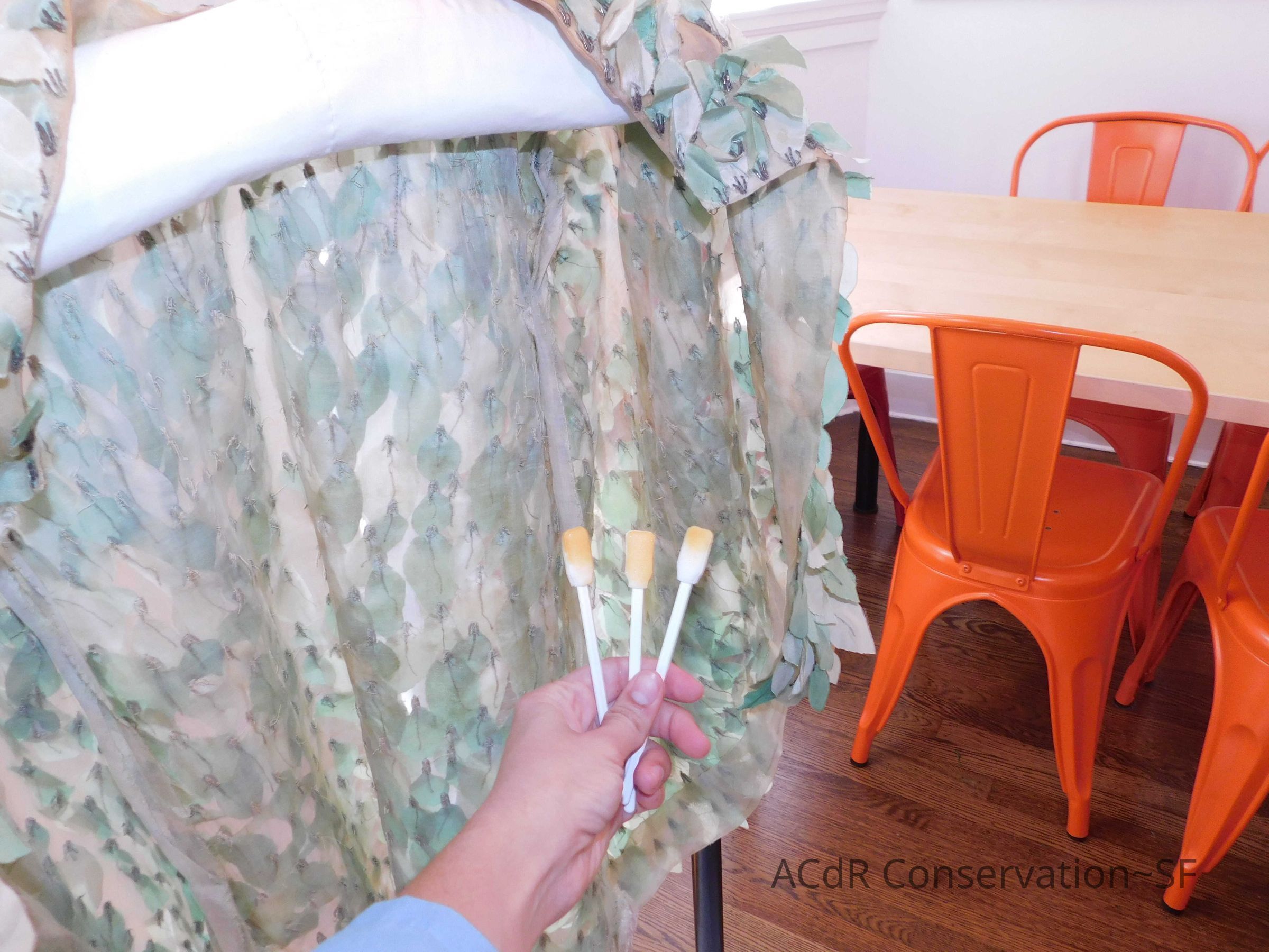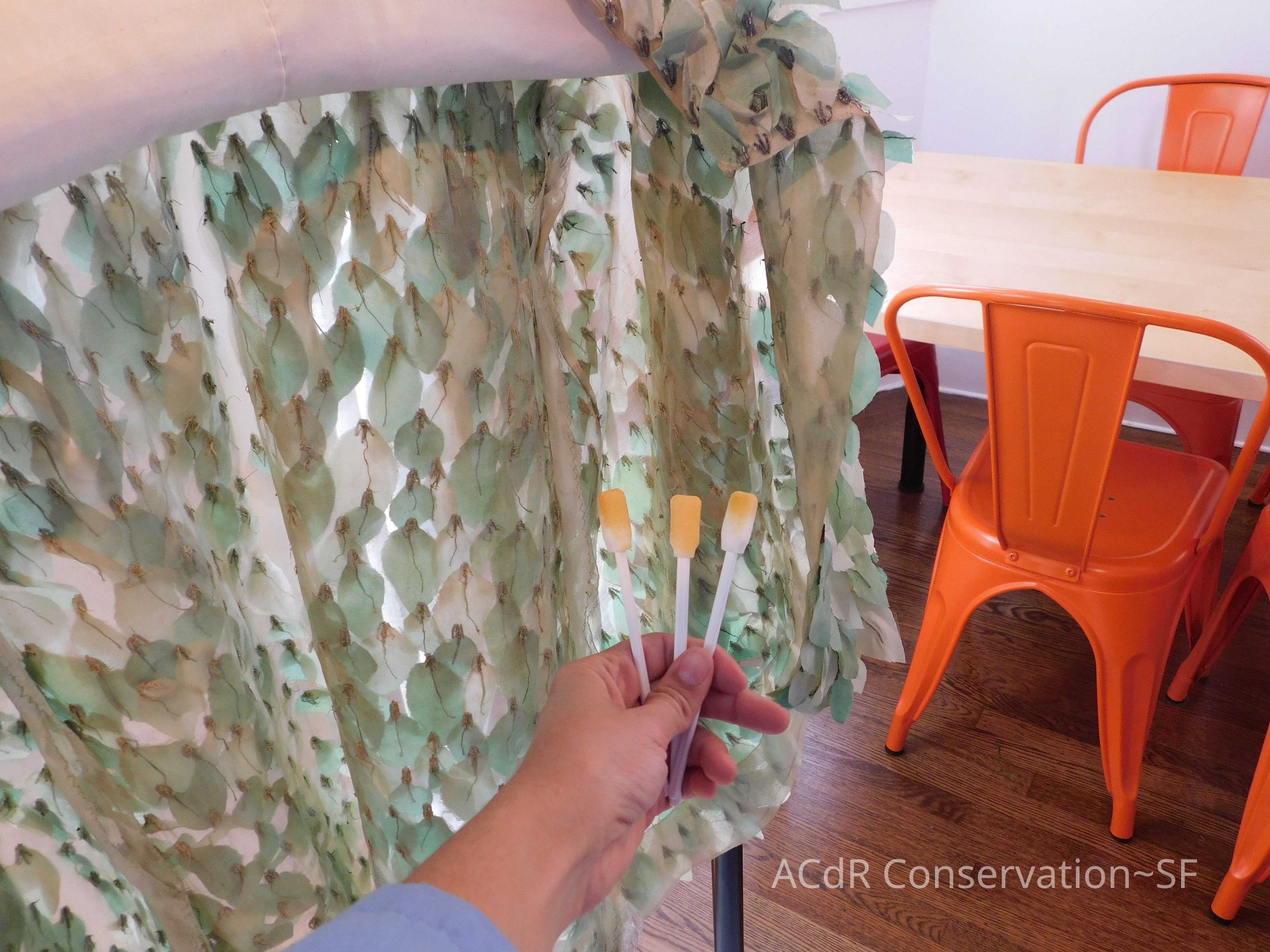 Steamed leaves while on padded hanger. Misted bleach on ground (Bleach + distilled water, 3:1). Trimmed frayed edges