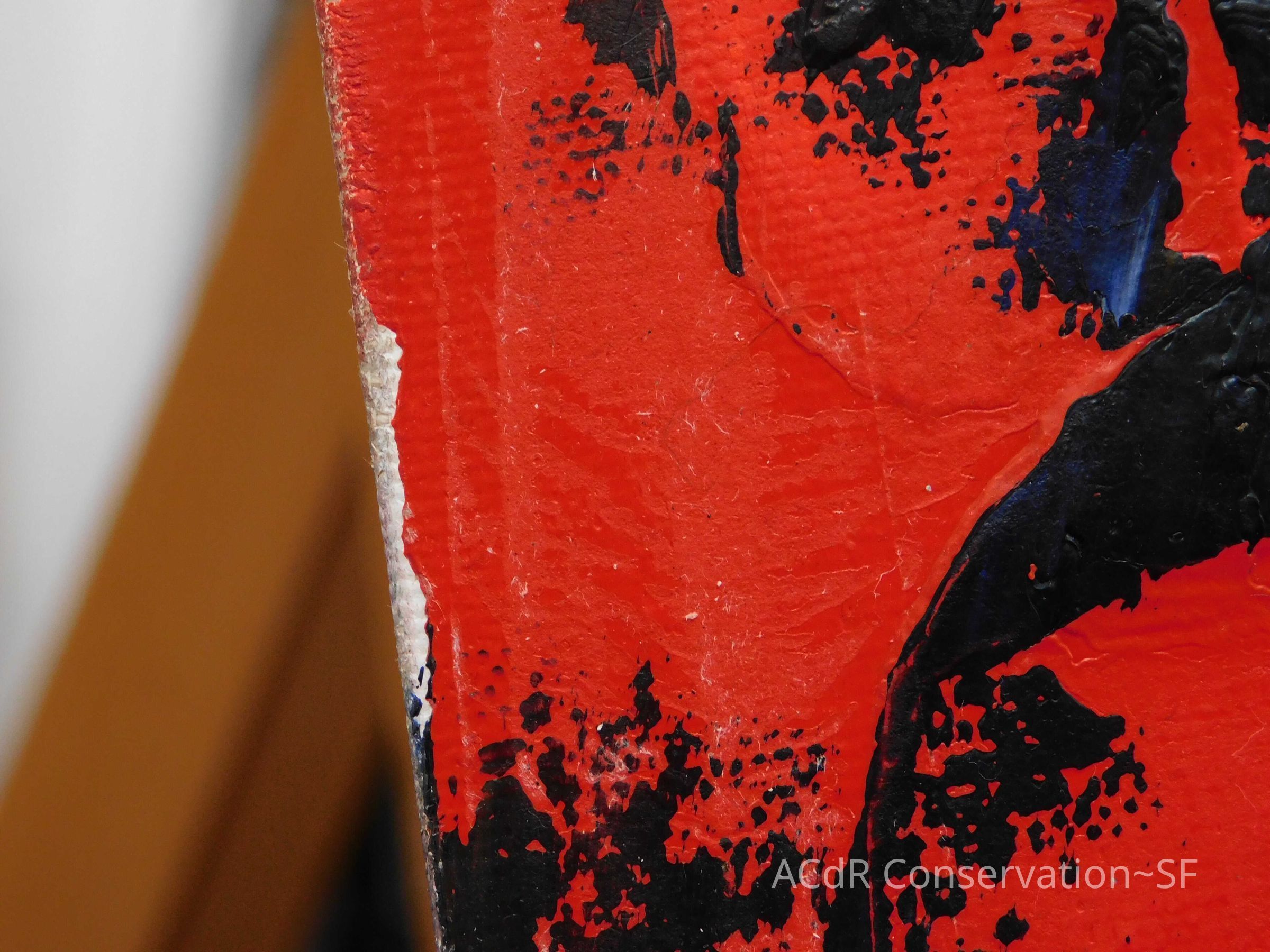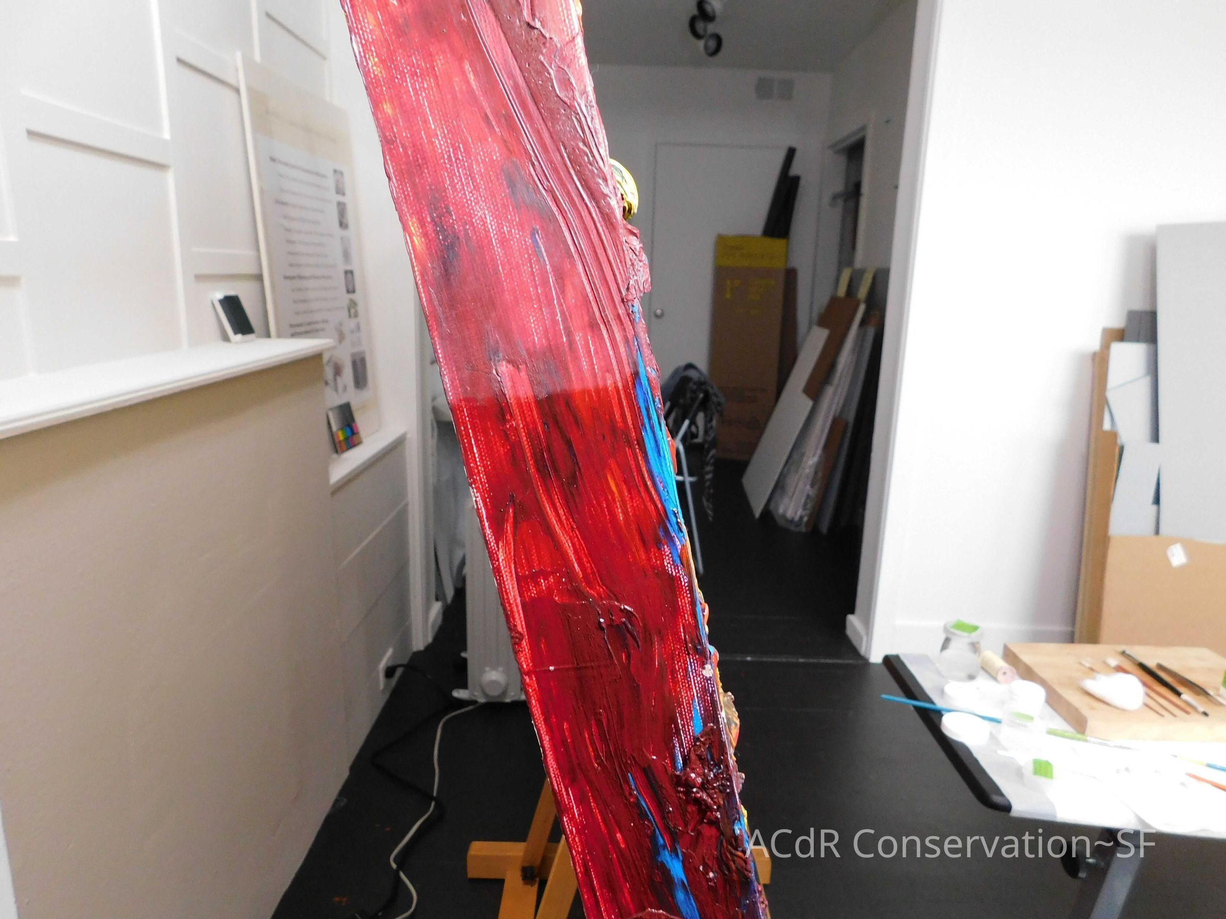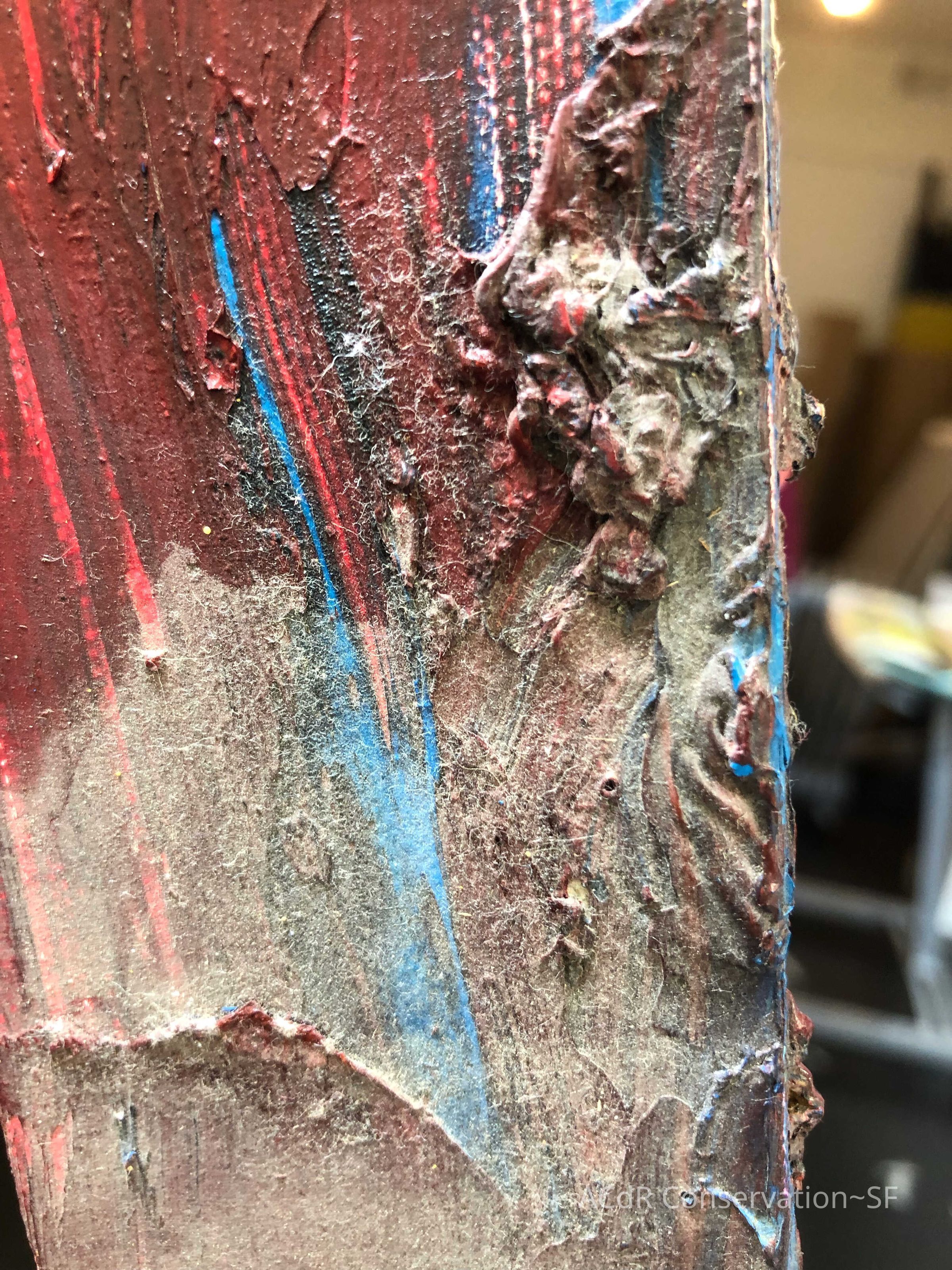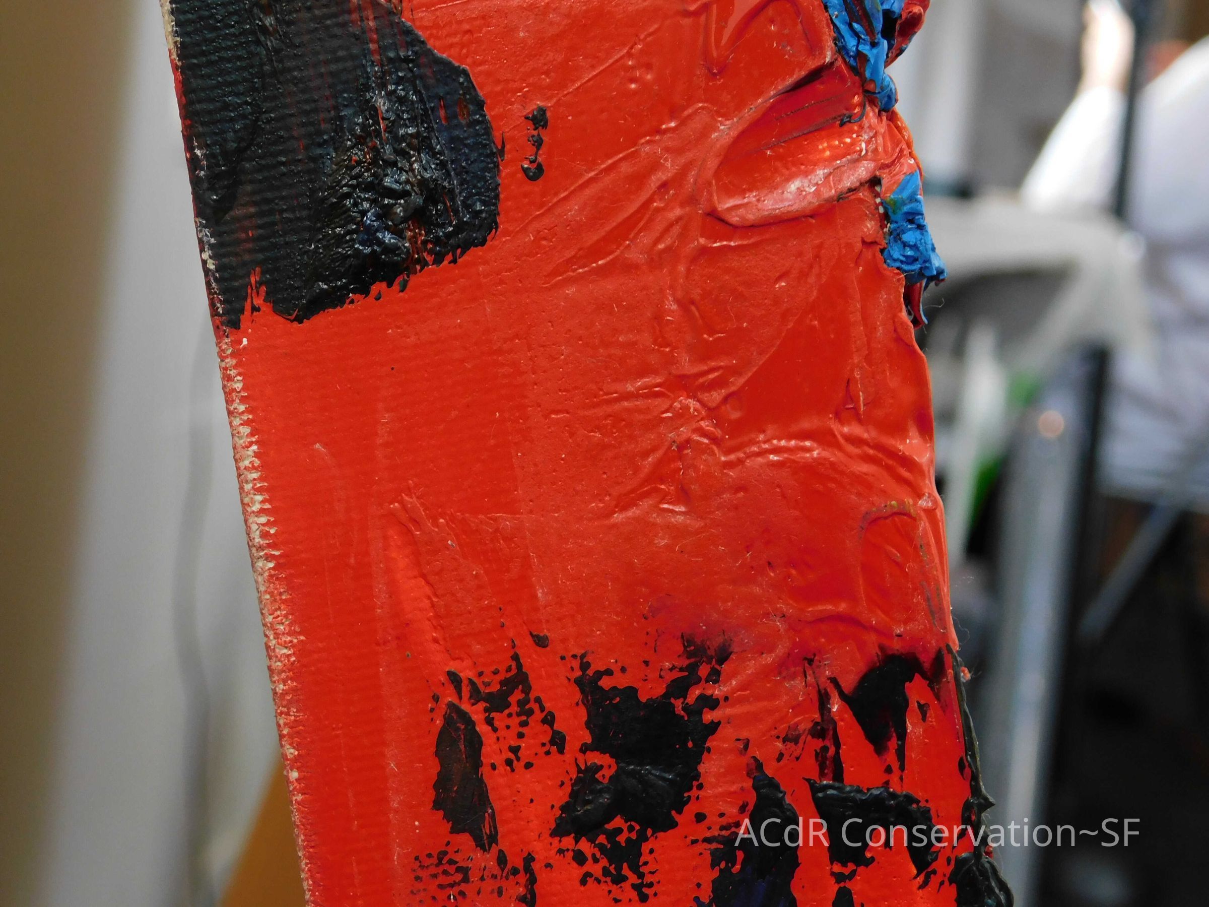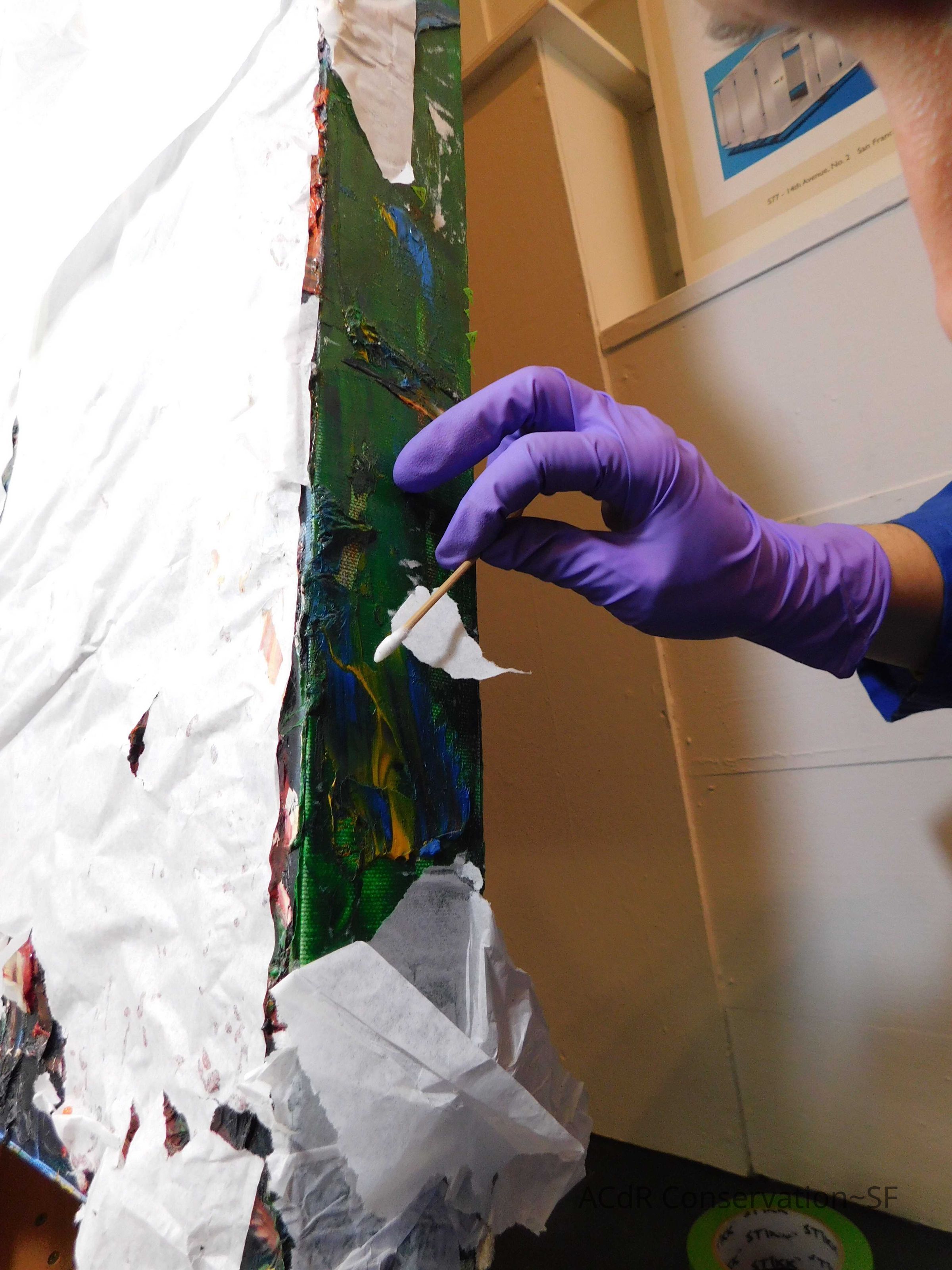 Saturated surface with D4. Cleaned with ME and then rinsed with D4 (D4 with brush/ME with brush/D4 with cotton swab). Red paint is very sensitive to ME. Red and other sensitive paints were cleaned with Velvesil Plus + 40% adjusted water (5.00 pH/6.000mS). The gel was removed with cotton swab and surface rinsed with D4. Cleaned lint and dust using cotton swabs and sponge swabs. Flipped the painting on its side and removed paper from two edges. Saturated paper with D4 and with cotton swabs with pH 5.0/6.000mS adjusted water to pull paper off. Continued cleaning painting as above. Cleaning edges with Velvesil Plus and 5.0 pH solution.