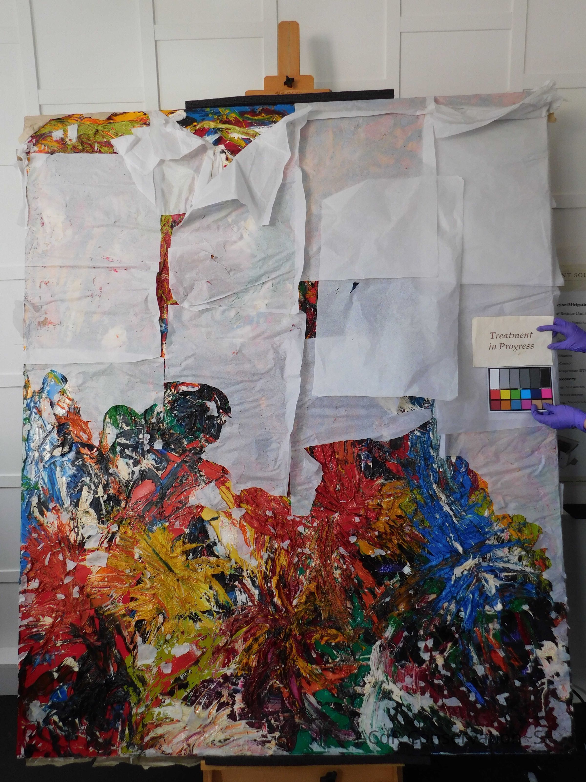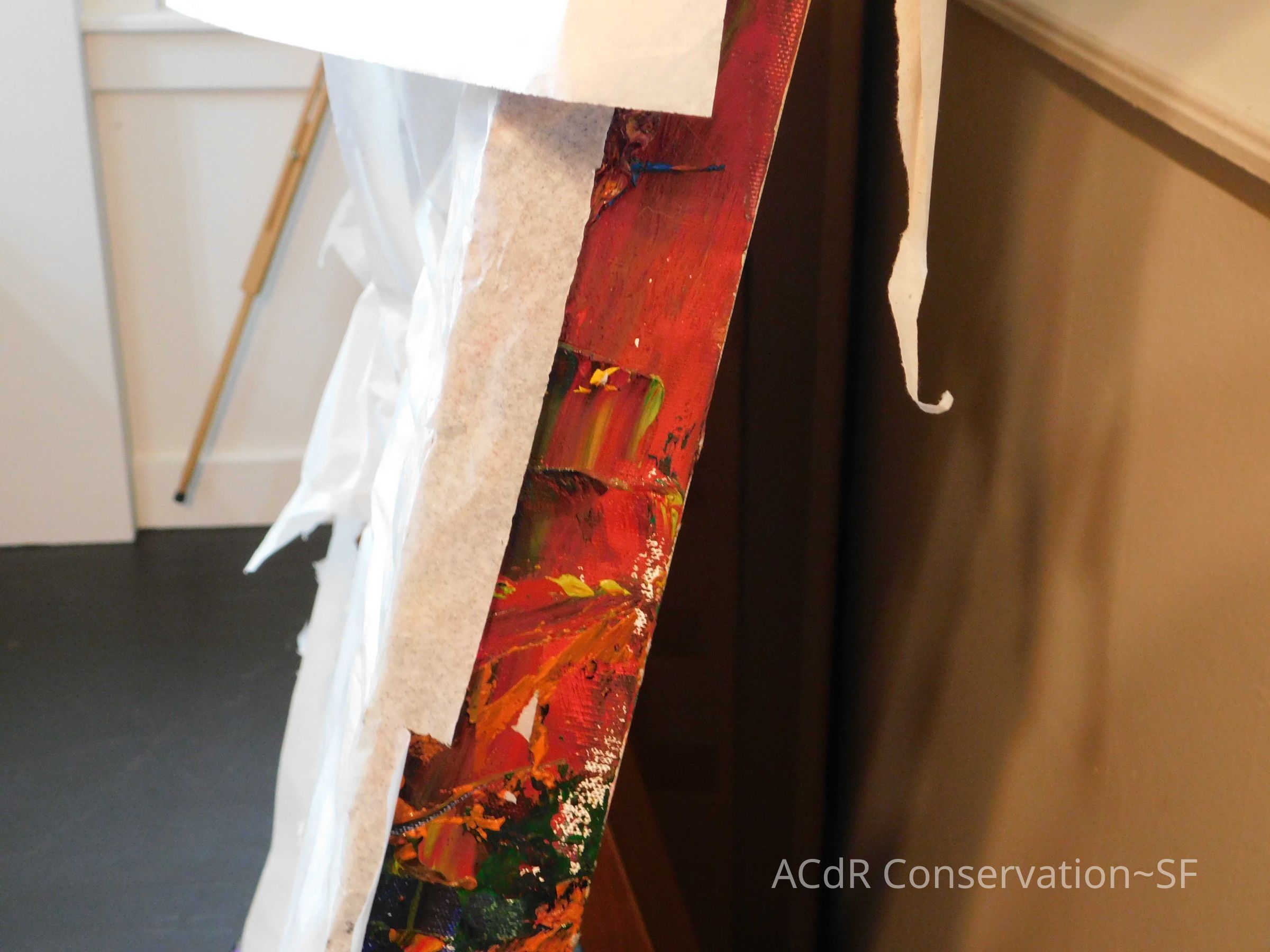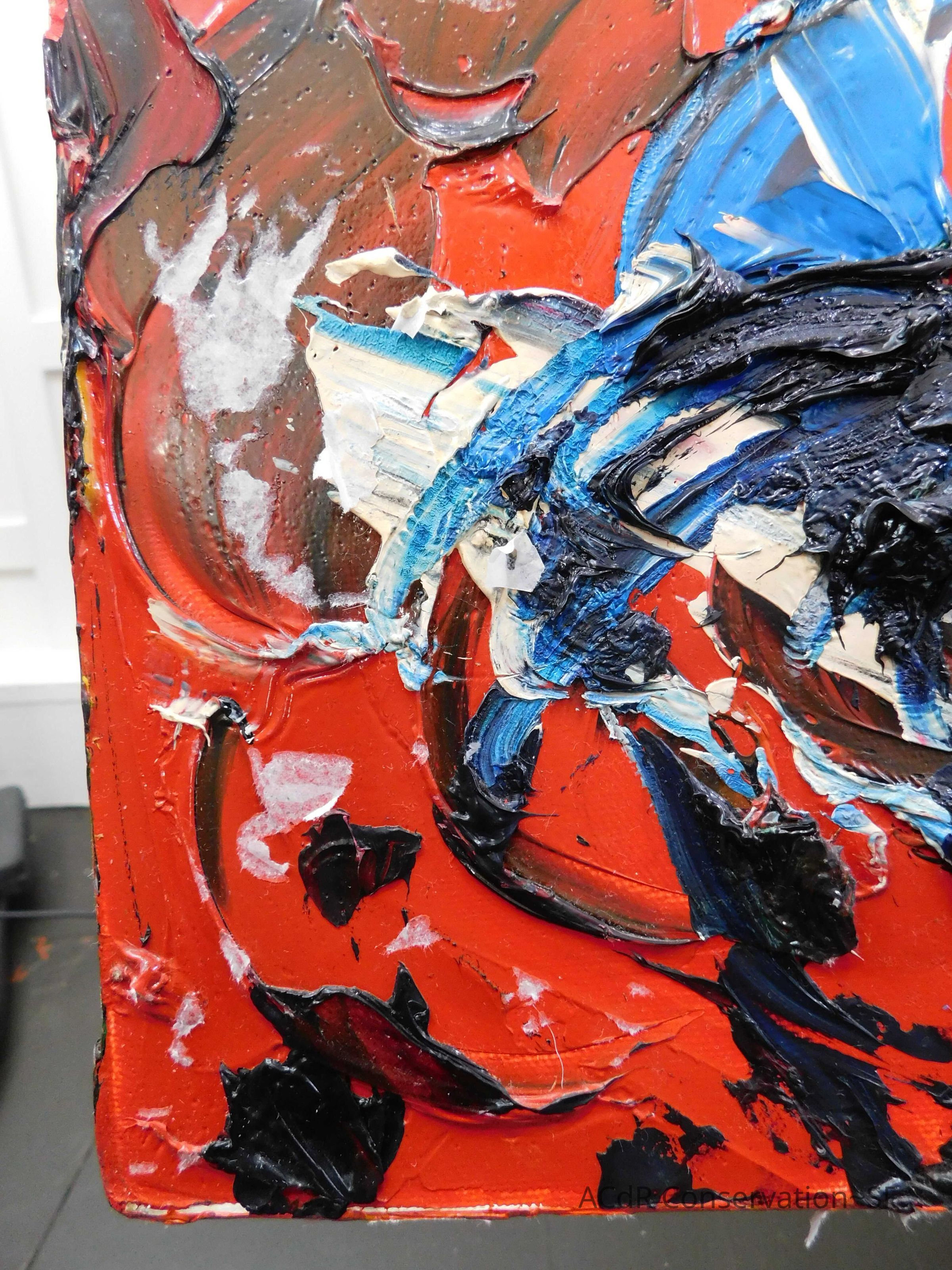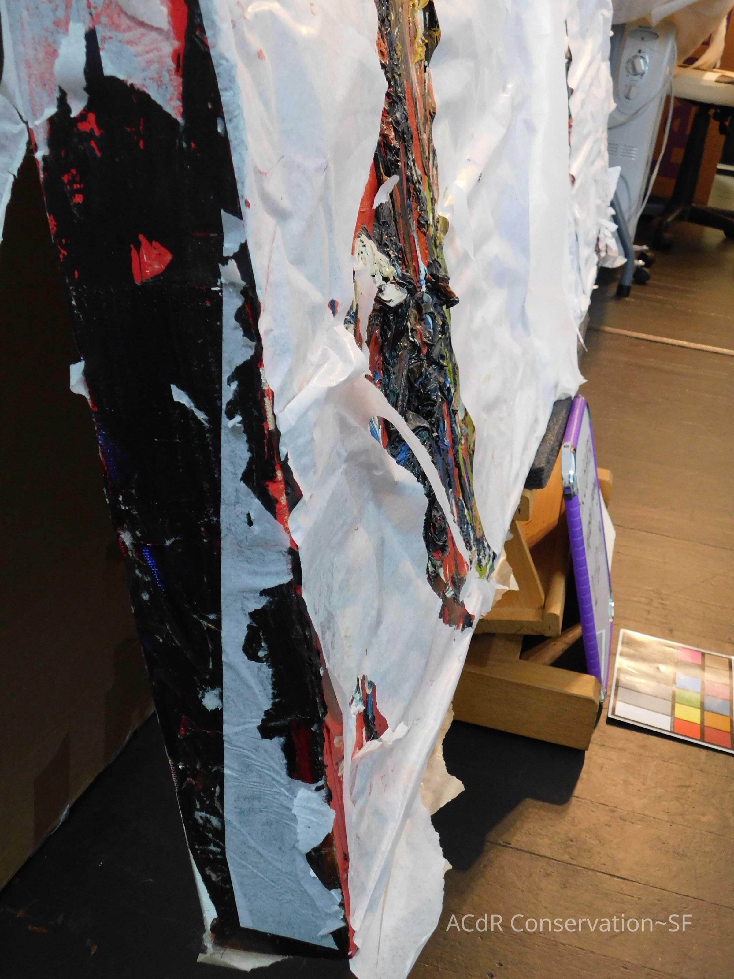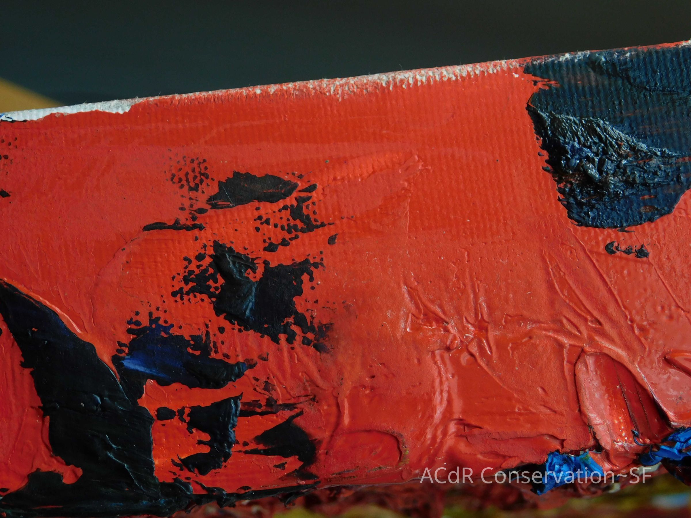 Saturated surface with D4. Cleaned with ME and then rinsed with D4 (D4 with brush/ME with brush/D4 with cotton swab). Red paint is very sensitive to ME. Red and other sensitive paints were cleaned with Velvesil Plus + 40% adjusted water (5.00 pH/6.000mS). The gel was removed with cotton swab and surface rinsed with D4. Cleaned lint and dust using cotton swabs and sponge swabs. Flipped the painting on its side and removed paper from two edges. Saturated paper with D4 and with cotton swabs with pH 5.0/6.000mS adjusted water to pull paper off. Continued cleaning painting as above. Cleaning edges with Velvesil Plus and 5.0 pH solution.