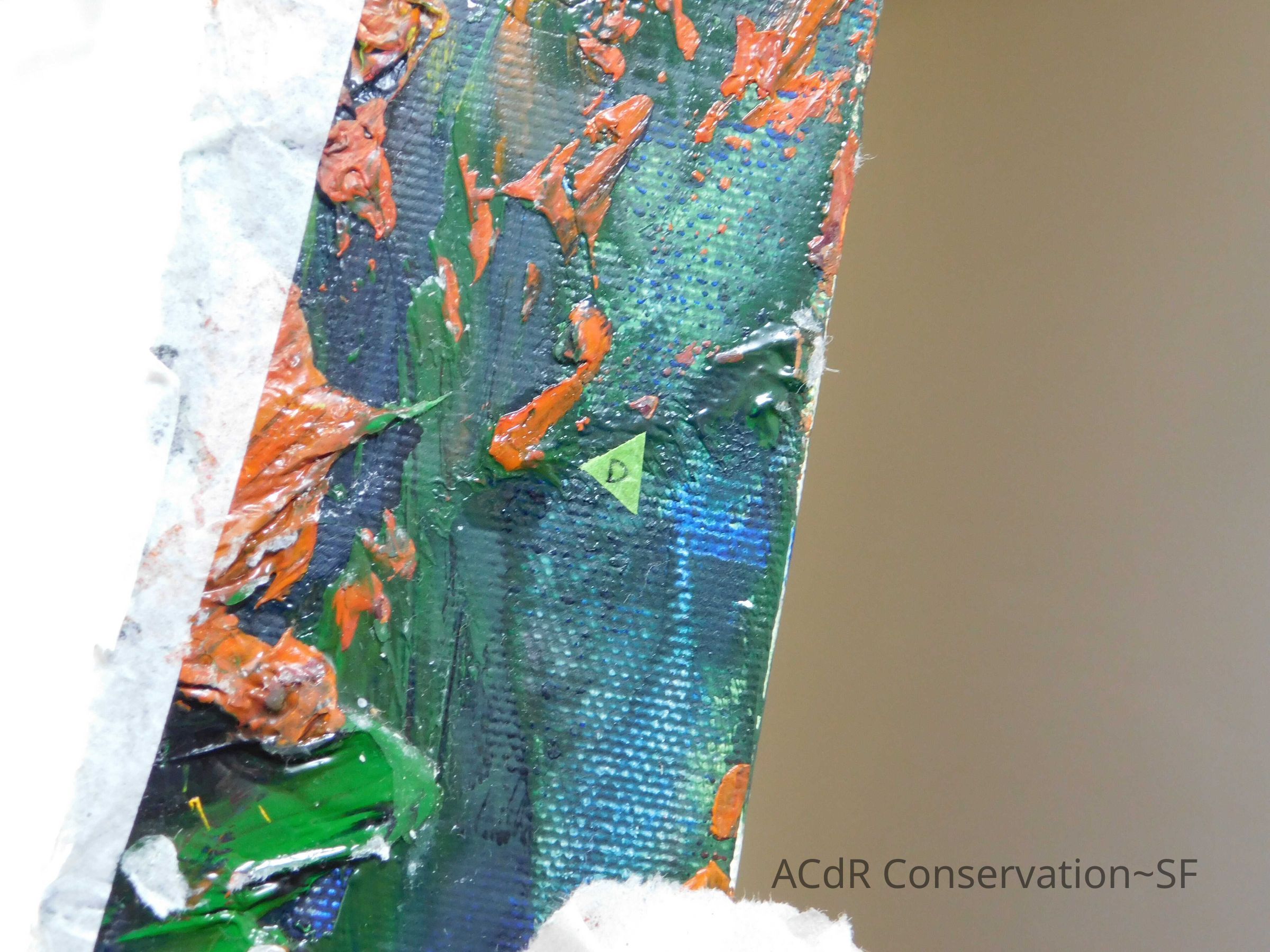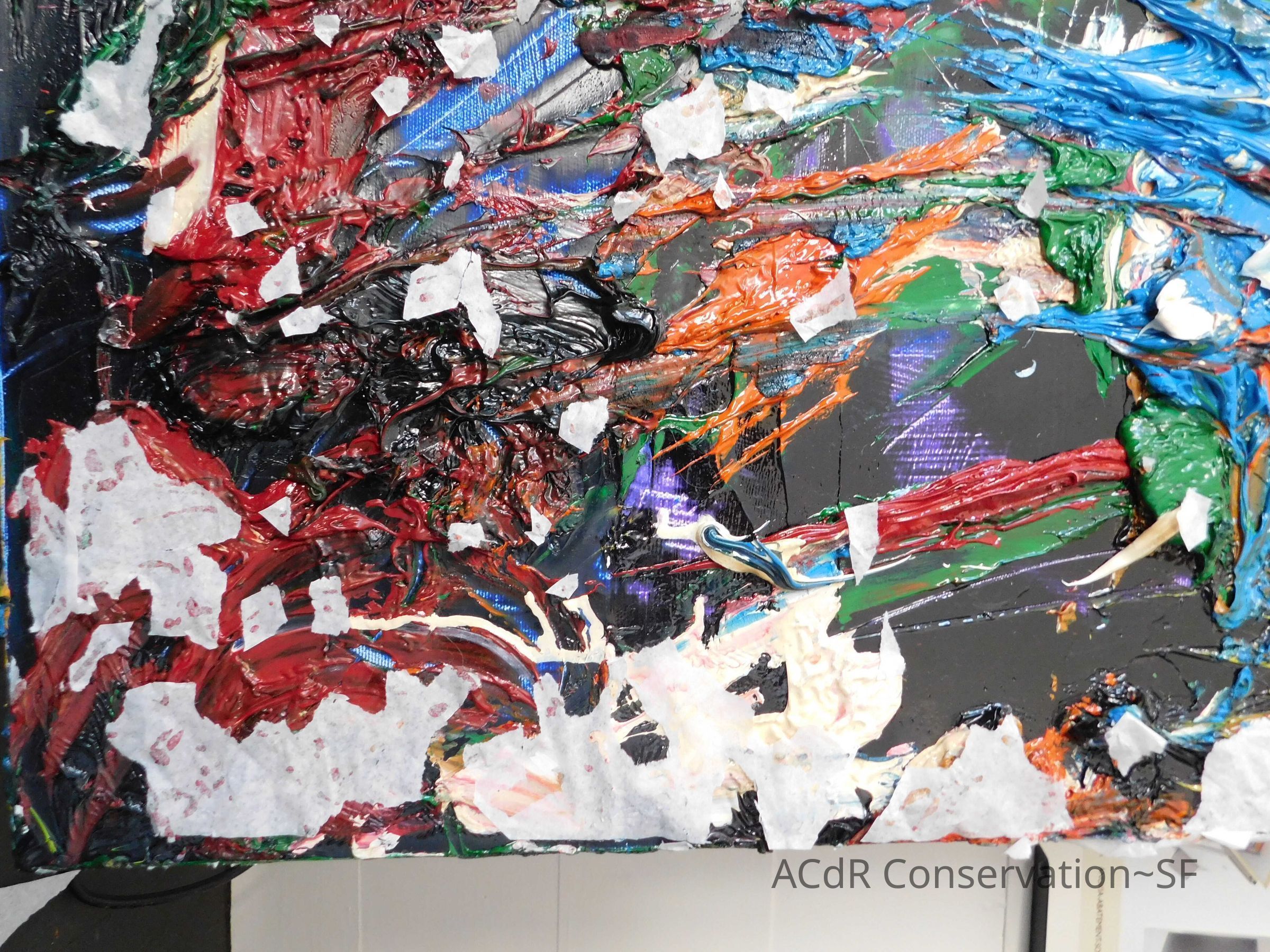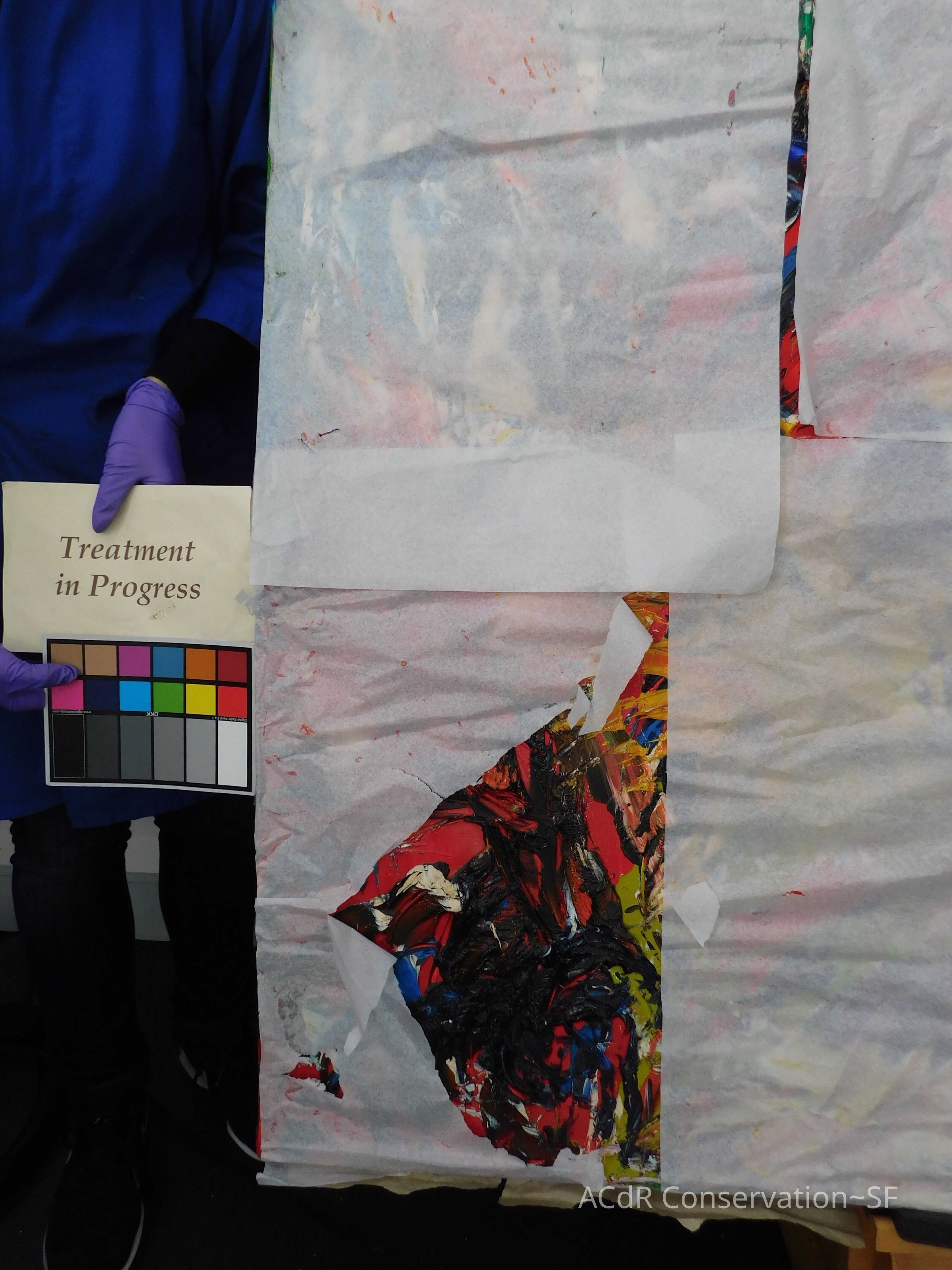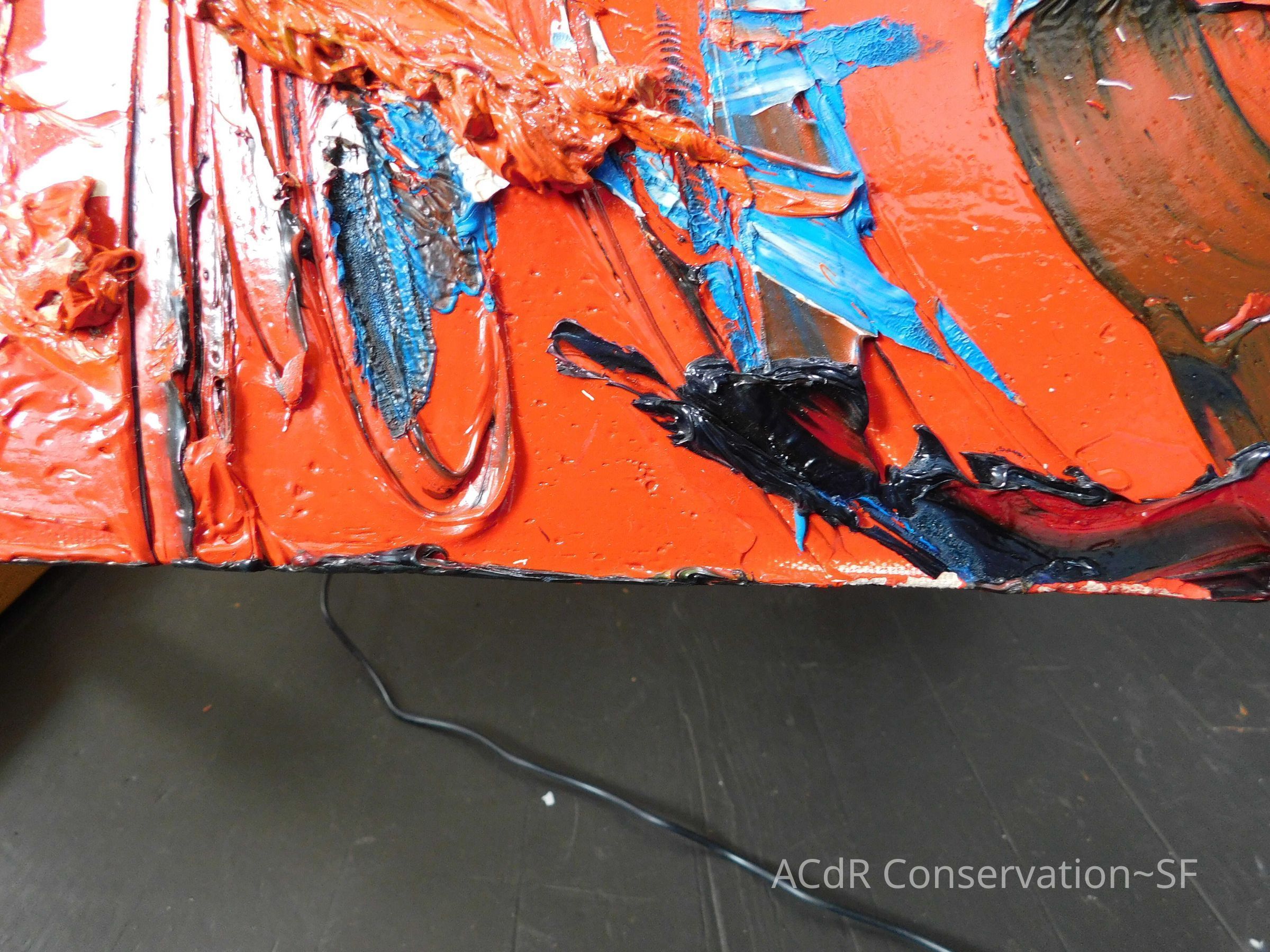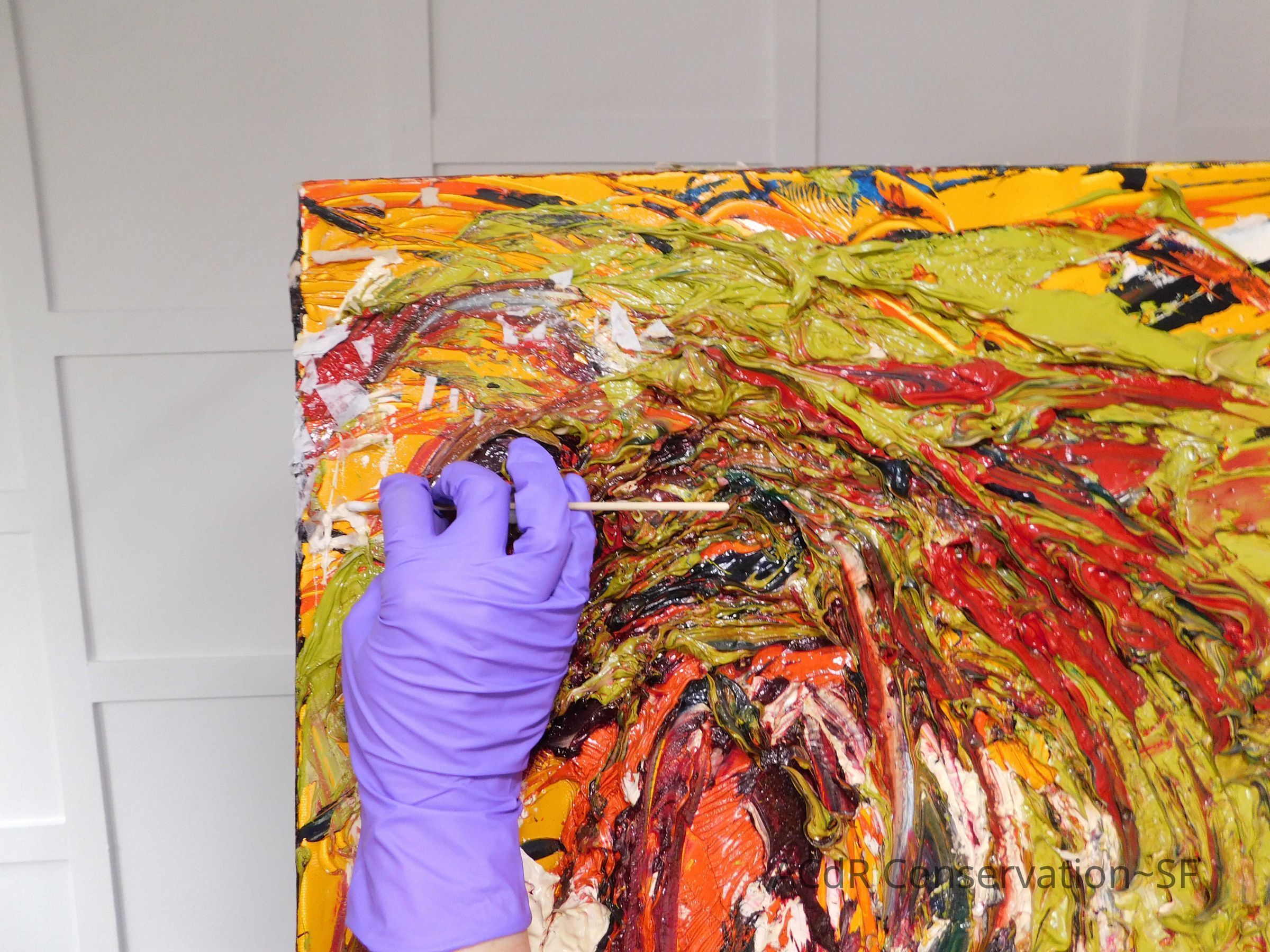 Saturated surface with D4. Cleaned with ME and then rinsed with D4 (D4 with brush/ME with brush/D4 with cotton swab). Red paint is very sensitive to ME. Red and other sensitive paints were cleaned with Velvesil Plus + 40% adjusted water (5.00 pH/6.000mS). The gel was removed with cotton swab and surface rinsed with D4. Cleaned lint and dust using cotton swabs and sponge swabs. Flipped the painting on its side and removed paper from two edges. Saturated paper with D4 and with cotton swabs with pH 5.0/6.000mS adjusted water to pull paper off. Continued cleaning painting as above. Cleaning edges with Velvesil Plus and 5.0 pH solution.