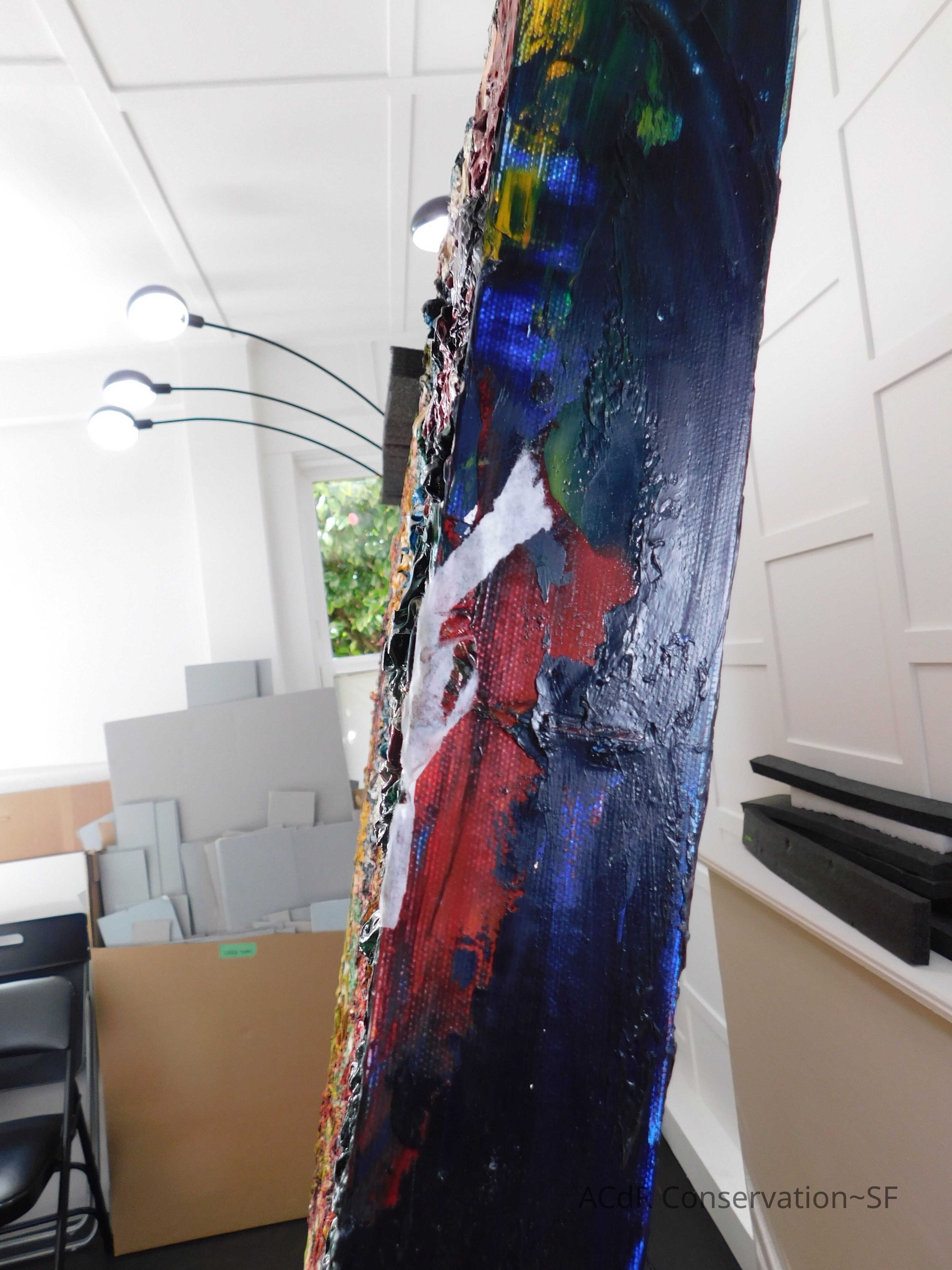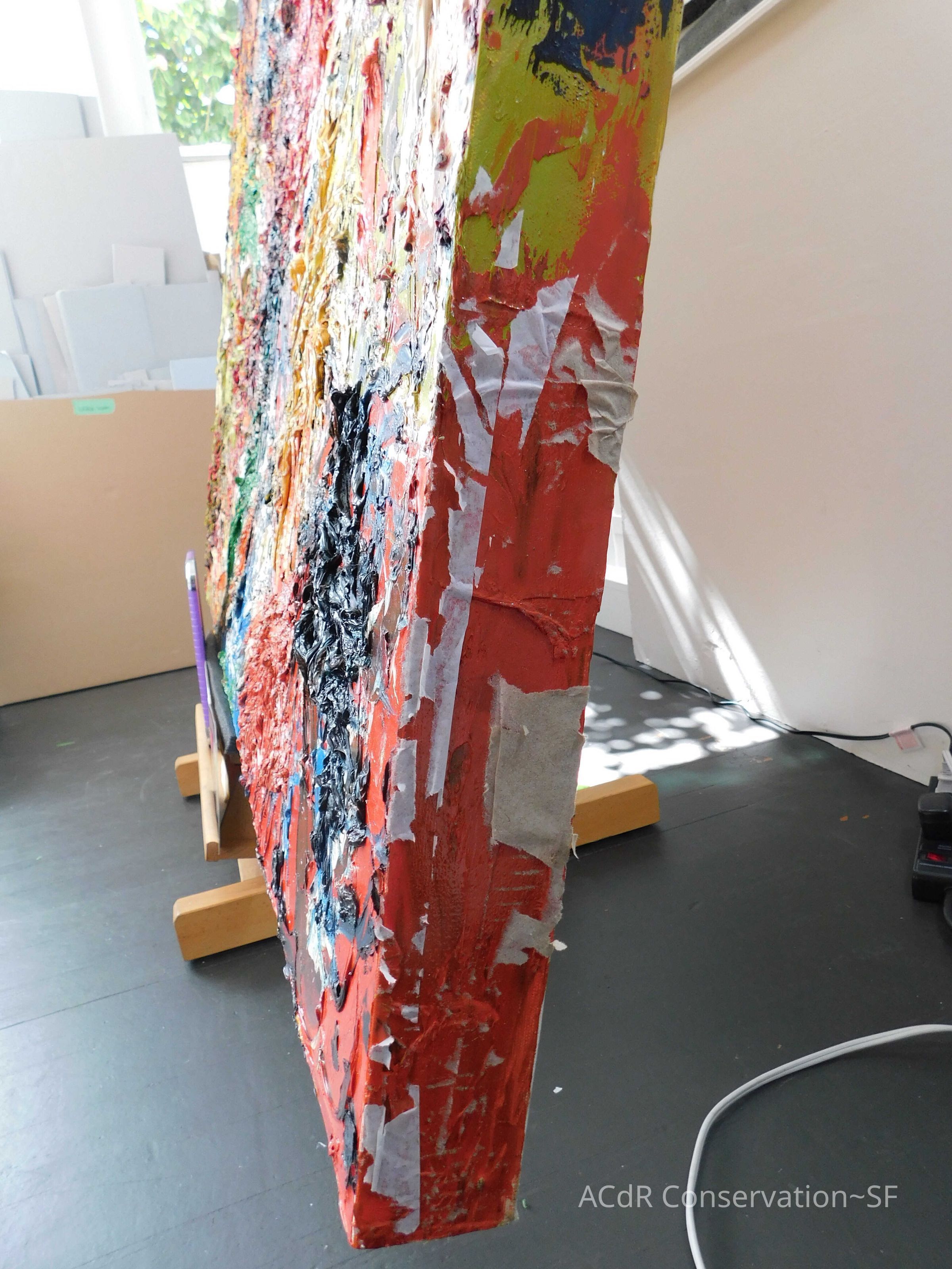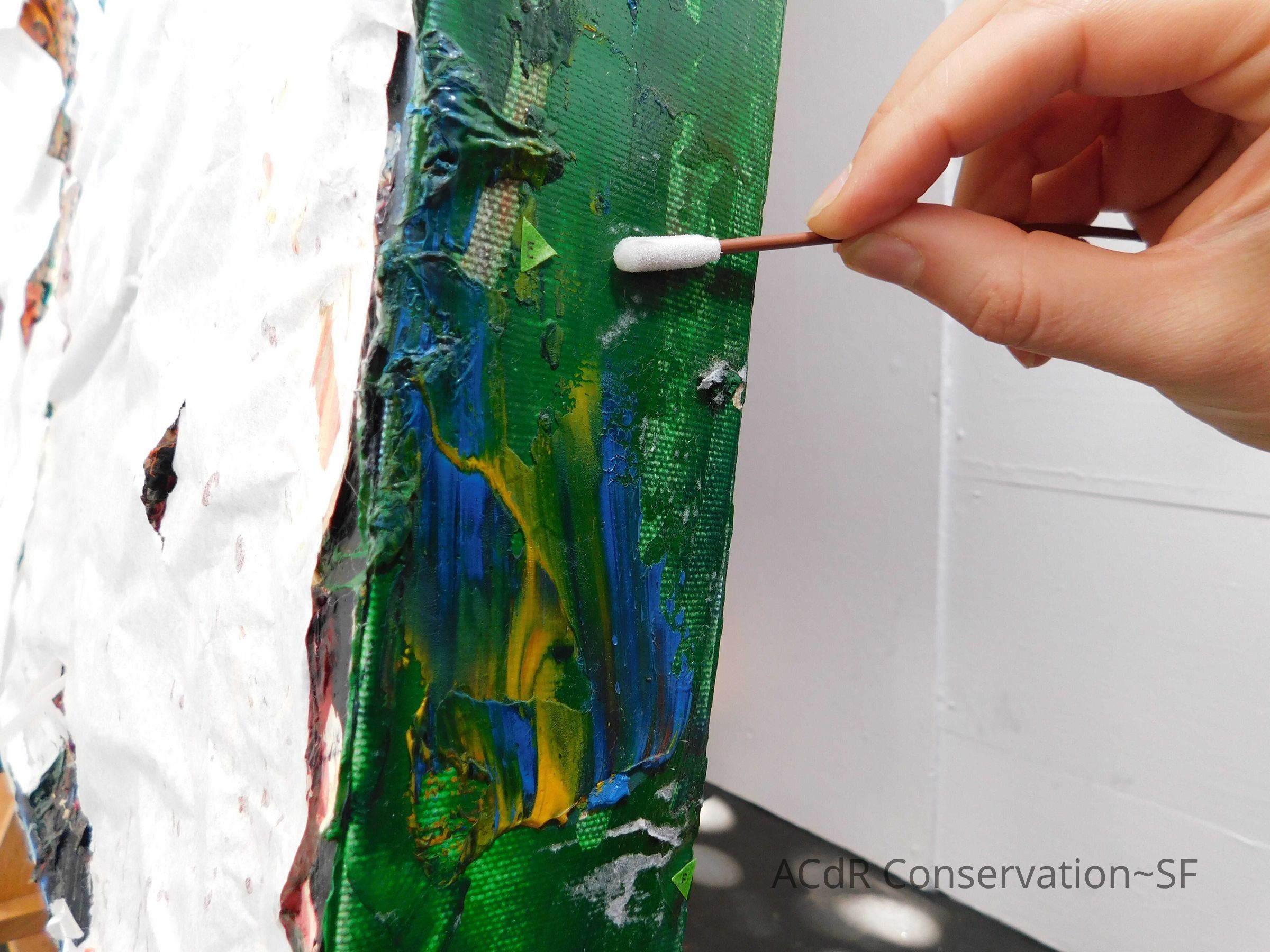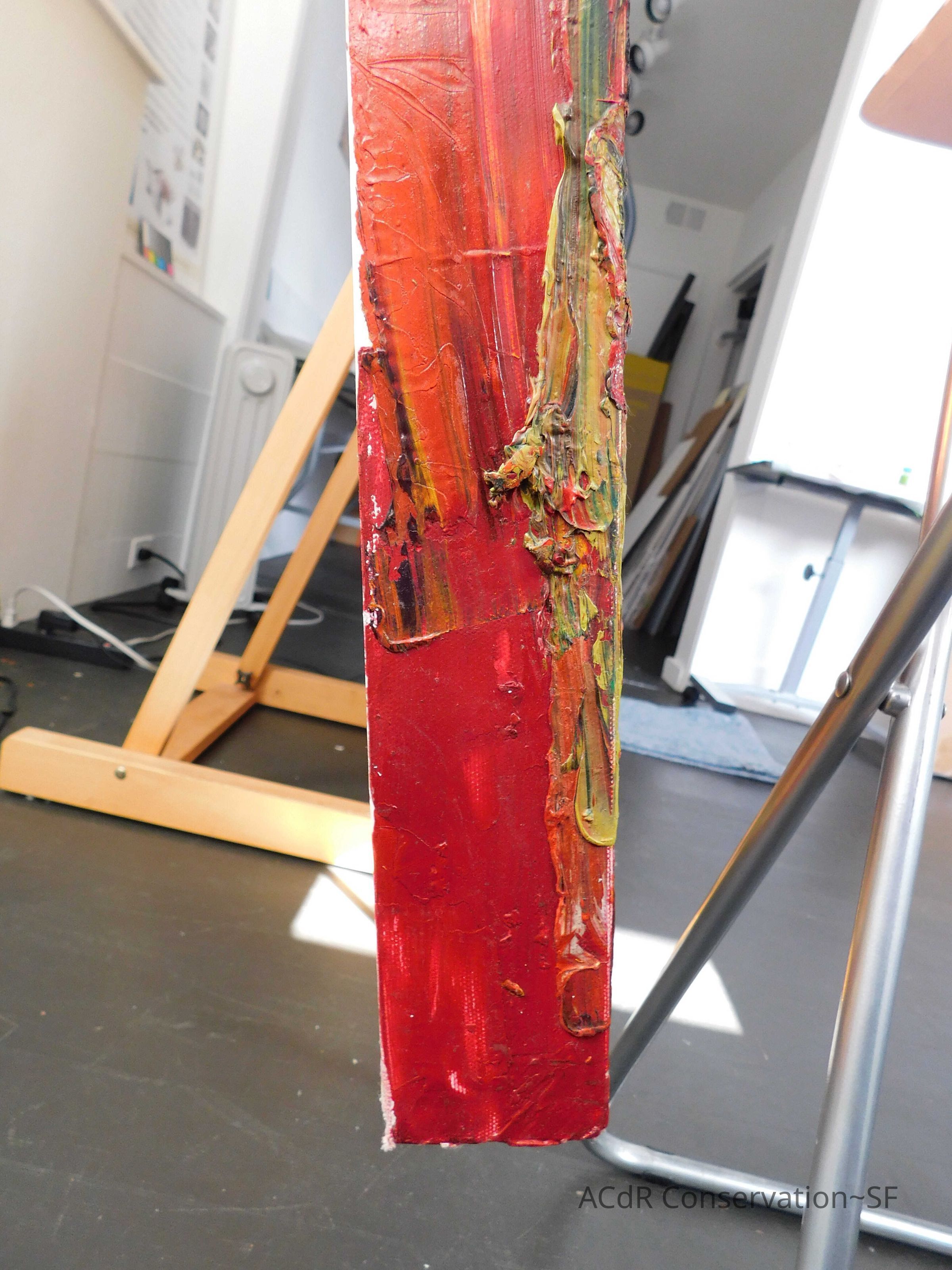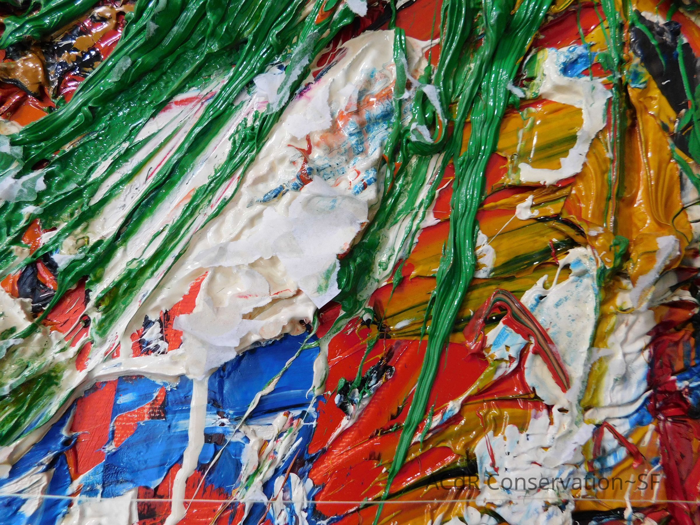 Saturated surface with D4. Cleaned with ME and then rinsed with D4 (D4 with brush/ME with brush/D4 with cotton swab). Red paint is very sensitive to ME. Red and other sensitive paints were cleaned with Velvesil Plus + 40% adjusted water (5.00 pH/6.000mS). The gel was removed with cotton swab and surface rinsed with D4. Cleaned lint and dust using cotton swabs and sponge swabs. Flipped the painting on its side and removed paper from two edges. Saturated paper with D4 and with cotton swabs with pH 5.0/6.000mS adjusted water to pull paper off. Continued cleaning painting as above. Cleaning edges with Velvesil Plus and 5.0 pH solution.