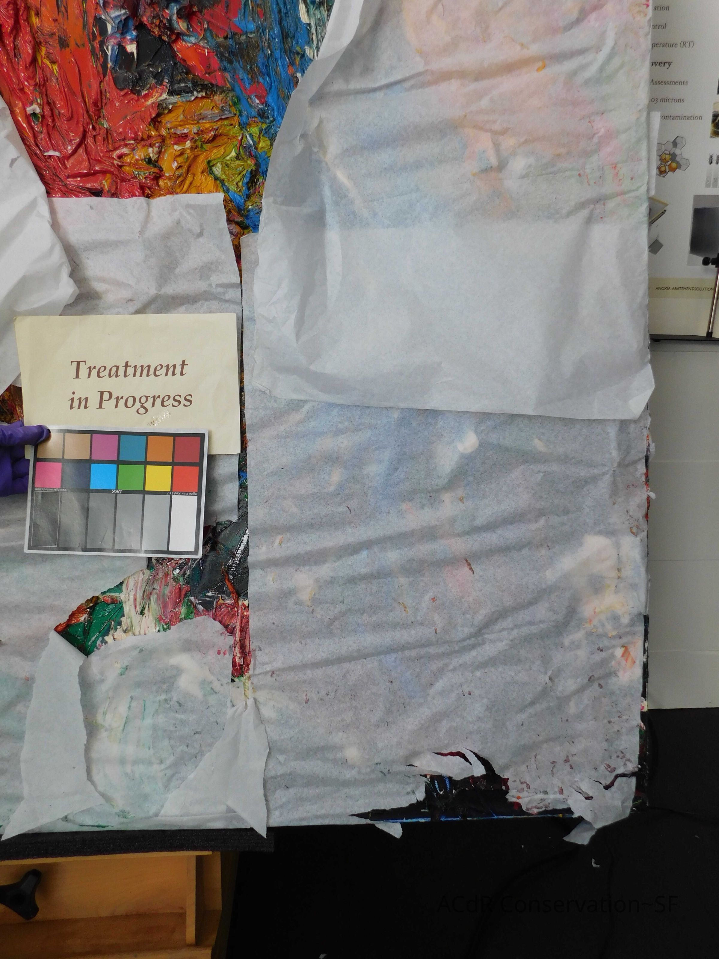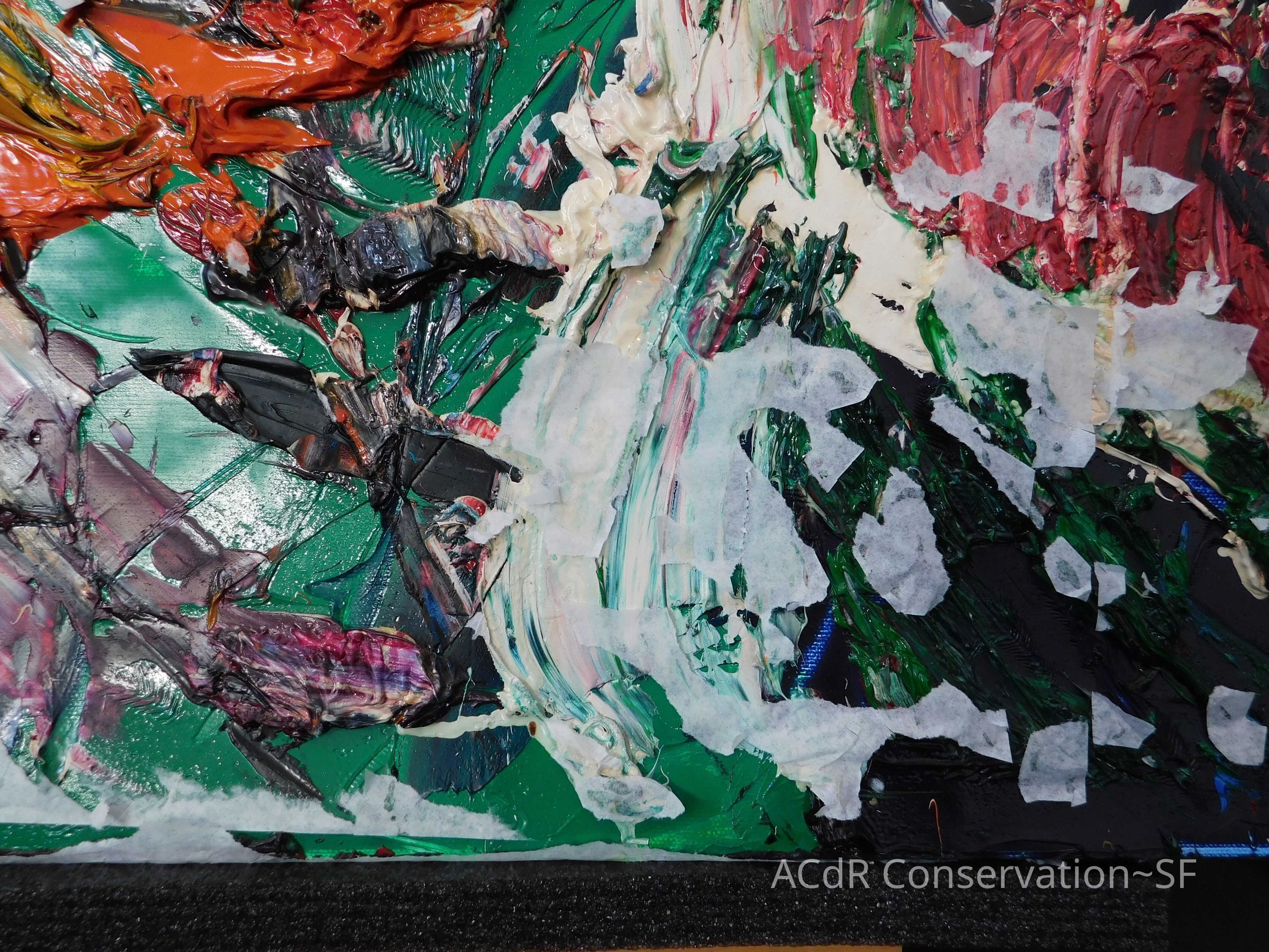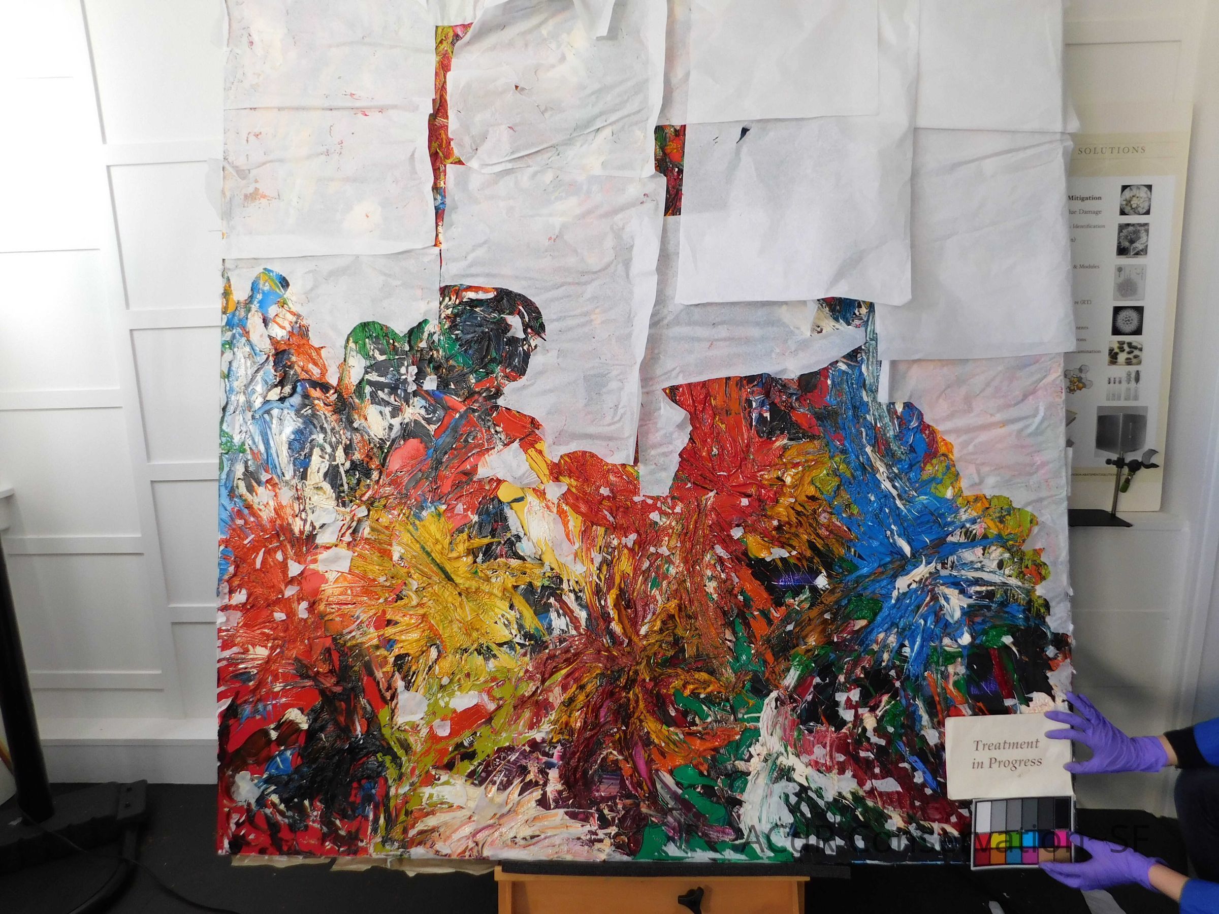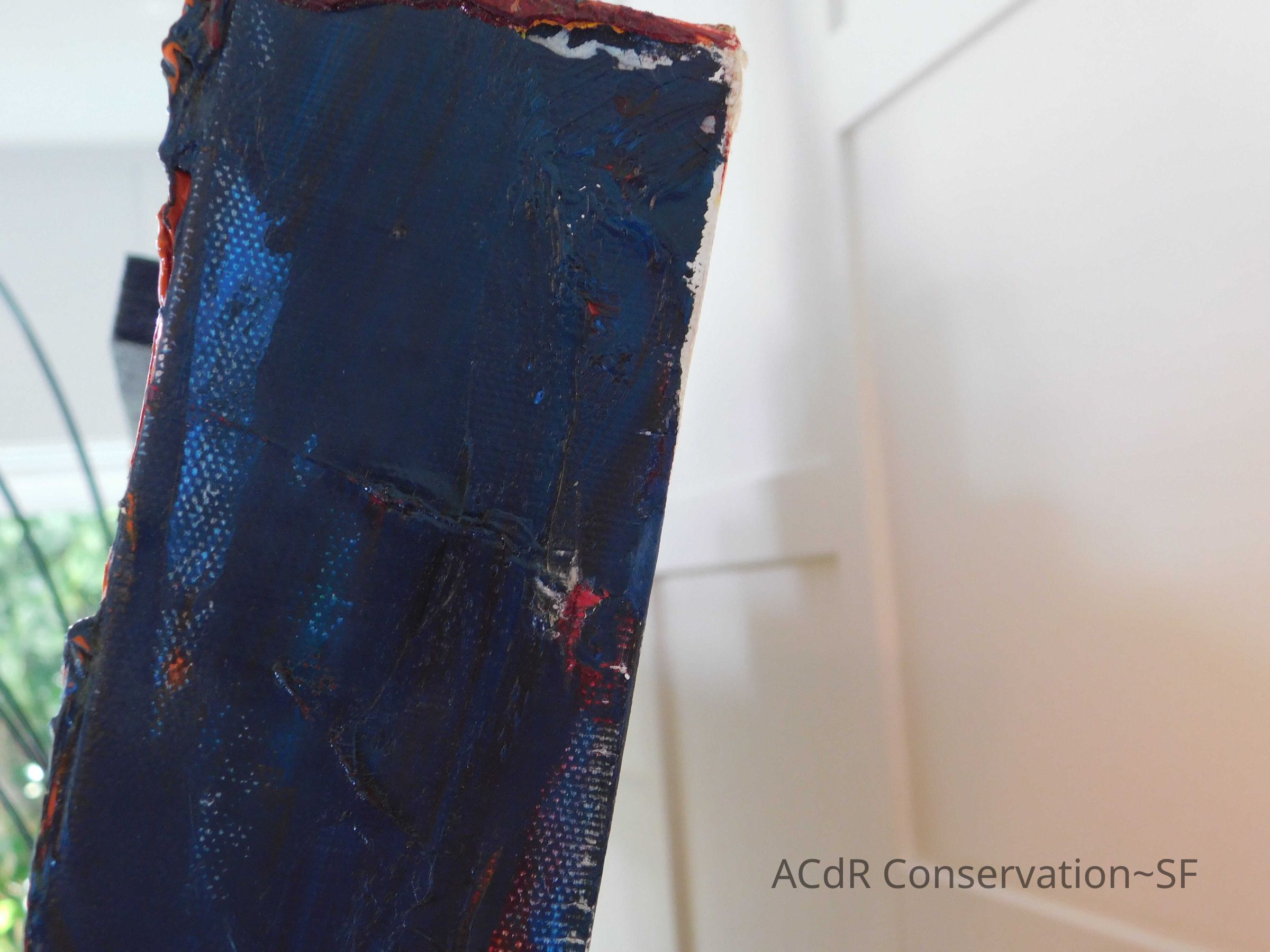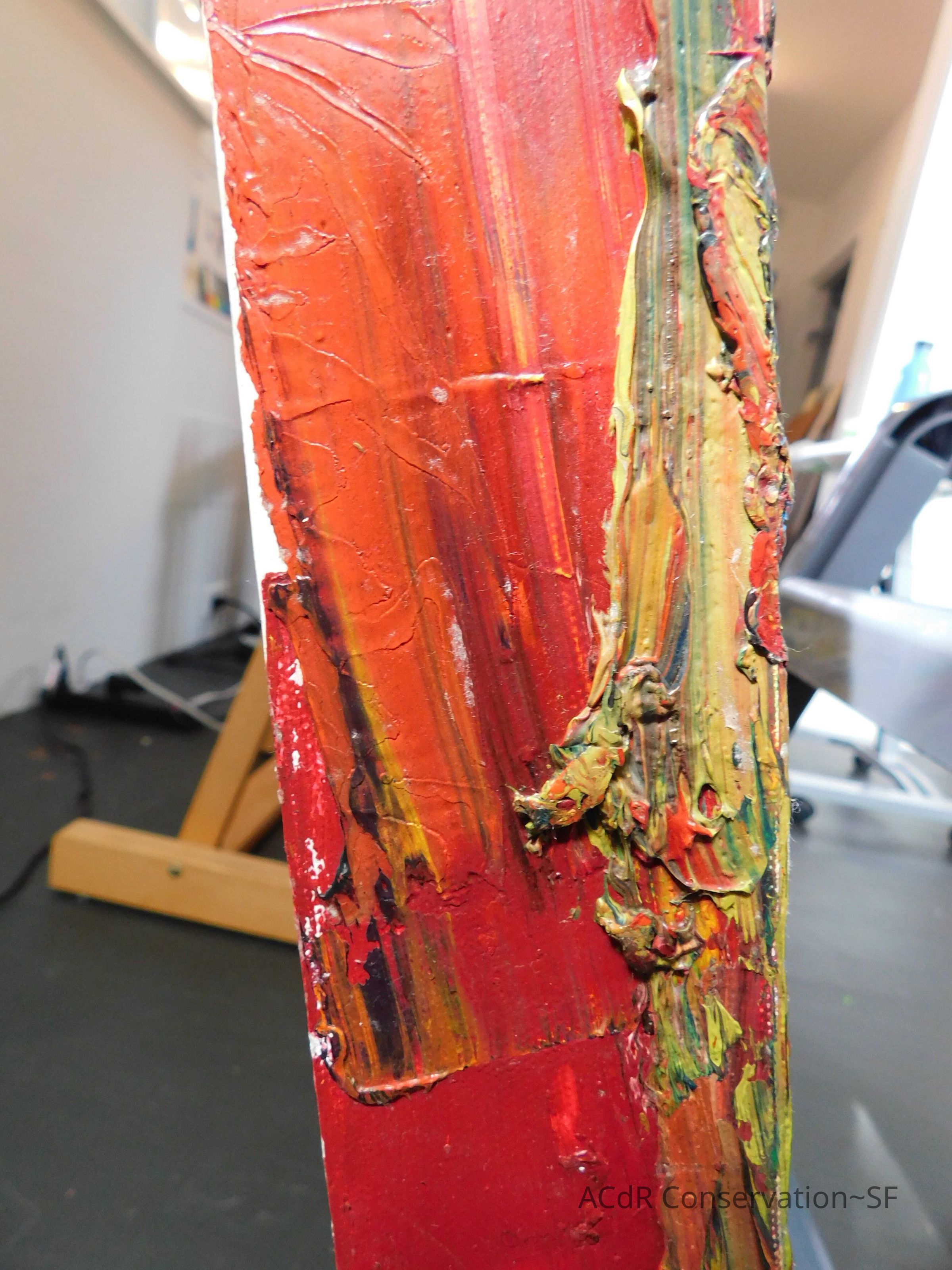 Saturated surface with D4. Cleaned with ME and then rinsed with D4 (D4 with brush/ME with brush/D4 with cotton swab). Red paint is very sensitive to ME. Red and other sensitive paints were cleaned with Velvesil Plus + 40% adjusted water (5.00 pH/6.000mS). The gel was removed with cotton swab and surface rinsed with D4. Cleaned lint and dust using cotton swabs and sponge swabs. Flipped the painting on its side and removed paper from two edges. Saturated paper with D4 and with cotton swabs with pH 5.0/6.000mS adjusted water to pull paper off. Continued cleaning painting as above. Cleaning edges with Velvesil Plus and 5.0 pH solution.