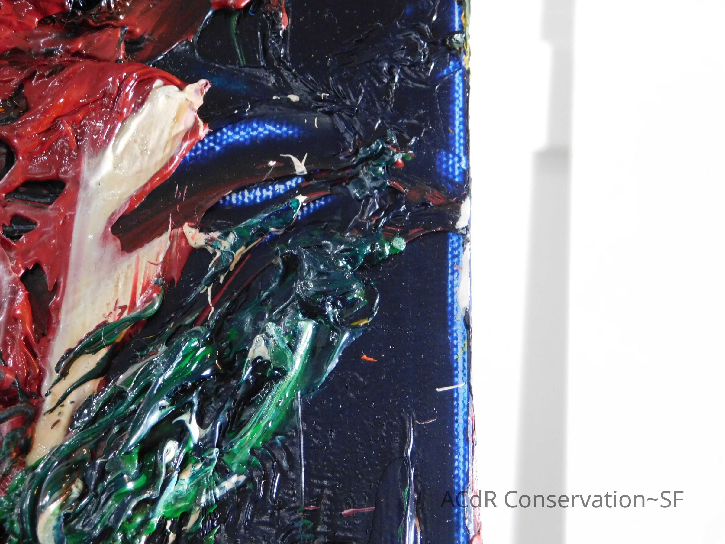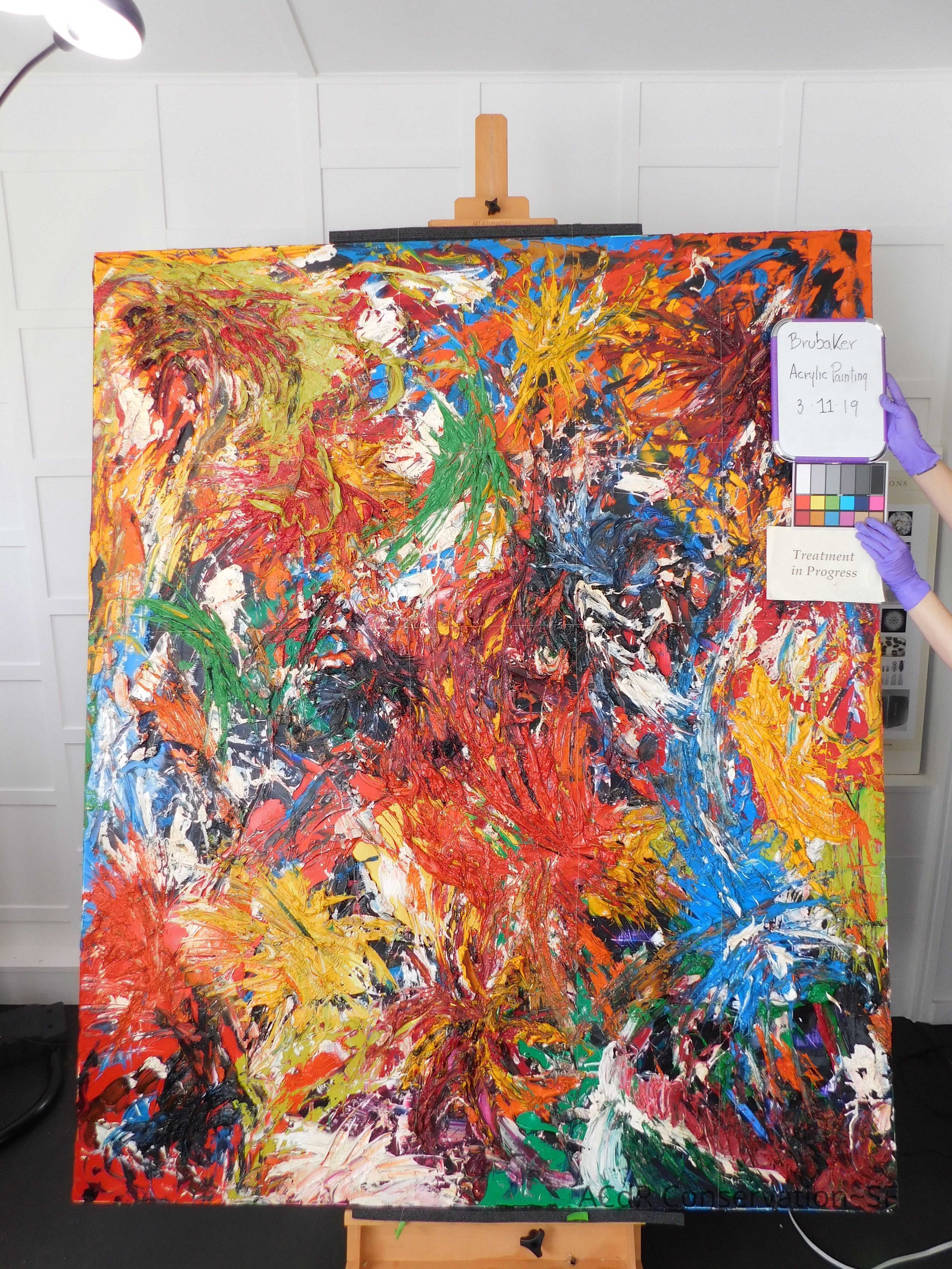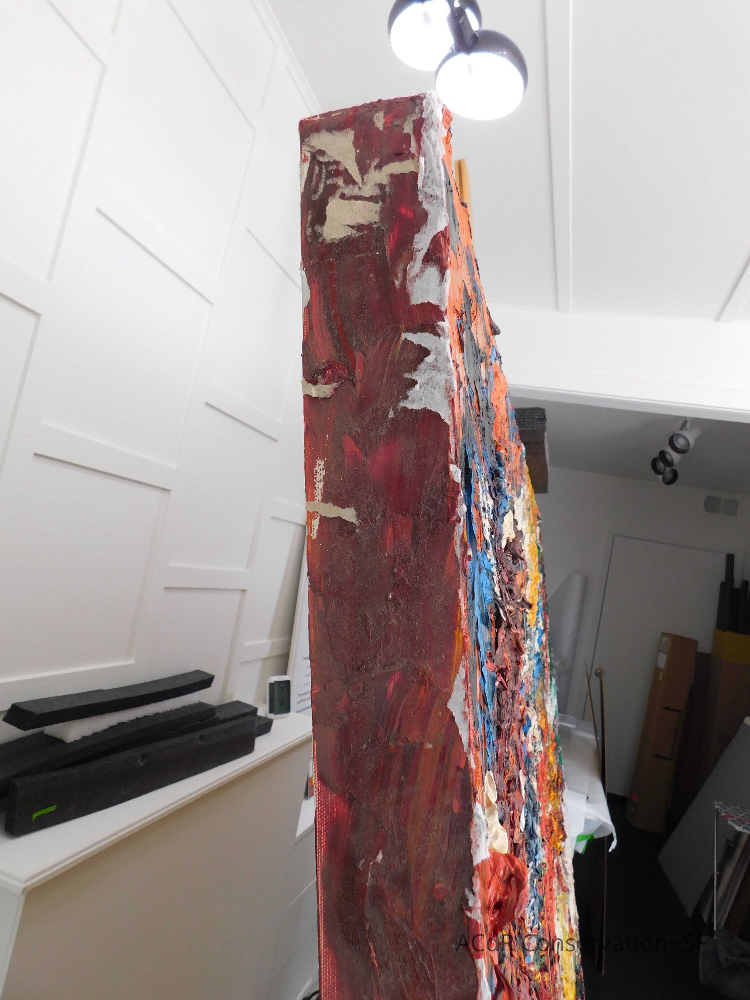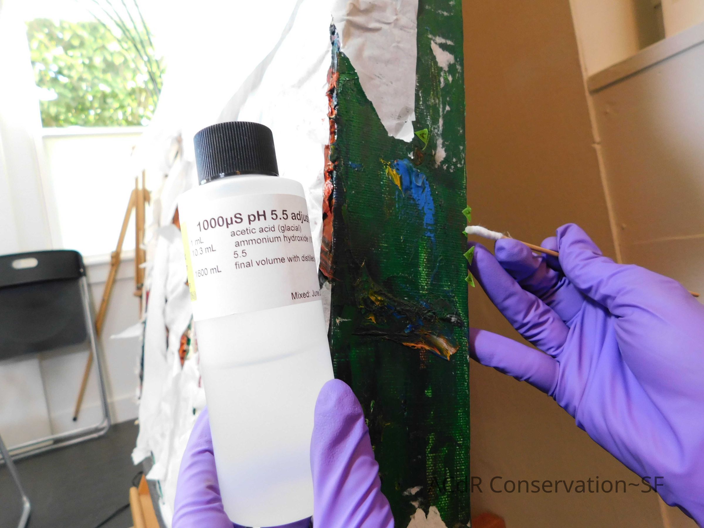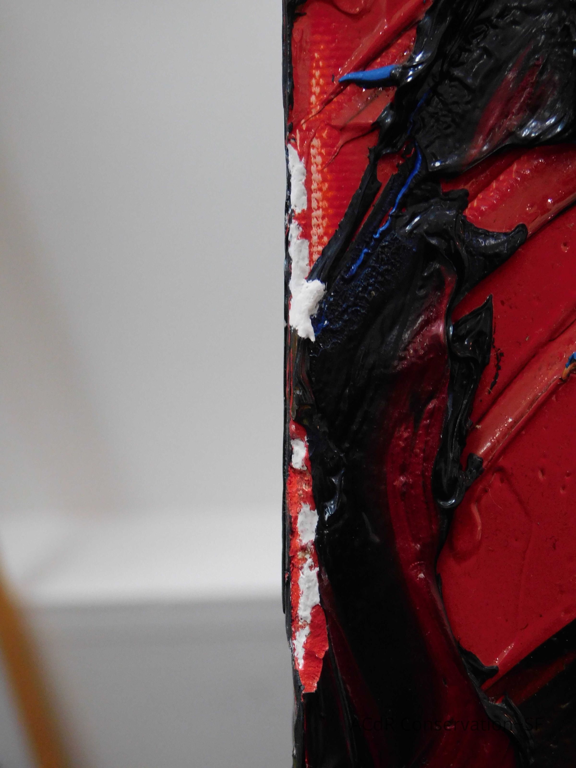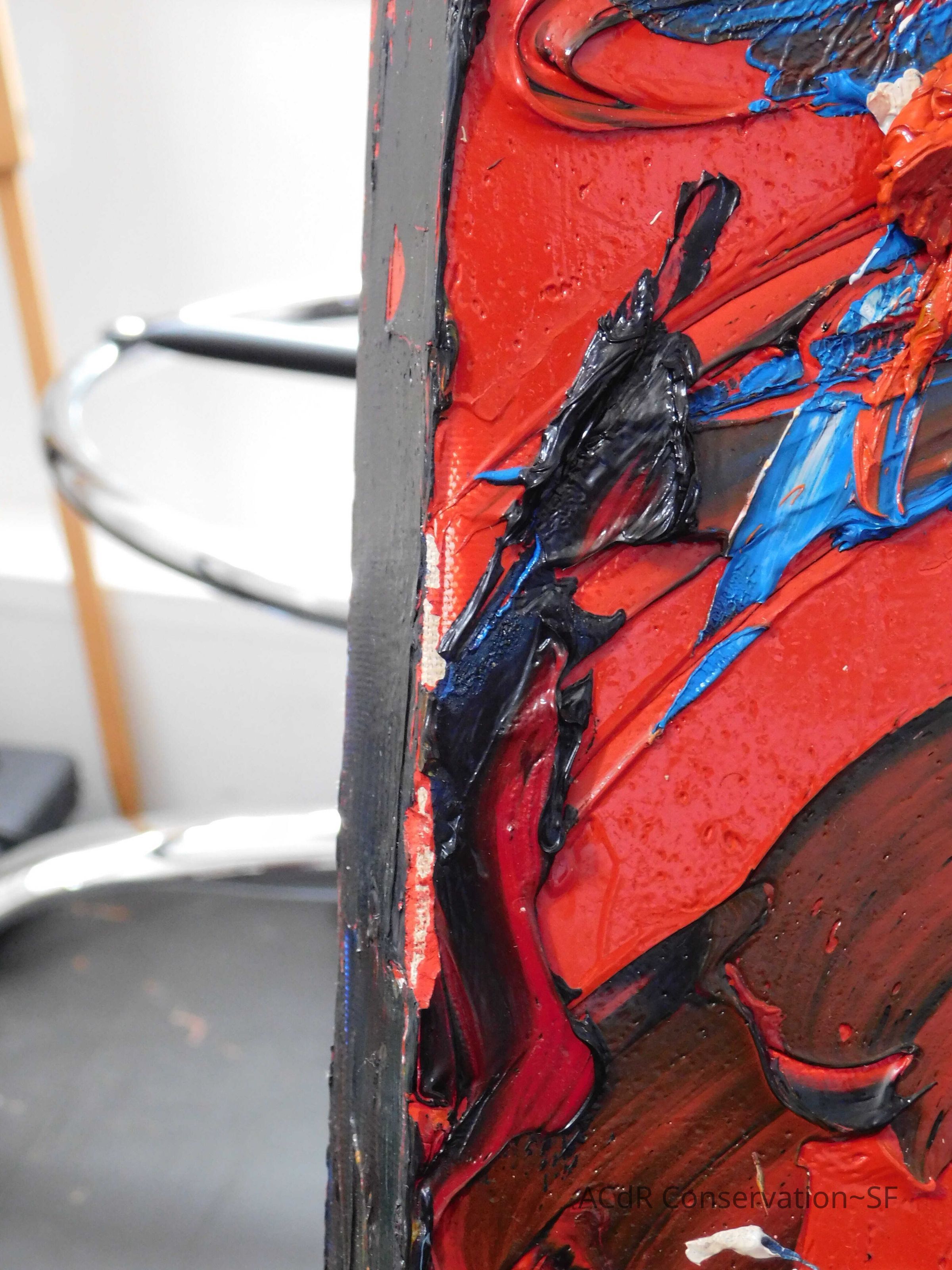 Saturated surface with D4. Cleaned with ME and then rinsed with D4 (D4 with brush/ME with brush/D4 with cotton swab). Red paint is very sensitive to ME. Red and other sensitive paints were cleaned with Velvesil Plus + 40% adjusted water (5.00 pH/6.000mS). The gel was removed with cotton swab and surface rinsed with D4. Cleaned lint and dust using cotton swabs and sponge swabs. Flipped the painting on its side and removed paper from two edges. Saturated paper with D4 and with cotton swabs with pH 5.0/6.000mS adjusted water to pull paper off. Continued cleaning painting as above. Cleaning edges with Velvesil Plus and 5.0 pH solution.