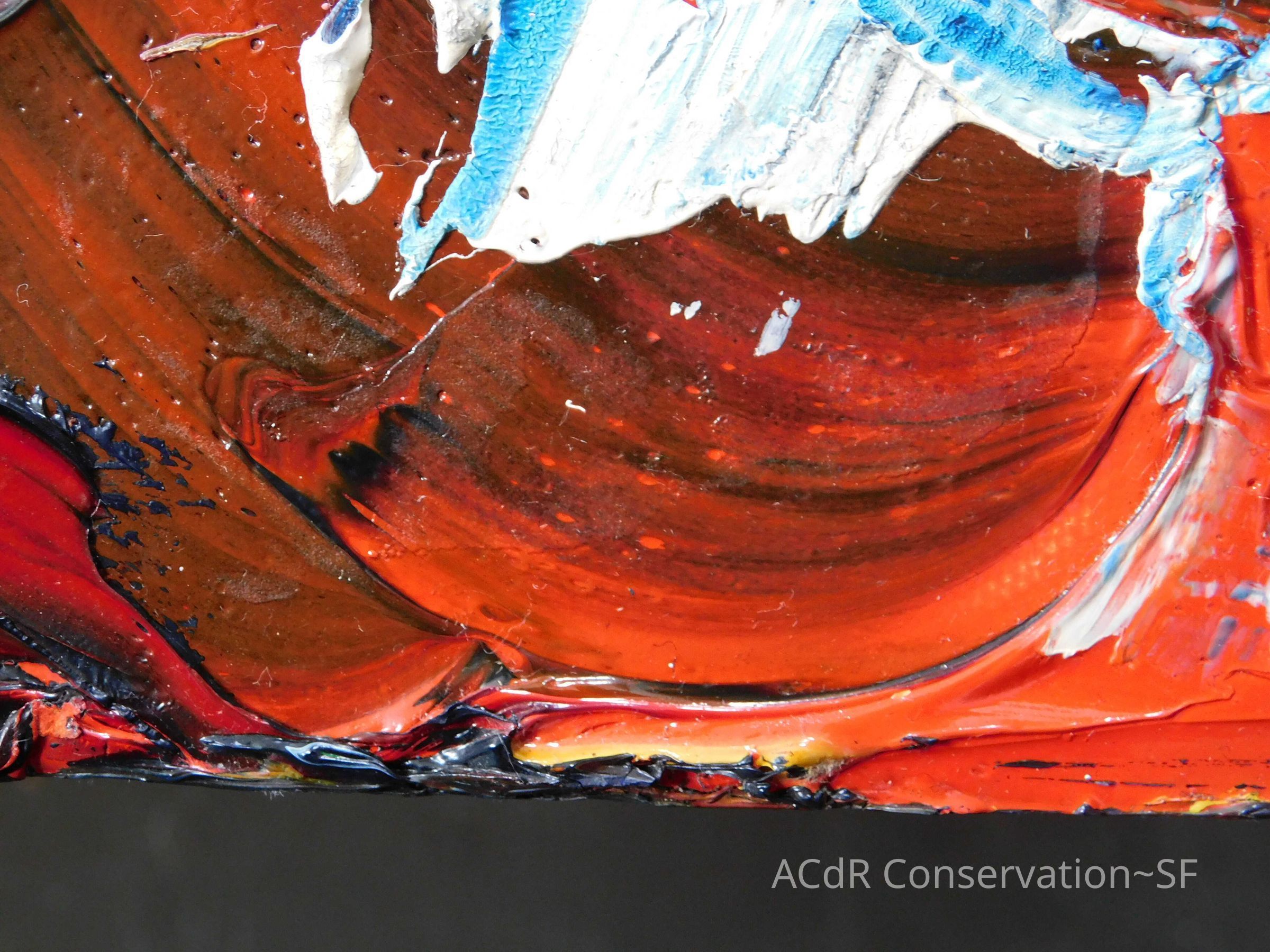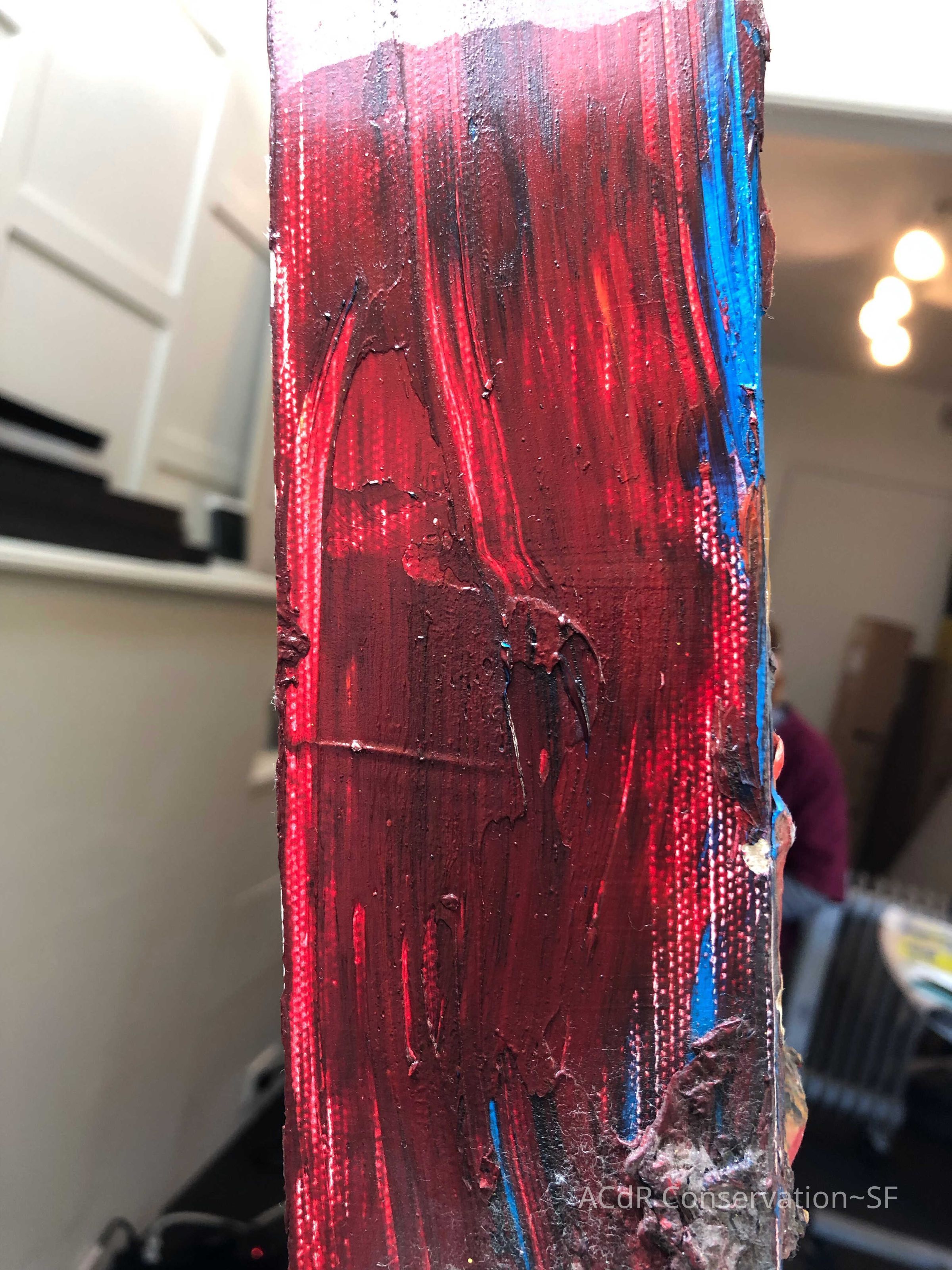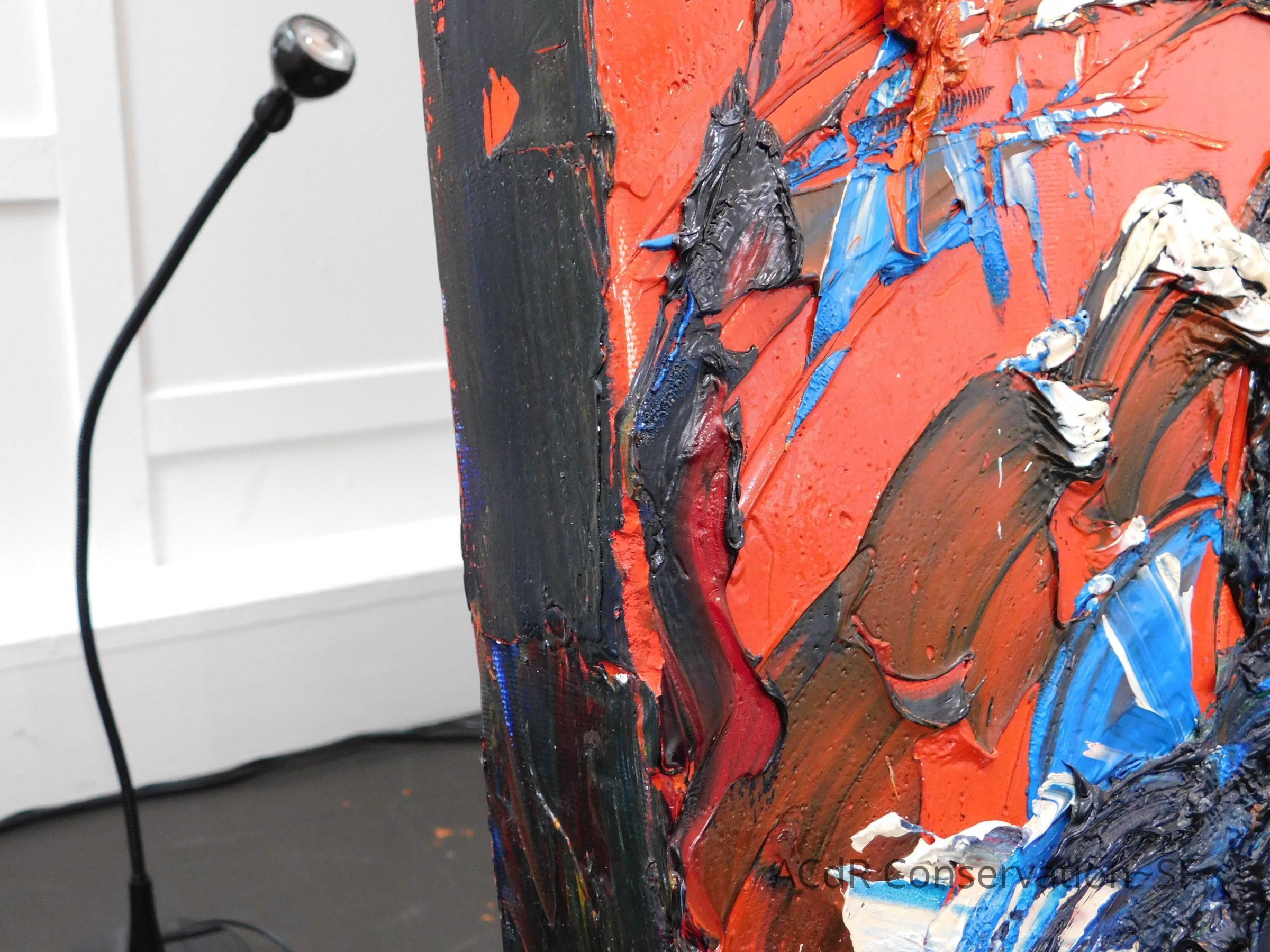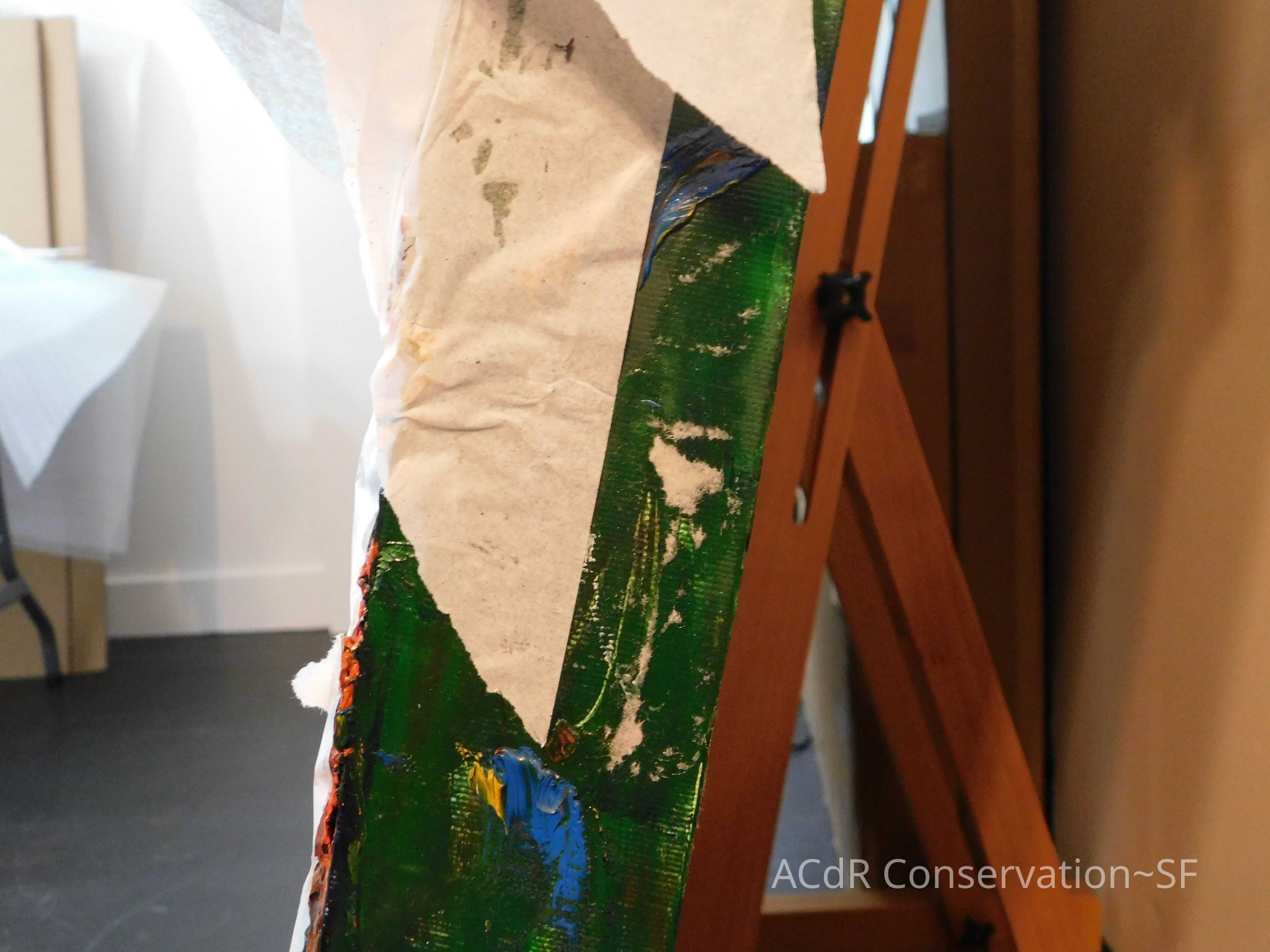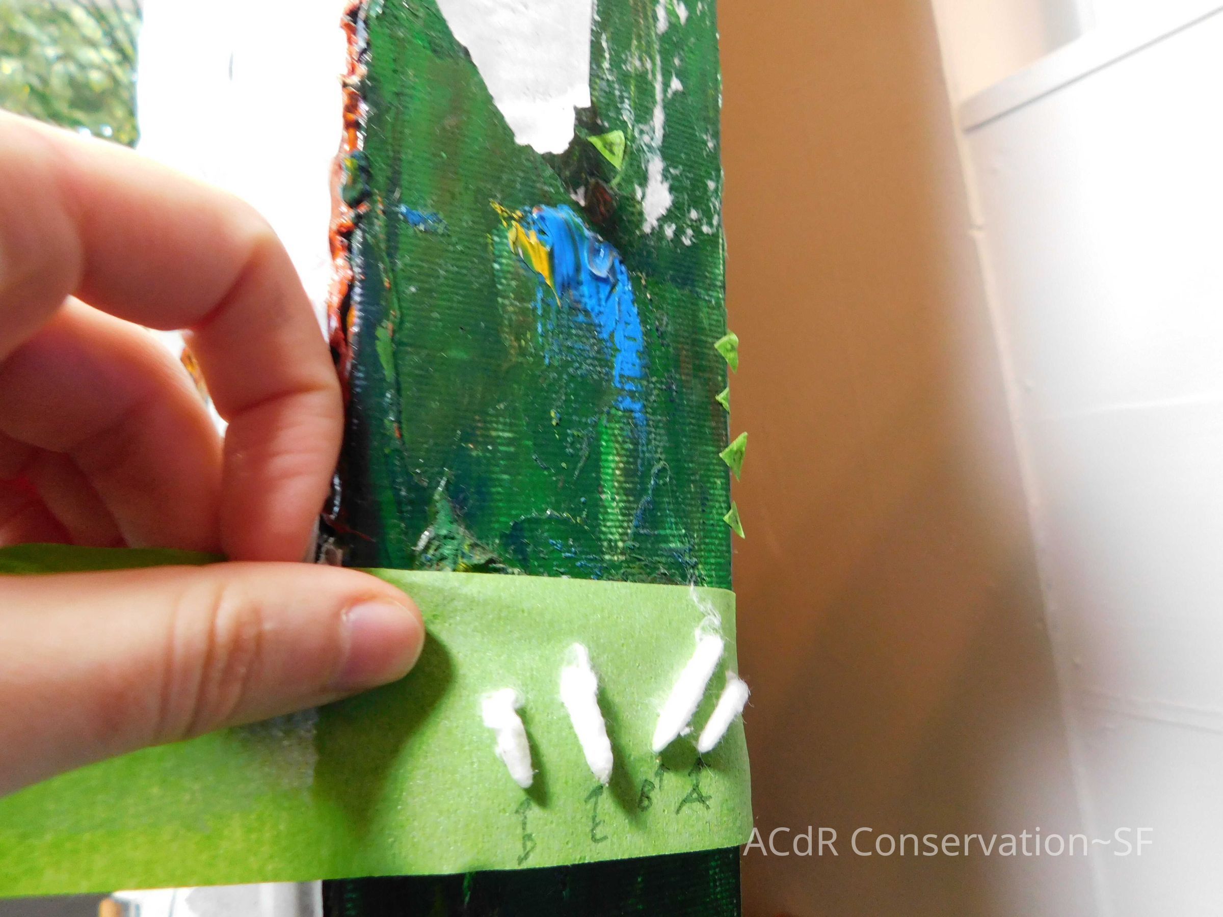 Saturated surface with D4. Cleaned with ME and then rinsed with D4 (D4 with brush/ME with brush/D4 with cotton swab). Red paint is very sensitive to ME. Red and other sensitive paints were cleaned with Velvesil Plus + 40% adjusted water (5.00 pH/6.000mS). The gel was removed with cotton swab and surface rinsed with D4. Cleaned lint and dust using cotton swabs and sponge swabs. Flipped the painting on its side and removed paper from two edges. Saturated paper with D4 and with cotton swabs with pH 5.0/6.000mS adjusted water to pull paper off. Continued cleaning painting as above. Cleaning edges with Velvesil Plus and 5.0 pH solution.