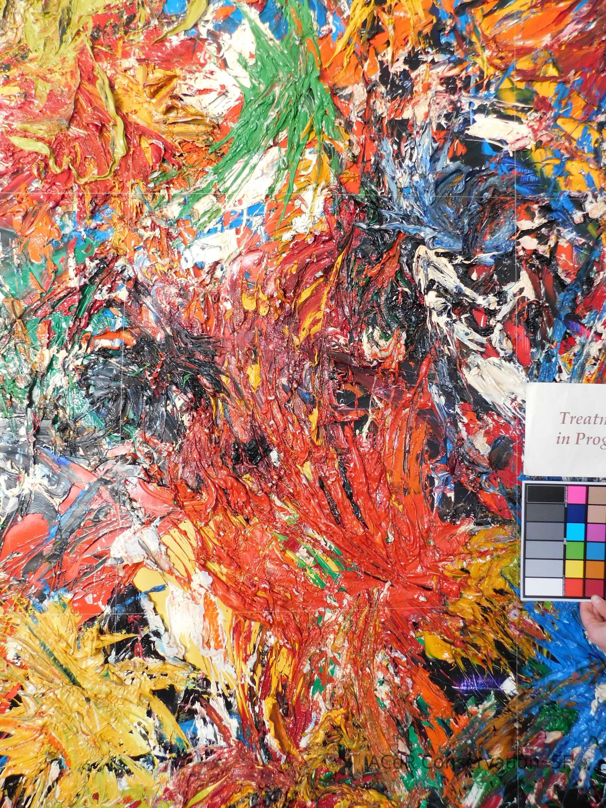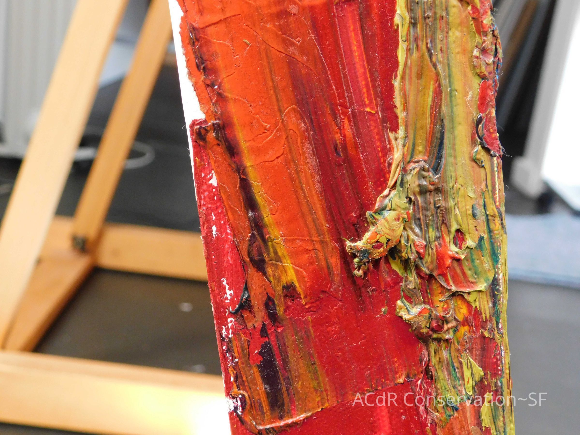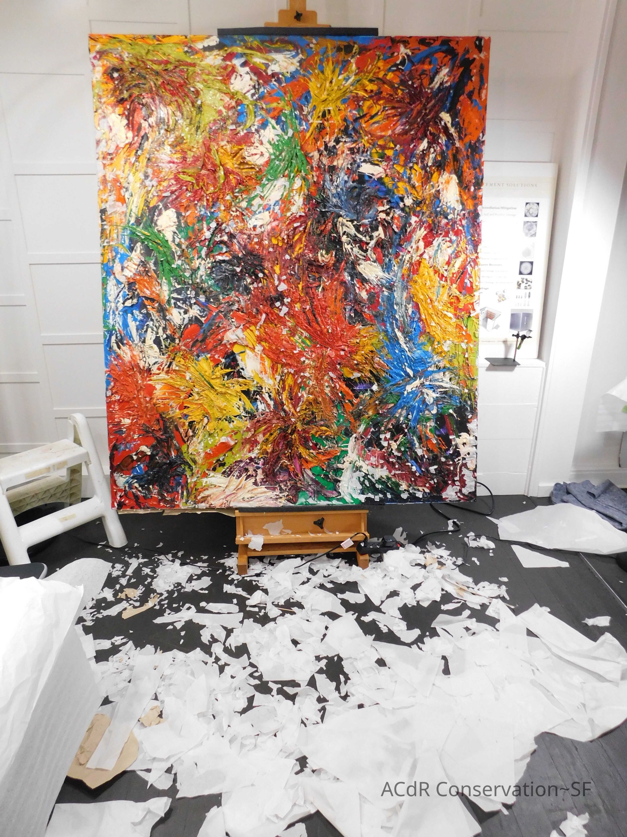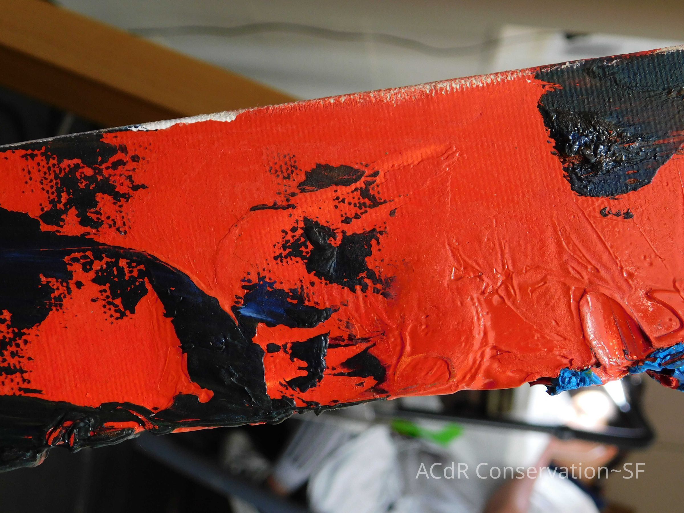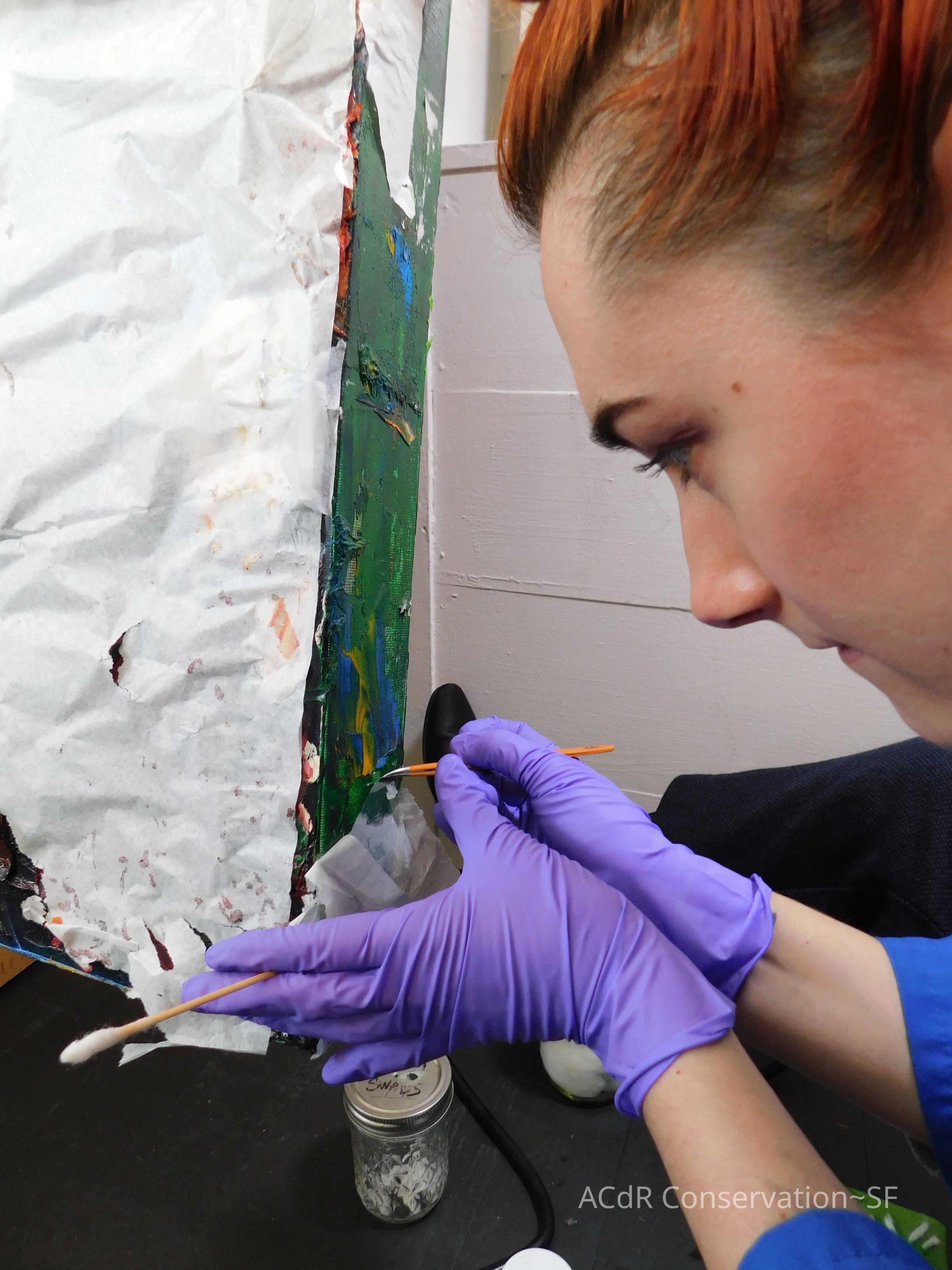Saturated surface with D4. Cleaned with ME and then rinsed with D4 (D4 with brush/ME with brush/D4 with cotton swab). Red paint is very sensitive to ME. Red and other sensitive paints were cleaned with Velvesil Plus + 40% adjusted water (5.00 pH/6.000mS). The gel was removed with cotton swab and surface rinsed with D4. Cleaned lint and dust using cotton swabs and sponge swabs. Flipped the painting on its side and removed paper from two edges. Saturated paper with D4 and with cotton swabs with pH 5.0/6.000mS adjusted water to pull paper off. Continued cleaning painting as above. Cleaning edges with Velvesil Plus and 5.0 pH solution.
