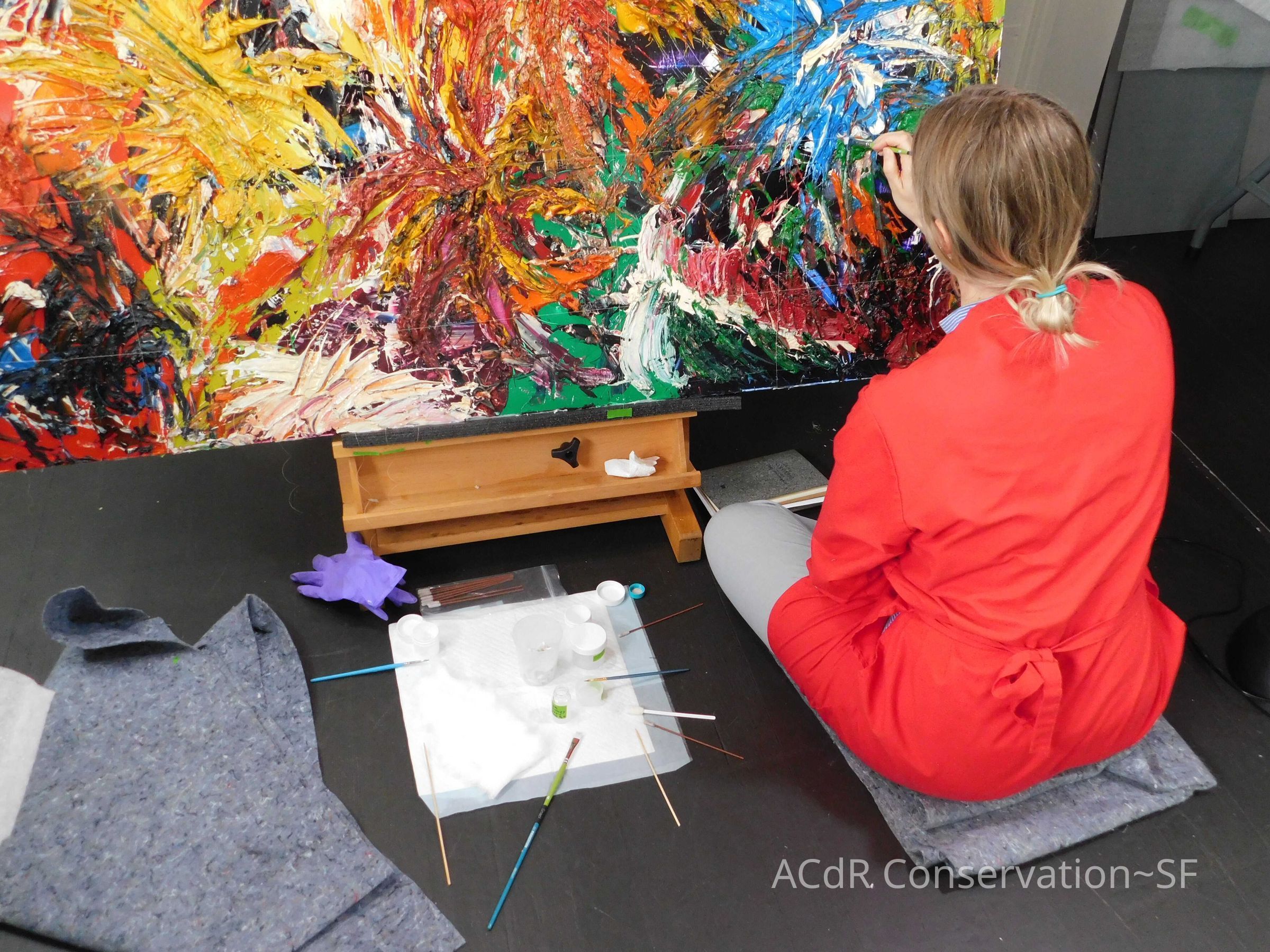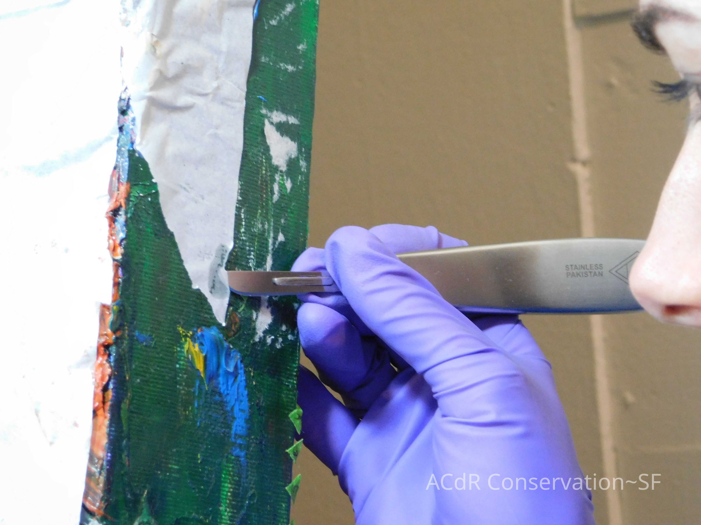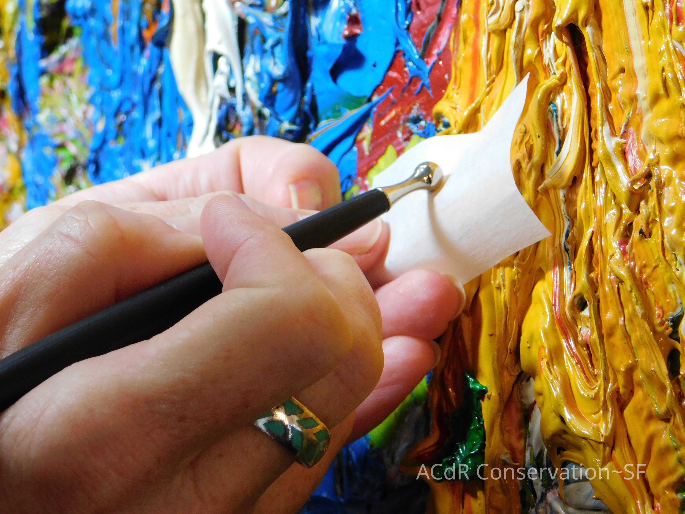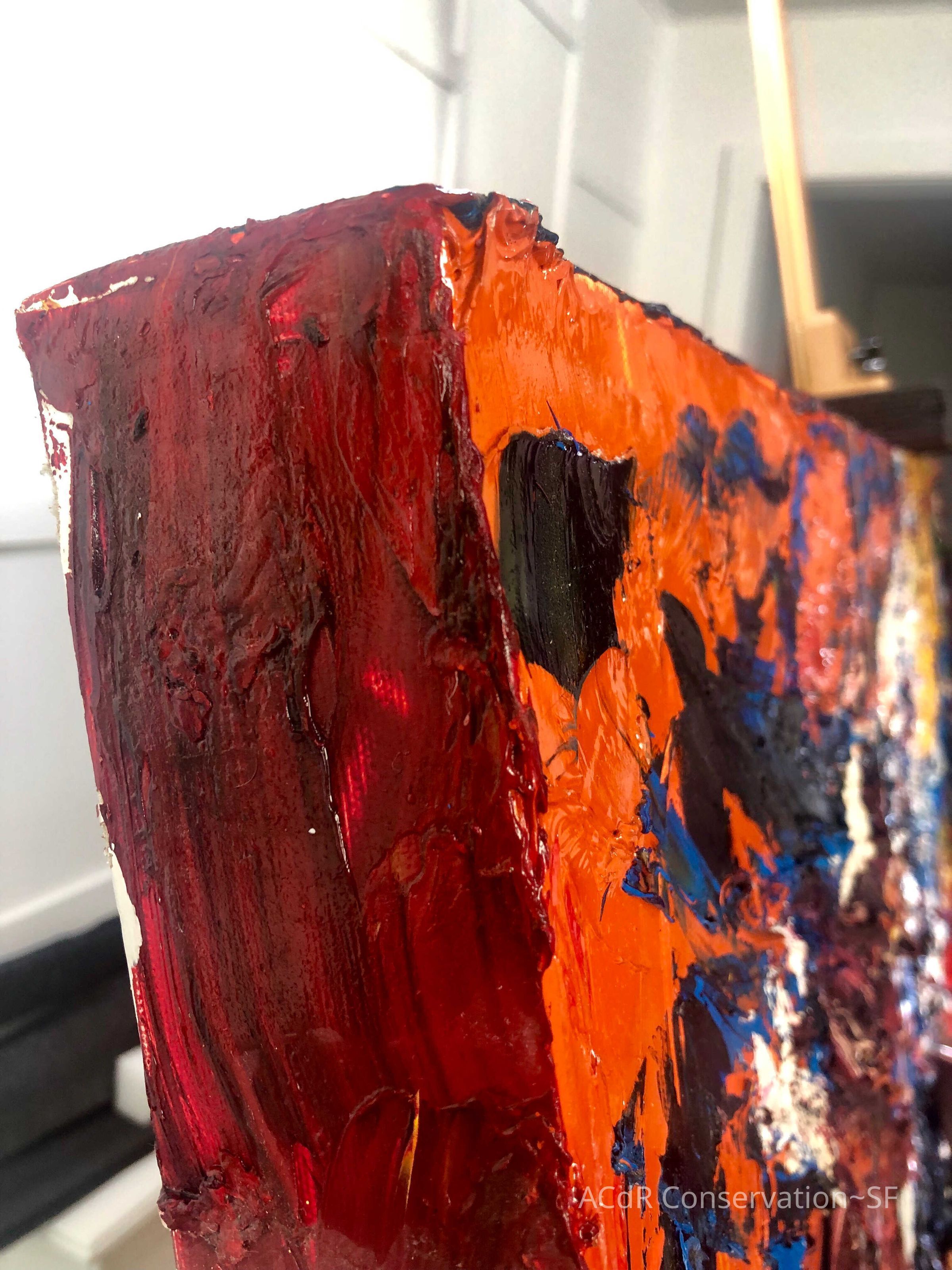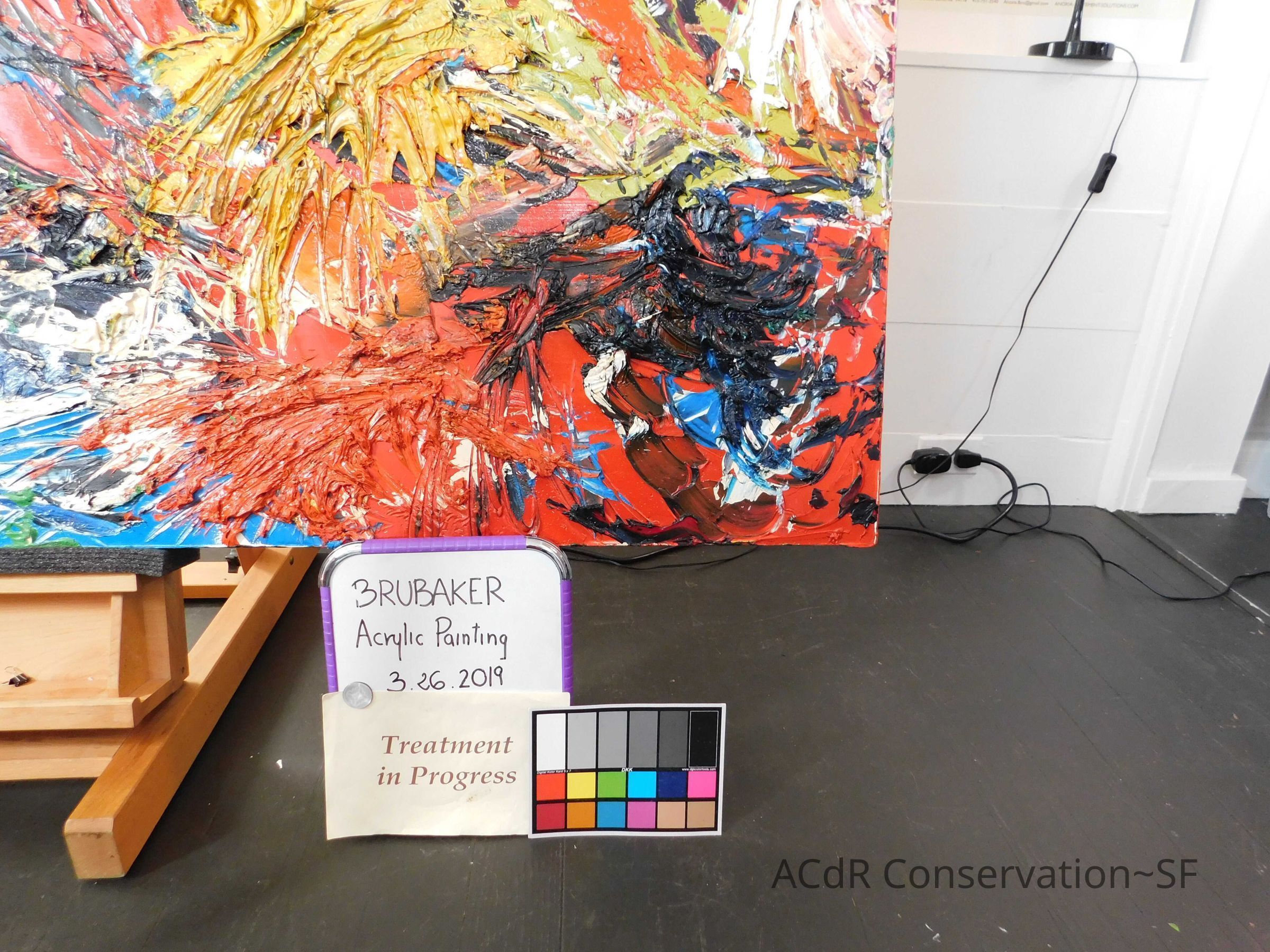 Saturated surface with D4. Cleaned with ME and then rinsed with D4 (D4 with brush/ME with brush/D4 with cotton swab). Red paint is very sensitive to ME. Red and other sensitive paints were cleaned with Velvesil Plus + 40% adjusted water (5.00 pH/6.000mS). The gel was removed with cotton swab and surface rinsed with D4. Cleaned lint and dust using cotton swabs and sponge swabs. Flipped the painting on its side and removed paper from two edges. Saturated paper with D4 and with cotton swabs with pH 5.0/6.000mS adjusted water to pull paper off. Continued cleaning painting as above. Cleaning edges with Velvesil Plus and 5.0 pH solution.