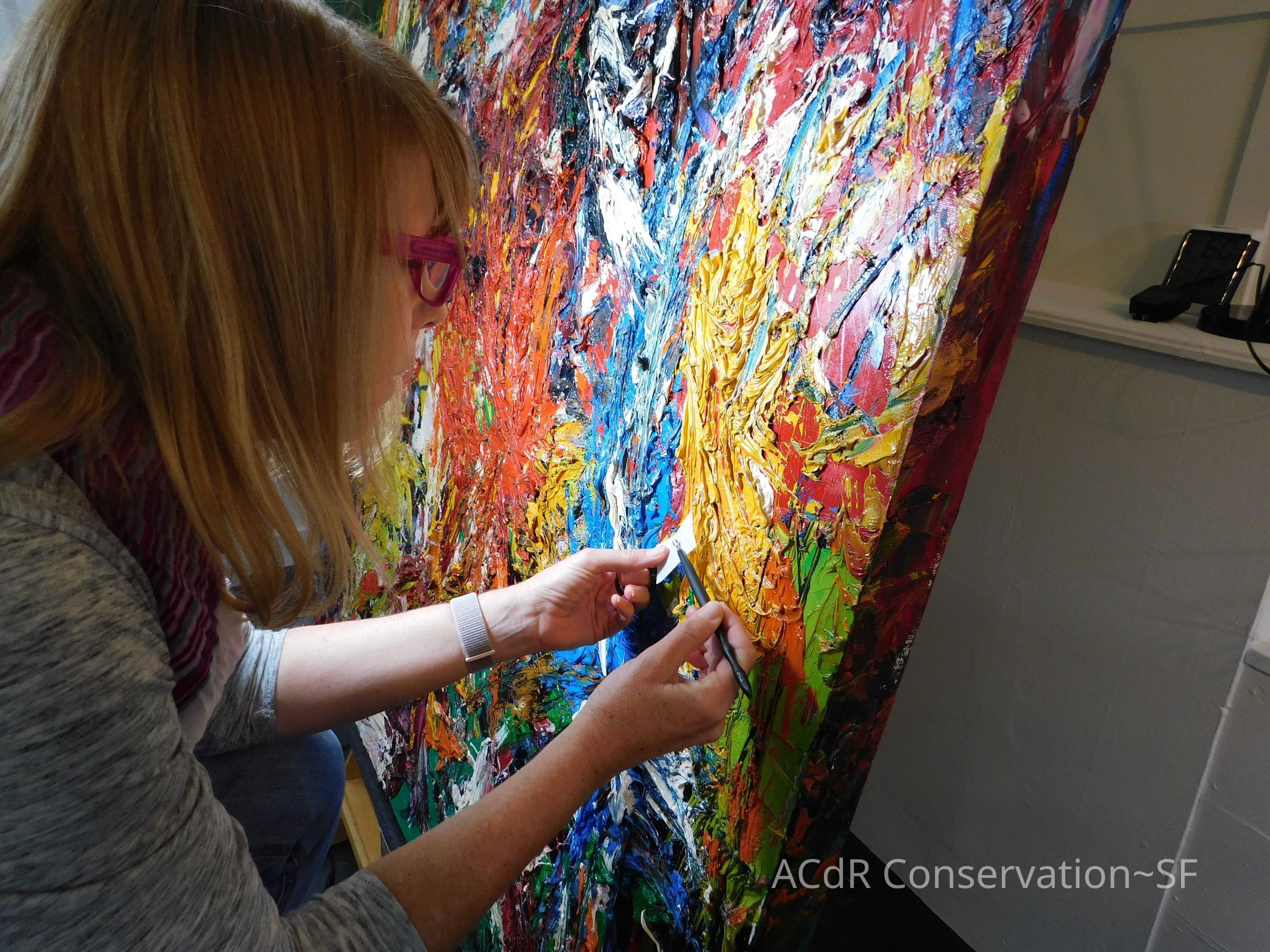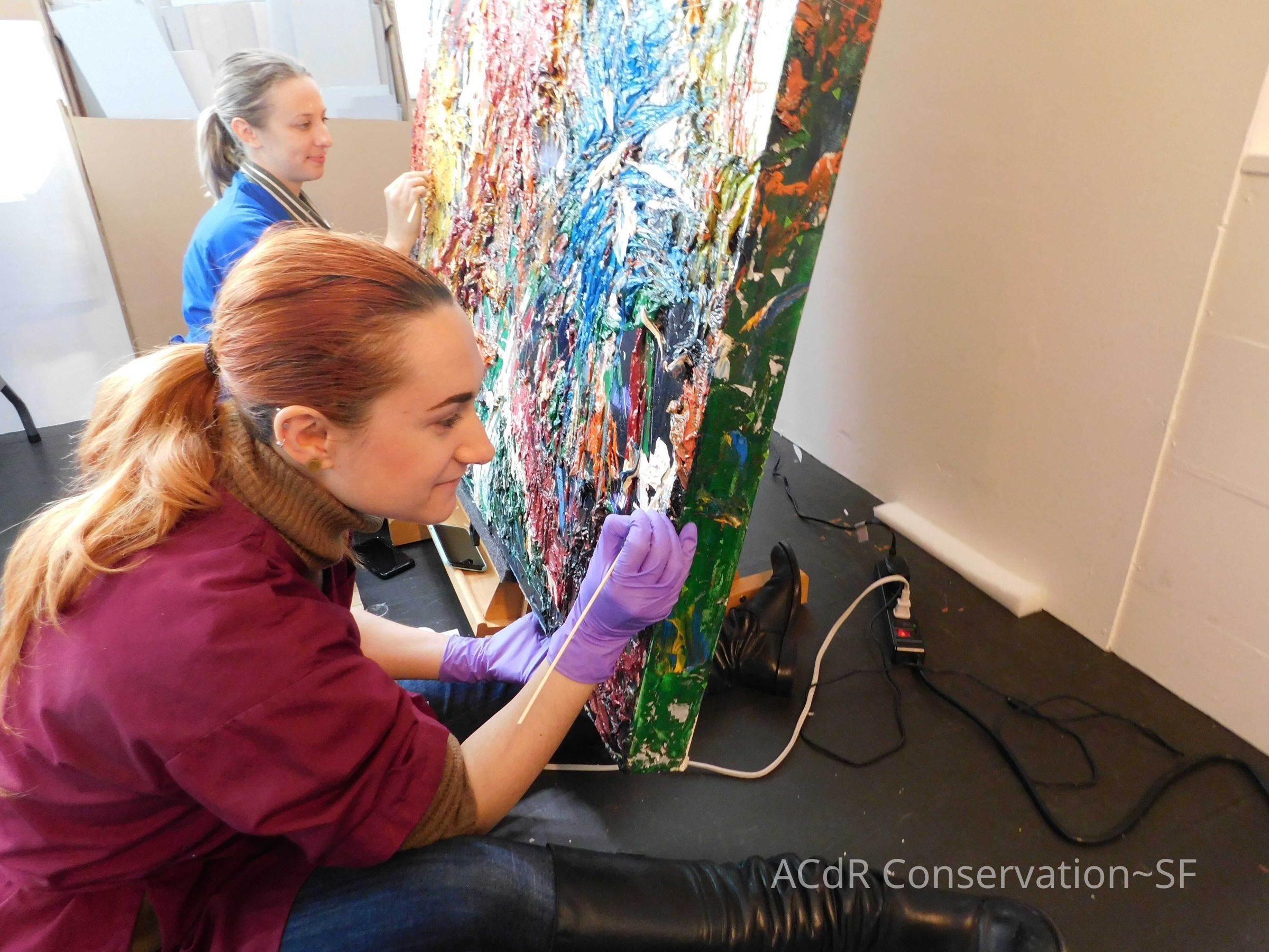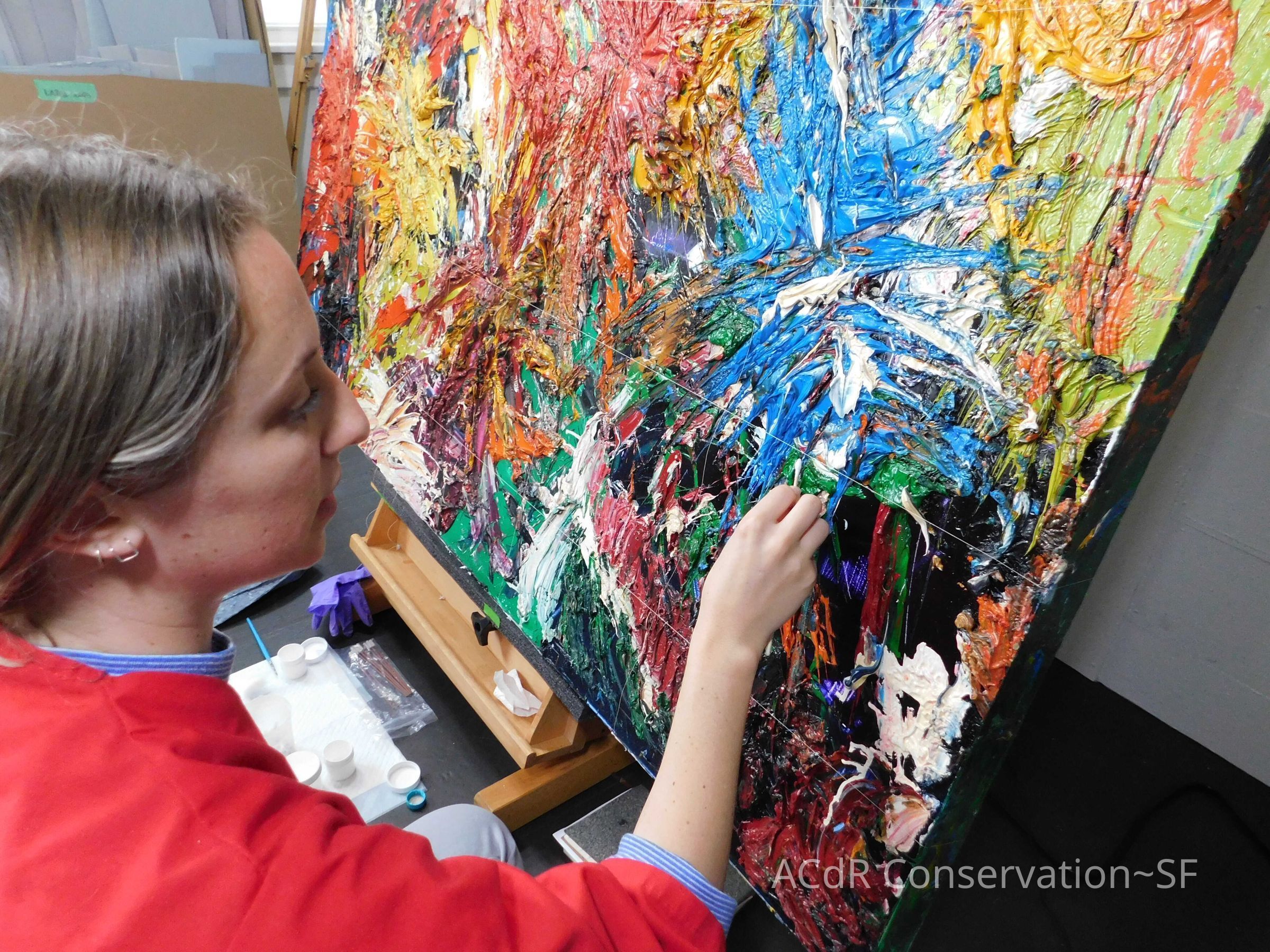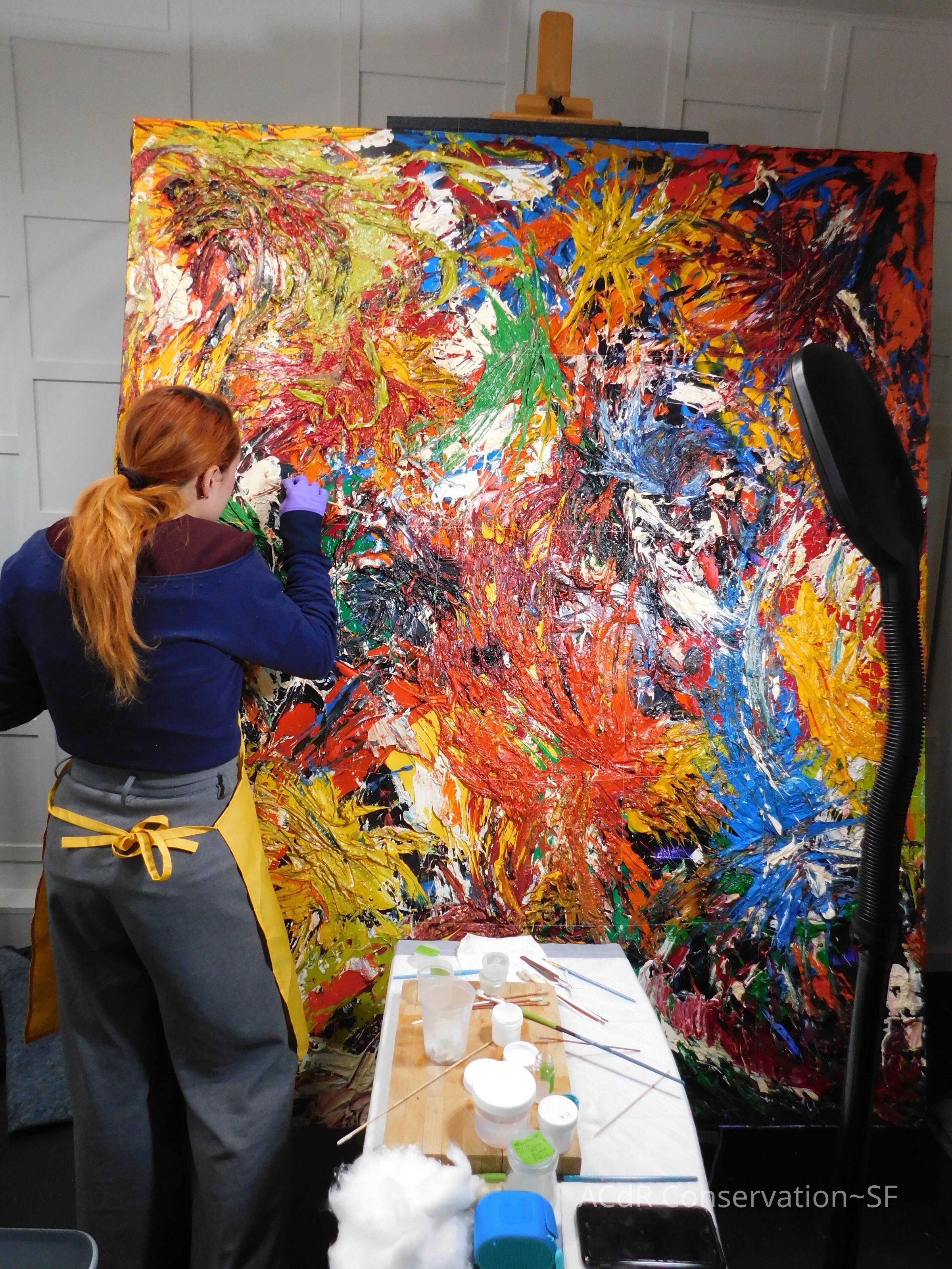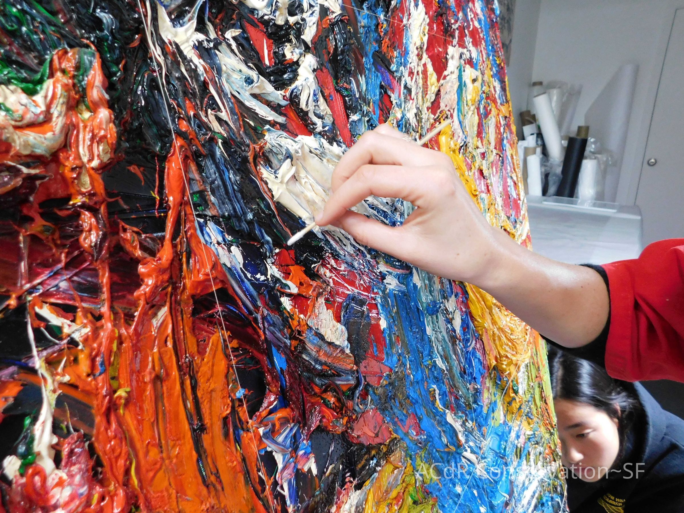 Saturated surface with D4. Cleaned with ME and then rinsed with D4 (D4 with brush/ME with brush/D4 with cotton swab). Red paint is very sensitive to ME. Red and other sensitive paints were cleaned with Velvesil Plus + 40% adjusted water (5.00 pH/6.000mS). The gel was removed with cotton swab and surface rinsed with D4. Cleaned lint and dust using cotton swabs and sponge swabs. Flipped the painting on its side and removed paper from two edges. Saturated paper with D4 and with cotton swabs with pH 5.0/6.000mS adjusted water to pull paper off. Continued cleaning painting as above. Cleaning edges with Velvesil Plus and 5.0 pH solution.