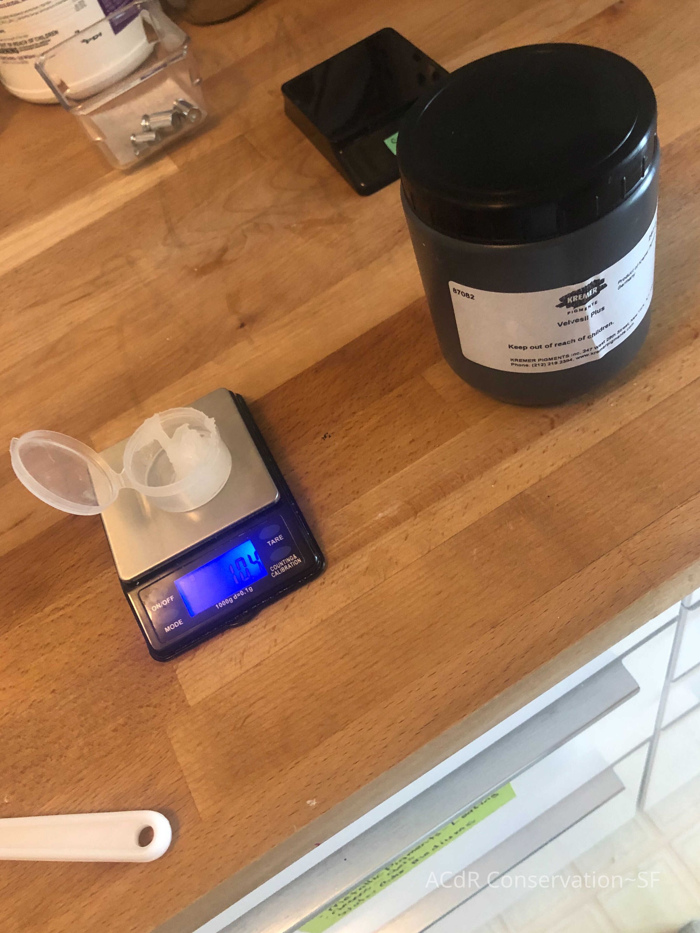 Testing of D4 cyclomethicone to remove paper fibers o bottom left and right turn-over edges. Continued testing of D4 and pH-adjusted waters to remove paper fibers. Determined the need for two phases of treatment: FIRST removing paper and as much embedded fiber as possible via following method. (1) saturate with D4 on brush; (2) apply pH 5.0 ms6000 water with brush through tissue; (3) gently remove with tweezers; (4) remove any excess fibers with small sponge swab dampened with adjusted water. SECOND cleaning dirt and grime and any remaining paper fibers. Testing valves in and water solutions at 10% and 20% w/v. Continued testing with Velvesil, determined it is not best material for removing paper fiber remnants, may use for cleaning. Best removal method is pH-adjusted water on a sponge swab, pH 5.0 used to remove tissue paper. Used small scissors to cut away paper not adhered to paint layer. Continued removal of paper.
