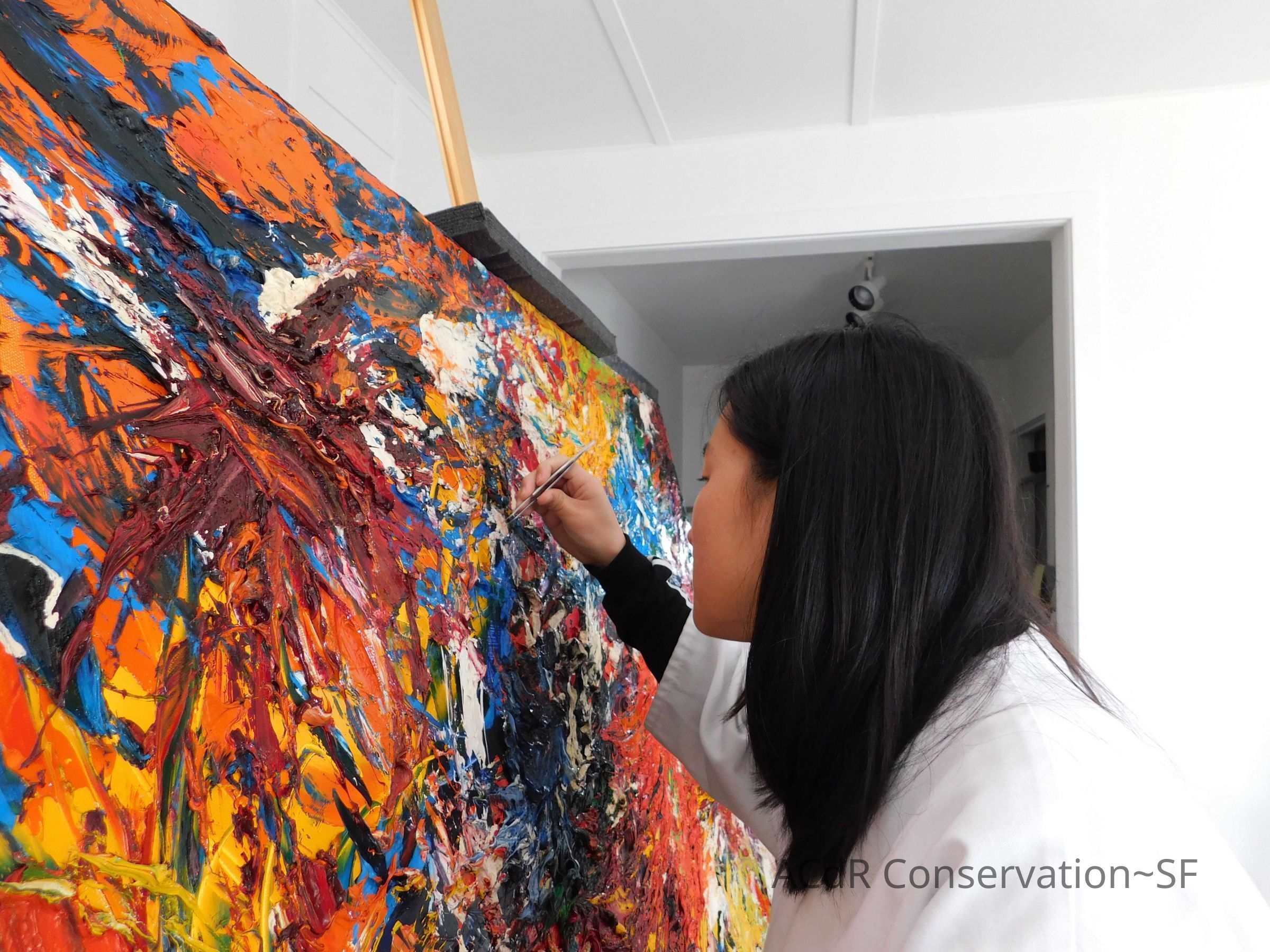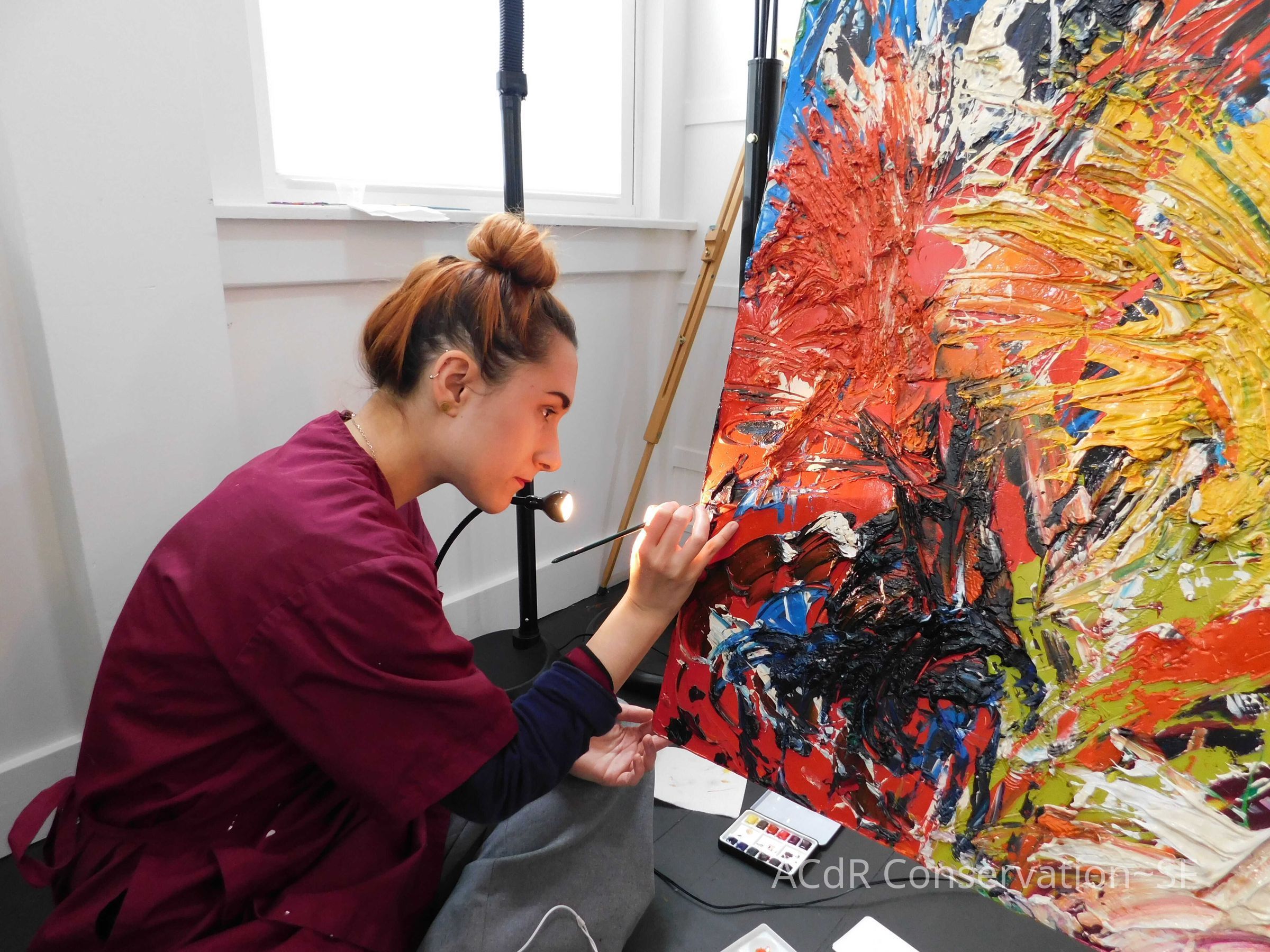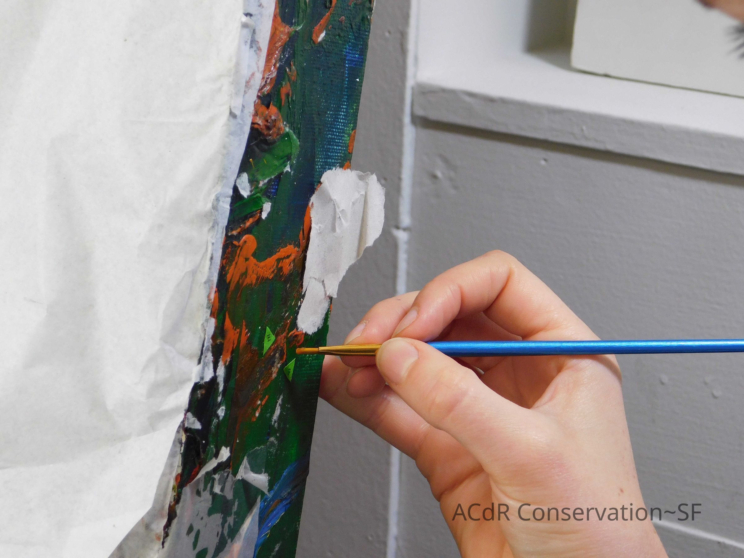 Retouching of paper fibers with QOR color. Removed some lint with tweezers. Filled few small losses with Flugger acrylic stucco.