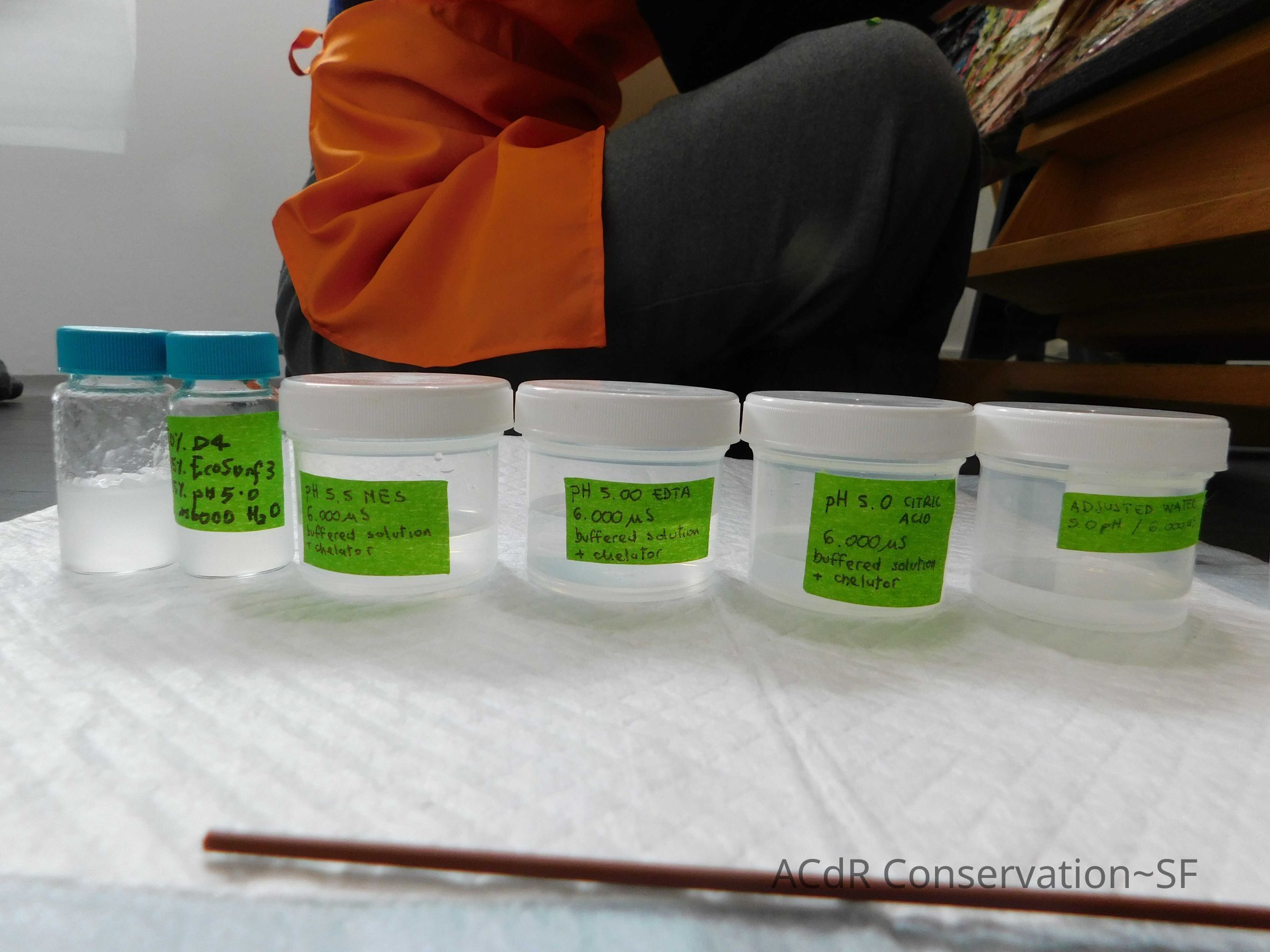 Cleaning test. Tested solutions: 1. pH 5.00/6.000 mS adjusted water 2. pH 5.00/6.000 mS adjusted water + citric acid (chelator) 3. pH5.00/6.000 mS adusted water + EDTA (chelator) 4. pH 5.00/6.000 mS adjusted water + MES (chelator) 5. Microemulsion w/o_H (50% D4: 25% ecosurf EH3: 25% pH5.00/6.000ms adjusted water). Test #5 worked best in removing dust and embedded lint.