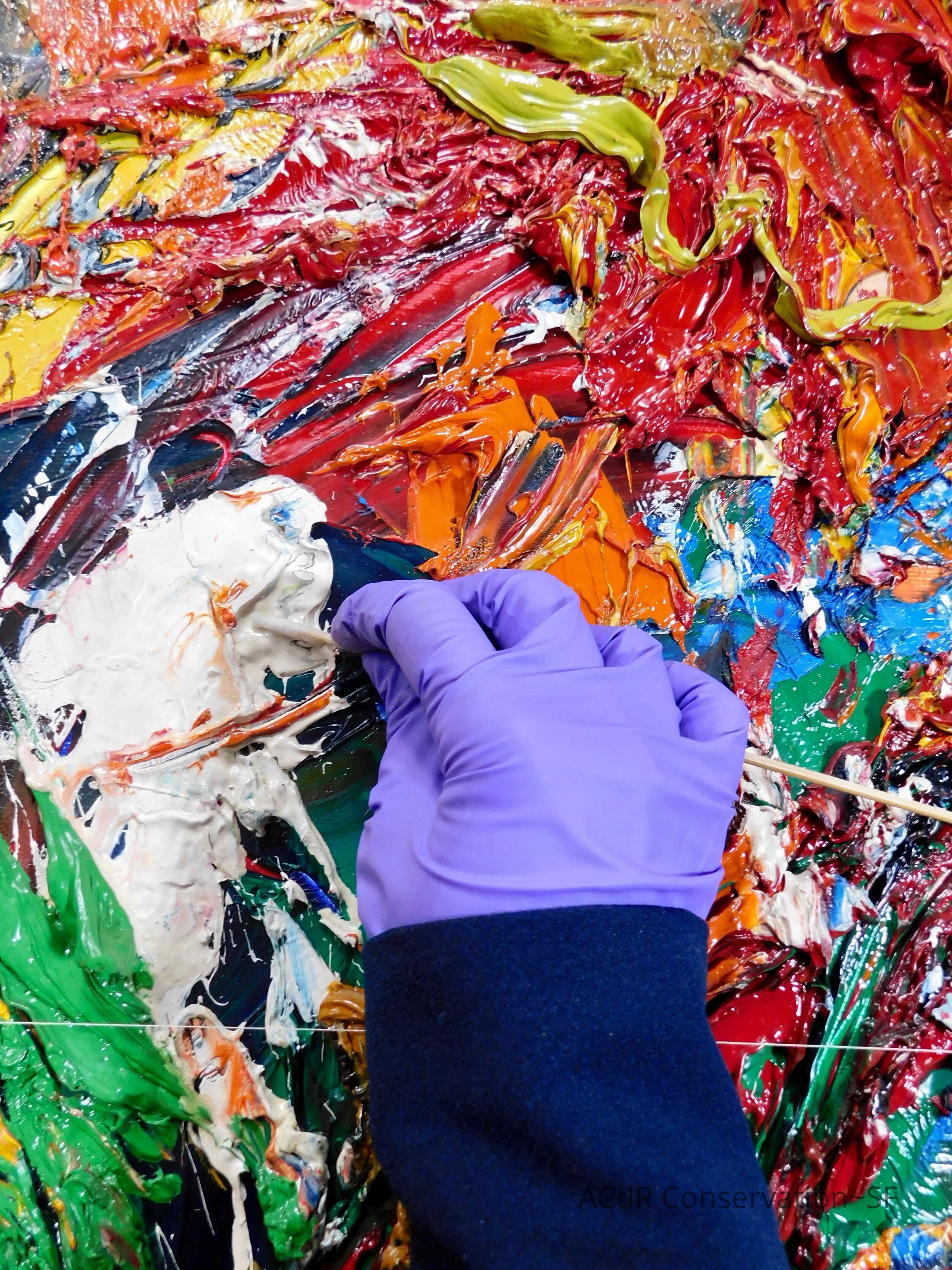 Varnished small abrasion with 10% Regalrez 1094 in Shellsol D38. —Did not work— Removed and varnished again with 20% Regalrez 1094 in Shellsol D38. Removed the 20% Regalrez varnish and revarnished the area with Gambling Painting Medium Larapol 81 A. Retouched with QOR color.