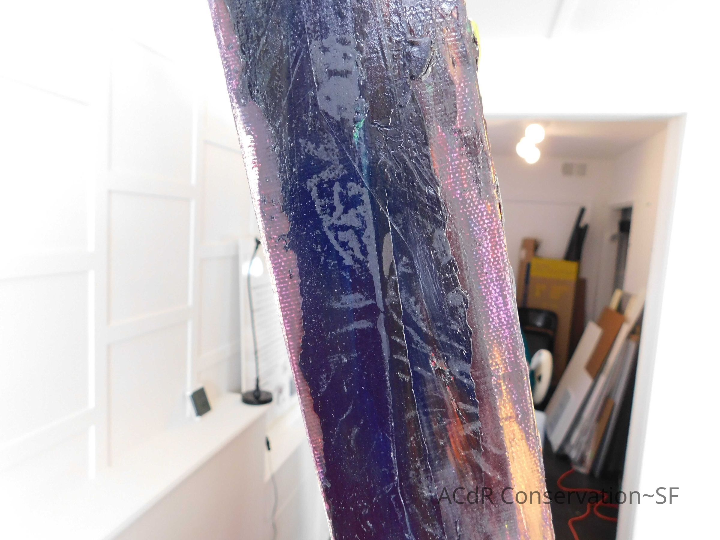 Trimmed threads along four corners and adhered canvas to stretcher with Jade 711. Retouched fillings with QOR watercolors and Larapol. Tried to reshape flat peaks with heating spatula and heating gun, but did not work.