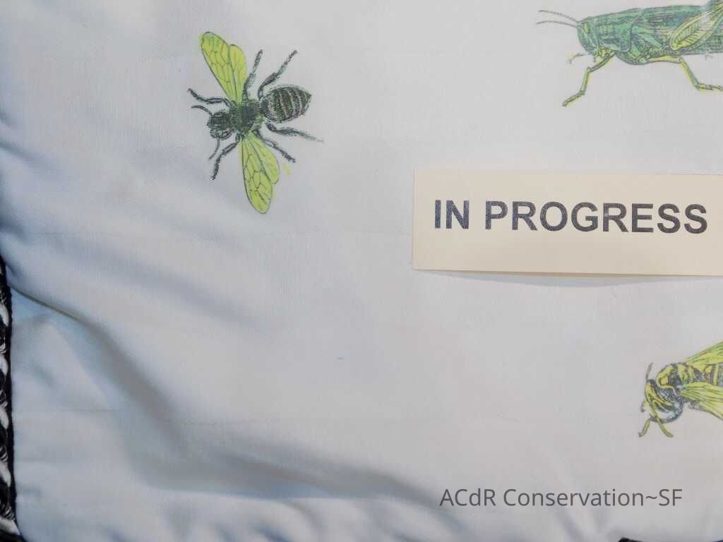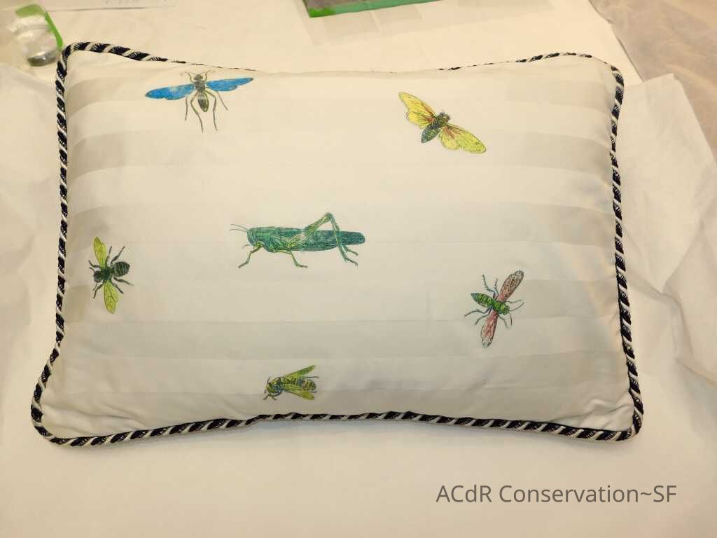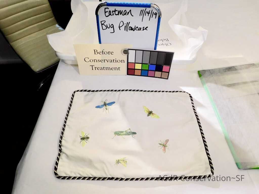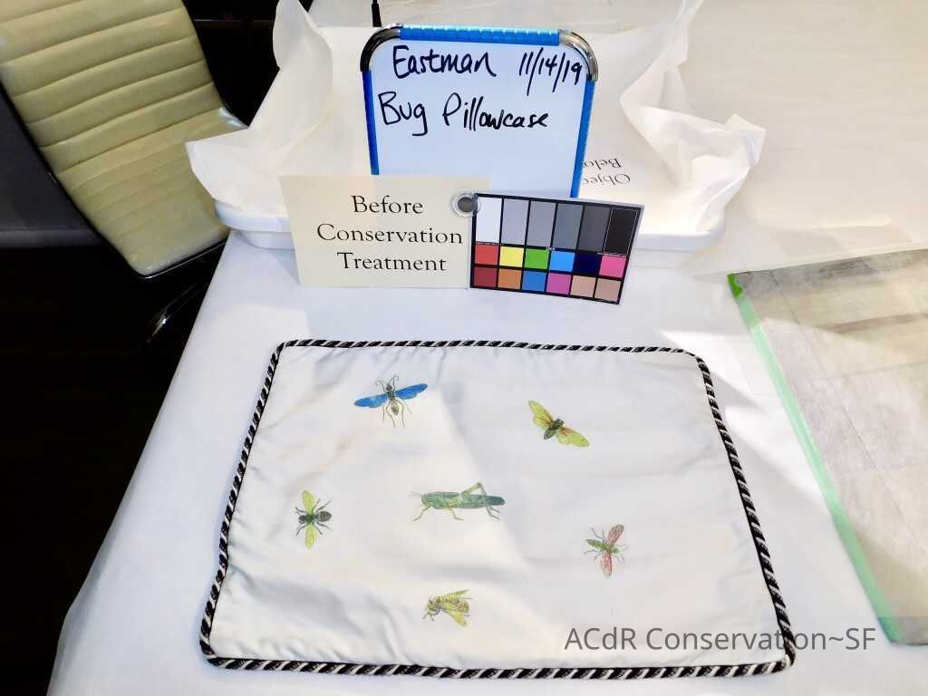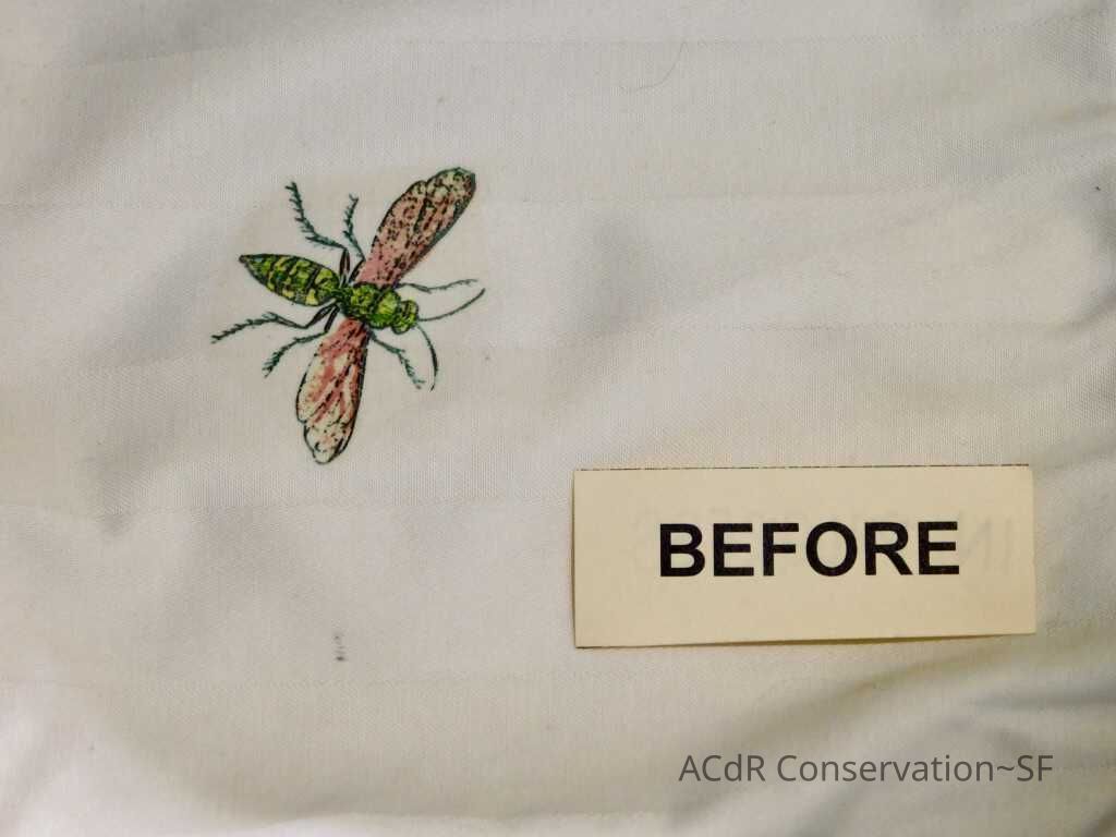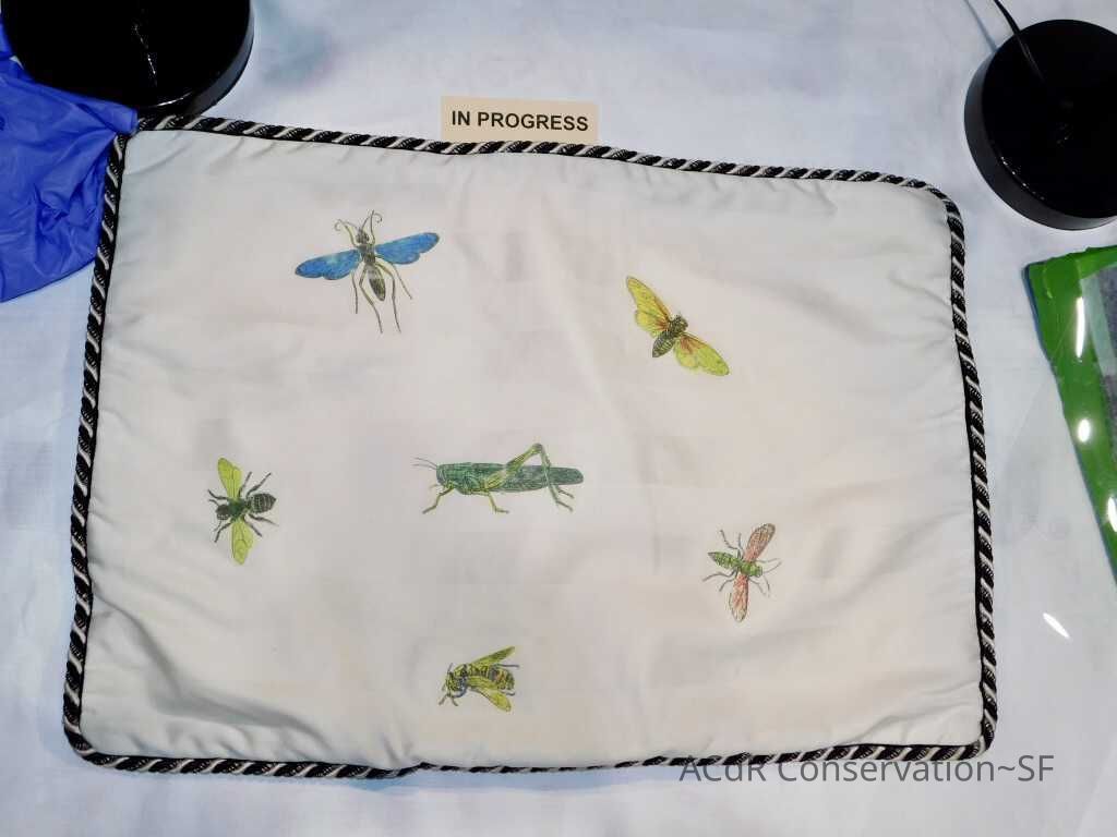 Insect Pillow Textile PDF Viewer Close × Profile Viewer Close × ConditionOverall ConditionVery GoodCondition AssessmentStainsFoxingDate ExaminedApr 16, 2019Examined ByAbby WangConservationConservation PurposeCleaningTreatmentAcute TreatmentHepa-VacuumDate(s)Nov 14, 2019Treatment NotesVacuumedAcute TreatmentWet-CleanDate(s)Nov 14, 2019Treatment NotesSpot cleaning using suction platten. Bleach gel + 1:1 Isopropyl alcohol and distilled water + Cyclomethicone. Applied Cyclomethicone over bug embroidery