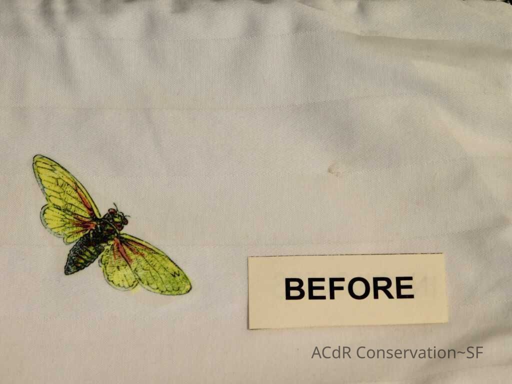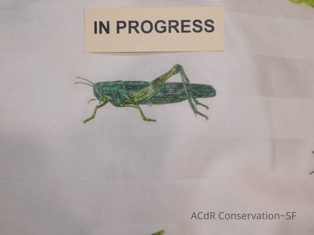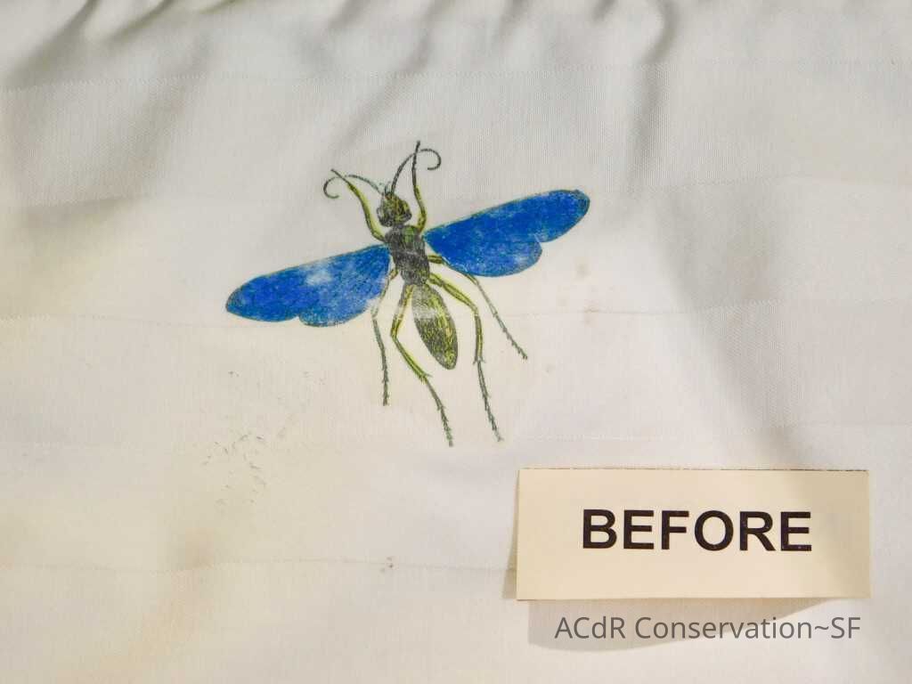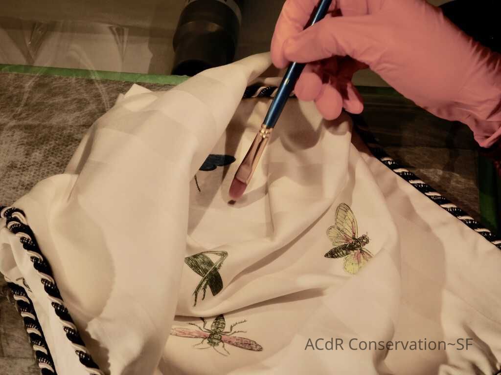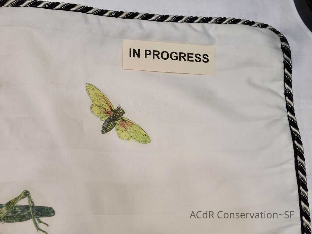 Insect Pillow Textile PDF Viewer Close × Profile Viewer Close × ConditionOverall ConditionVery GoodCondition AssessmentStainsFoxingDate ExaminedApr 16, 2019Examined ByAbby WangConservationConservation PurposeCleaningTreatmentAcute TreatmentHepa-VacuumDate(s)Nov 14, 2019Treatment NotesVacuumedAcute TreatmentWet-CleanDate(s)Nov 14, 2019Treatment NotesSpot cleaning using suction platten. Bleach gel + 1:1 Isopropyl alcohol and distilled water + Cyclomethicone. Applied Cyclomethicone over bug embroidery