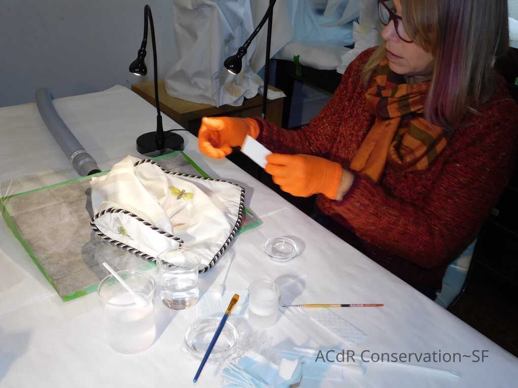 Project Gallery Go back Insect Pillow Textile PDF Viewer Close × Profile Viewer Close × ConditionOverall ConditionVery GoodCondition AssessmentStainsFoxingDate ExaminedApr 16, 2019Examined ByAbby WangConservationConservation PurposeCleaningTreatmentAcute TreatmentHepa-VacuumDate(s)Nov 14, 2019Treatment NotesVacuumedAcute TreatmentWet-CleanDate(s)Nov 14, 2019Treatment NotesSpot cleaning using suction platten. Bleach gel + 1:1 Isopropyl alcohol and distilled water + Cyclomethicone. Applied Cyclomethicone over bug embroidery
