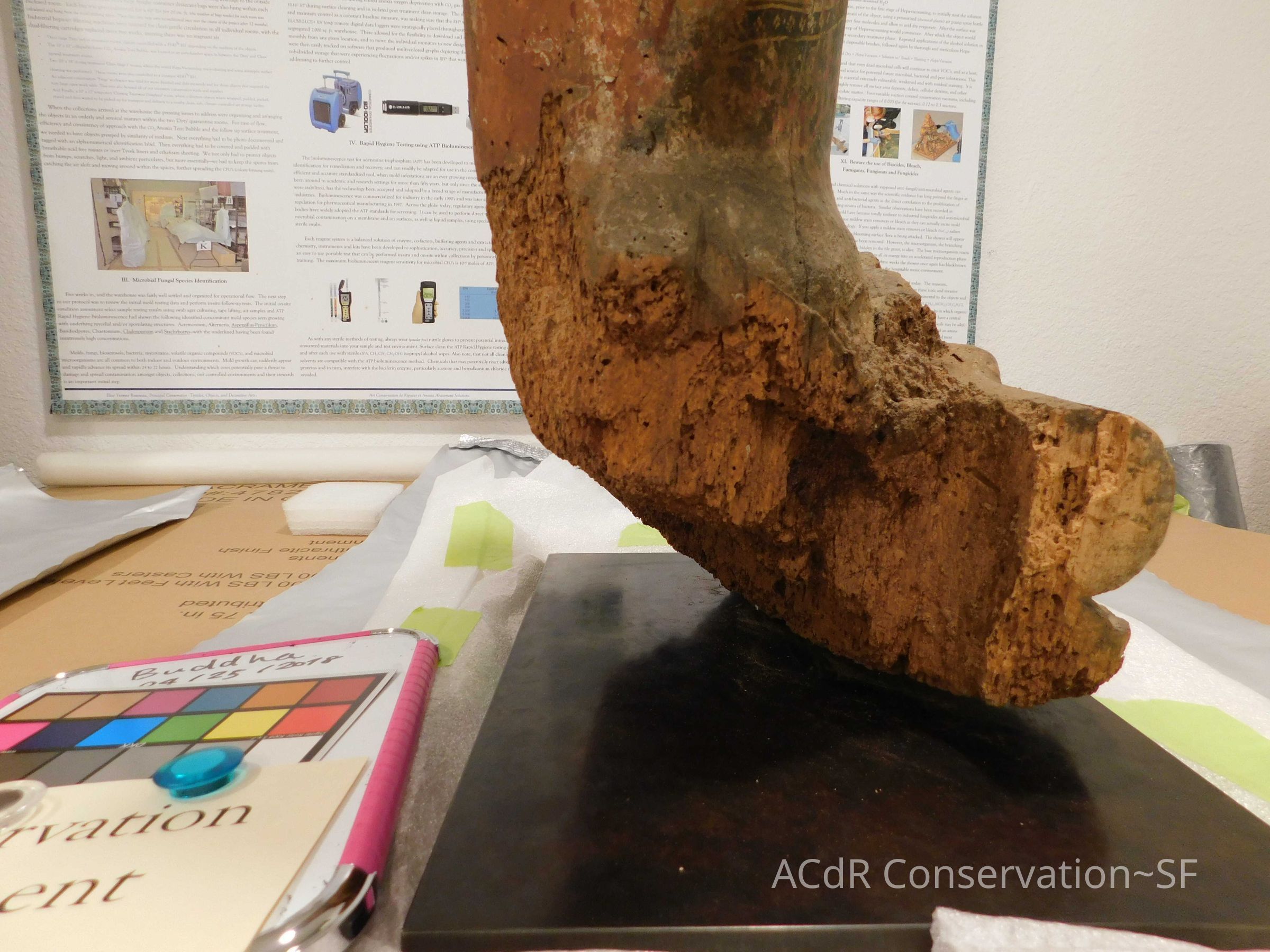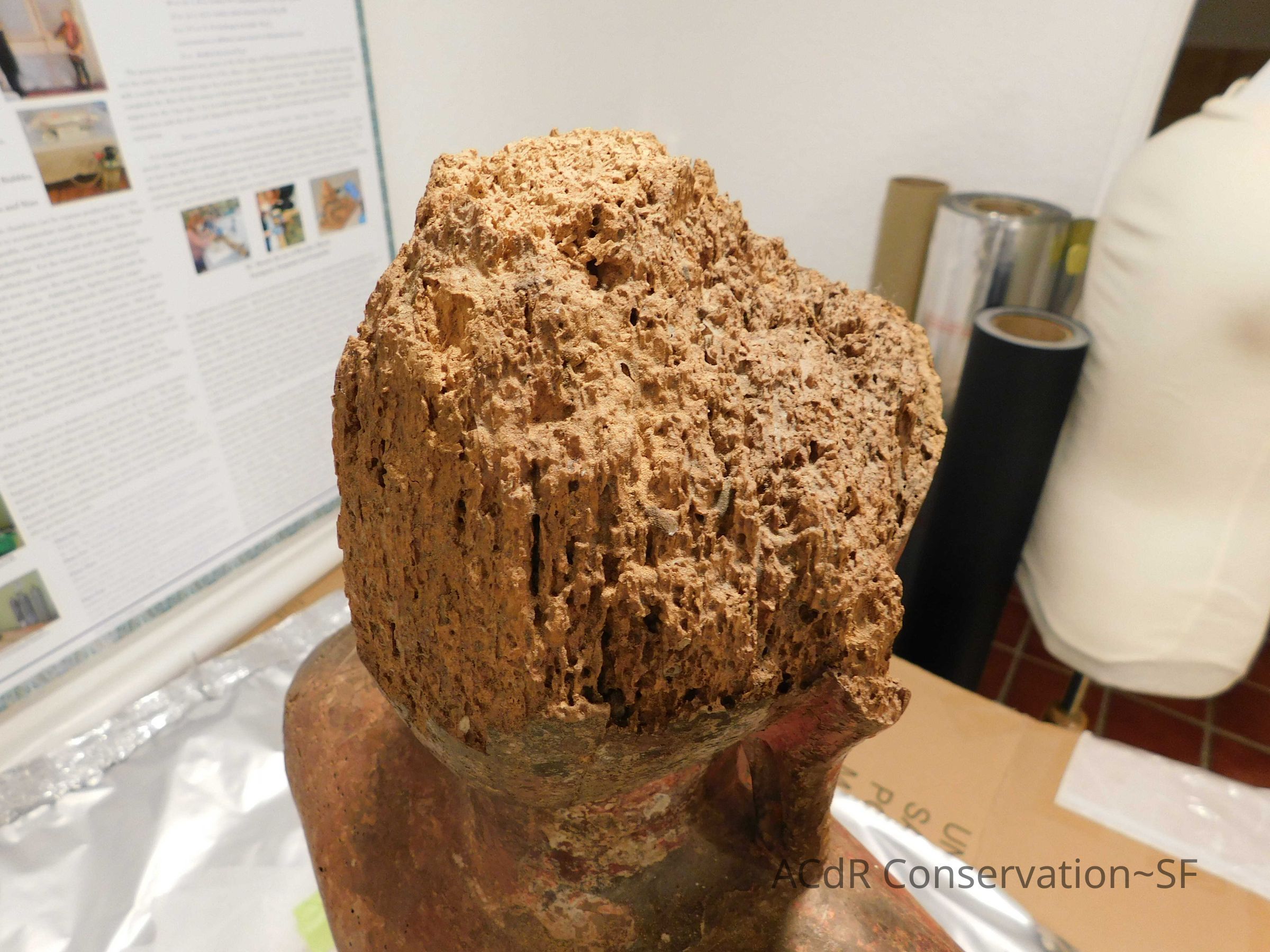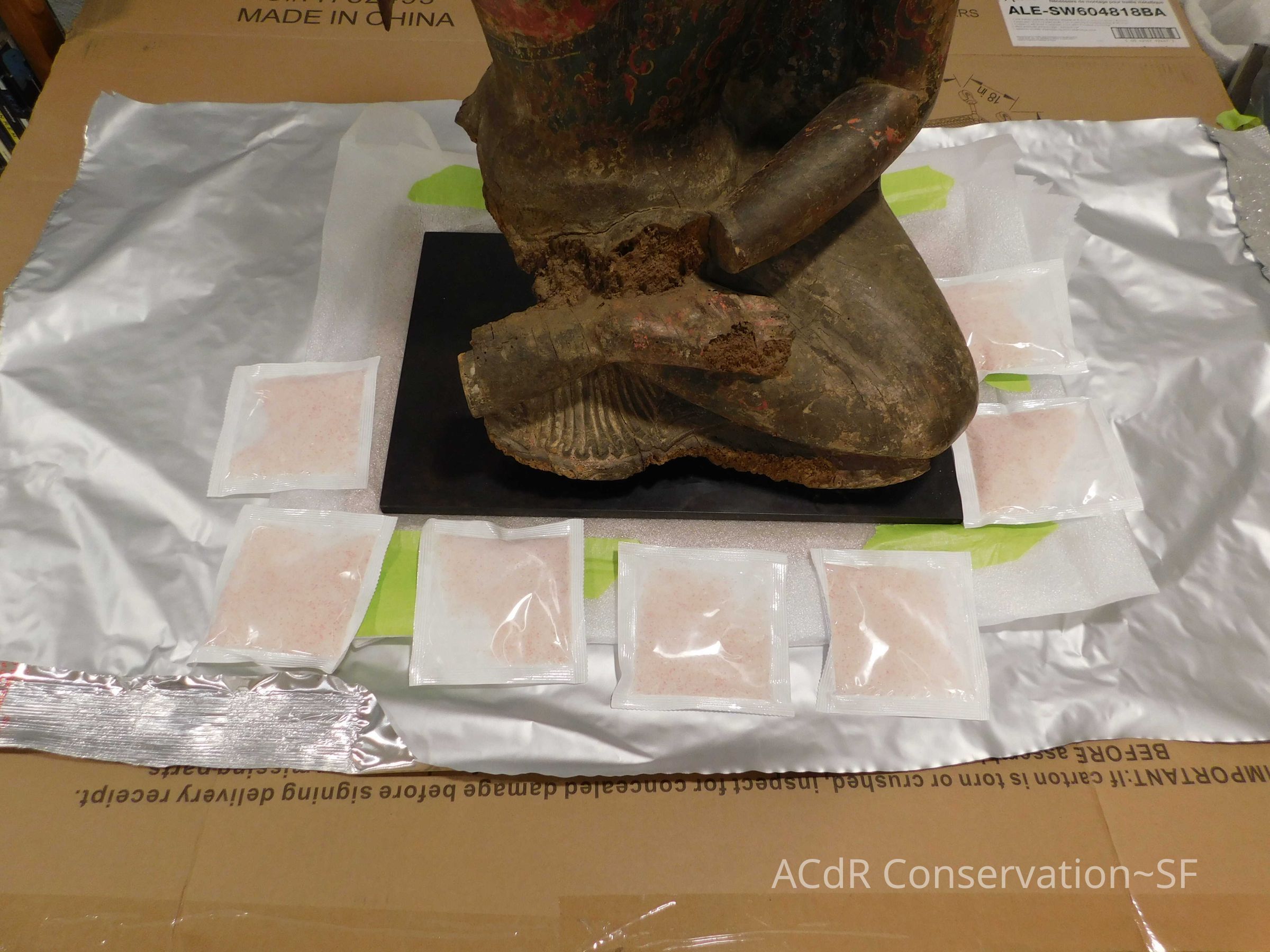 Vacuum, spray/sponge alcohol. Squeeze out excess with Uline wiper. Dab sculpture in delicate areas with sponge, okay to wipe in stable areas