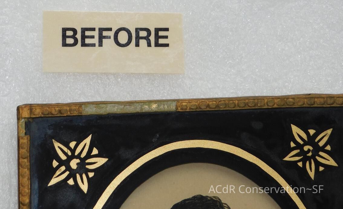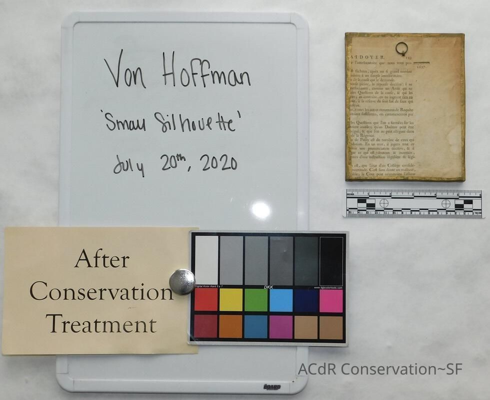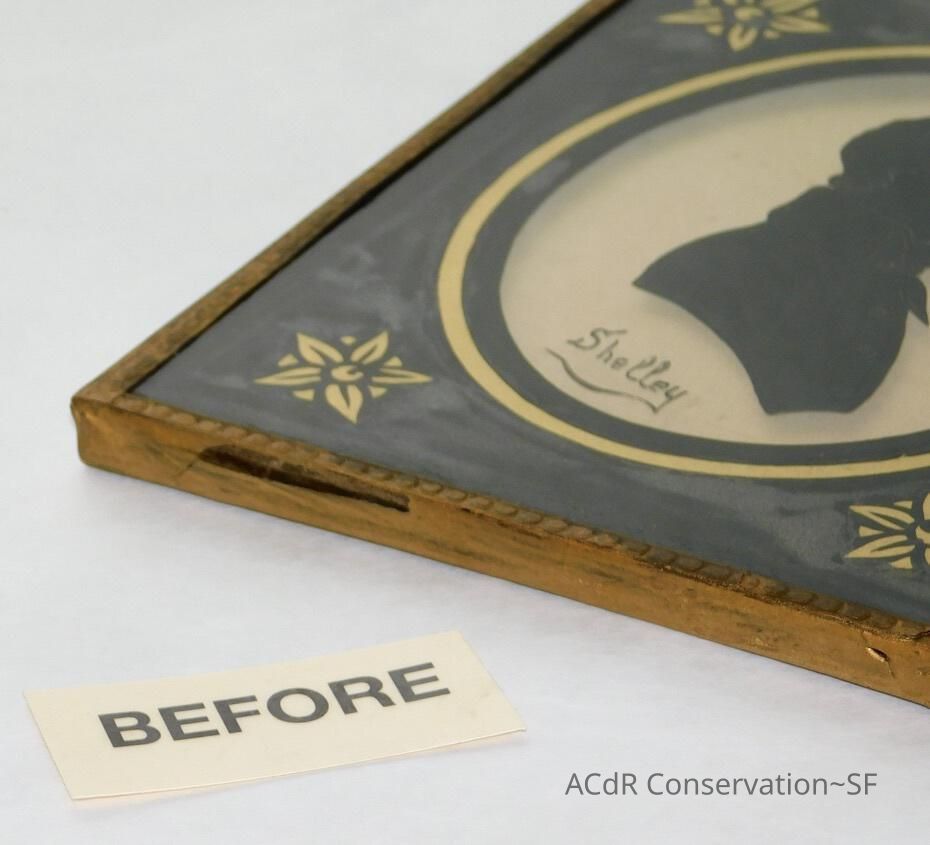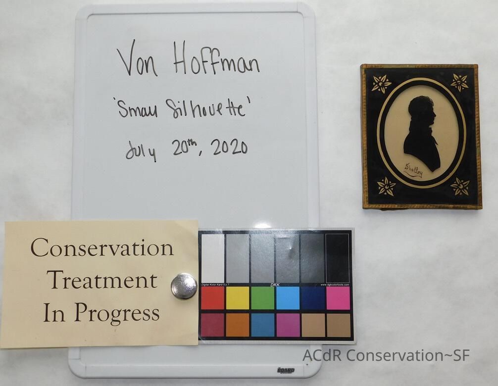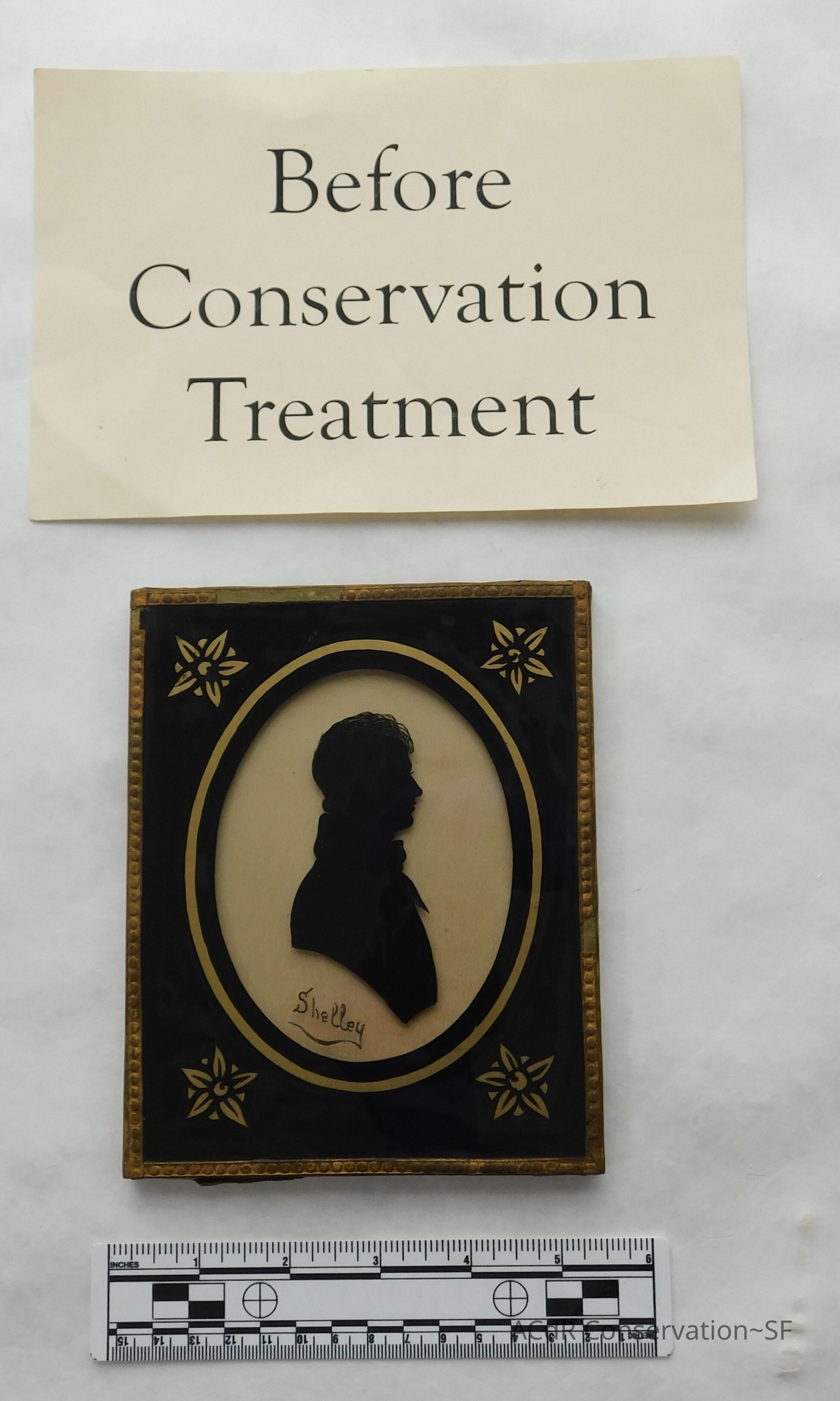 Small Silhouette Art Description Small silhouette painted on glass PDF Viewer Close × Profile Viewer Close × ConditionReason for ExamDamageOverall ConditionGoodCondition AssessmentAbrasionBreakDate ExaminedJul 20, 2020Examined ByClair SmithConservationConservation PurposeDamage Repair & CleaningTreatmentAcute TreatmentGeneral RepairDate(s)Jul 20, 2020 - Jul 20, 2020Treatment NotesRepair cracks in sealing paper and in-paint areas of loss. Clean the glass